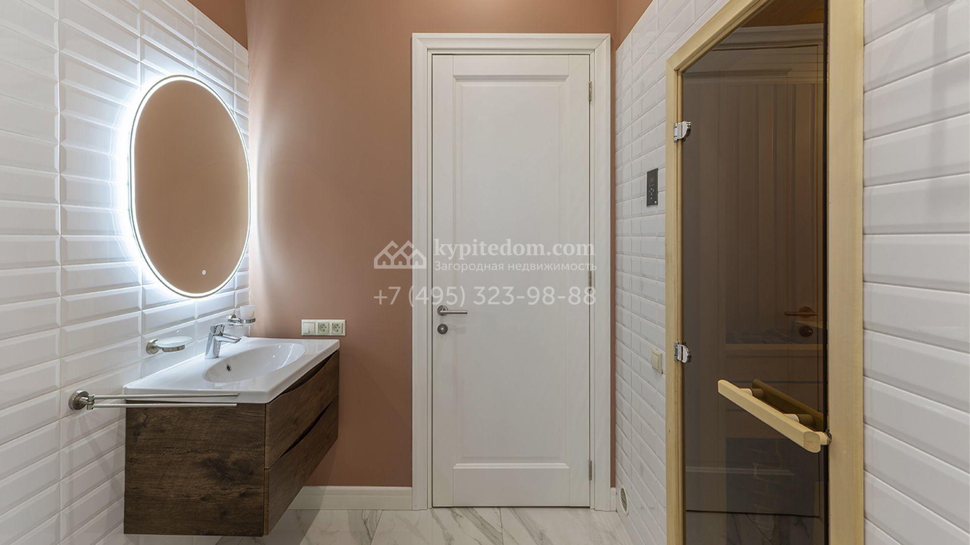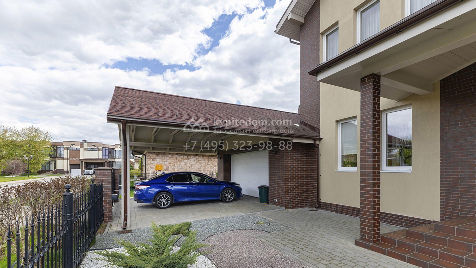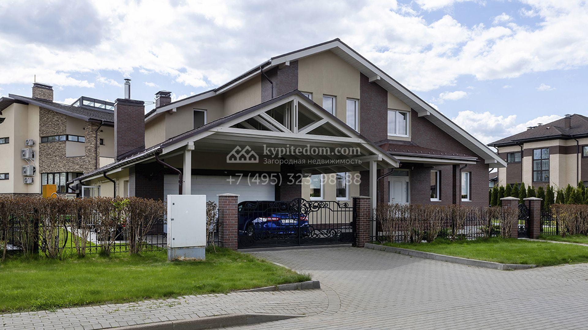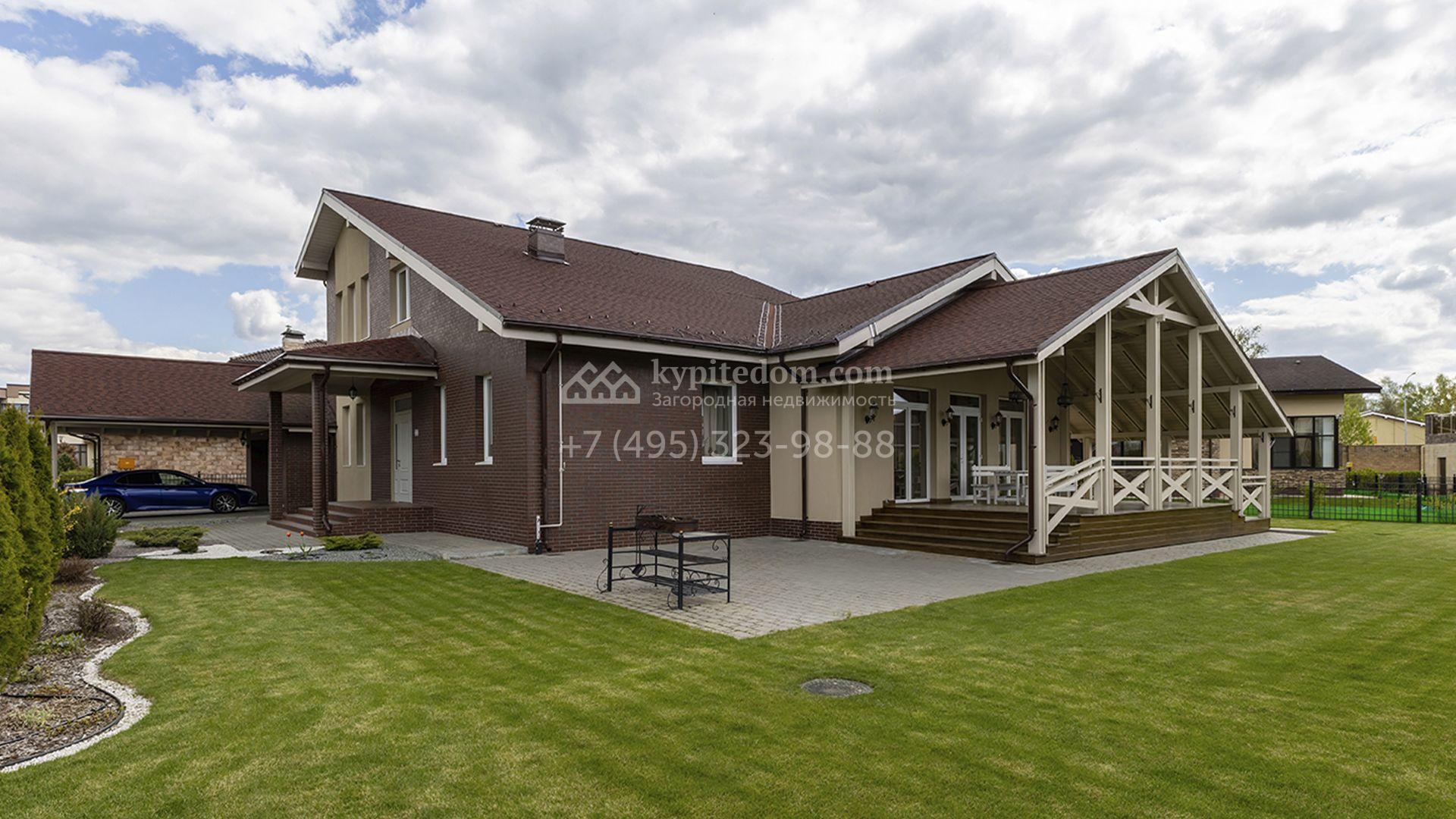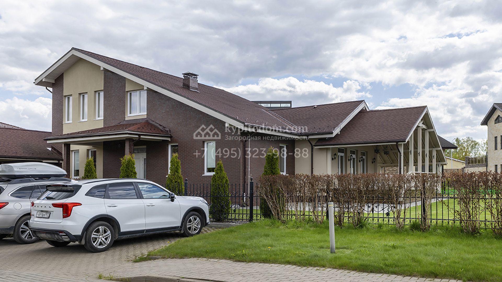 Загородный дом площадью 470 м² построен на полевом участке 12,5 соток. Фасад в современном стиле облицован красным клинкерным кирпичом и бежевой штукатуркой. Благодаря высоким потолкам и панорамному остеклению пространство наполнено светом и воздухом. Интерьер выполнен в нежных пастельных тонах, создающих атмосферу уюта. В коттедже спланировали 5 спален, гостиную с дровяным камином, кухню-столовую, сауну, террасу и гараж на 2 машины с пристроенным навесом. На участке выполнен ландшафтный дизайн, вымощены дорожки, засеян газон и высажены туи.