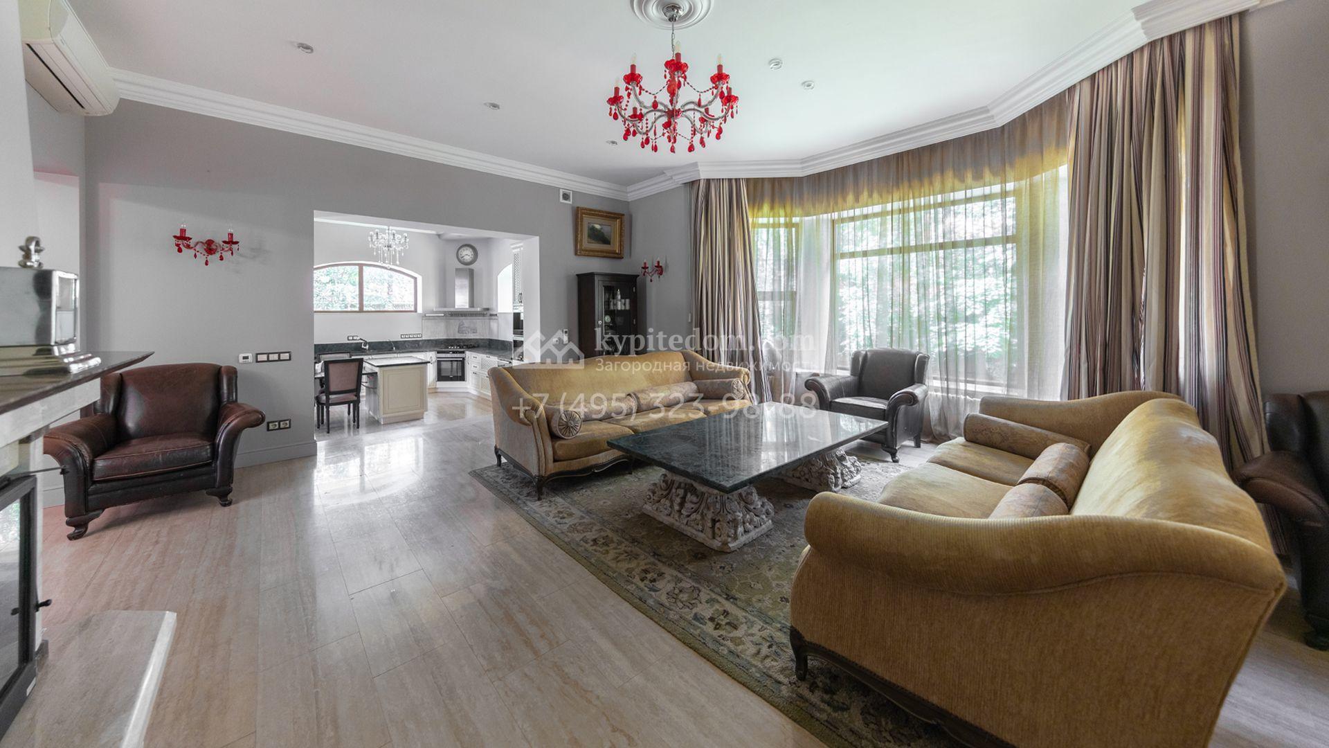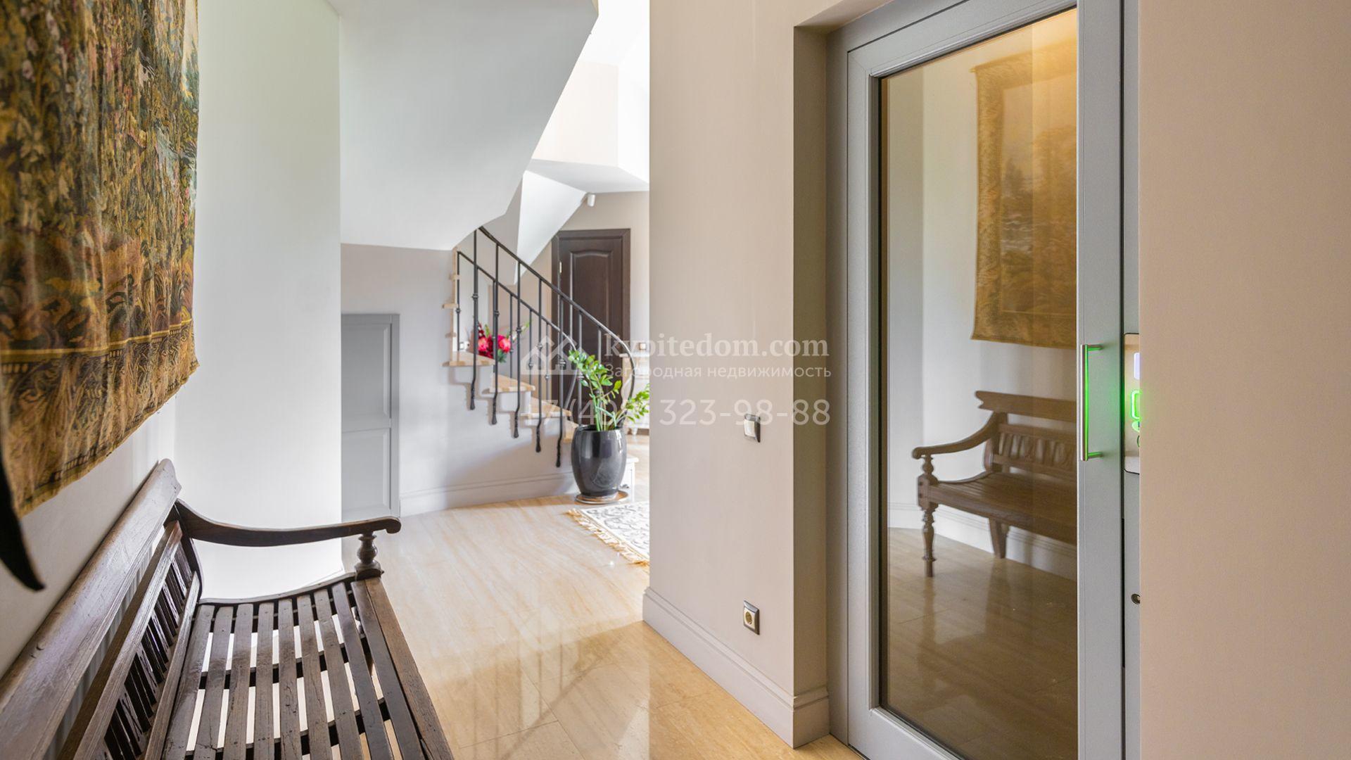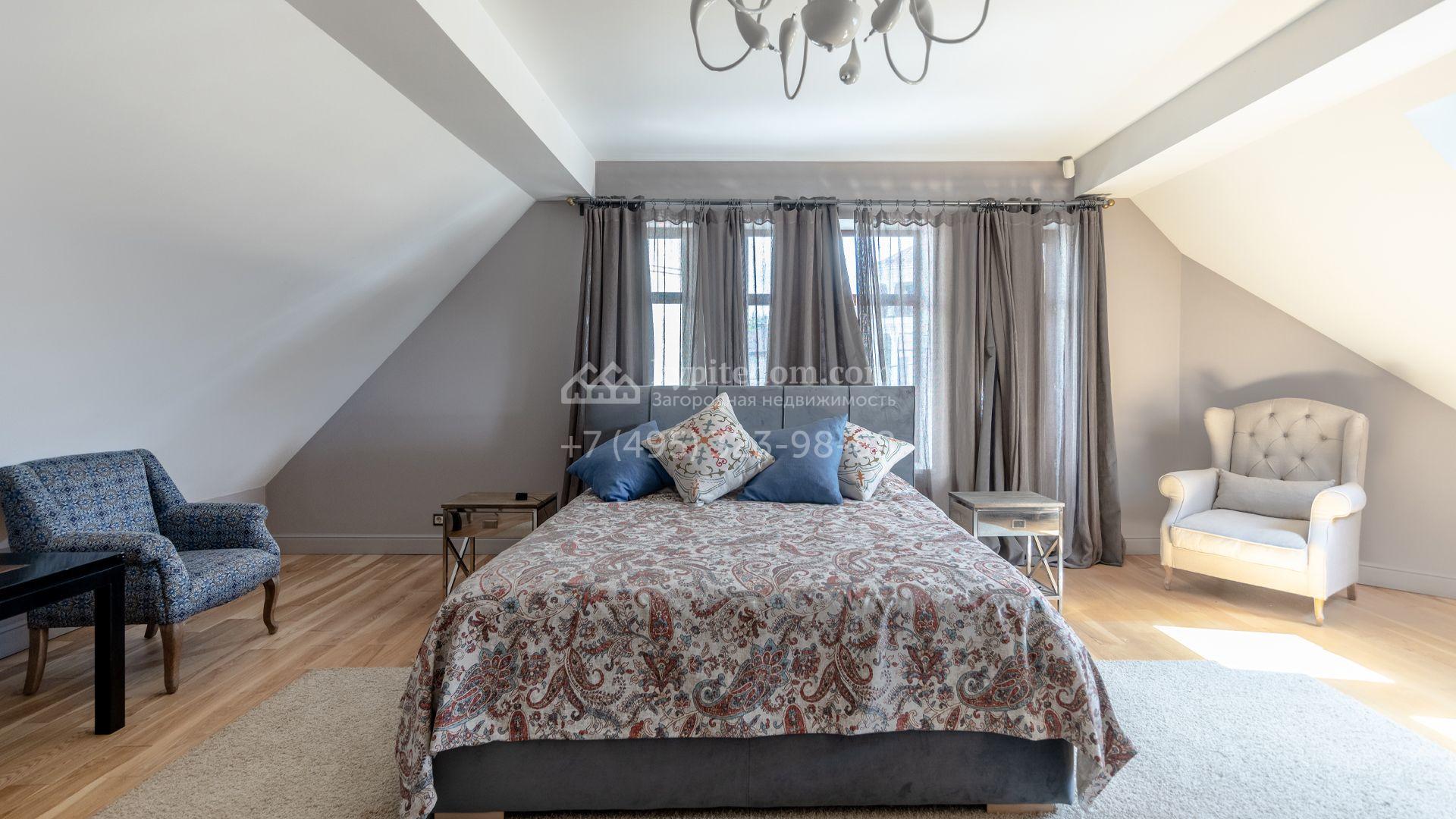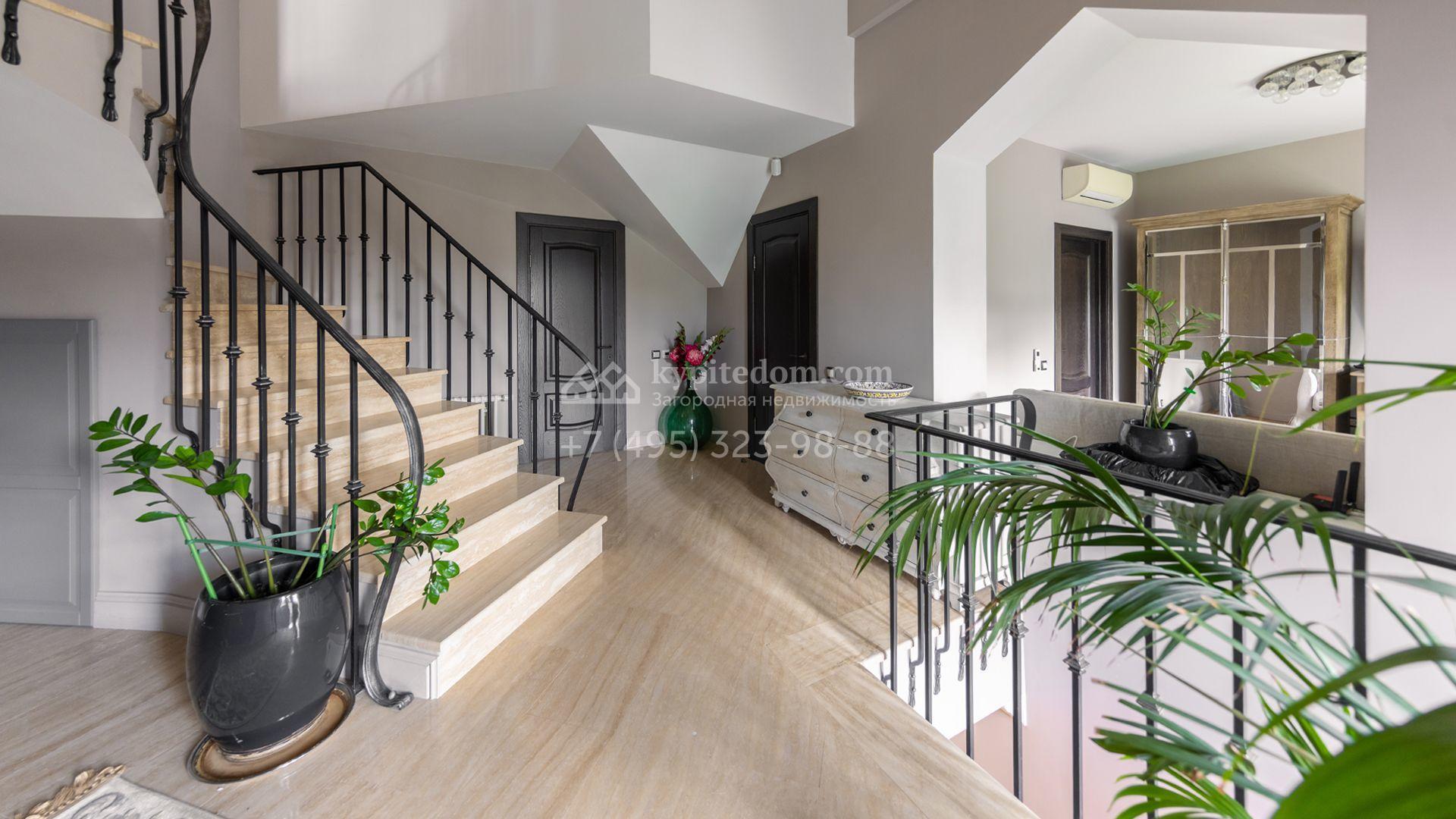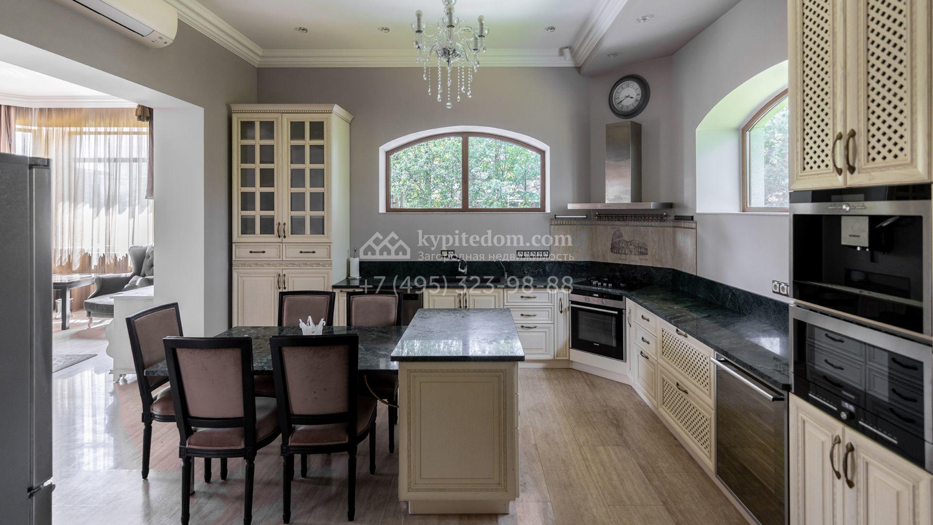 Загородный дом площадью 980 м² построен на полевом участке 17 соток. Фасад здания облицован бежевой штукатуркой и декорирован камнем. В отделке интерьера преобладают пастельные оттенки и фактура дерева и камня. Коттедж полностью укомплектован мебелью. Планировка разиденции включает 5 спален, уютную гостиную с камином, кухню, столовую, кабинет и SPA-зону с бассейном, сауной и хаммамом. На участке выполнен ландшафтный дизайн, засеян газон, высажены взрослые деревья и растения, расположен домик для персонала с 2-мя спальнями, гараж на 2 машины и зона барбекю.