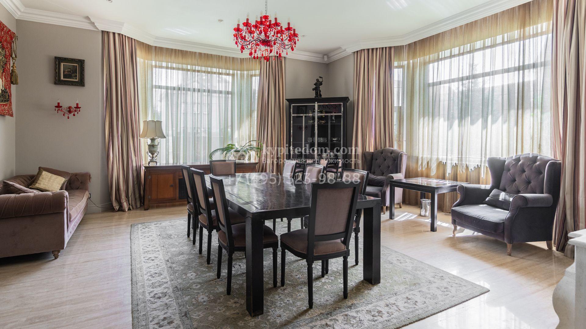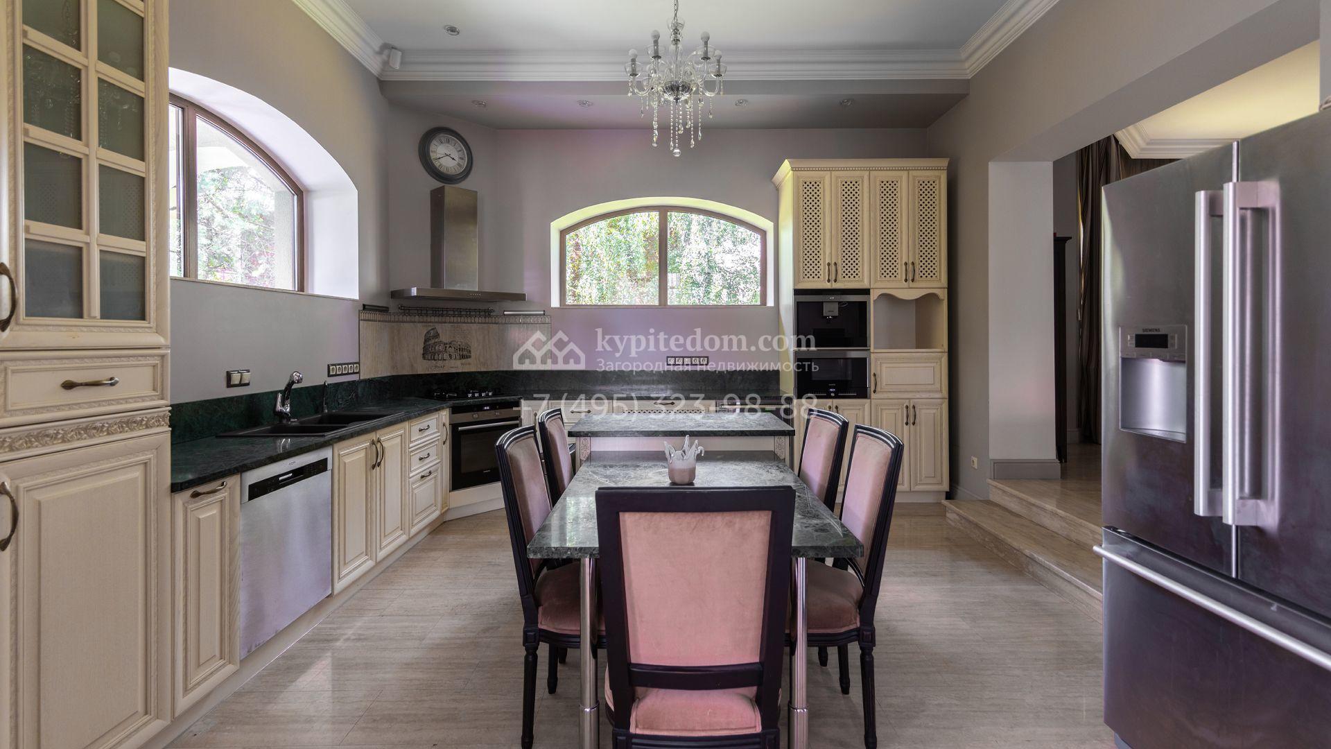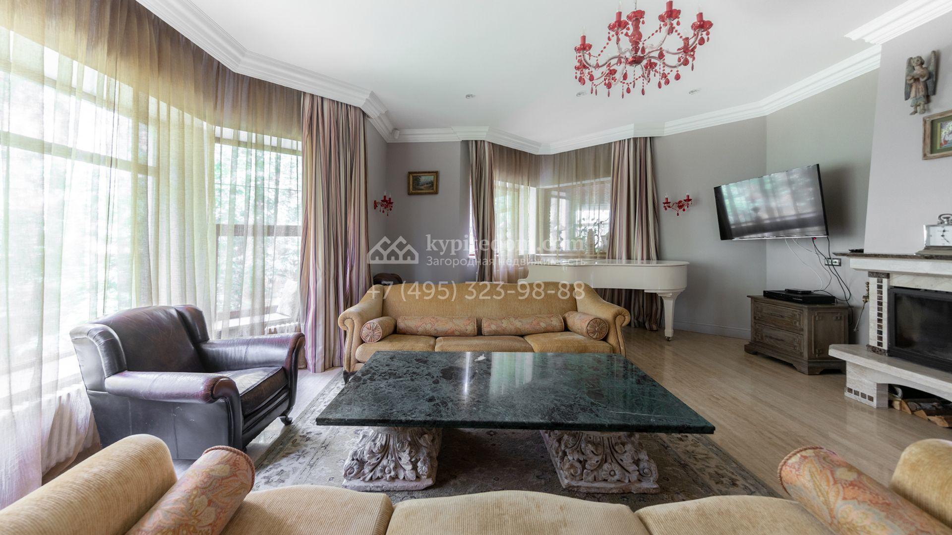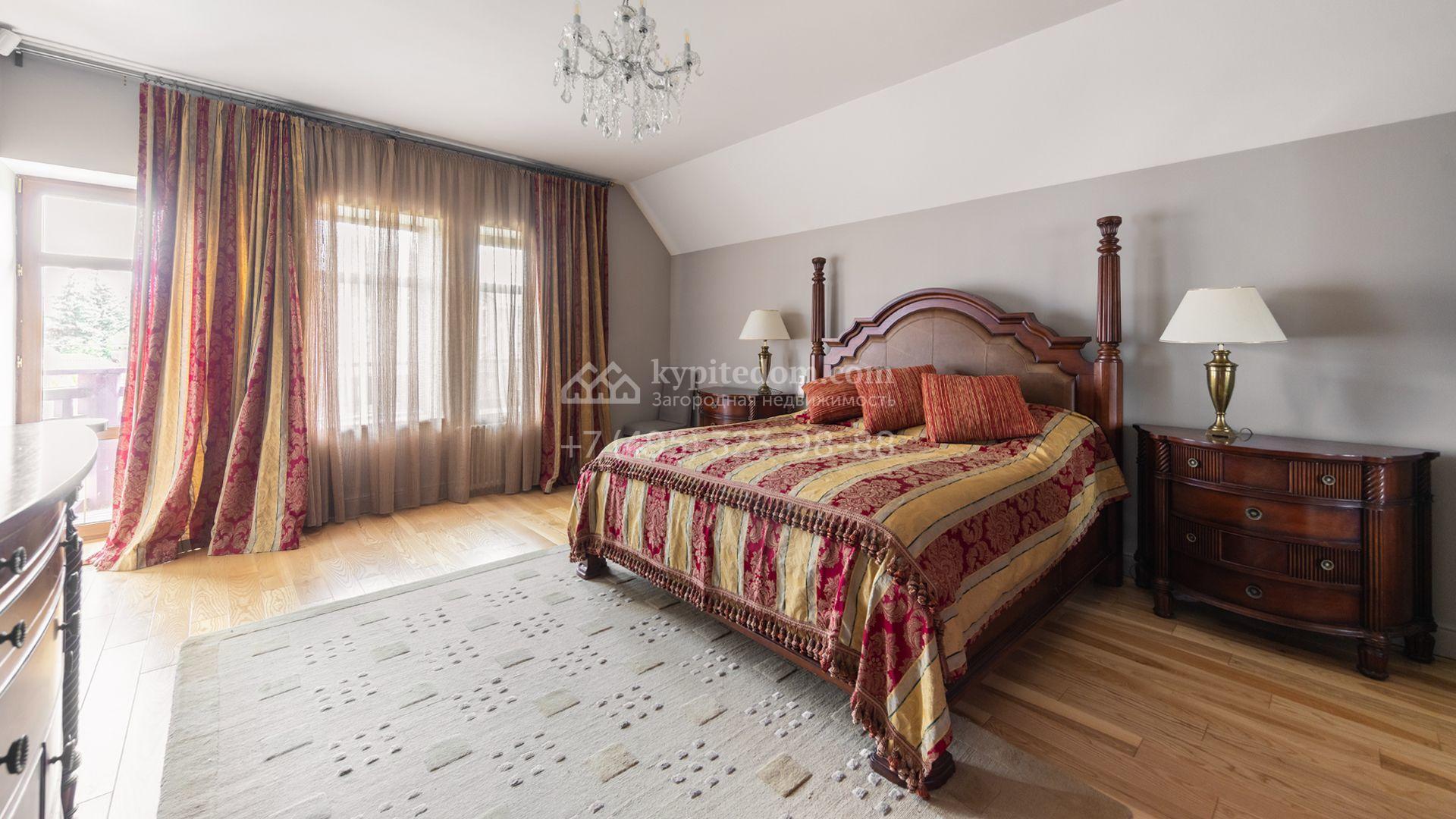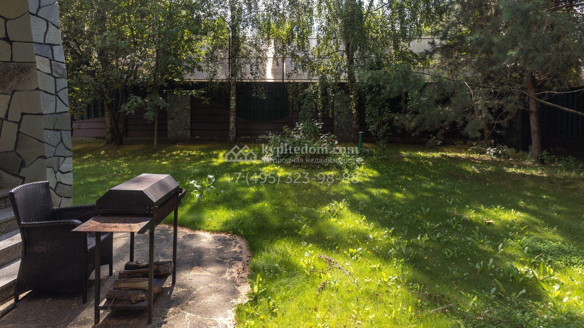 Загородный дом площадью 980 м² построен на полевом участке 17 соток. Фасад здания облицован бежевой штукатуркой и декорирован камнем. В отделке интерьера преобладают пастельные оттенки и фактура дерева и камня. Коттедж полностью укомплектован мебелью. Планировка разиденции включает 5 спален, уютную гостиную с камином, кухню, столовую, кабинет и SPA-зону с бассейном, сауной и хаммамом. На участке выполнен ландшафтный дизайн, засеян газон, высажены взрослые деревья и растения, расположен домик для персонала с 2-мя спальнями, гараж на 2 машины и зона барбекю.