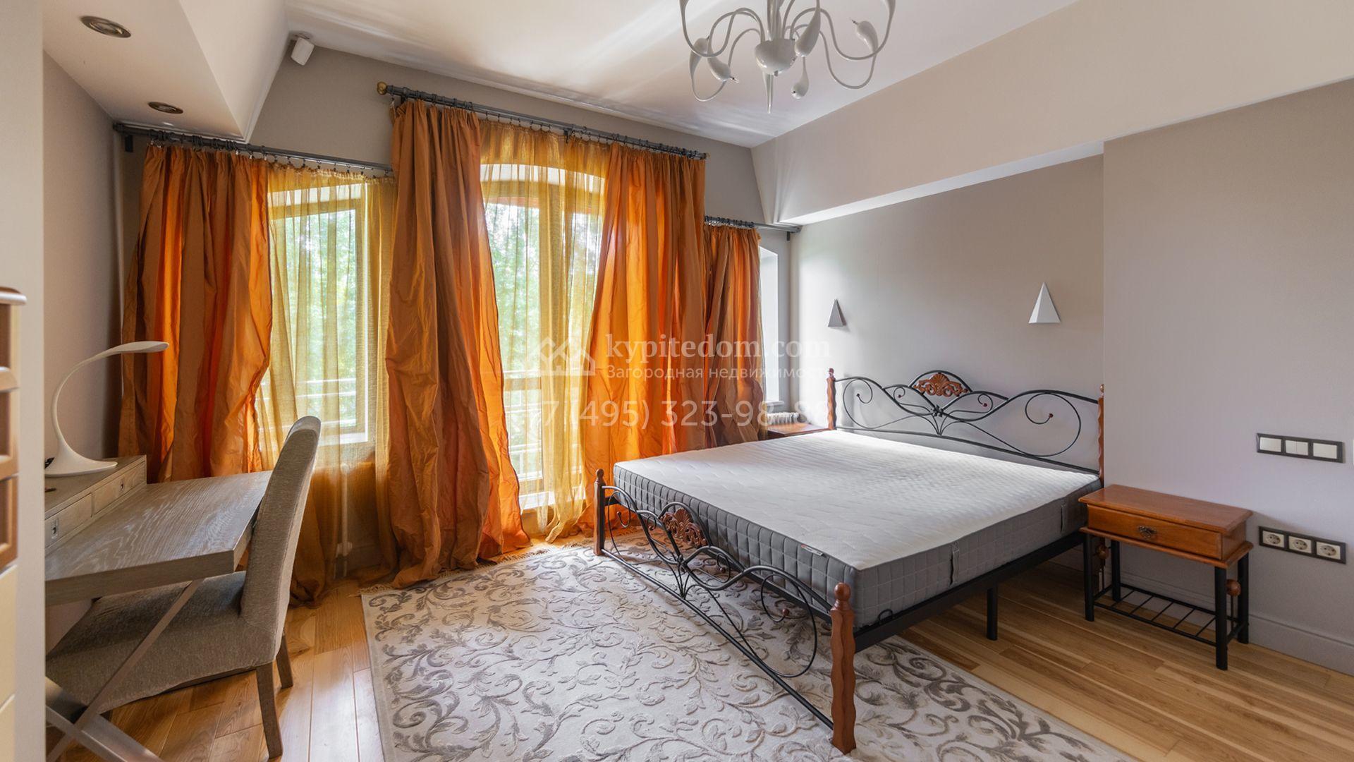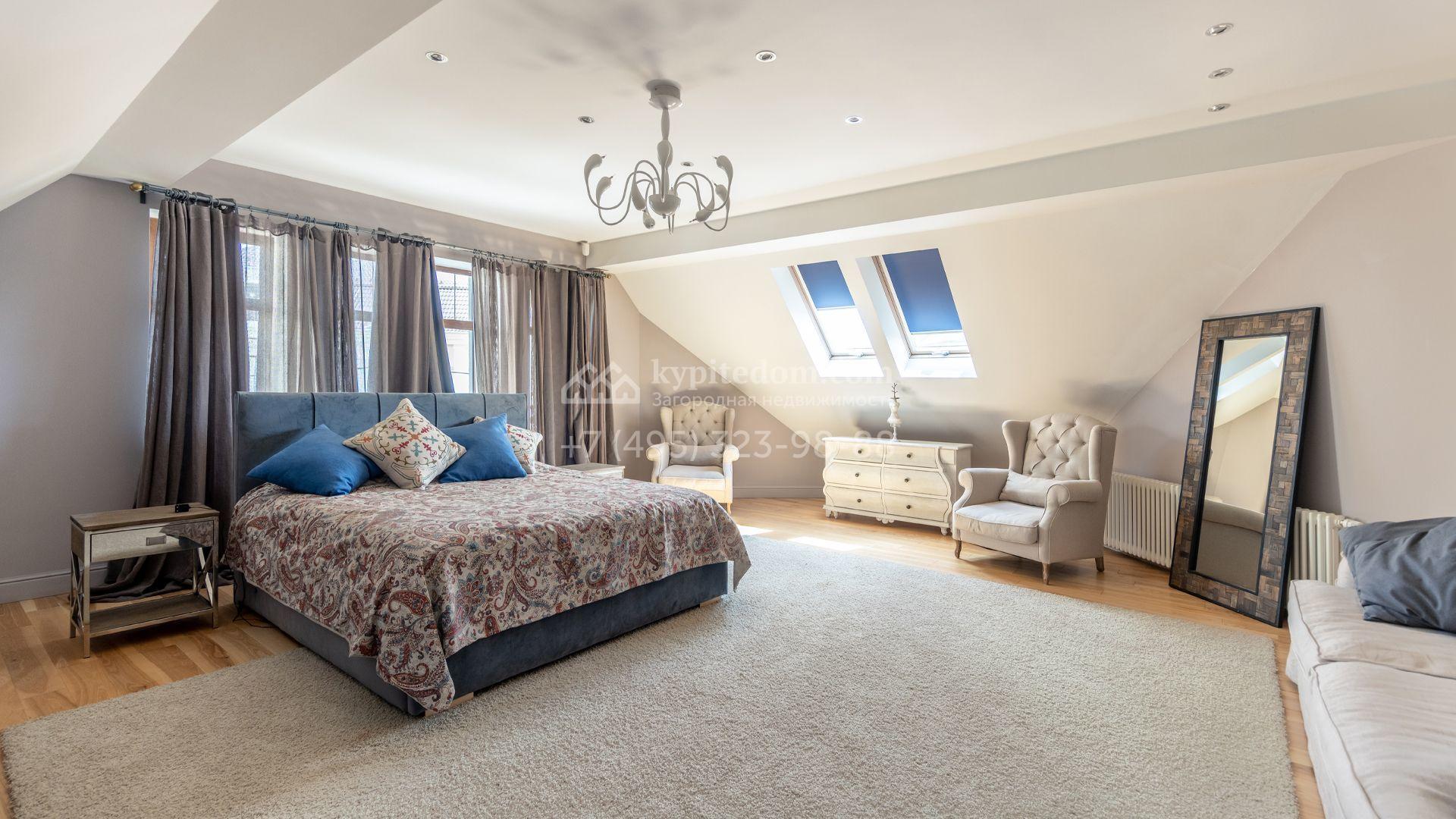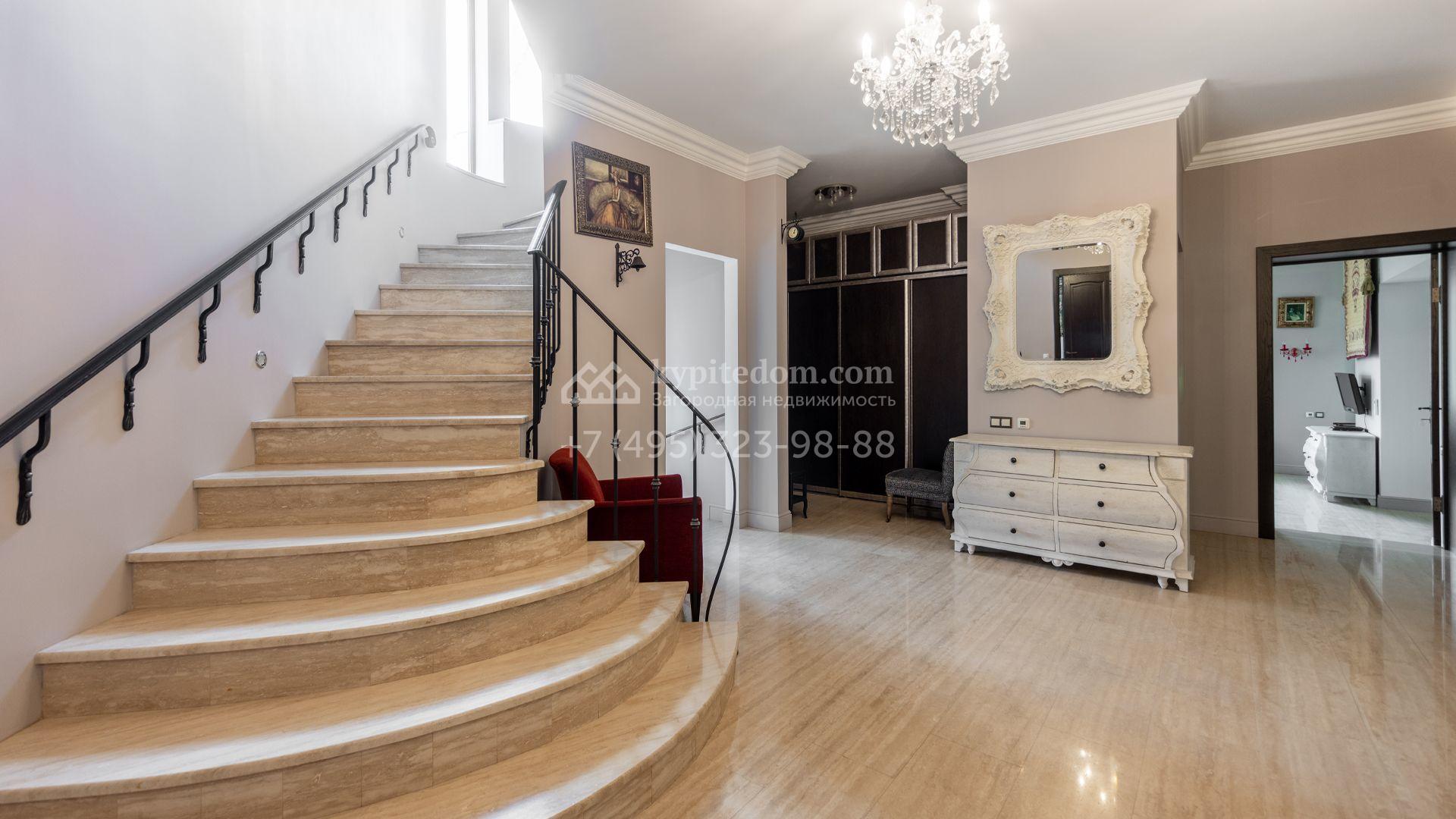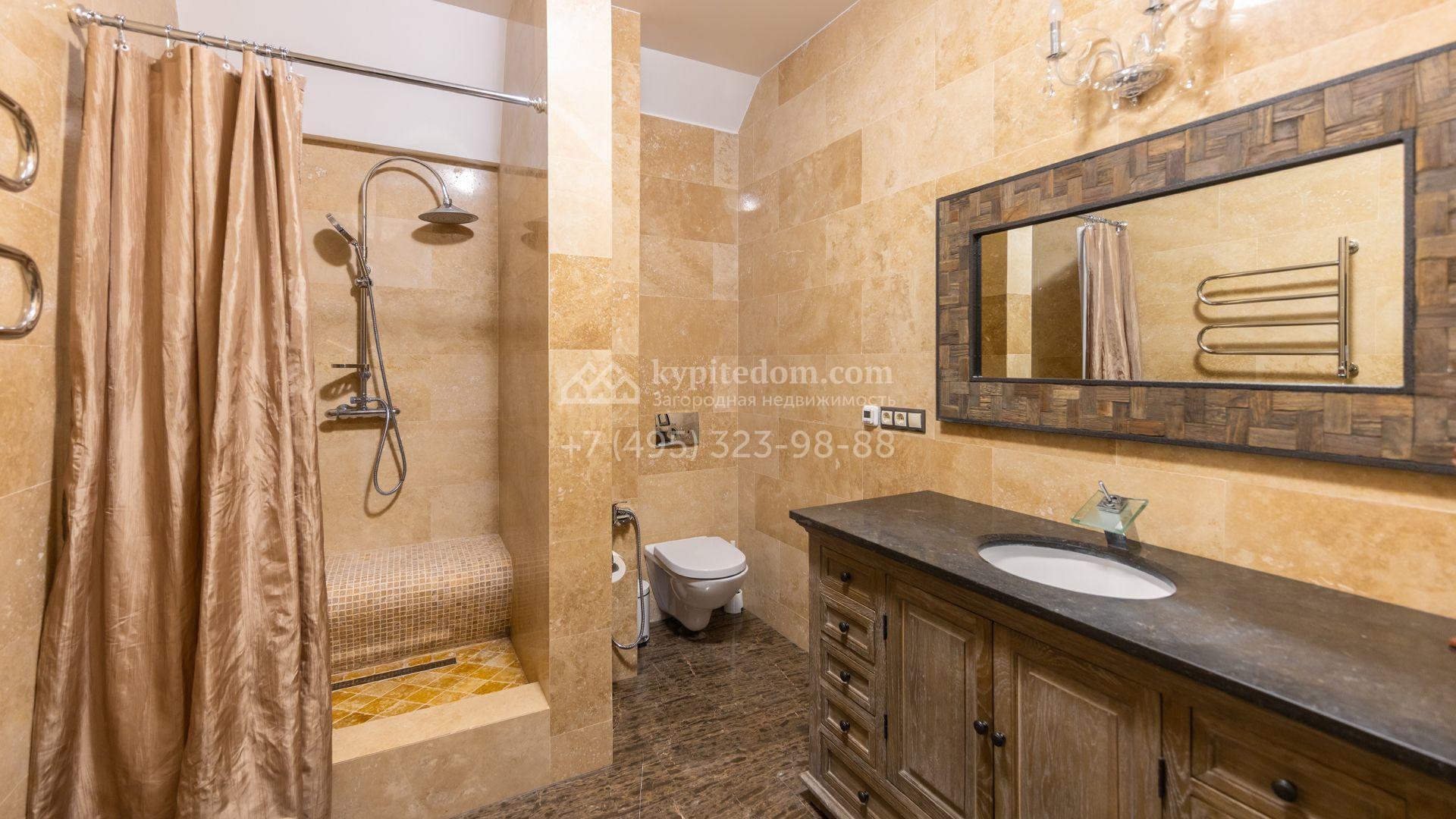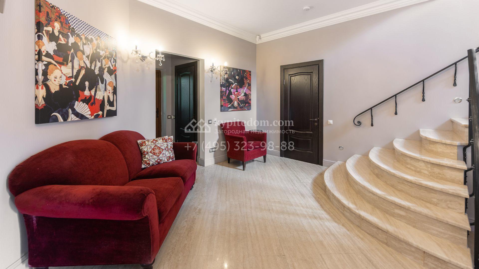 Загородный дом площадью 980 м² построен на полевом участке 17 соток. Фасад здания облицован бежевой штукатуркой и декорирован камнем. В отделке интерьера преобладают пастельные оттенки и фактура дерева и камня. Коттедж полностью укомплектован мебелью. Планировка разиденции включает 5 спален, уютную гостиную с камином, кухню, столовую, кабинет и SPA-зону с бассейном, сауной и хаммамом. На участке выполнен ландшафтный дизайн, засеян газон, высажены взрослые деревья и растения, расположен домик для персонала с 2-мя спальнями, гараж на 2 машины и зона барбекю.