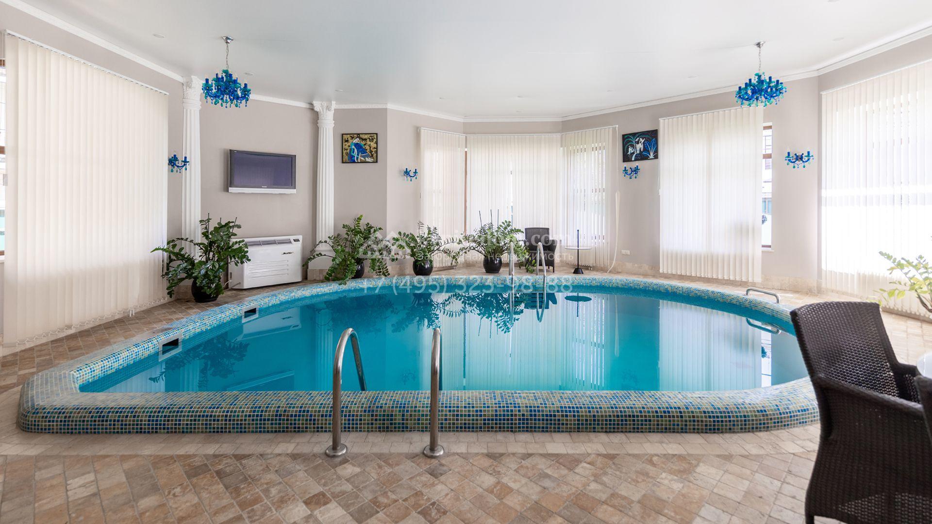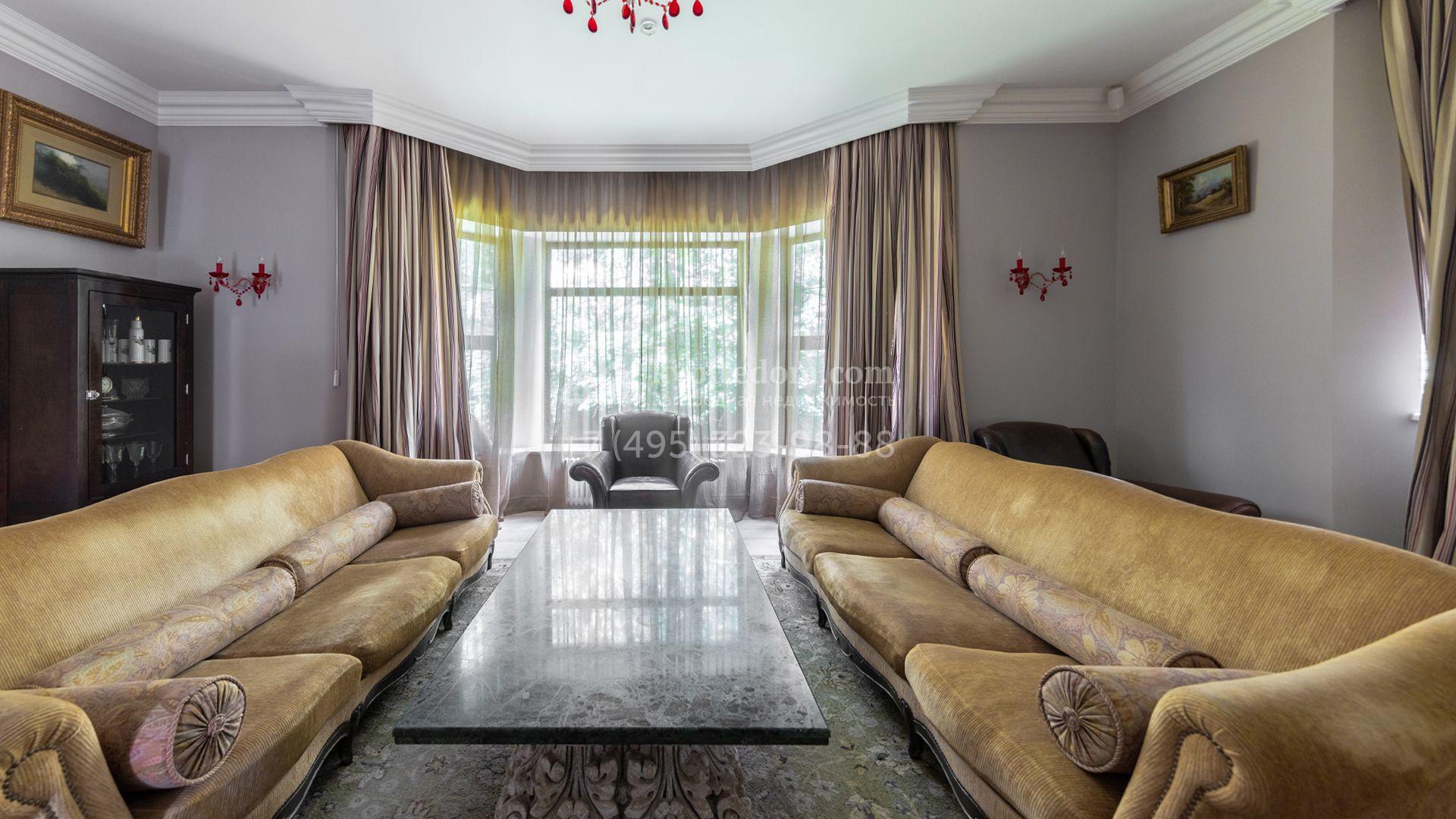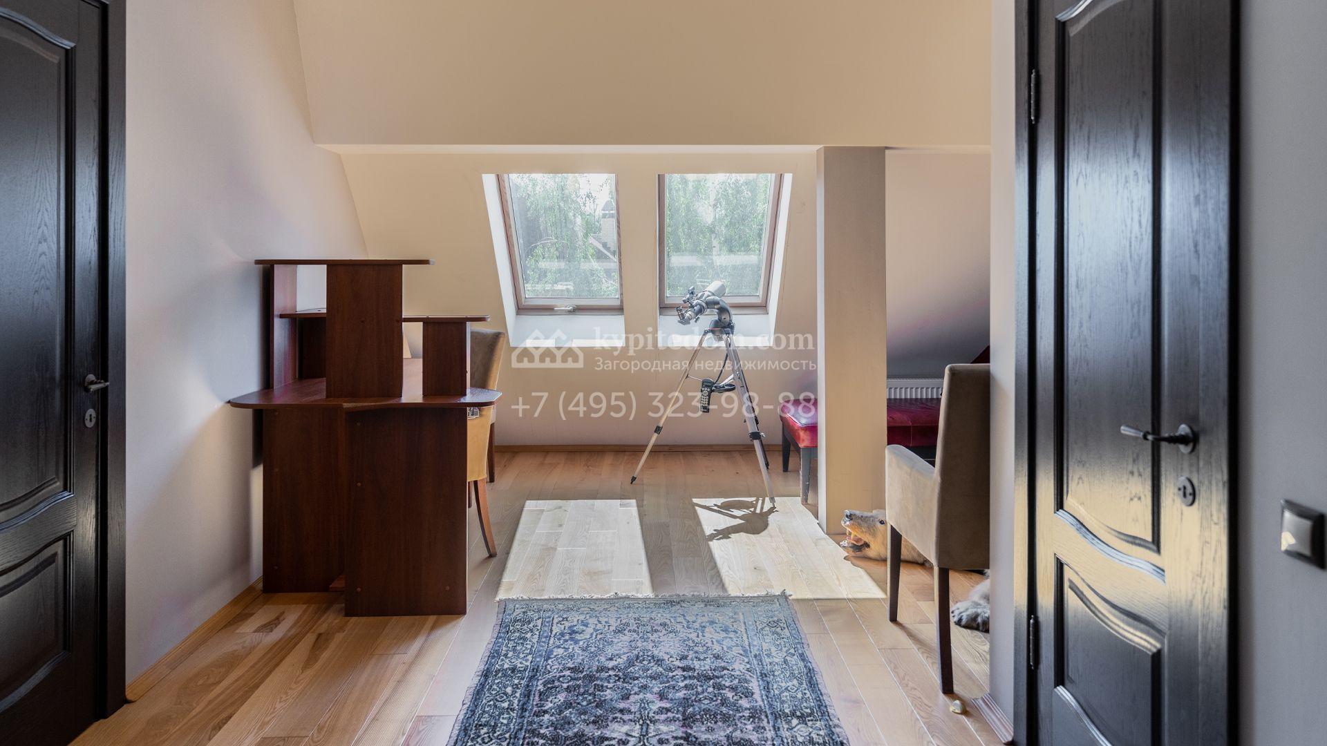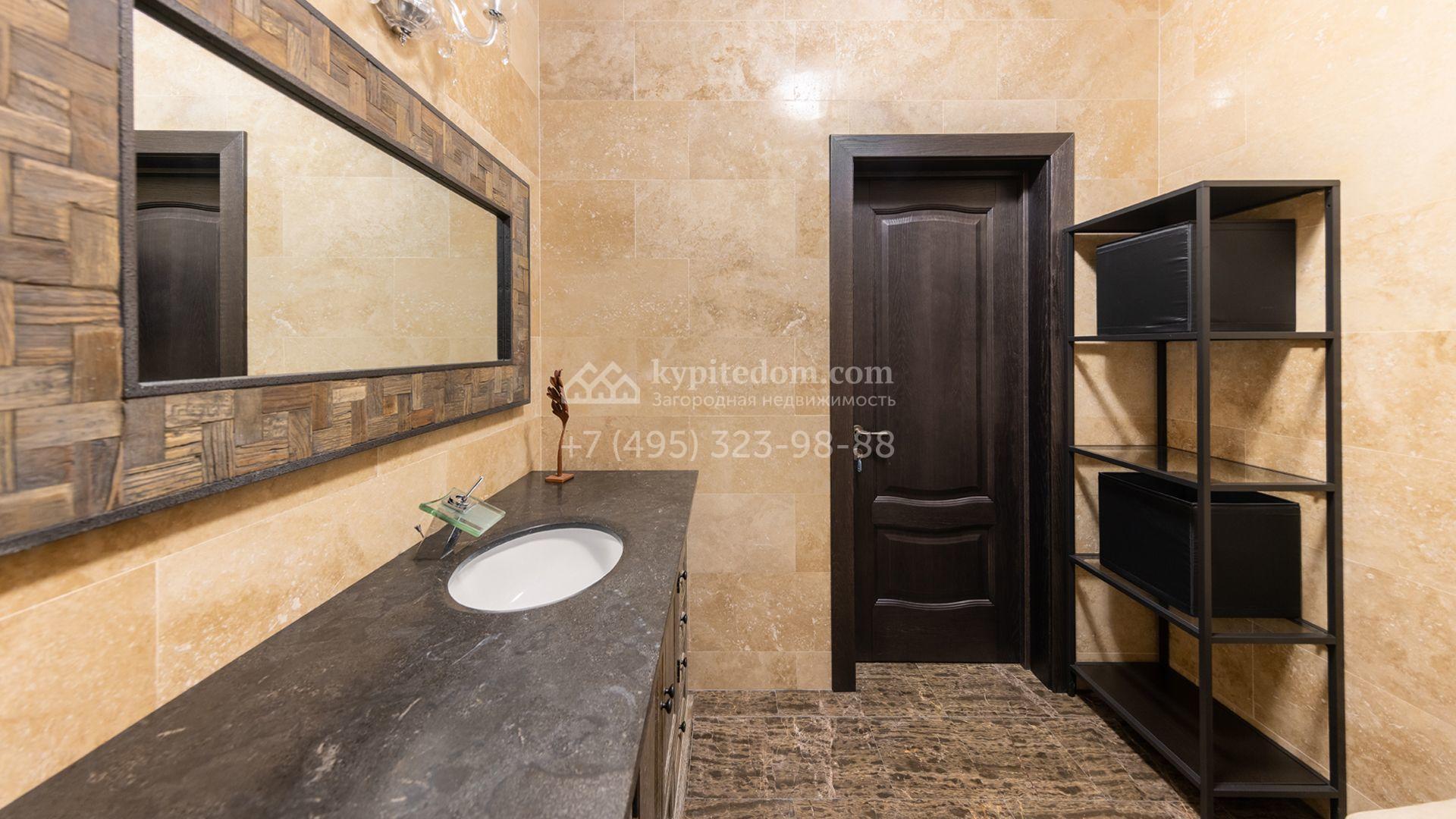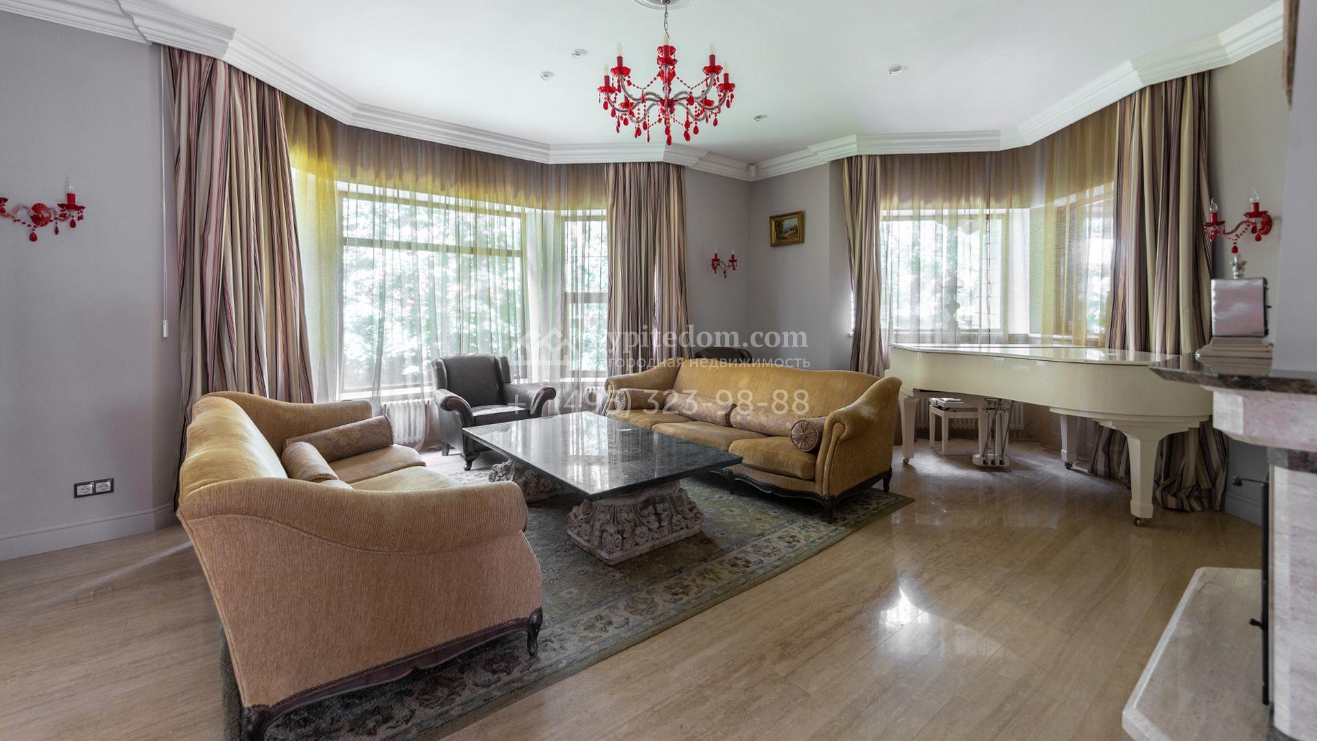 Загородный дом площадью 980 м² построен на полевом участке 17 соток. Фасад здания облицован бежевой штукатуркой и декорирован камнем. В отделке интерьера преобладают пастельные оттенки и фактура дерева и камня. Коттедж полностью укомплектован мебелью. Планировка разиденции включает 5 спален, уютную гостиную с камином, кухню, столовую, кабинет и SPA-зону с бассейном, сауной и хаммамом. На участке выполнен ландшафтный дизайн, засеян газон, высажены взрослые деревья и растения, расположен домик для персонала с 2-мя спальнями, гараж на 2 машины и зона барбекю.