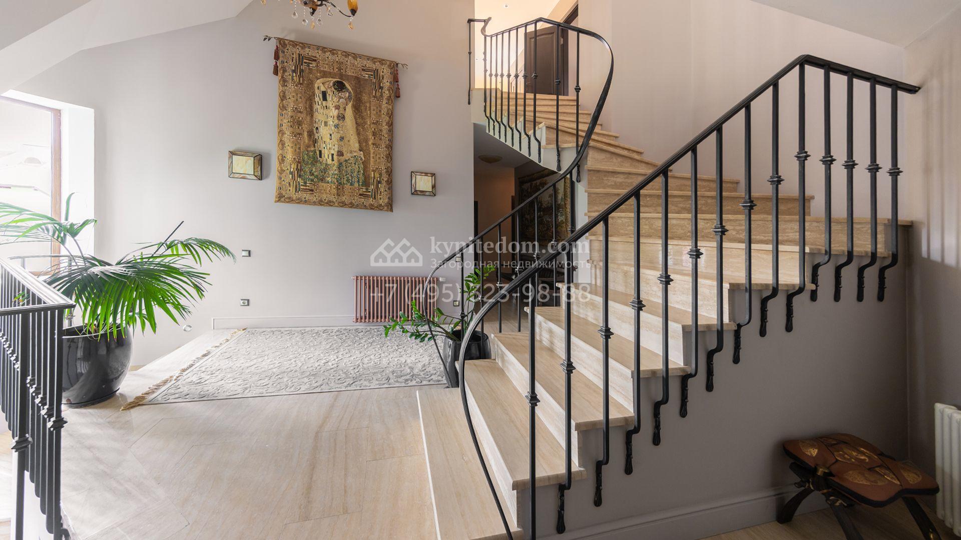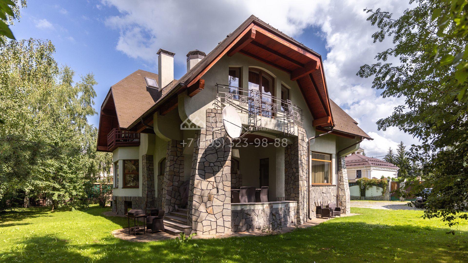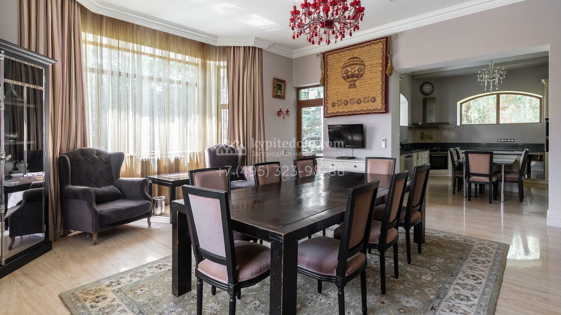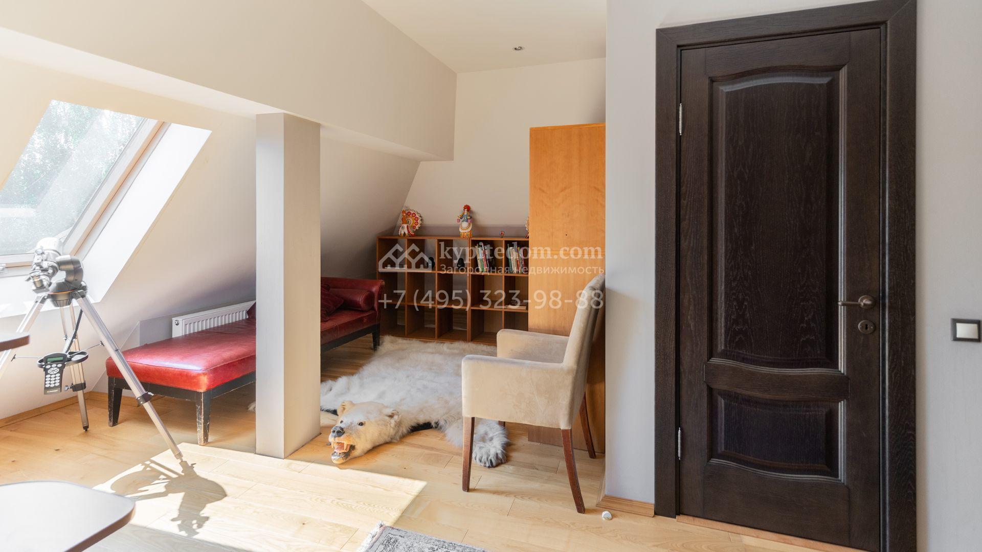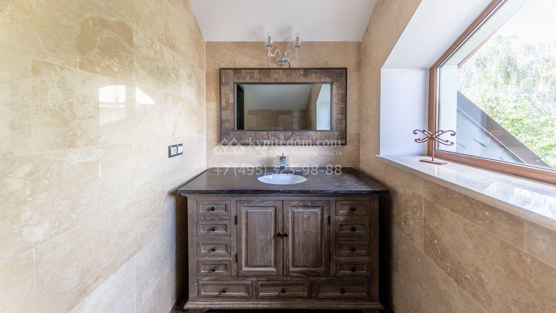 Загородный дом площадью 980 м² построен на полевом участке 17 соток. Фасад здания облицован бежевой штукатуркой и декорирован камнем. В отделке интерьера преобладают пастельные оттенки и фактура дерева и камня. Коттедж полностью укомплектован мебелью. Планировка разиденции включает 5 спален, уютную гостиную с камином, кухню, столовую, кабинет и SPA-зону с бассейном, сауной и хаммамом. На участке выполнен ландшафтный дизайн, засеян газон, высажены взрослые деревья и растения, расположен домик для персонала с 2-мя спальнями, гараж на 2 машины и зона барбекю.