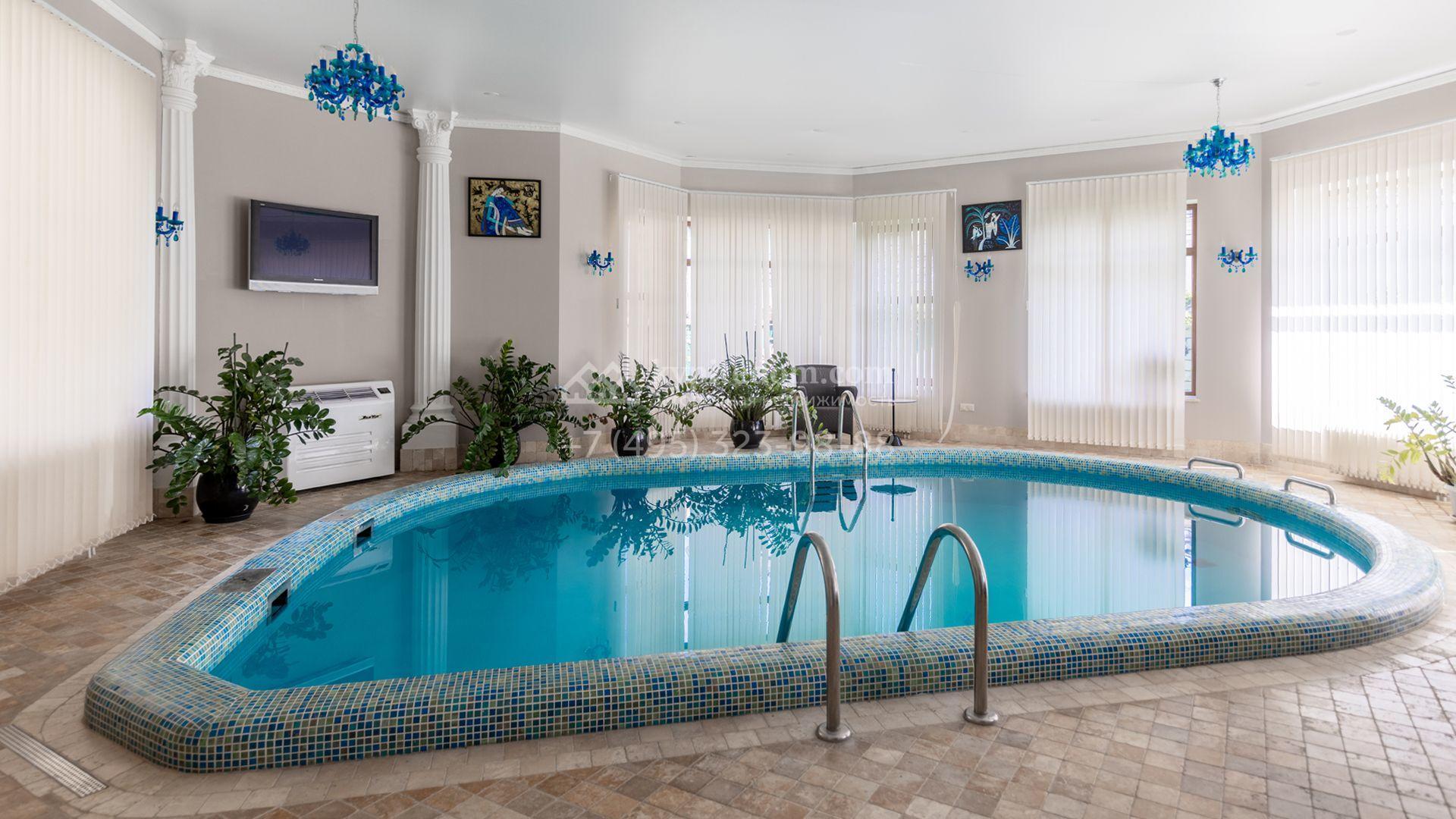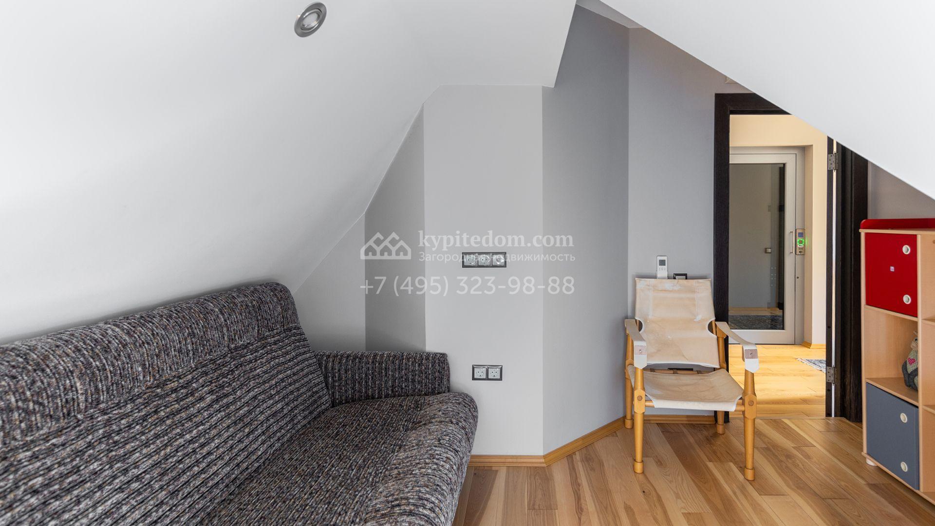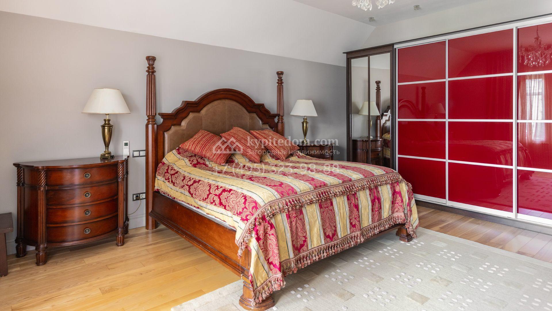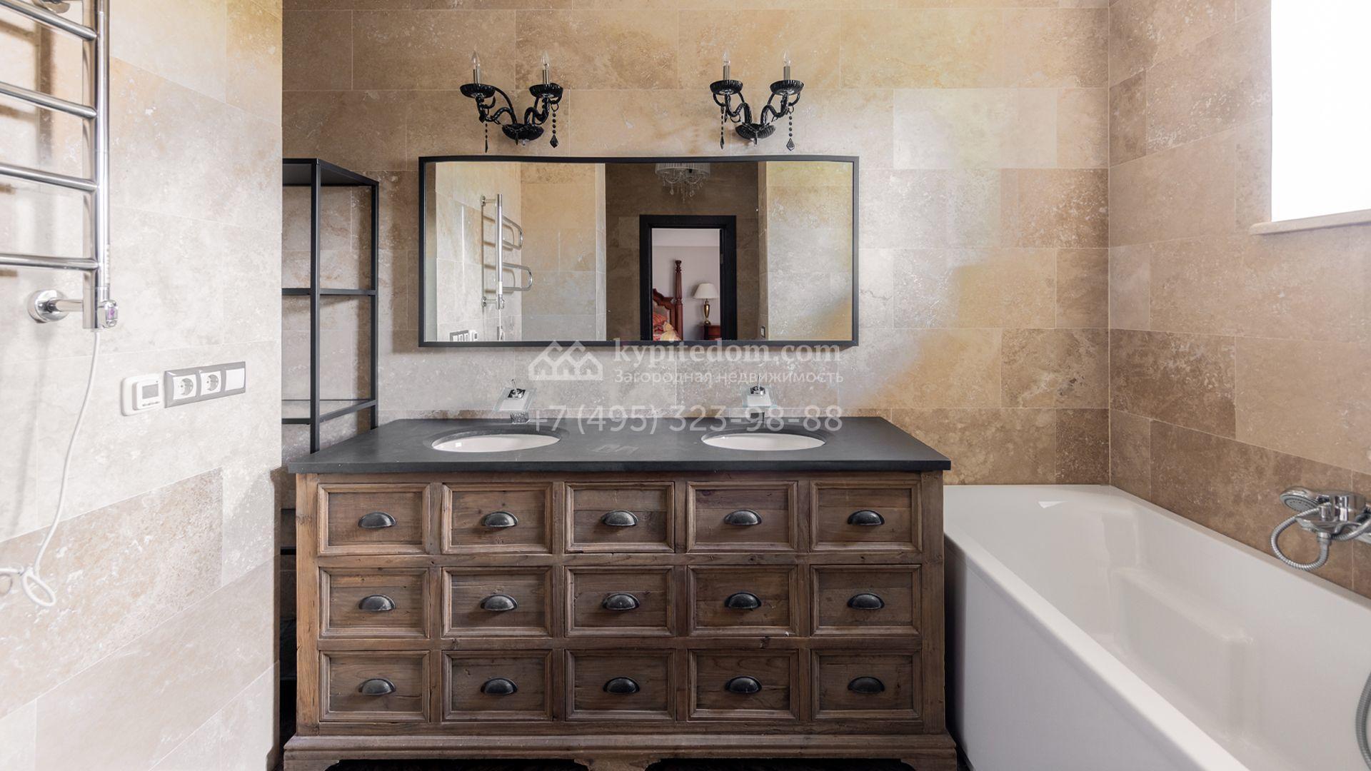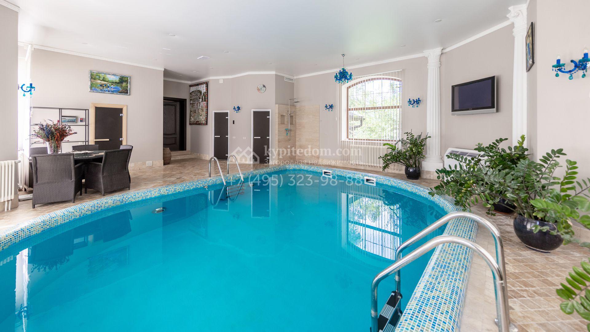 Загородный дом площадью 980 м² построен на полевом участке 17 соток. Фасад здания облицован бежевой штукатуркой и декорирован камнем. В отделке интерьера преобладают пастельные оттенки и фактура дерева и камня. Коттедж полностью укомплектован мебелью. Планировка разиденции включает 5 спален, уютную гостиную с камином, кухню, столовую, кабинет и SPA-зону с бассейном, сауной и хаммамом. На участке выполнен ландшафтный дизайн, засеян газон, высажены взрослые деревья и растения, расположен домик для персонала с 2-мя спальнями, гараж на 2 машины и зона барбекю.