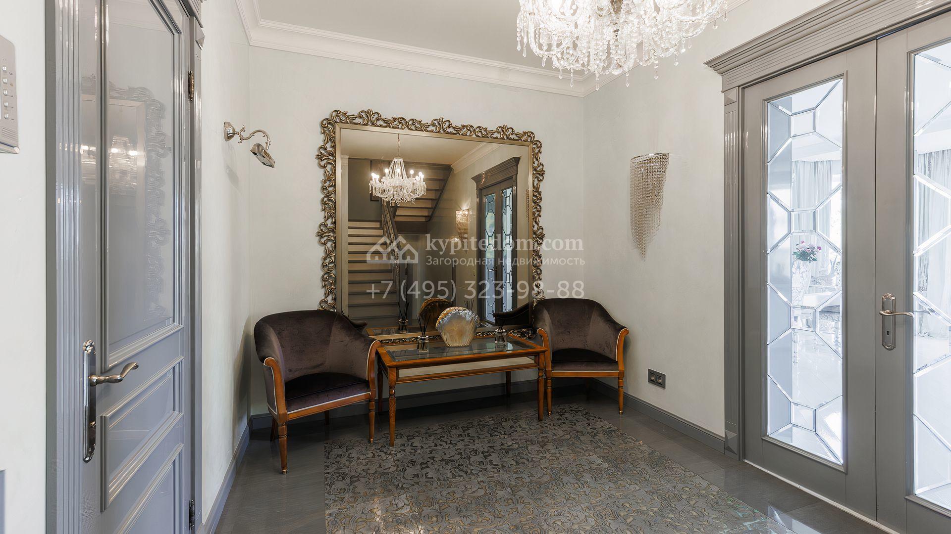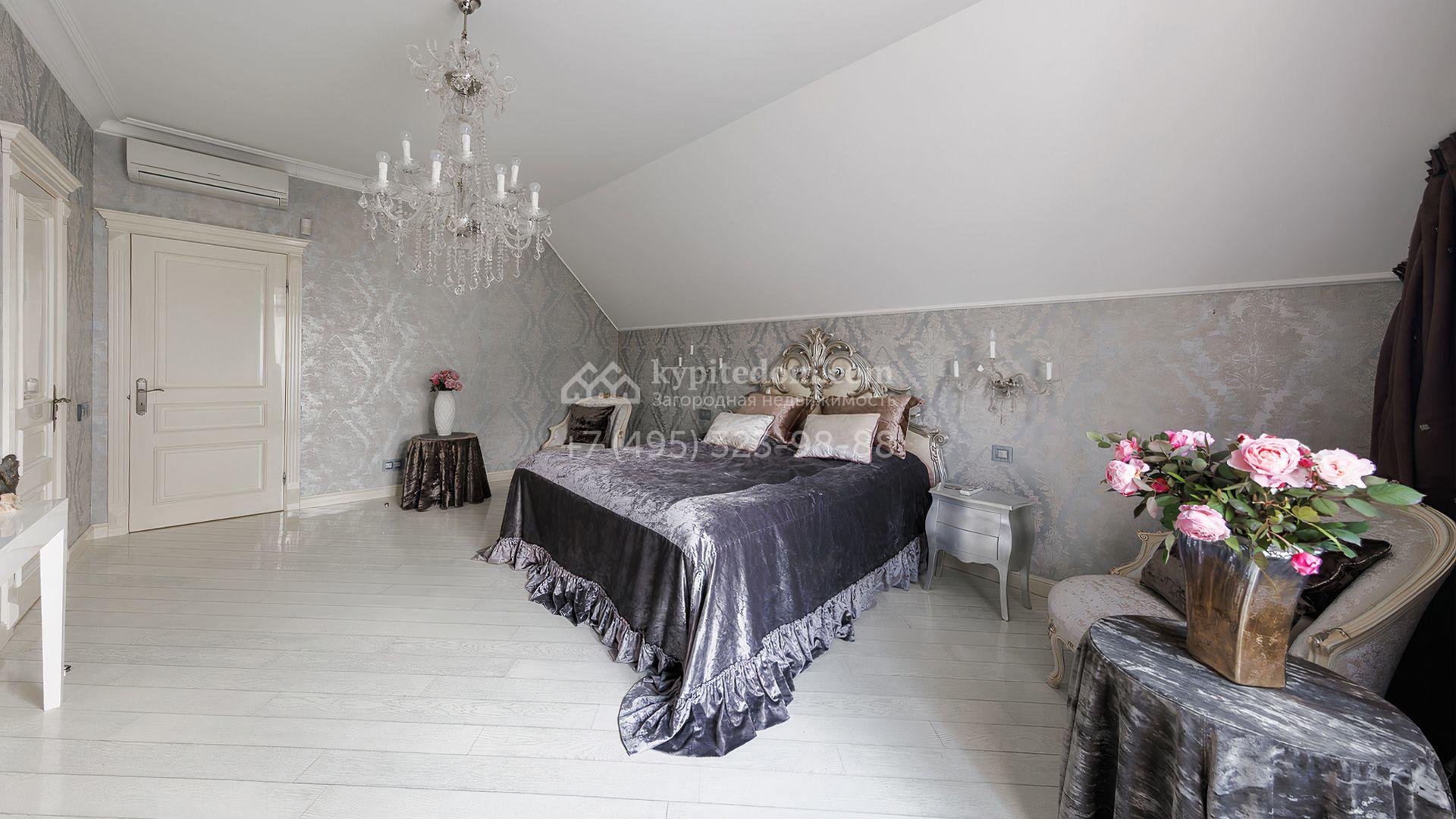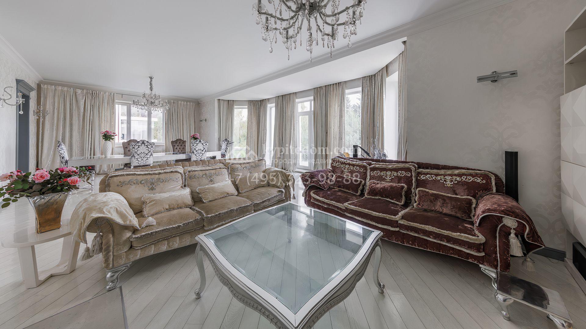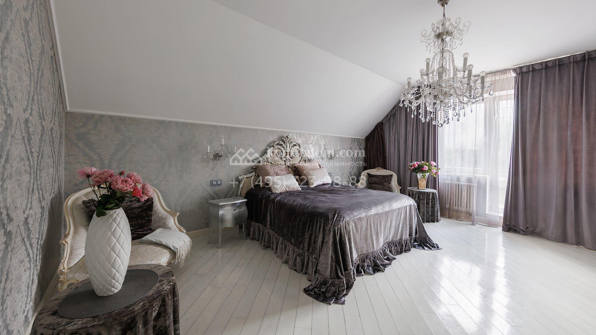 Загородный дом площадью 400 м² расположен на просторном полевом участке 22 сотки. Фасад в европейском стиле облицован бежевым камнем. В отделке интерьера преобладют светлые бежевые и серые оттенки. Резиденция меблирована эксклюзивной итальянской мебелью и укомплектована премиальной бытовой техникой. Планировкой предусмотрены 5 спален, 2 кухни, 2 гостиные с камином и пианино. Отдохнуть на свежем воздухе можно на двух террасах, одна из которых оборудована зоной барбекю и джакузи. На разноуровневом участке выполнен ландшафтный дизайн, обустроен сад с цветущей магнолией, сакурой, соснами, кедрами, туями и плодоносными деревьями.