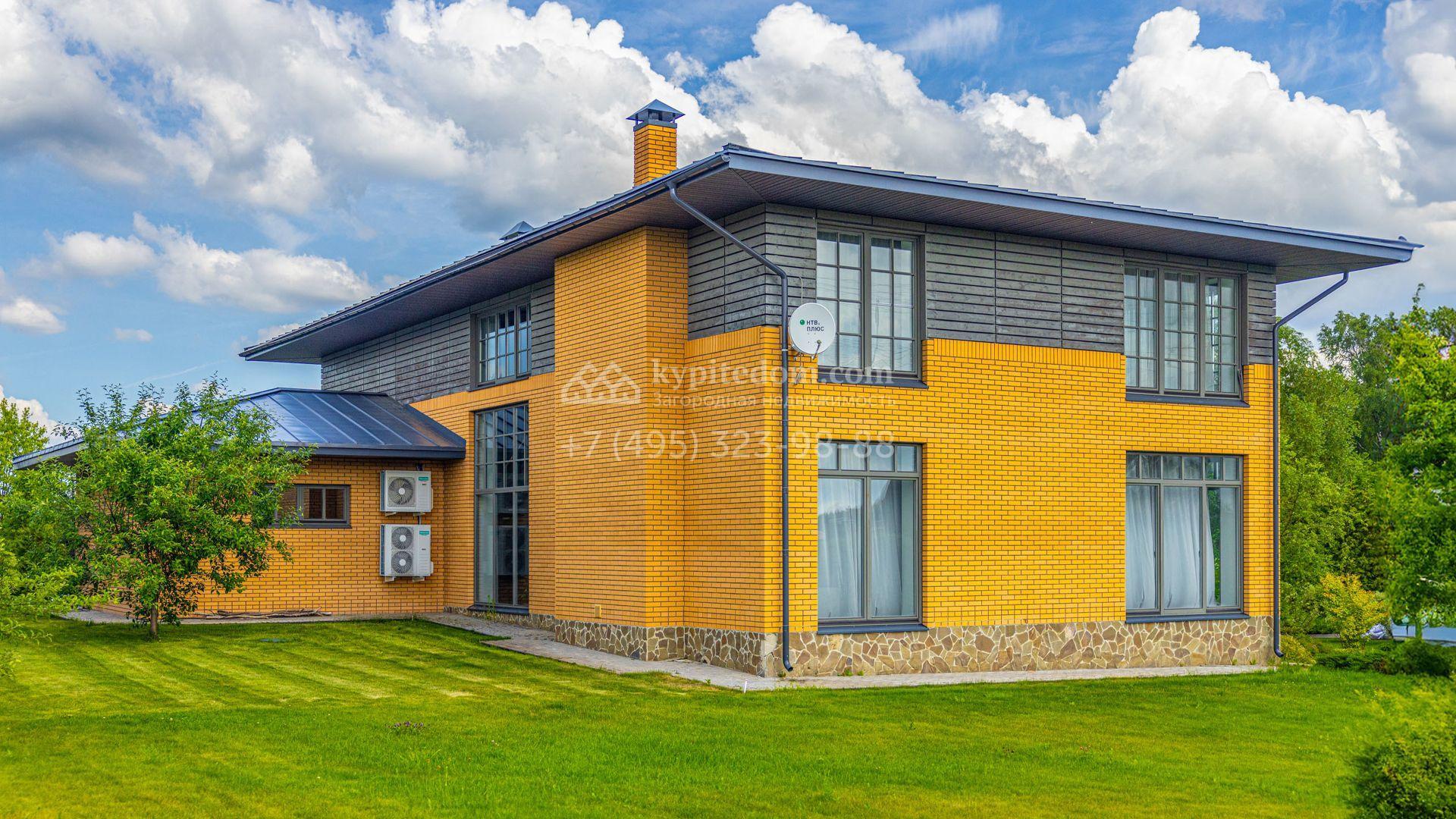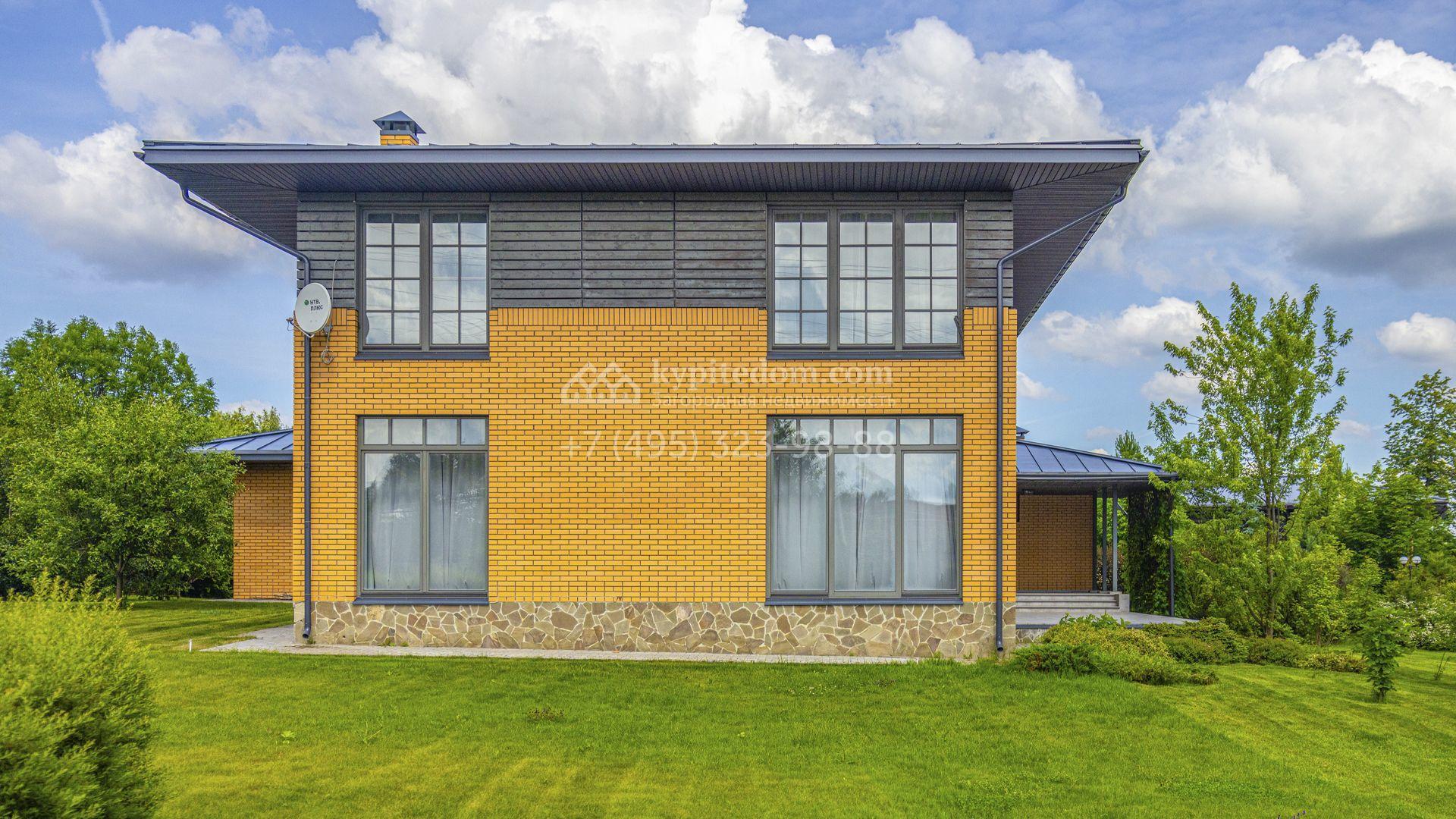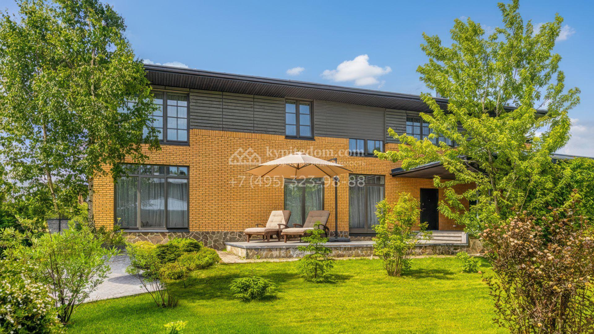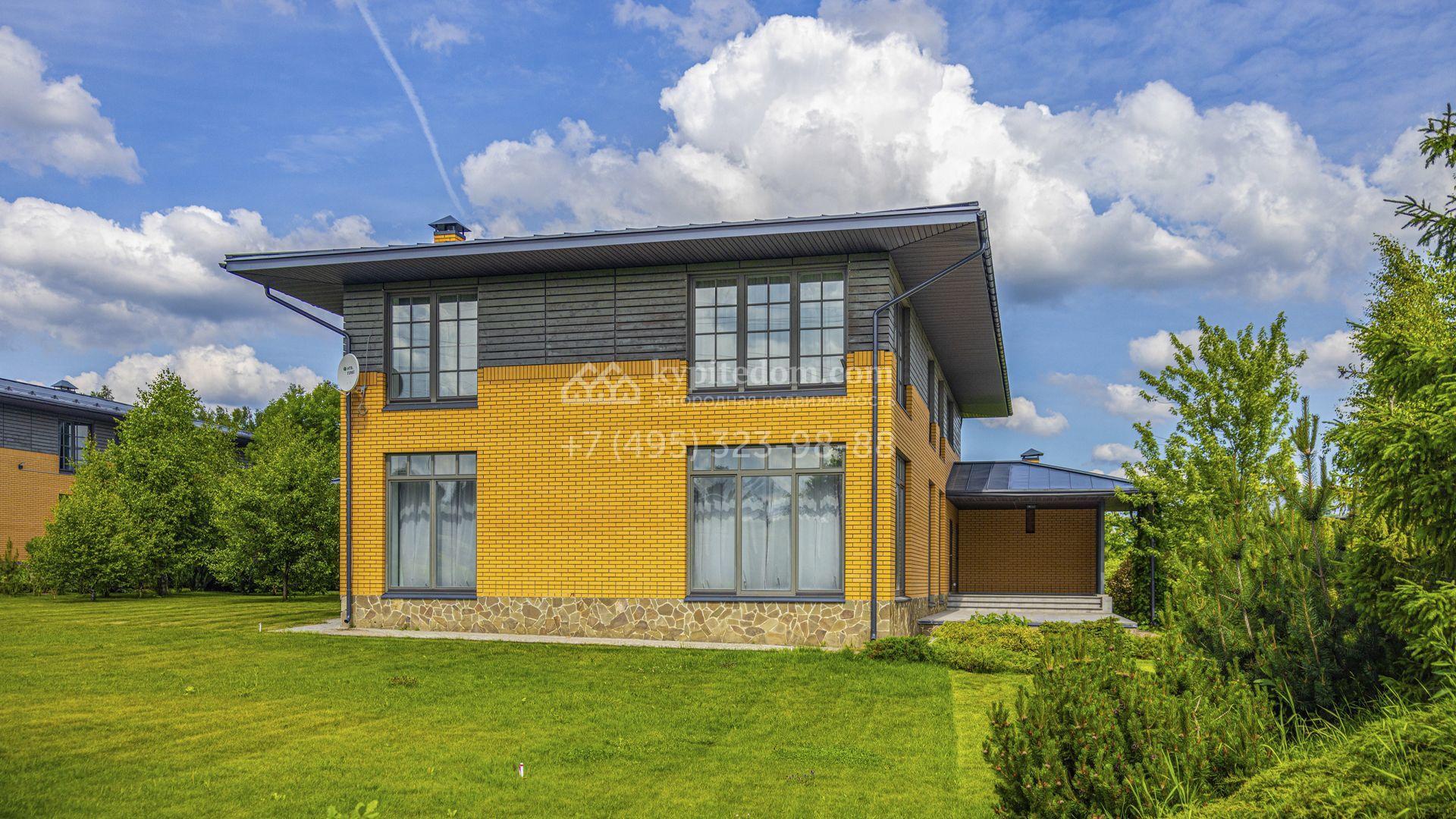 Загородный дом площадью 422 м² построен на просторном полевом участке 22 сотки. Фасад здания облицован бежевым клинкерным кирпичом и декорирован вставками с фактурой дерева. Интерьер выполнен в современном стиле, в отделке использованы на стенах краска и вставки из высококачественных обоев, на полу итальянская плитка и инженерная доска, установлены дубовая лестница и двери с натуральным шпоном. Дом укомплектован встроенными шкафами и гардеробными. Планировка резиденции включает 6 спален, гостиную с камином, кухню-столовую, кабинет и террасу, на которой можно обустроить зону барбекю. В контуре коттеджа предусмотрен гараж на 2 машины.
