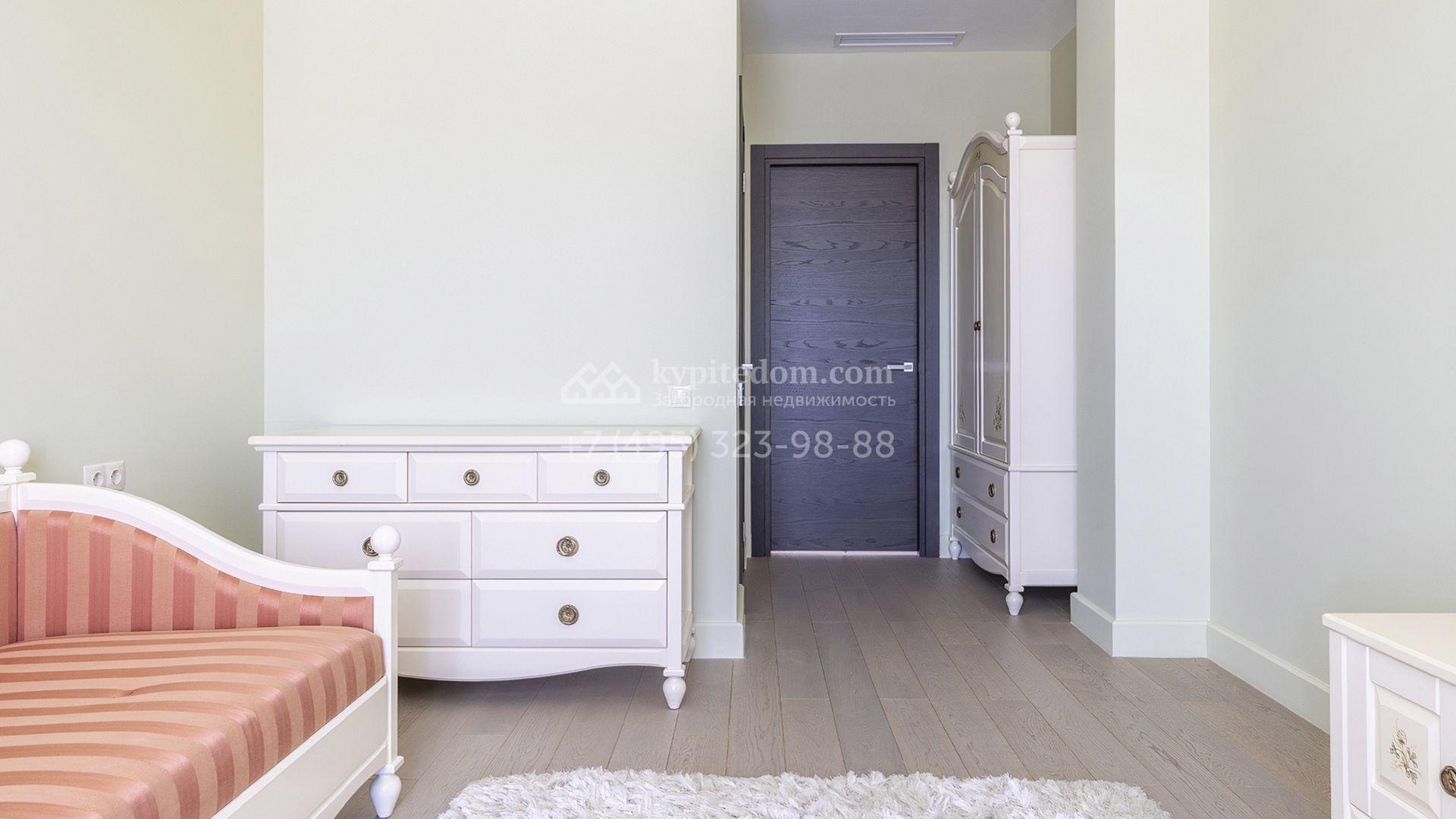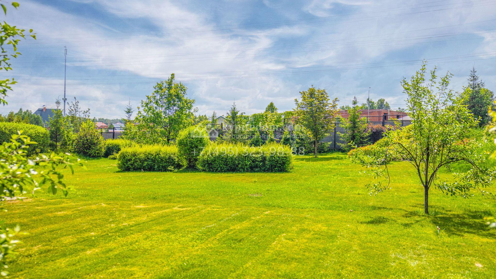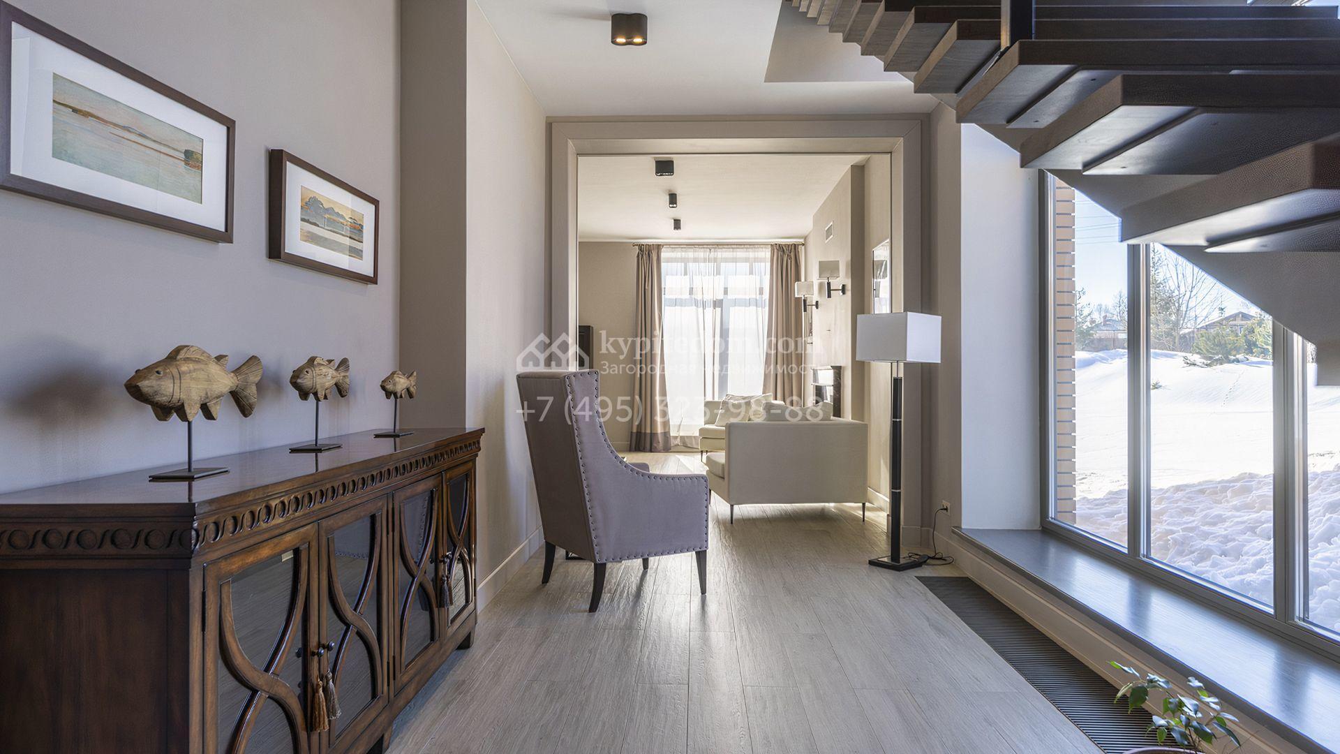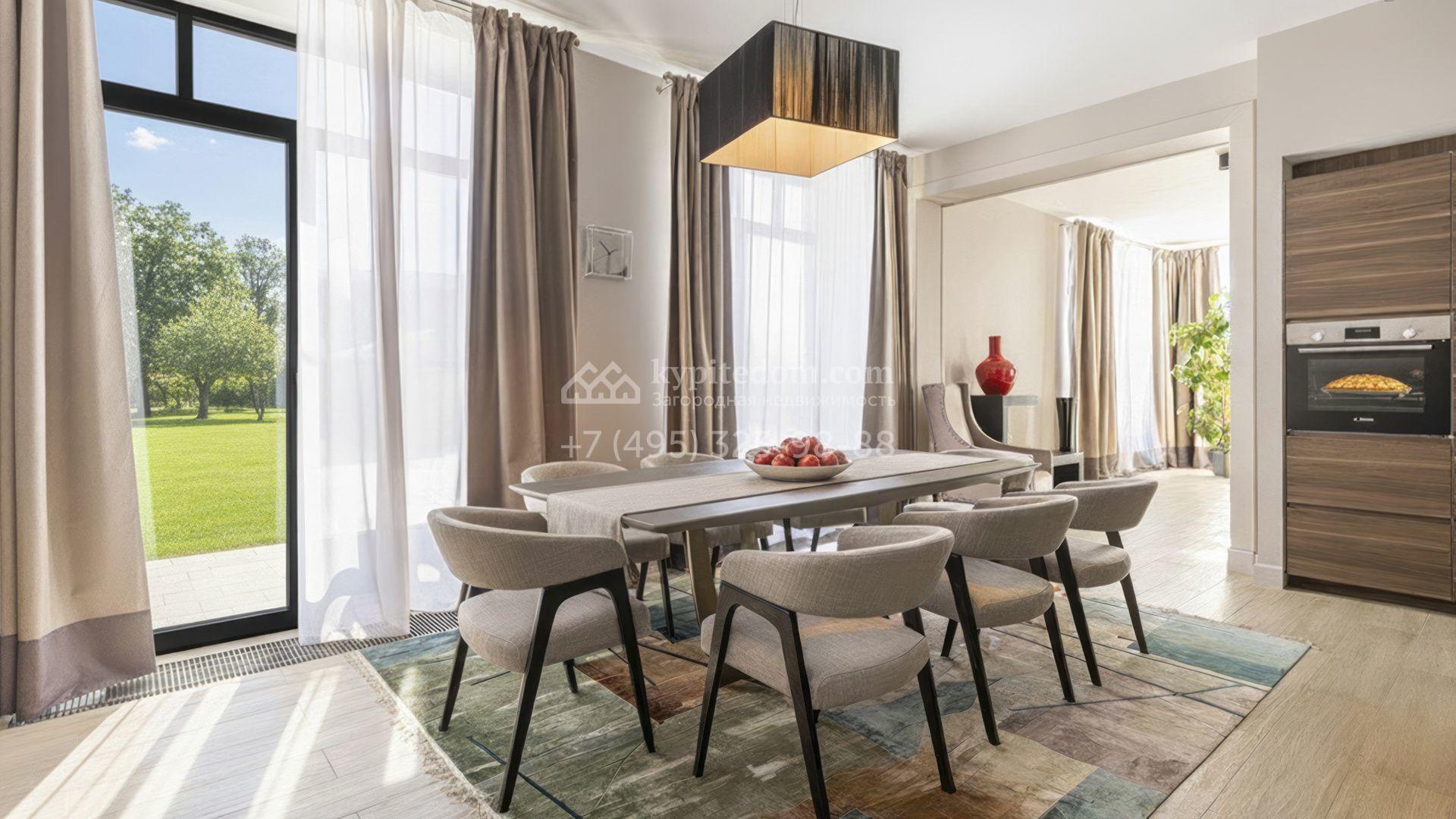 Загородный дом площадью 422 м² построен на просторном полевом участке 22 сотки. Фасад здания облицован бежевым клинкерным кирпичом и декорирован вставками с фактурой дерева. Интерьер выполнен в современном стиле, в отделке использованы на стенах краска и вставки из высококачественных обоев, на полу итальянская плитка и инженерная доска, установлены дубовая лестница и двери с натуральным шпоном. Дом укомплектован встроенными шкафами и гардеробными. Планировка резиденции включает 6 спален, гостиную с камином, кухню-столовую, кабинет и террасу, на которой можно обустроить зону барбекю. В контуре коттеджа предусмотрен гараж на 2 машины.