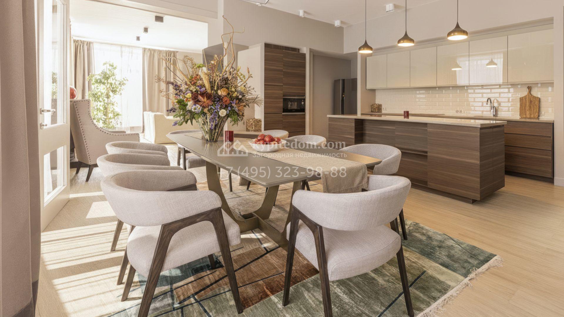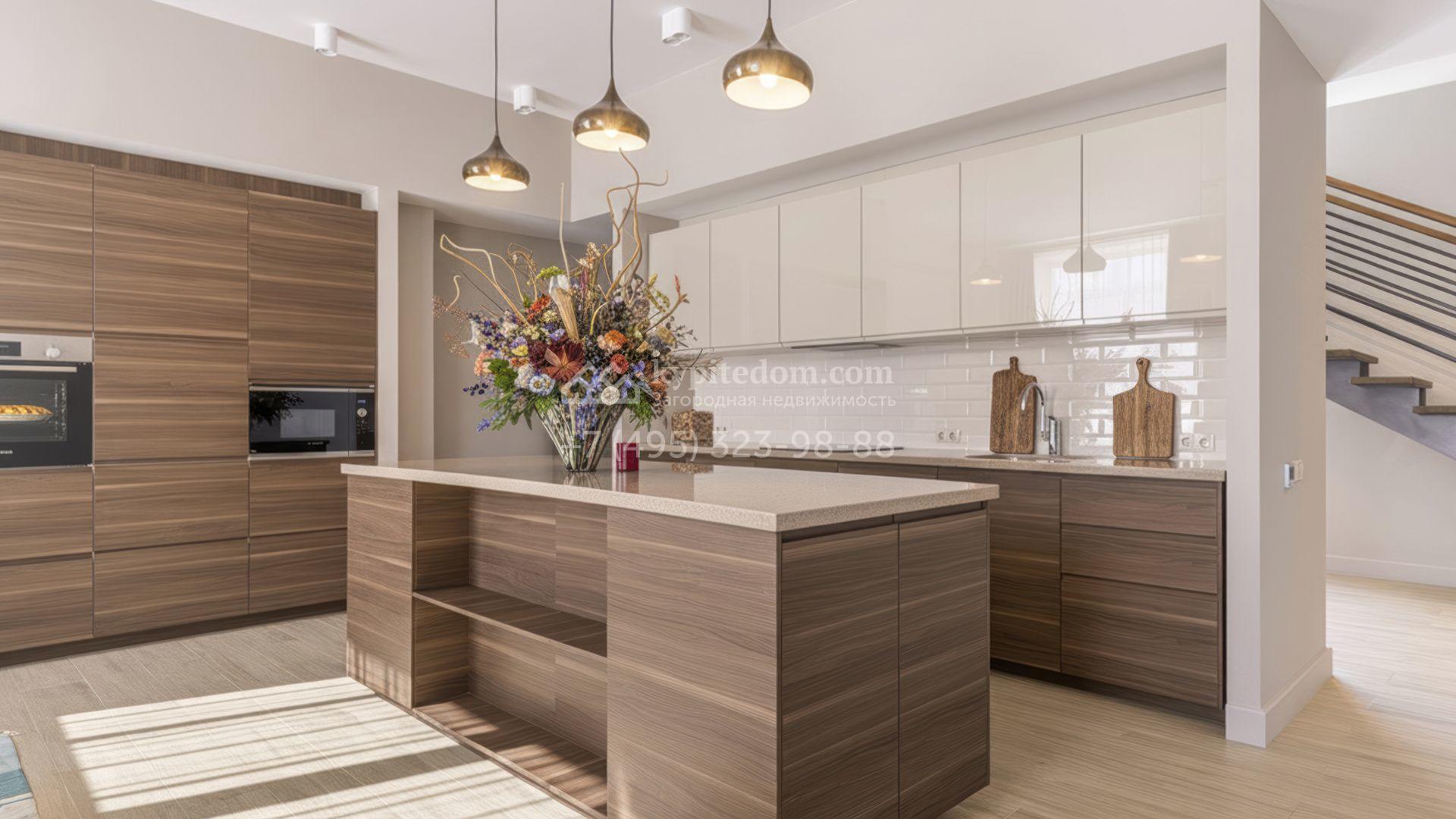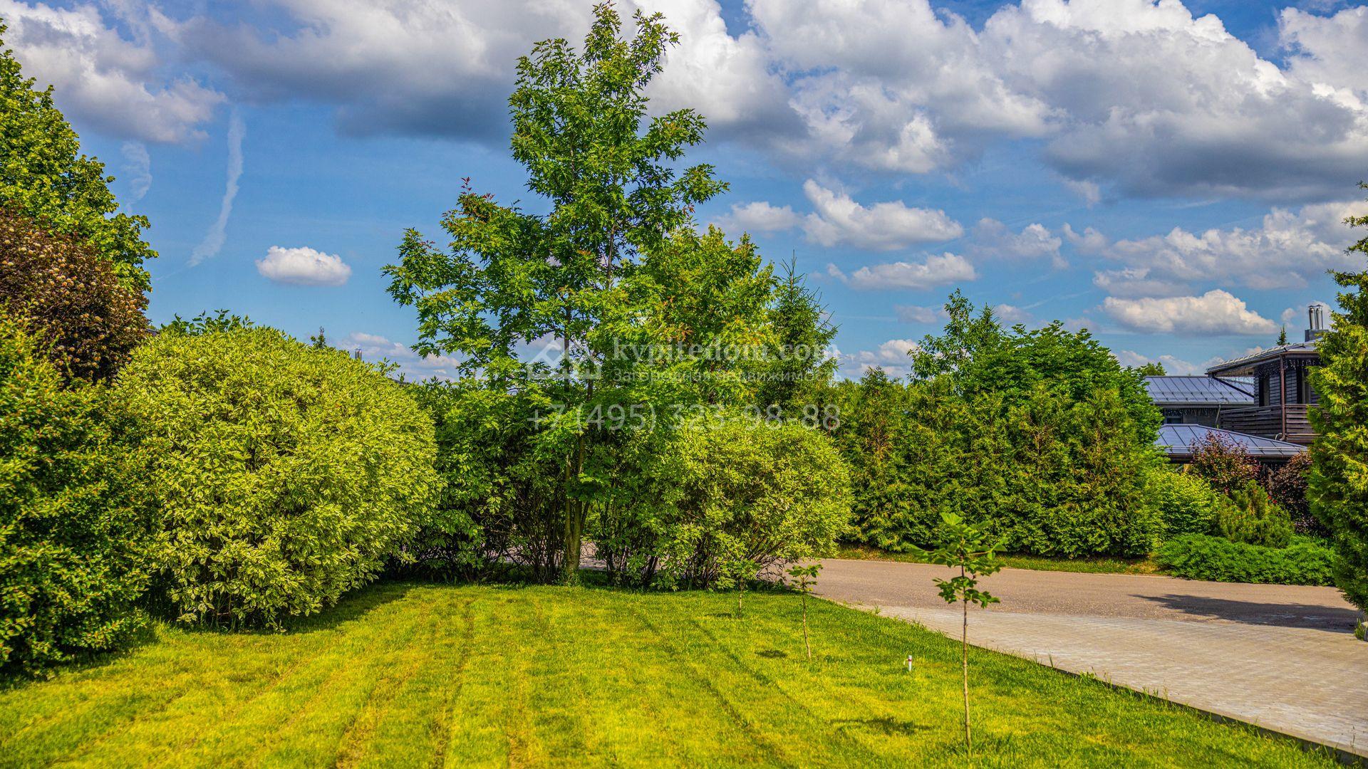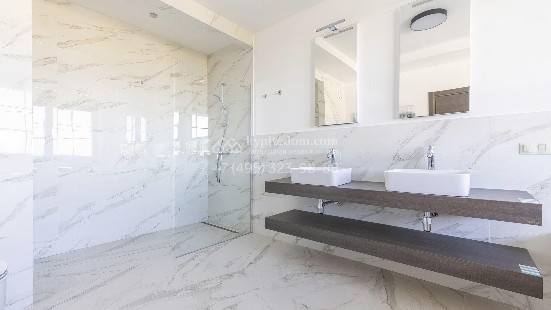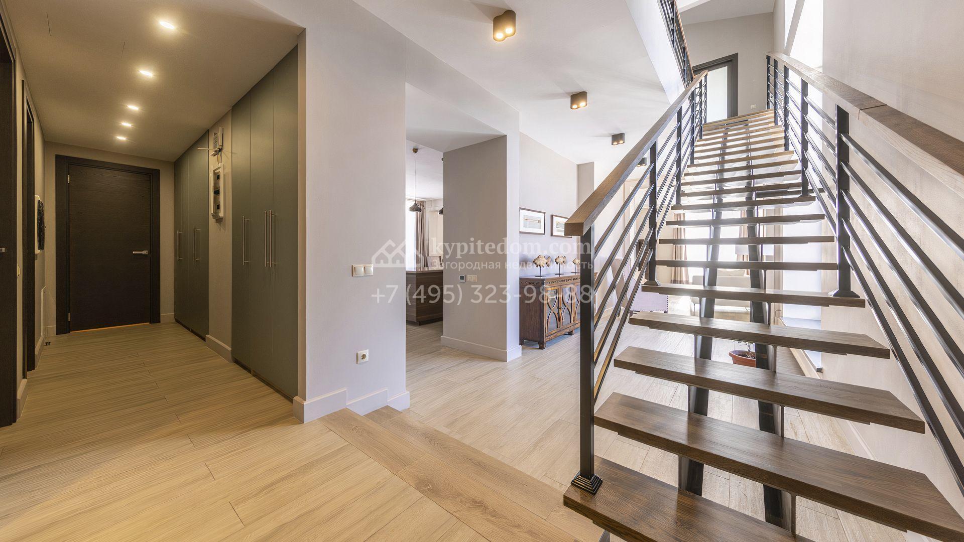 Загородный дом площадью 422 м² построен на просторном полевом участке 22 сотки. Фасад здания облицован бежевым клинкерным кирпичом и декорирован вставками с фактурой дерева. Интерьер выполнен в современном стиле, в отделке использованы на стенах краска и вставки из высококачественных обоев, на полу итальянская плитка и инженерная доска, установлены дубовая лестница и двери с натуральным шпоном. Дом укомплектован встроенными шкафами и гардеробными. Планировка резиденции включает 6 спален, гостиную с камином, кухню-столовую, кабинет и террасу, на которой можно обустроить зону барбекю. В контуре коттеджа предусмотрен гараж на 2 машины.