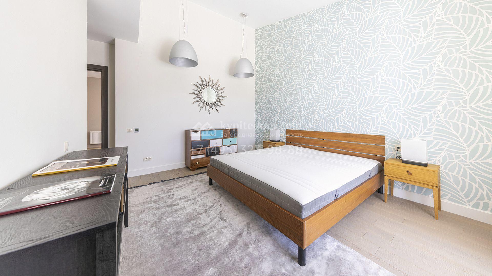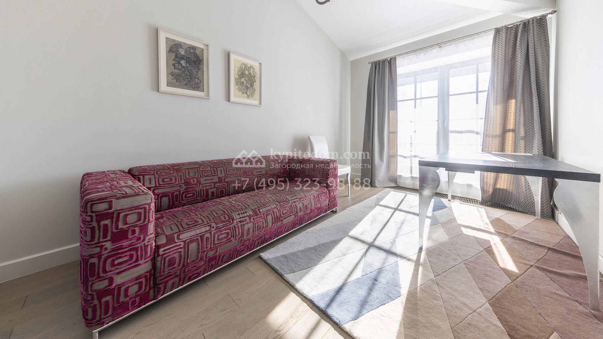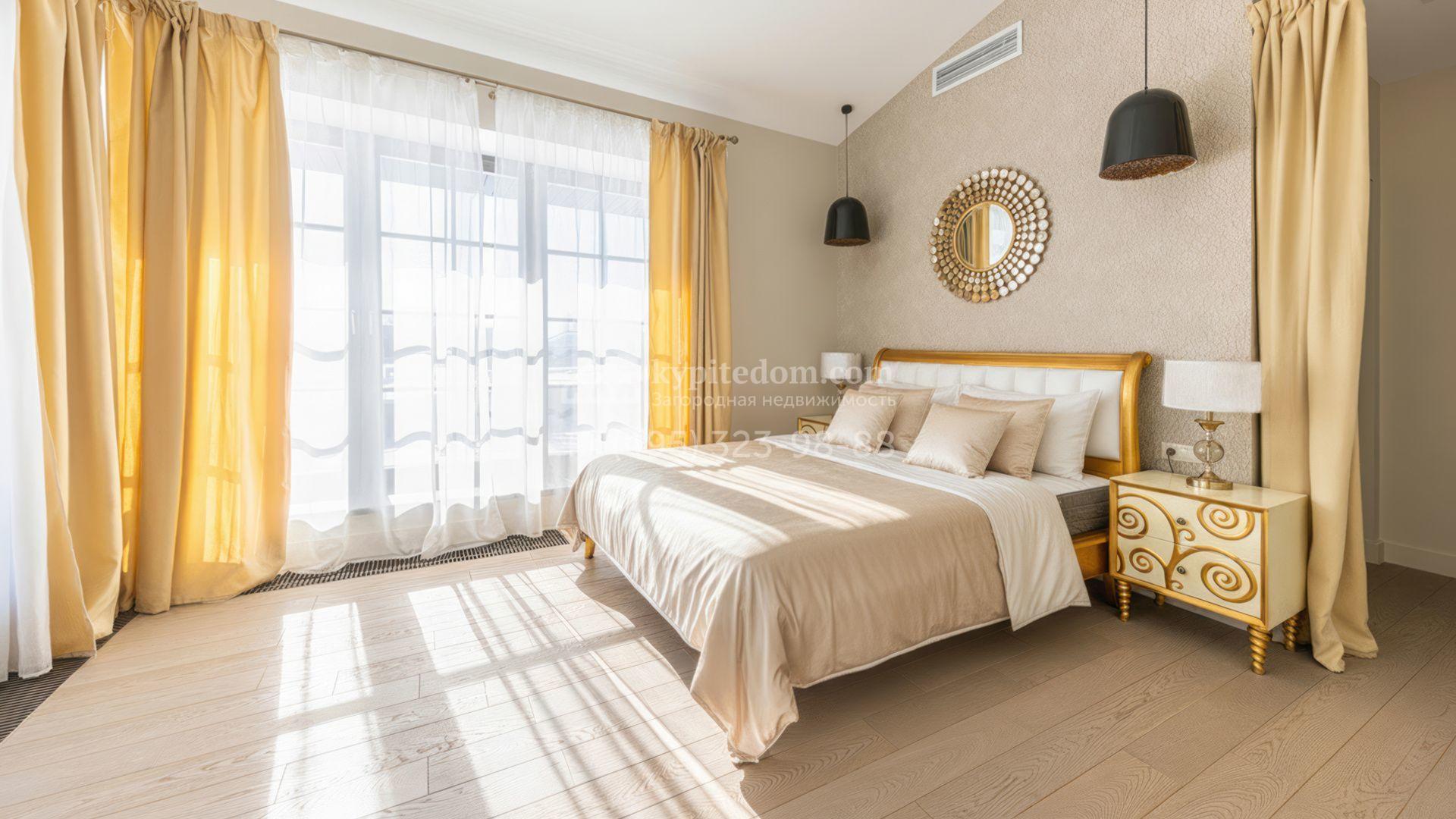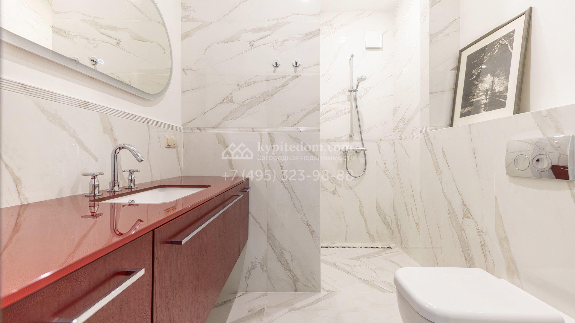 Загородный дом площадью 422 м² построен на просторном полевом участке 22 сотки. Фасад здания облицован бежевым клинкерным кирпичом и декорирован вставками с фактурой дерева. Интерьер выполнен в современном стиле, в отделке использованы на стенах краска и вставки из высококачественных обоев, на полу итальянская плитка и инженерная доска, установлены дубовая лестница и двери с натуральным шпоном. Дом укомплектован встроенными шкафами и гардеробными. Планировка резиденции включает 6 спален, гостиную с камином, кухню-столовую, кабинет и террасу, на которой можно обустроить зону барбекю. В контуре коттеджа предусмотрен гараж на 2 машины.