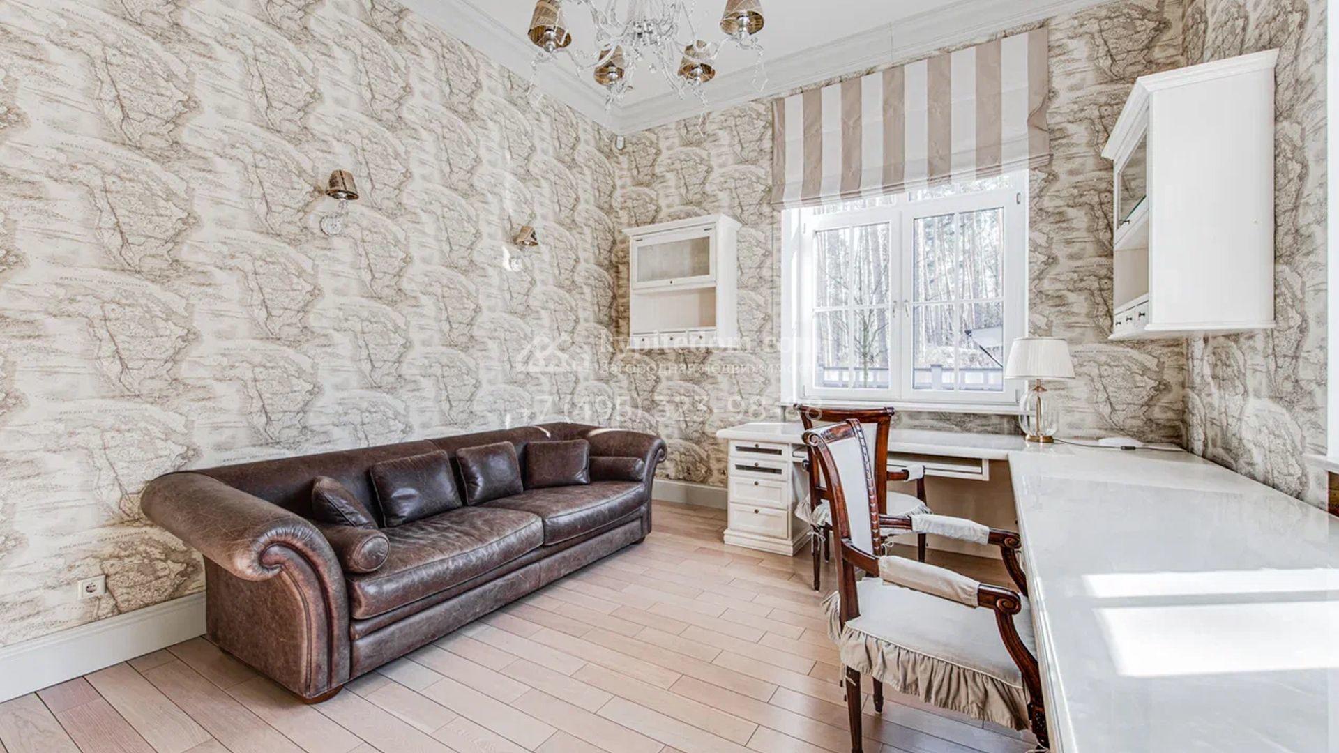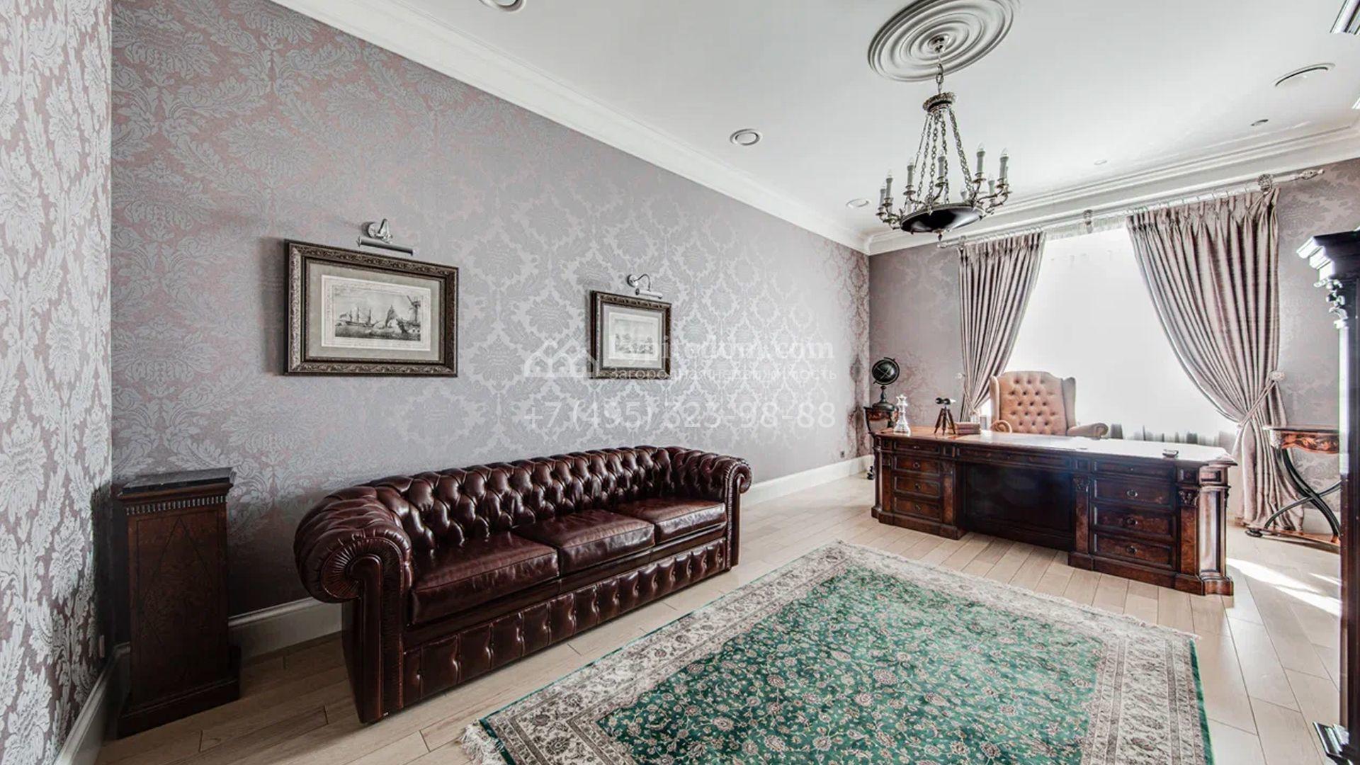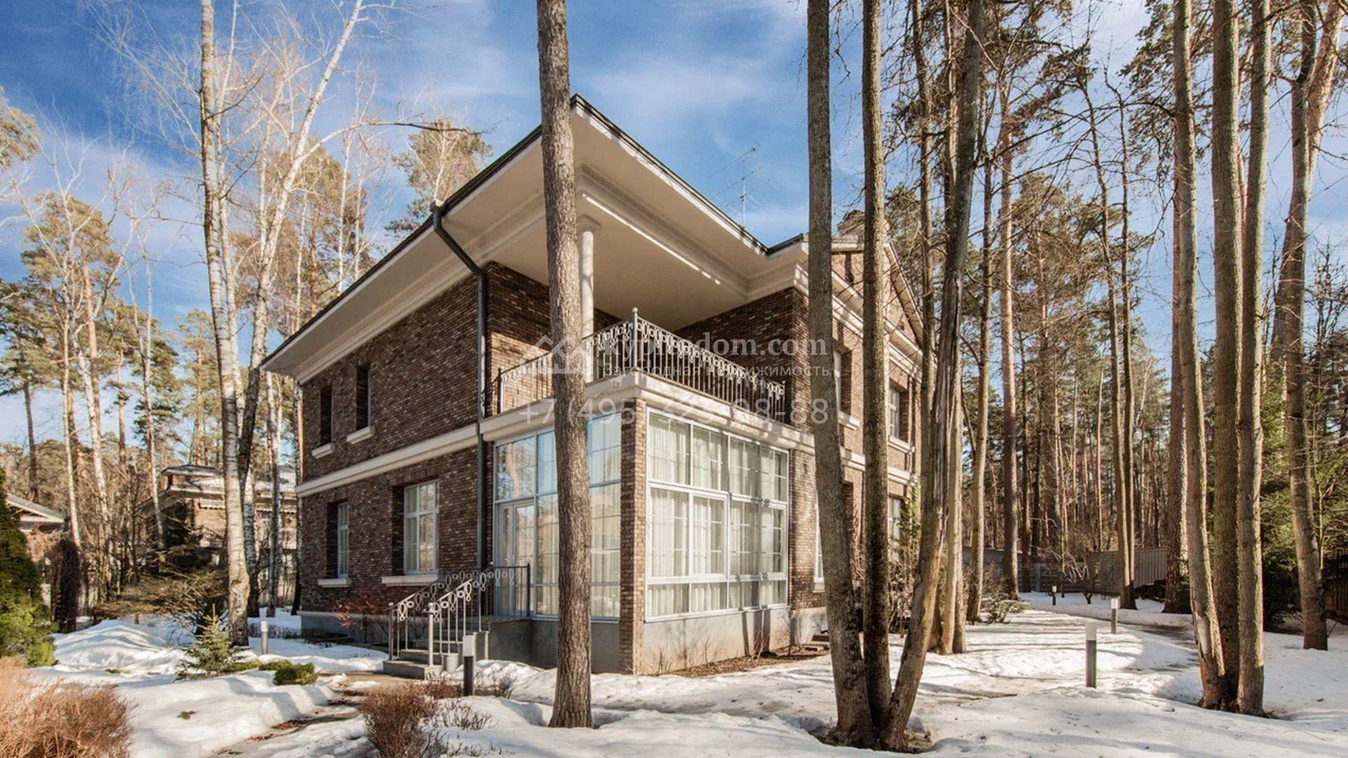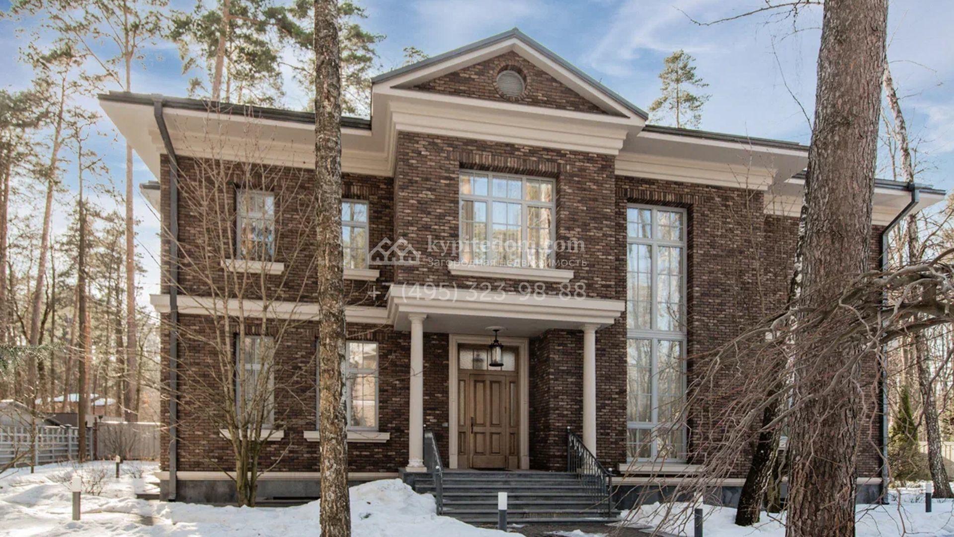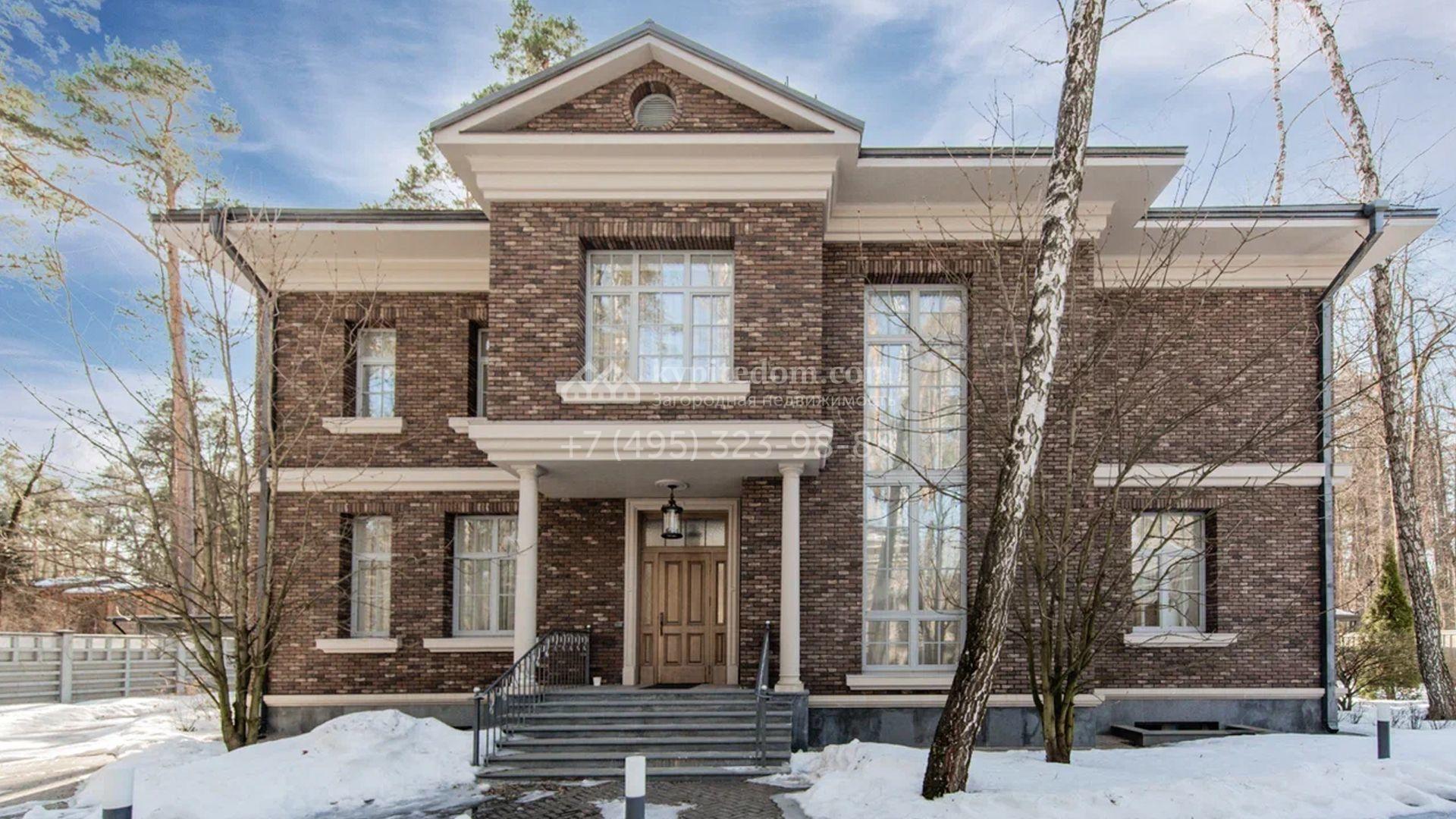 Загородный дом площадью 650 м² построен на просторном участке 25 соток в окружении реликтового леса. Фасад здания облицован коричневым клинкерным кирпичом, декорирован кремовыми колоннами и карнизами. В отделке интерьера в теплых тонах преобладает классический стиль. Планировка резиденции включает 5 спален, уютную гостиную с камином, кухню-столовую с выходом в зимний сад, кабинет, тренажерный зал, сауну и бильярдную. Рядом расположен гараж на 3 машины с двухкомнатной квартирой для персонала. На участке выполнен ландшафтный дизайн и обустроена беседка-барбекю.