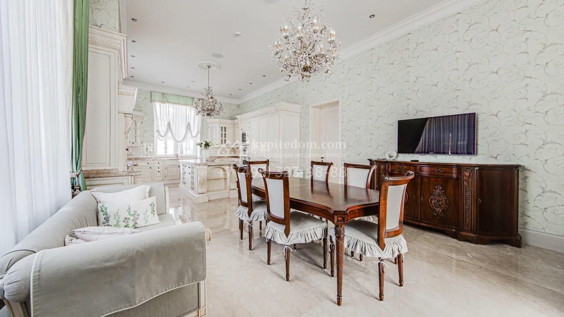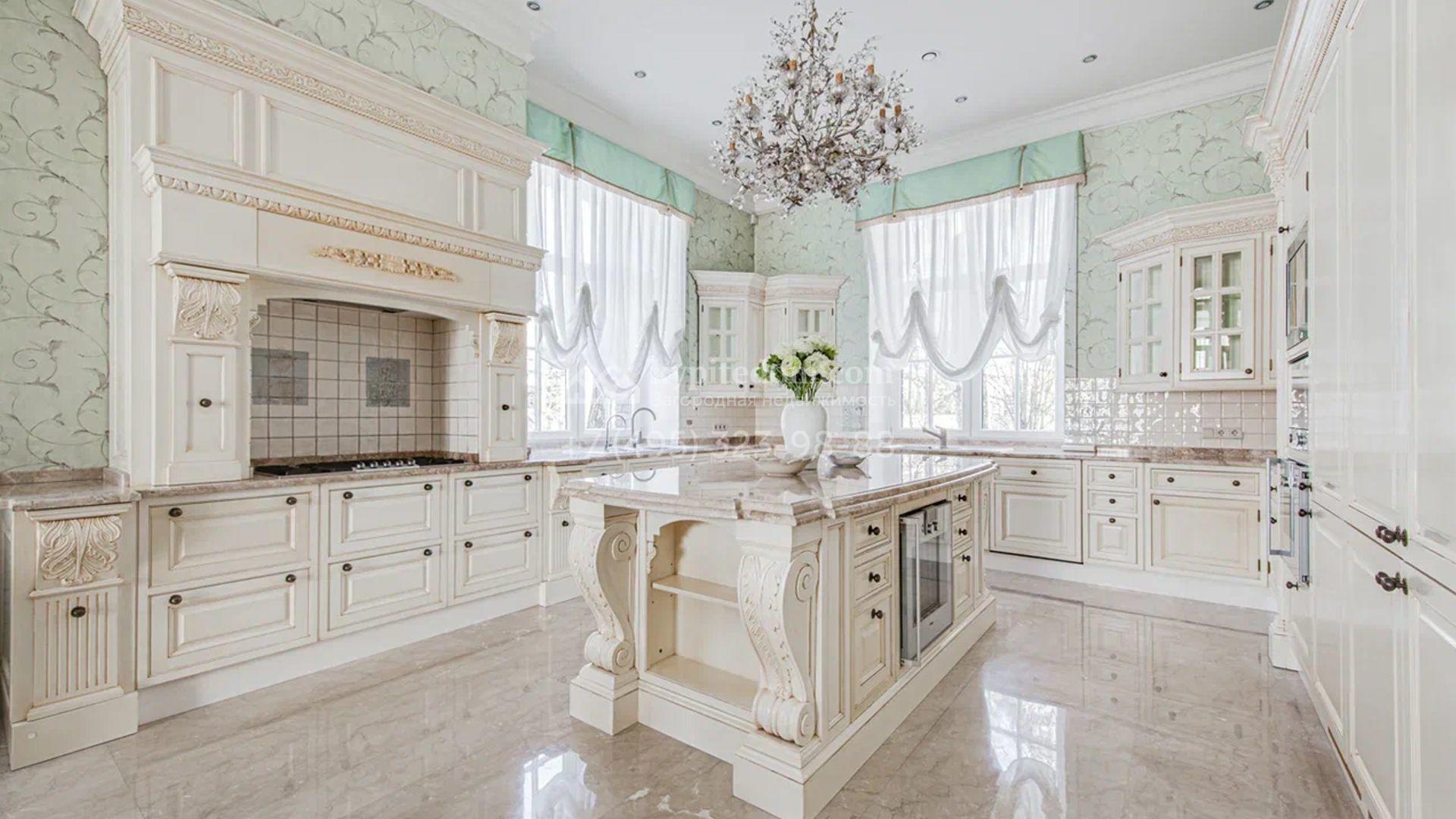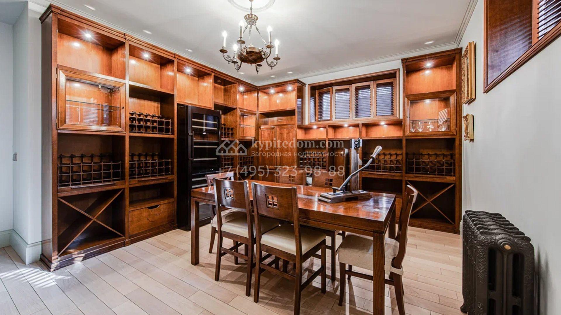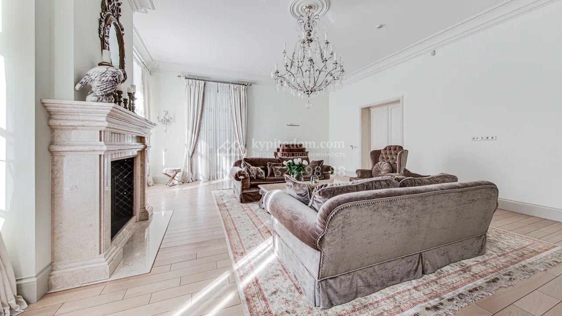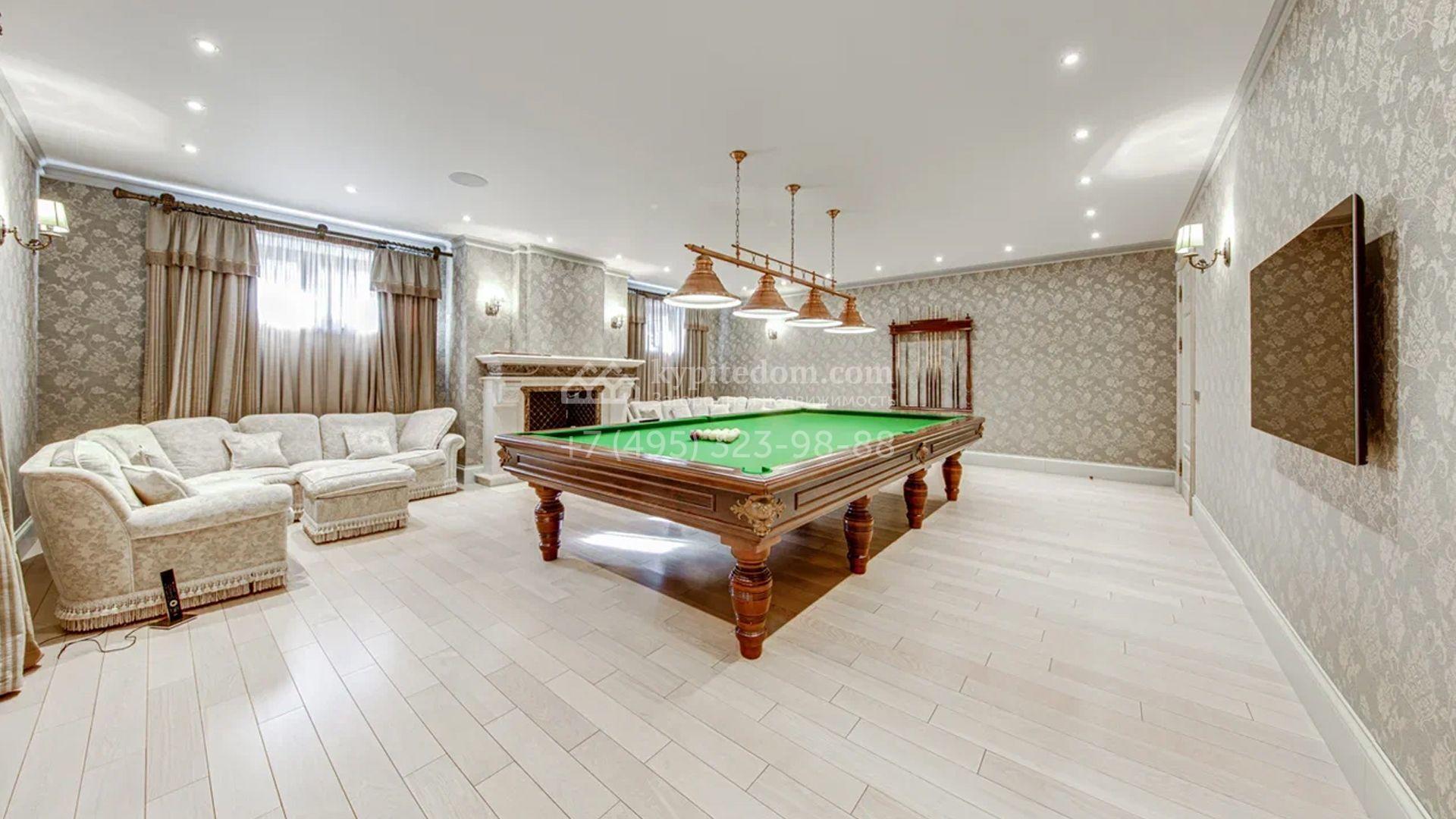 Загородный дом площадью 650 м² построен на просторном участке 25 соток в окружении реликтового леса. Фасад здания облицован коричневым клинкерным кирпичом, декорирован кремовыми колоннами и карнизами. В отделке интерьера в теплых тонах преобладает классический стиль. Планировка резиденции включает 5 спален, уютную гостиную с камином, кухню-столовую с выходом в зимний сад, кабинет, тренажерный зал, сауну и бильярдную. Рядом расположен гараж на 3 машины с двухкомнатной квартирой для персонала. На участке выполнен ландшафтный дизайн и обустроена беседка-барбекю.