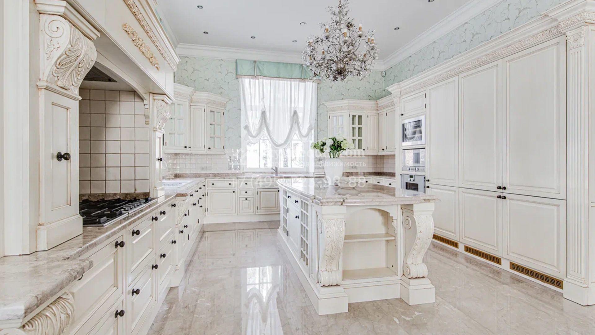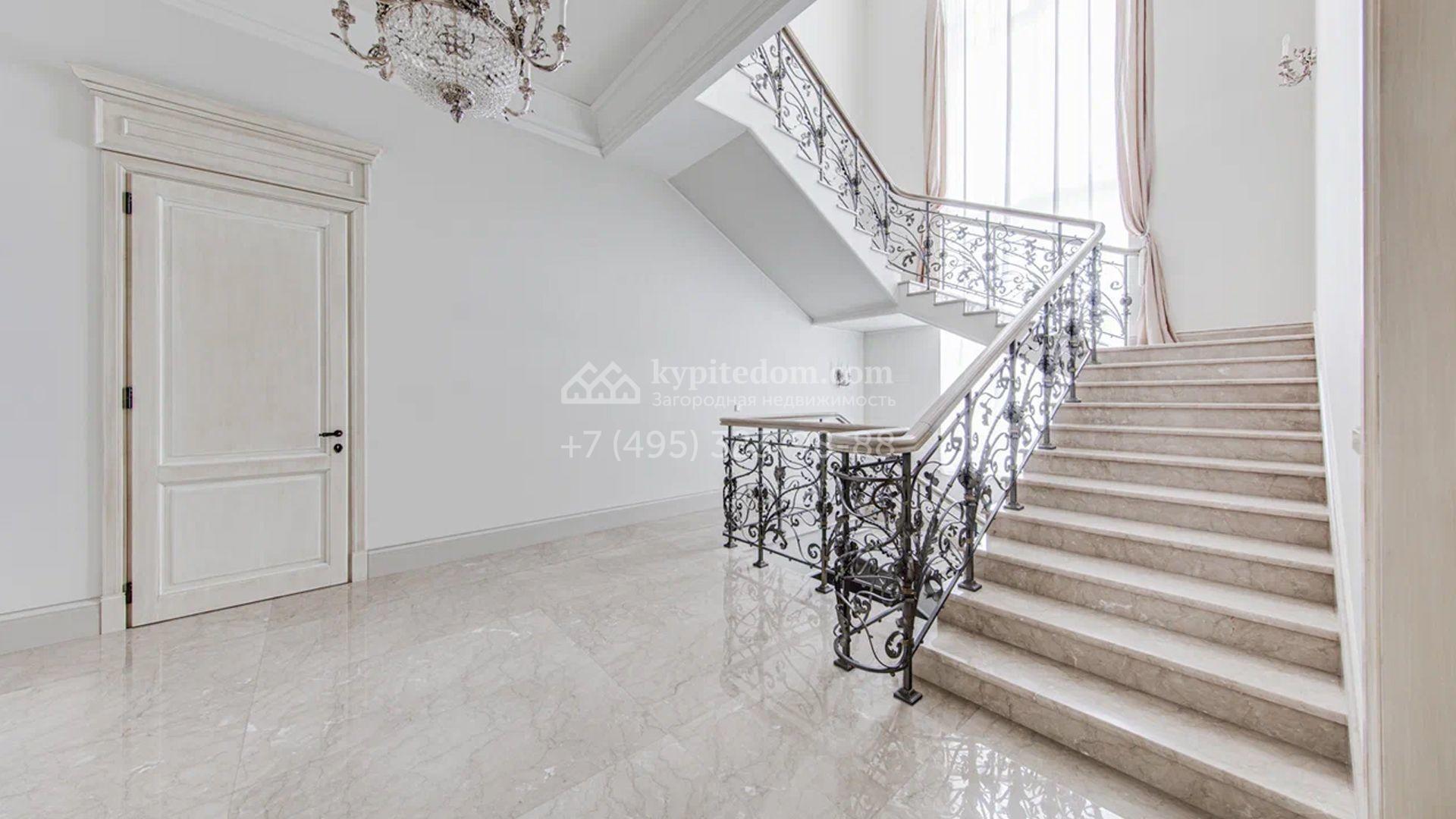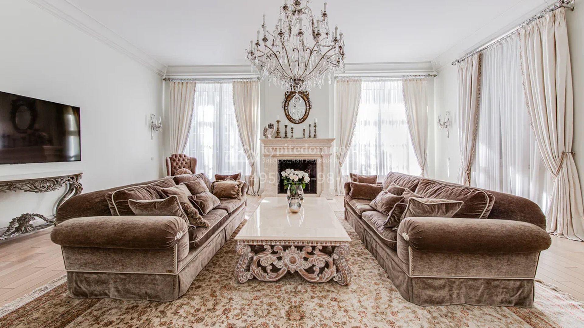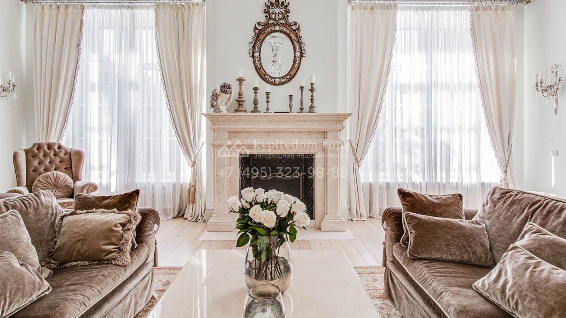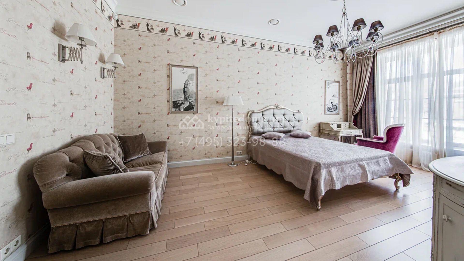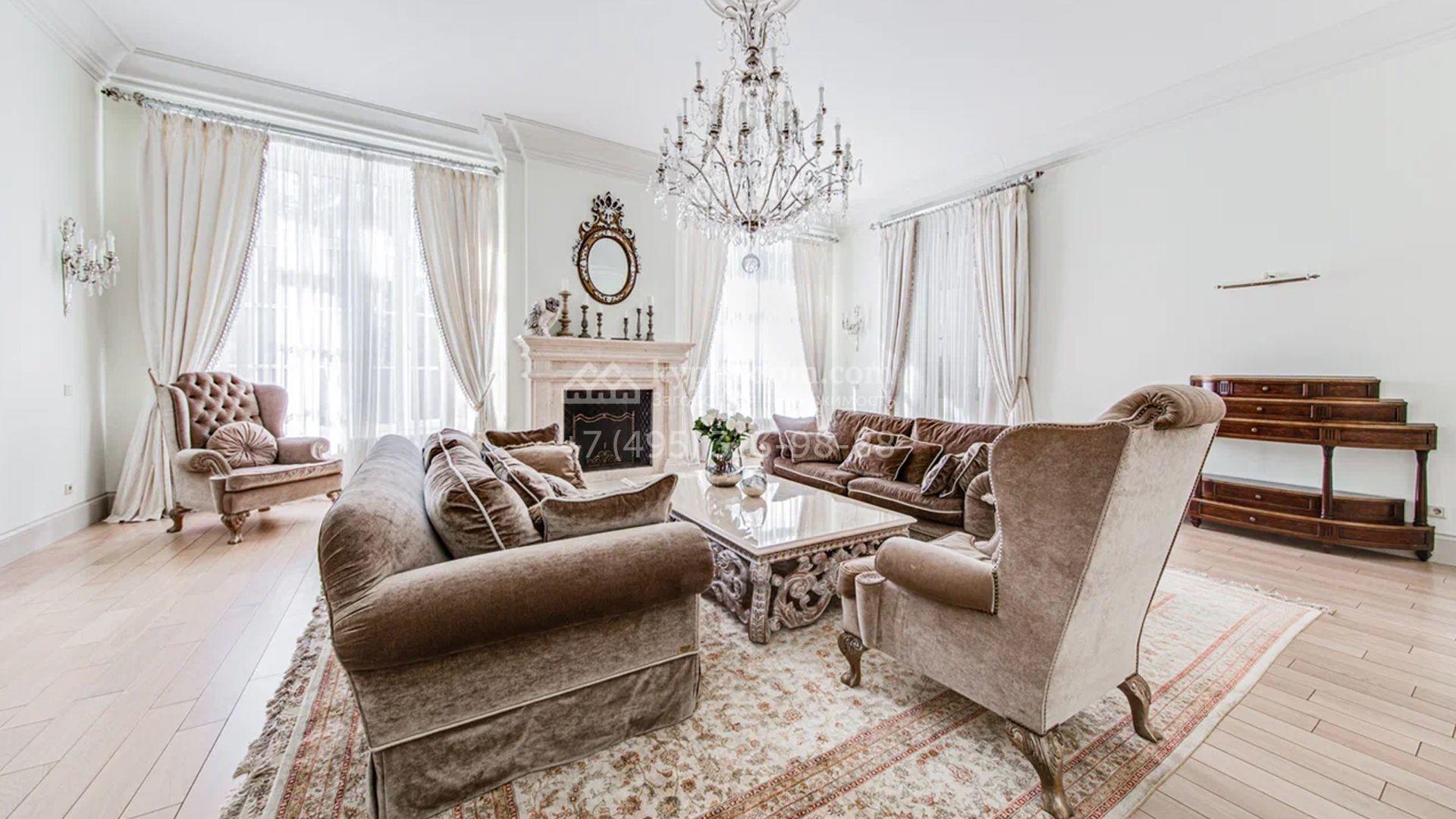 Загородный дом площадью 650 м² построен на просторном участке 25 соток в окружении реликтового леса. Фасад здания облицован коричневым клинкерным кирпичом, декорирован кремовыми колоннами и карнизами. В отделке интерьера в теплых тонах преобладает классический стиль. Планировка резиденции включает 5 спален, уютную гостиную с камином, кухню-столовую с выходом в зимний сад, кабинет, тренажерный зал, сауну и бильярдную. Рядом расположен гараж на 3 машины с двухкомнатной квартирой для персонала. На участке выполнен ландшафтный дизайн и обустроена беседка-барбекю.