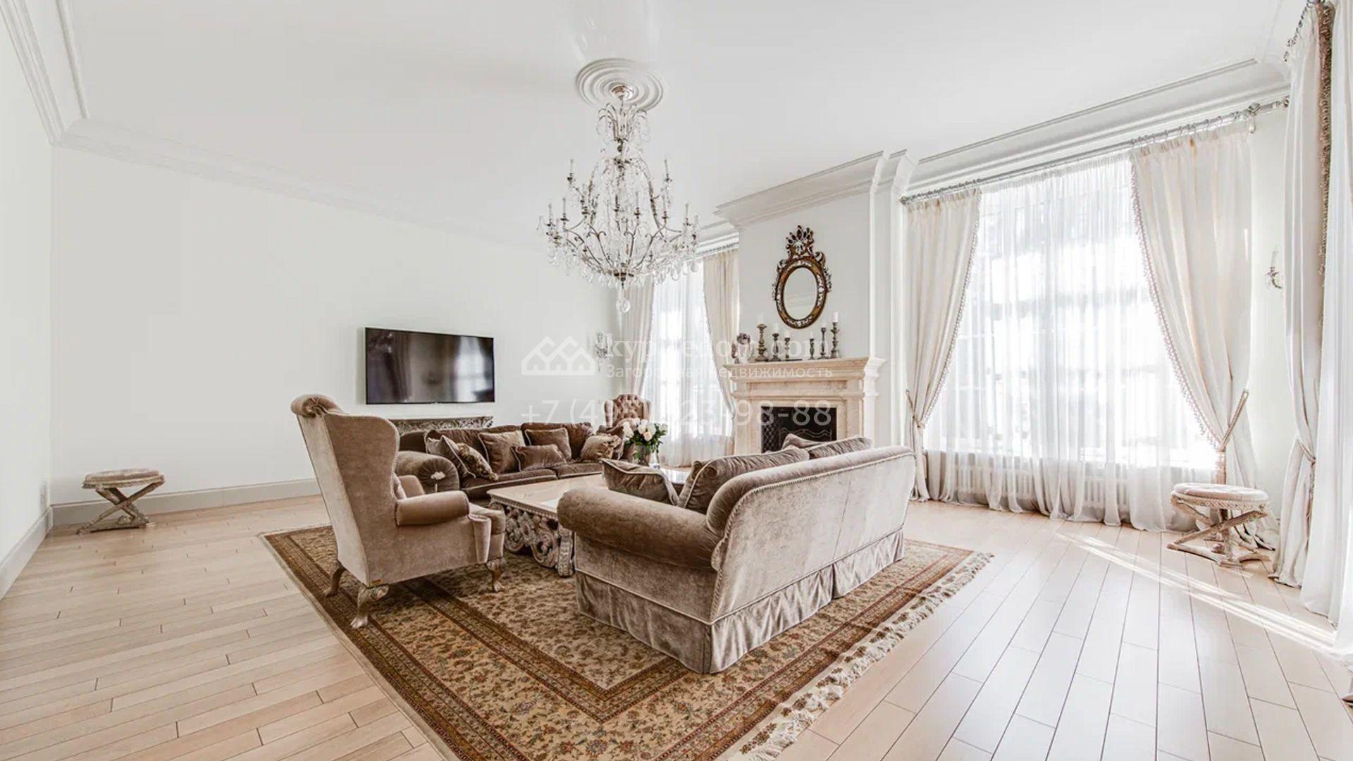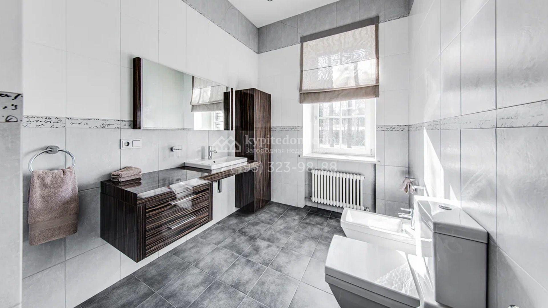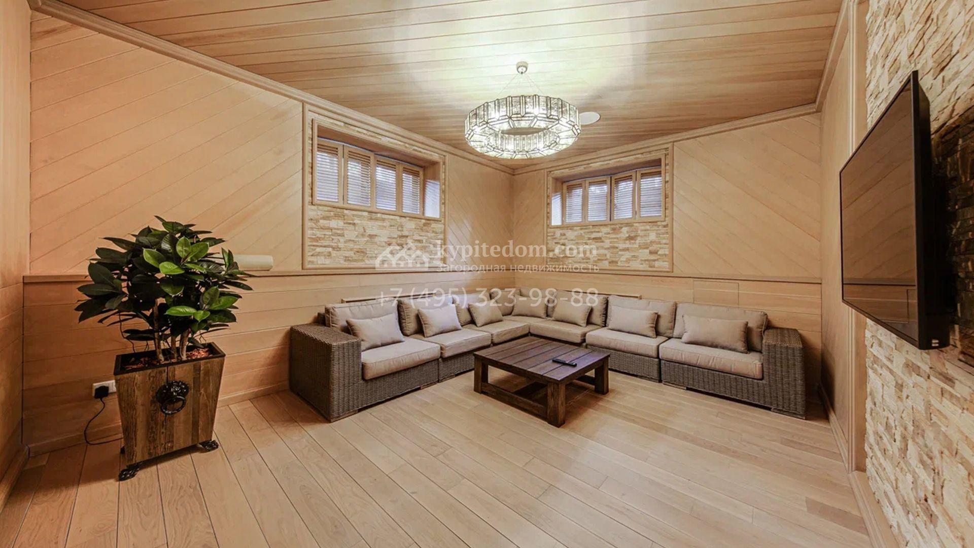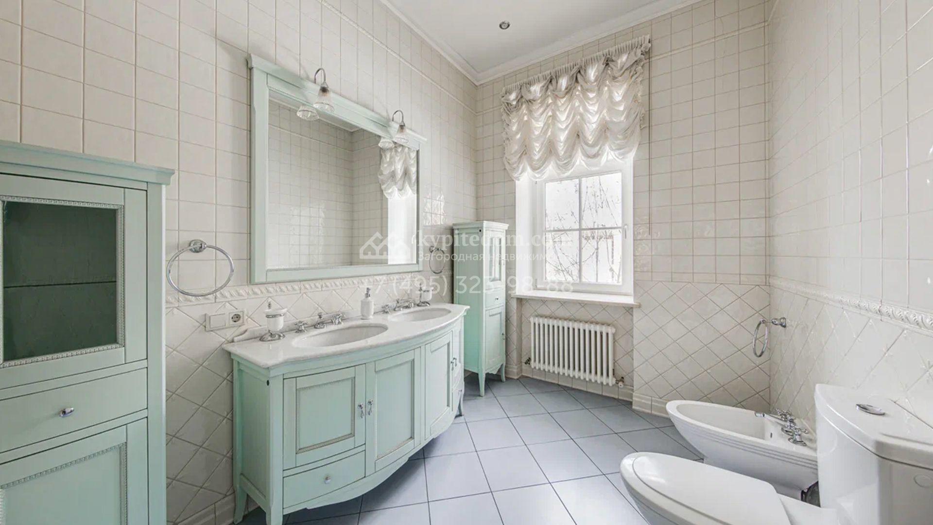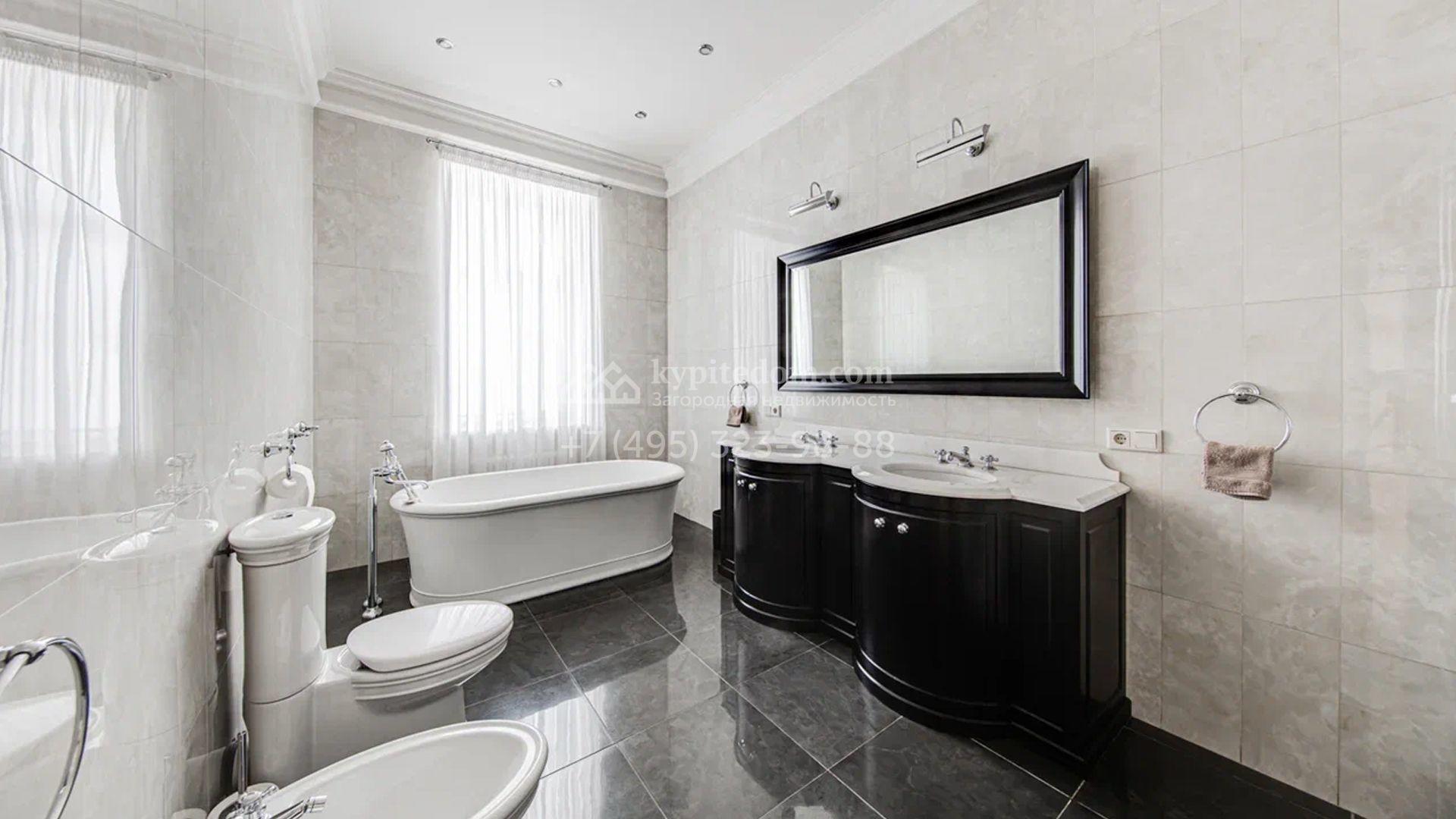 Загородный дом площадью 650 м² построен на просторном участке 25 соток в окружении реликтового леса. Фасад здания облицован коричневым клинкерным кирпичом, декорирован кремовыми колоннами и карнизами. В отделке интерьера в теплых тонах преобладает классический стиль. Планировка резиденции включает 5 спален, уютную гостиную с камином, кухню-столовую с выходом в зимний сад, кабинет, тренажерный зал, сауну и бильярдную. Рядом расположен гараж на 3 машины с двухкомнатной квартирой для персонала. На участке выполнен ландшафтный дизайн и обустроена беседка-барбекю.
