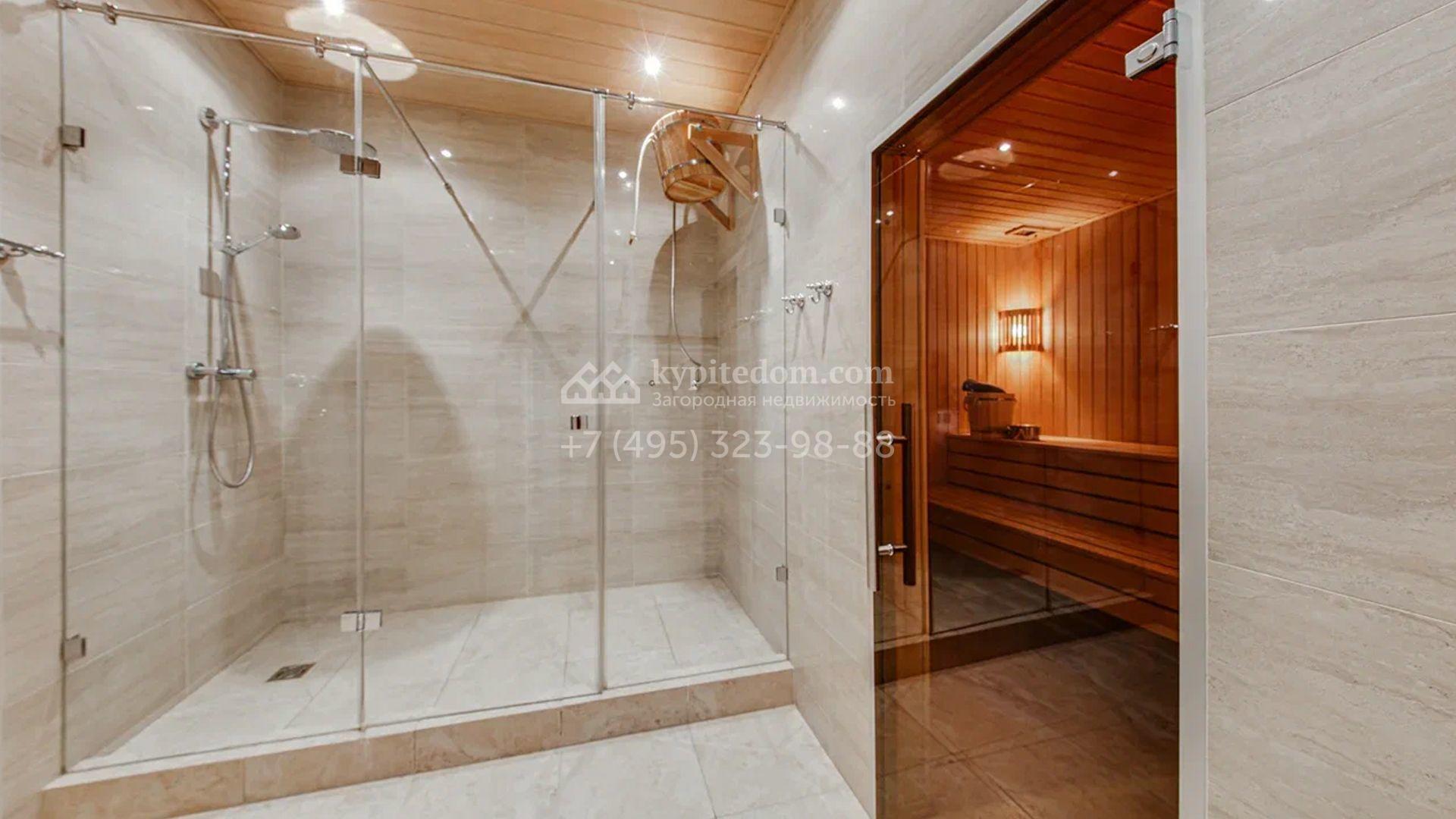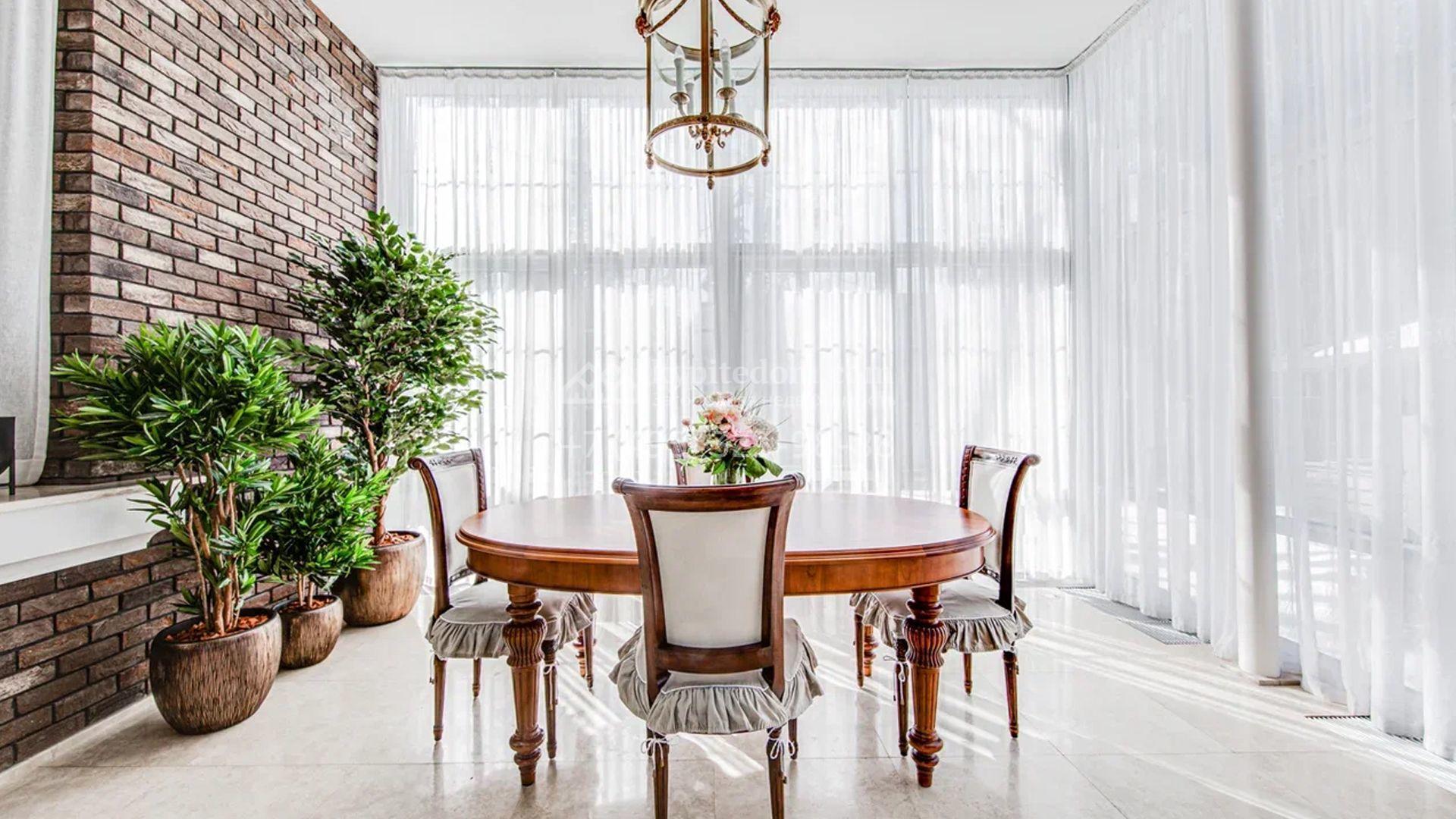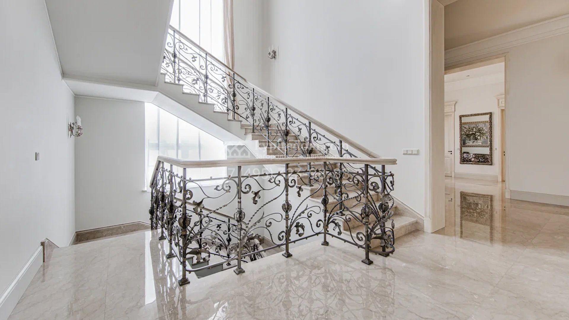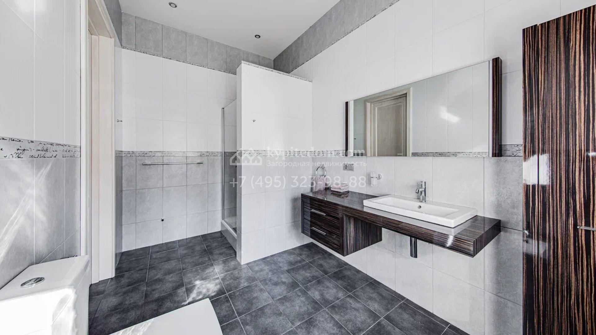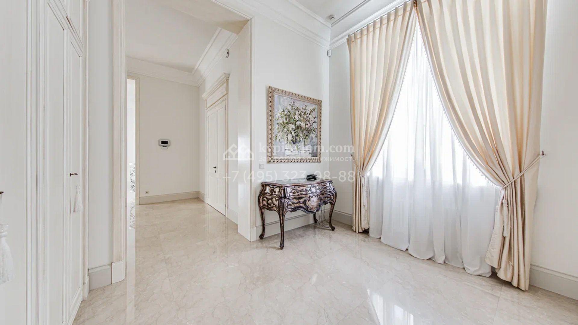 Загородный дом площадью 650 м² построен на просторном участке 25 соток в окружении реликтового леса. Фасад здания облицован коричневым клинкерным кирпичом, декорирован кремовыми колоннами и карнизами. В отделке интерьера в теплых тонах преобладает классический стиль. Планировка резиденции включает 5 спален, уютную гостиную с камином, кухню-столовую с выходом в зимний сад, кабинет, тренажерный зал, сауну и бильярдную. Рядом расположен гараж на 3 машины с двухкомнатной квартирой для персонала. На участке выполнен ландшафтный дизайн и обустроена беседка-барбекю.