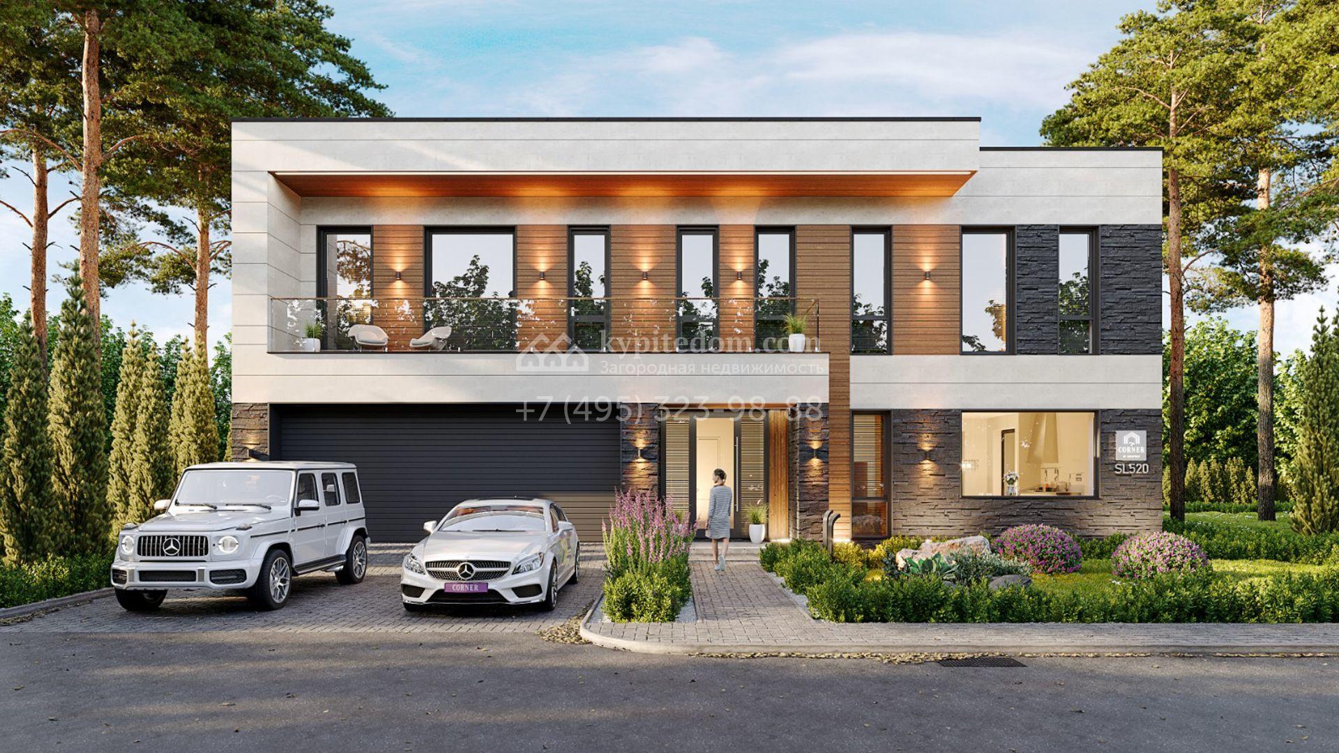 Загородный дом площадью 396 м² расположен на полевом участке 15,1 сотки. Фасад в современном стиле, сочетающий разные фактуры, декорирован подсветкой. Коттедж представлен без отделки. В резиденции спланировали 5 спален, гостиную, кухню-столовую, террасу и гараж на 2 машины. На участке выполнен ландшафтный дизайн, высажены деревья и кустарники, оборудовано уличное освещение.
