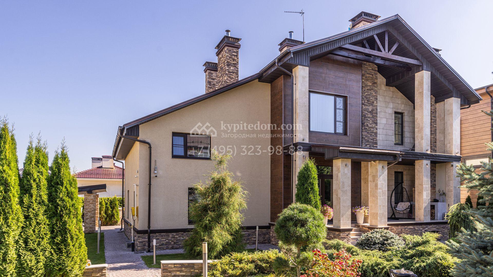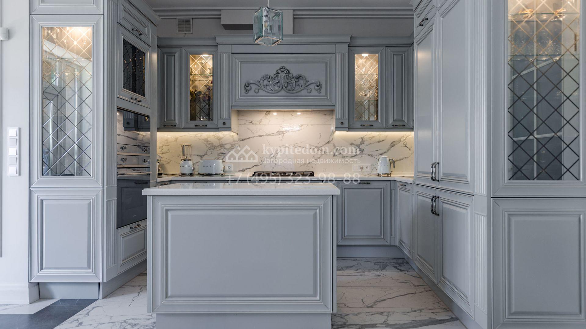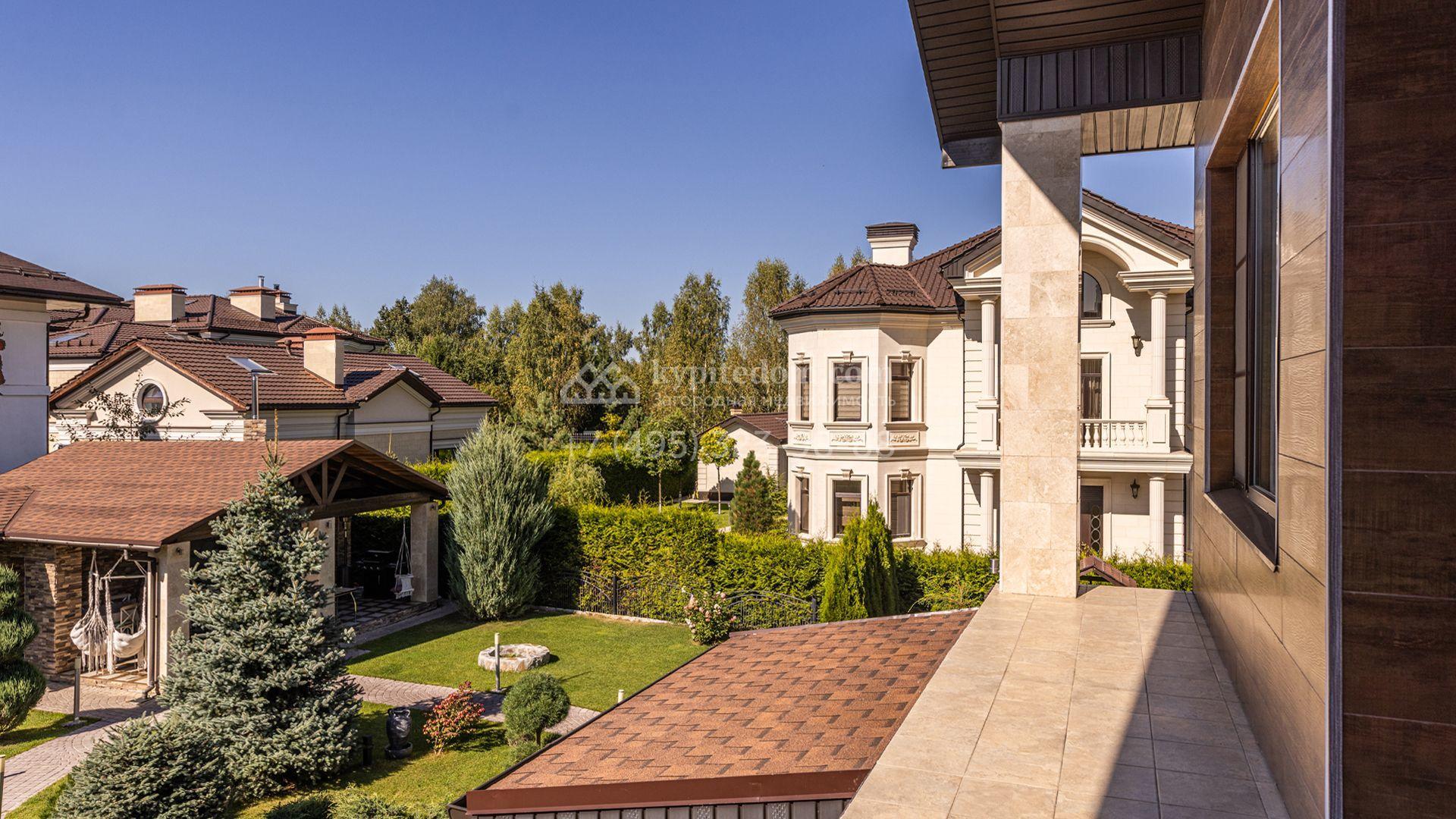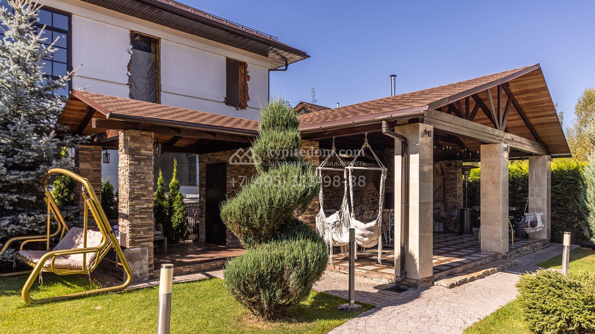 Загородная резиденция площадью 470 м² построена на полевом участке 11 соток в самом центре поселка, на второй линии от реки Беляны. Фасад здания в современном стиле облицован итальянским мрамором и керамогранитом. В отделке интерьера с элементами классики пробладают теплые оттенки, фактура камня и дерева. Планировка коттеджа включает 5 спален, уютную кухню-столовую-гостиную с камином, кабинет с камином и видом на парковую зону, бильярдную, кинотеатр, баню на дровах и SPA с циркулярным душем. В контуре дома предусмотрен гараж на 1 машину. Рядом расположены навес на 2 машины и беседка с огнищем и кухней. На участке выполнены ландшафтный дизайн и трехуровневые дренажные работы, высажены сортовые голубые ели и другие хвойные деревья, а также кустарники и бонсаи.