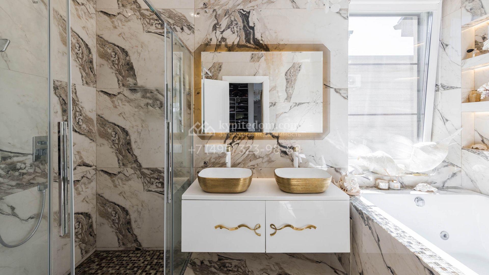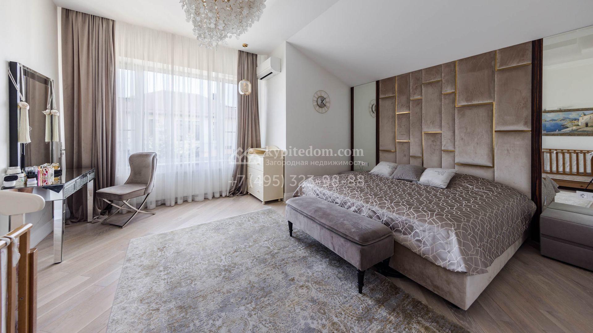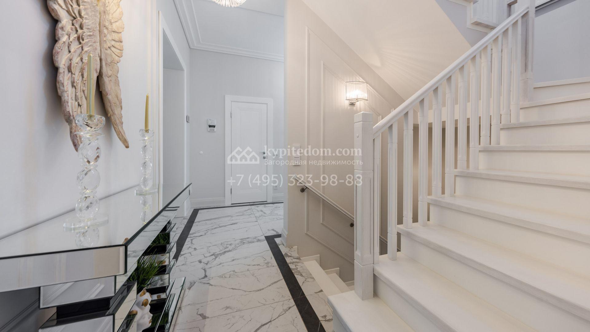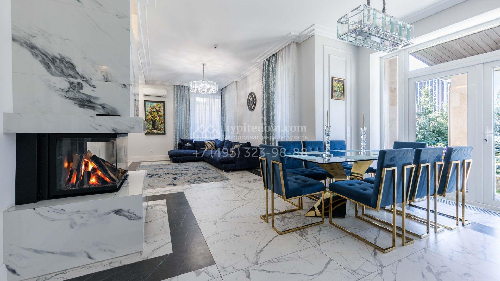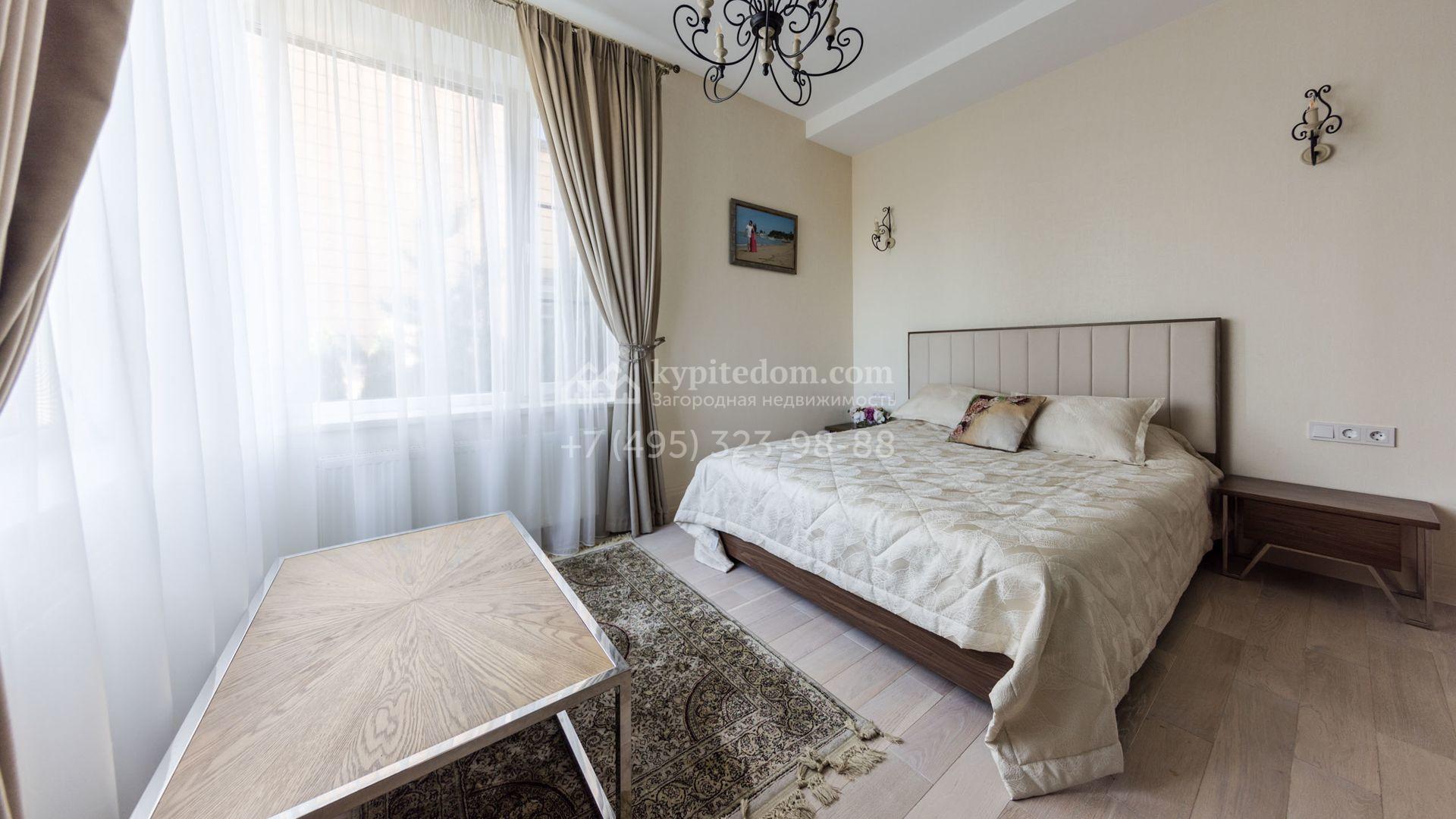 Загородная резиденция площадью 470 м² построена на полевом участке 11 соток в самом центре поселка, на второй линии от реки Беляны. Фасад здания в современном стиле облицован итальянским мрамором и керамогранитом. В отделке интерьера с элементами классики пробладают теплые оттенки, фактура камня и дерева. Планировка коттеджа включает 5 спален, уютную кухню-столовую-гостиную с камином, кабинет с камином и видом на парковую зону, бильярдную, кинотеатр, баню на дровах и SPA с циркулярным душем. В контуре дома предусмотрен гараж на 1 машину. Рядом расположены навес на 2 машины и беседка с огнищем и кухней. На участке выполнены ландшафтный дизайн и трехуровневые дренажные работы, высажены сортовые голубые ели и другие хвойные деревья, а также кустарники и бонсаи.