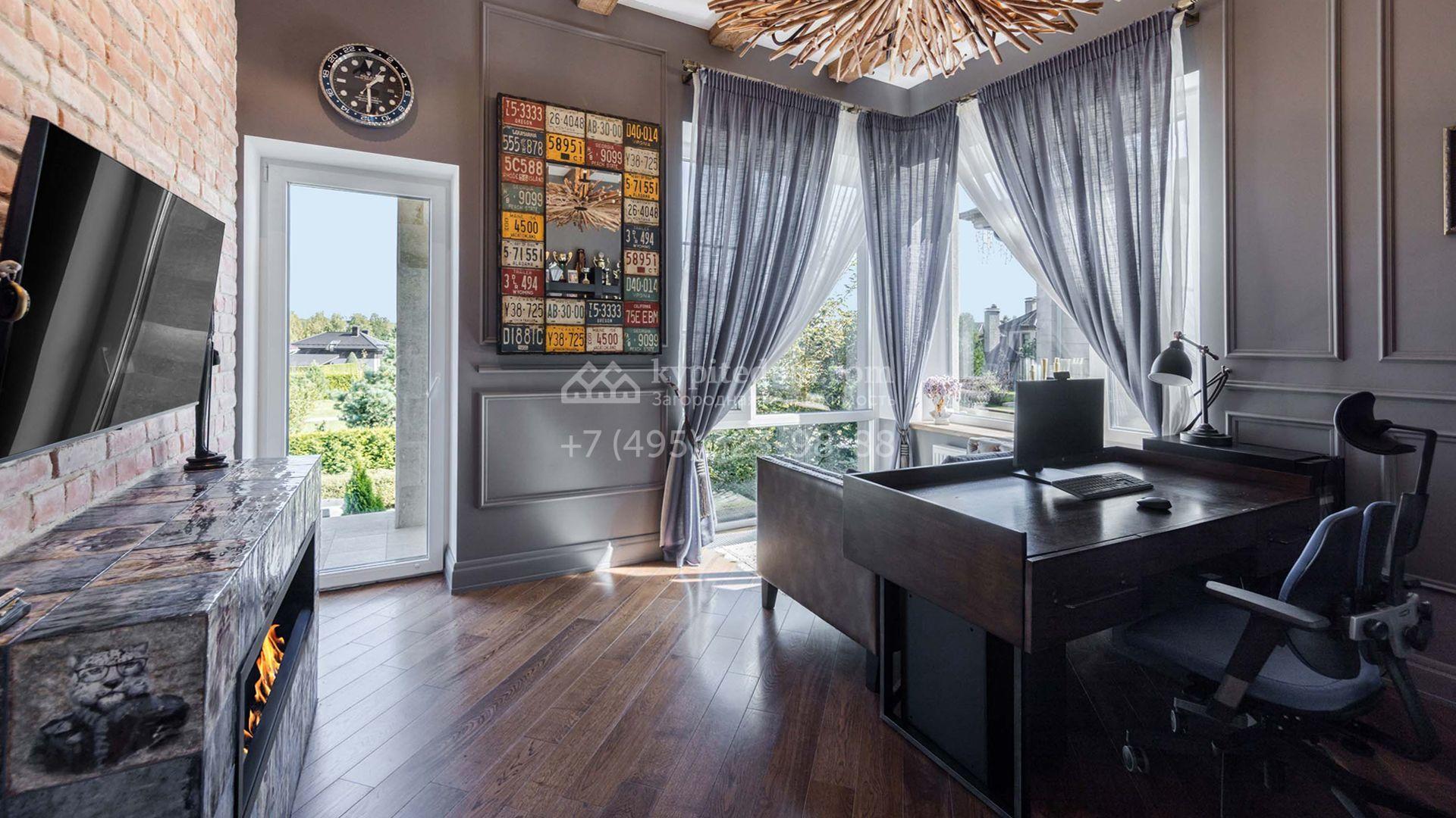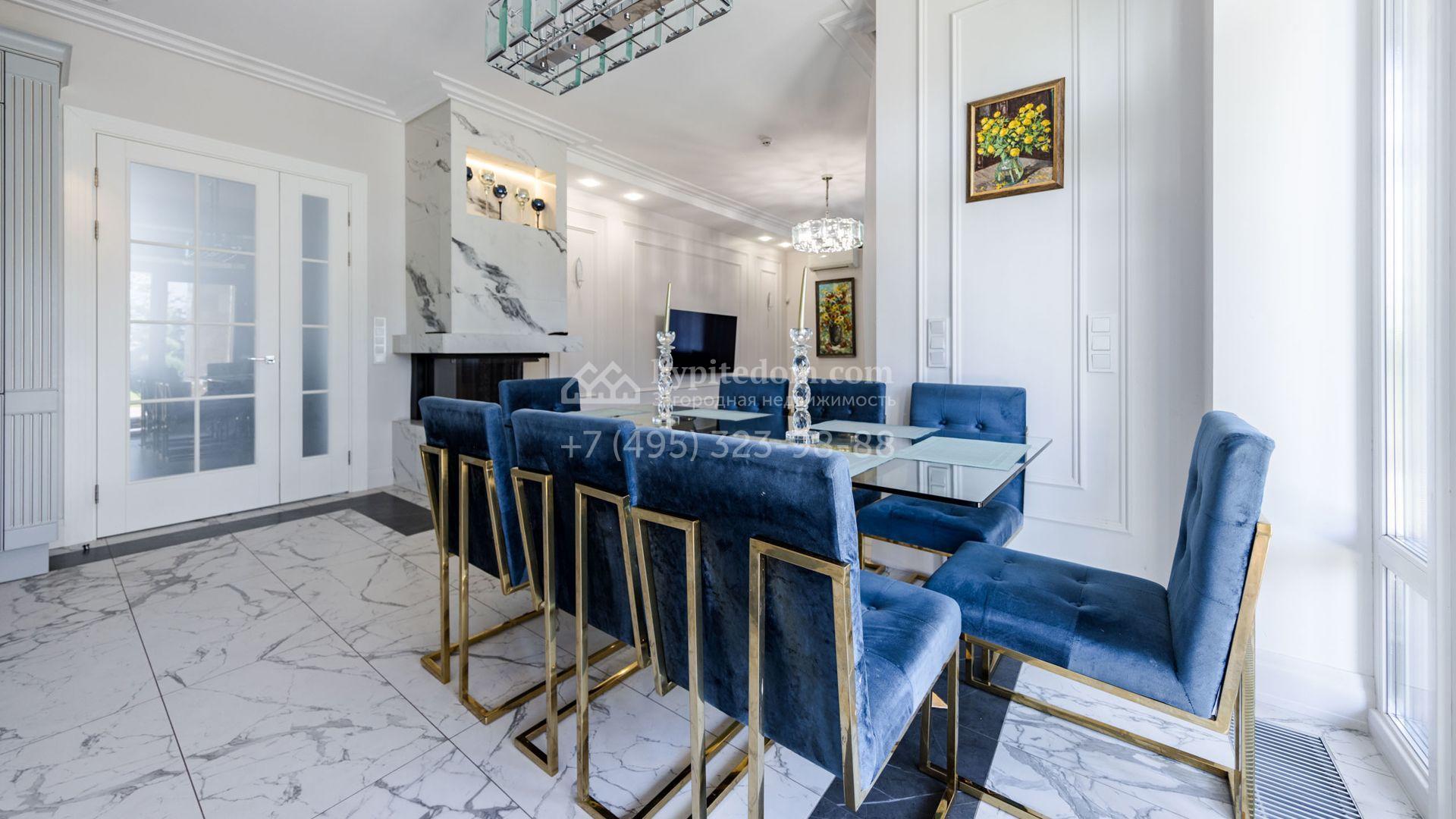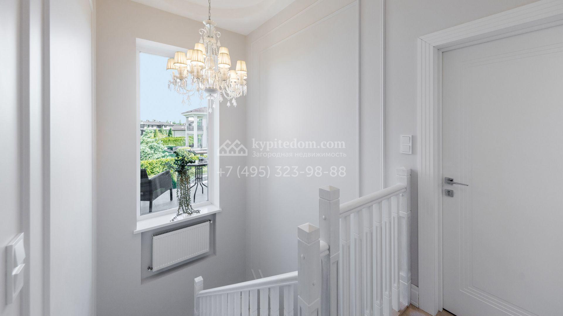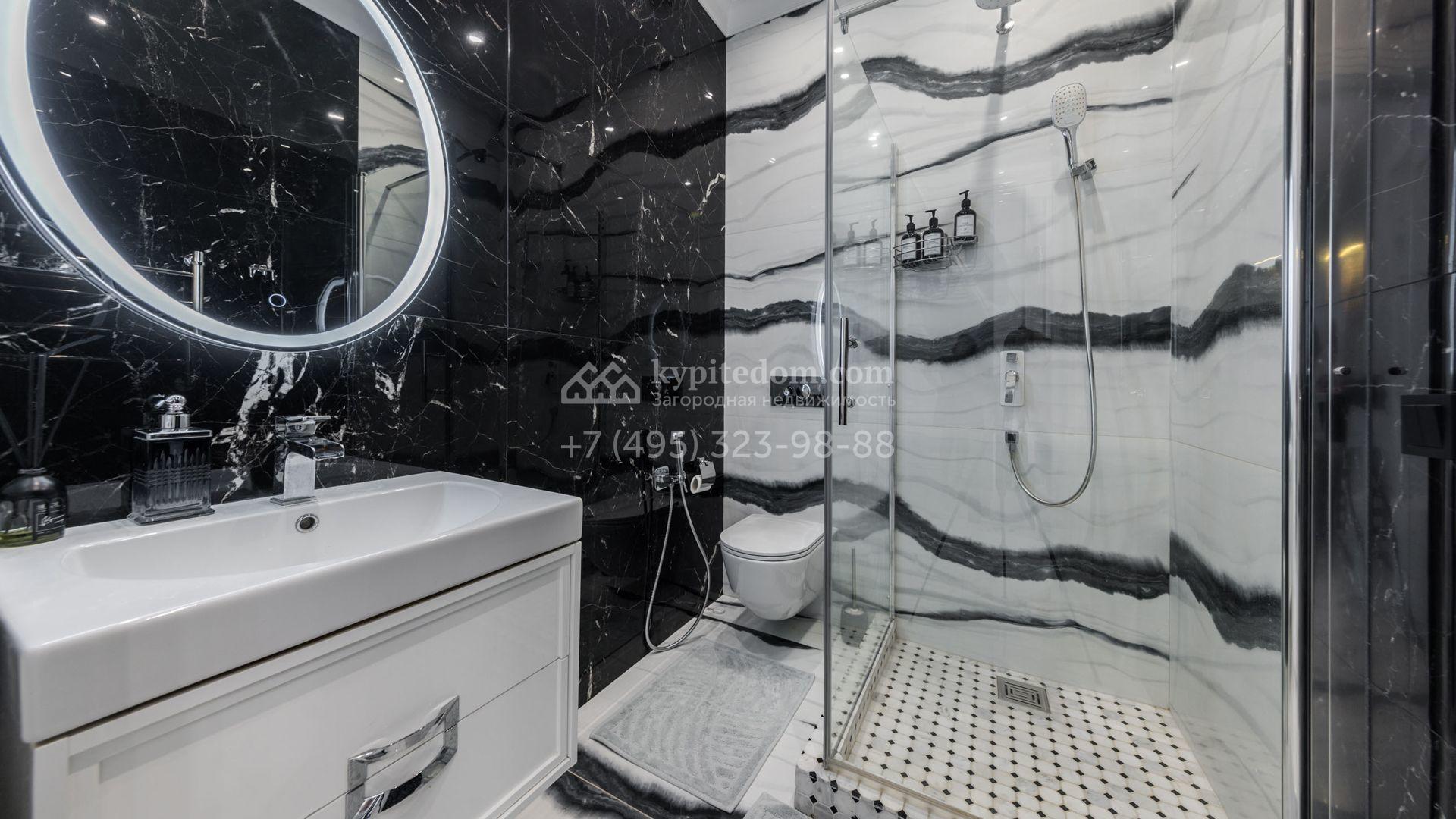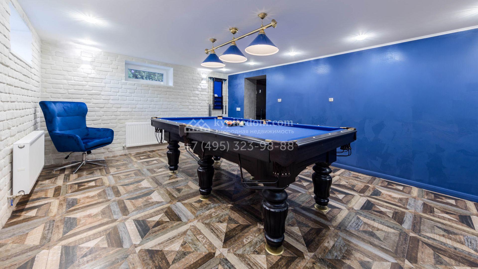 Загородная резиденция площадью 470 м² построена на полевом участке 11 соток в самом центре поселка, на второй линии от реки Беляны. Фасад здания в современном стиле облицован итальянским мрамором и керамогранитом. В отделке интерьера с элементами классики пробладают теплые оттенки, фактура камня и дерева. Планировка коттеджа включает 5 спален, уютную кухню-столовую-гостиную с камином, кабинет с камином и видом на парковую зону, бильярдную, кинотеатр, баню на дровах и SPA с циркулярным душем. В контуре дома предусмотрен гараж на 1 машину. Рядом расположены навес на 2 машины и беседка с огнищем и кухней. На участке выполнены ландшафтный дизайн и трехуровневые дренажные работы, высажены сортовые голубые ели и другие хвойные деревья, а также кустарники и бонсаи.