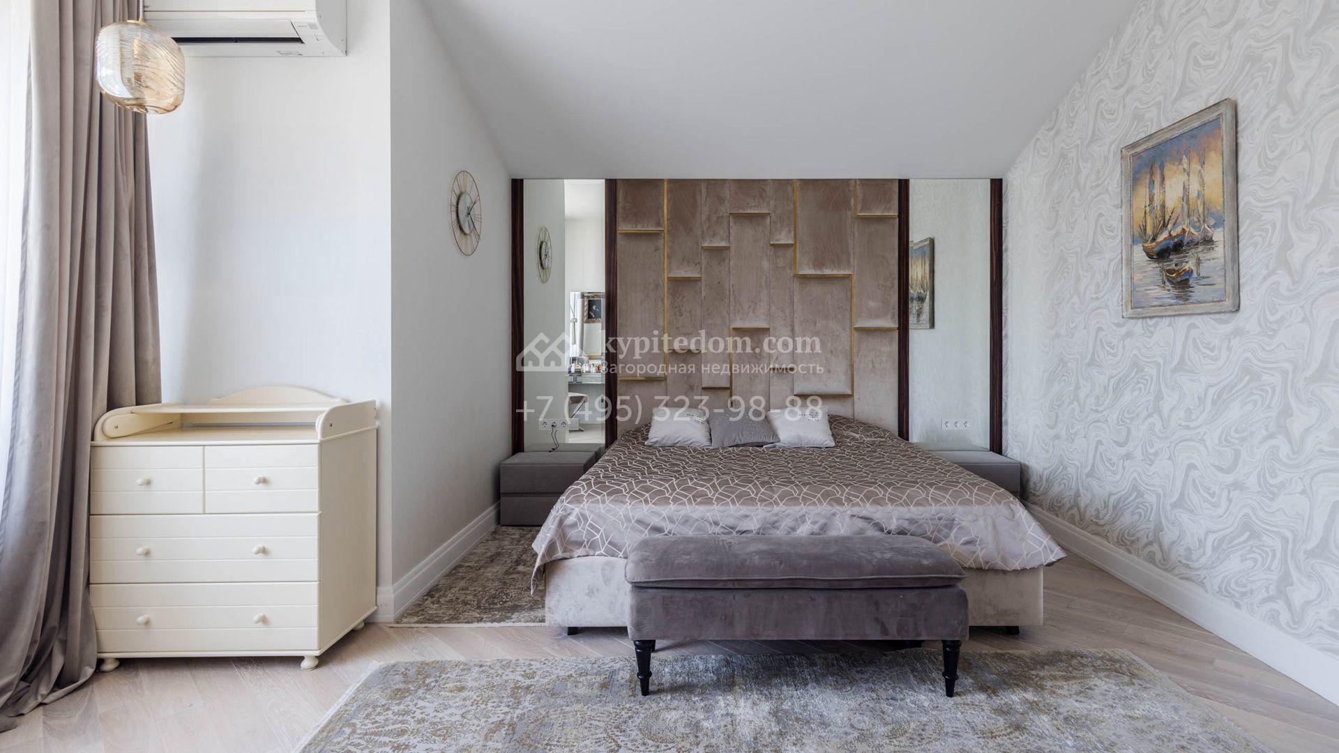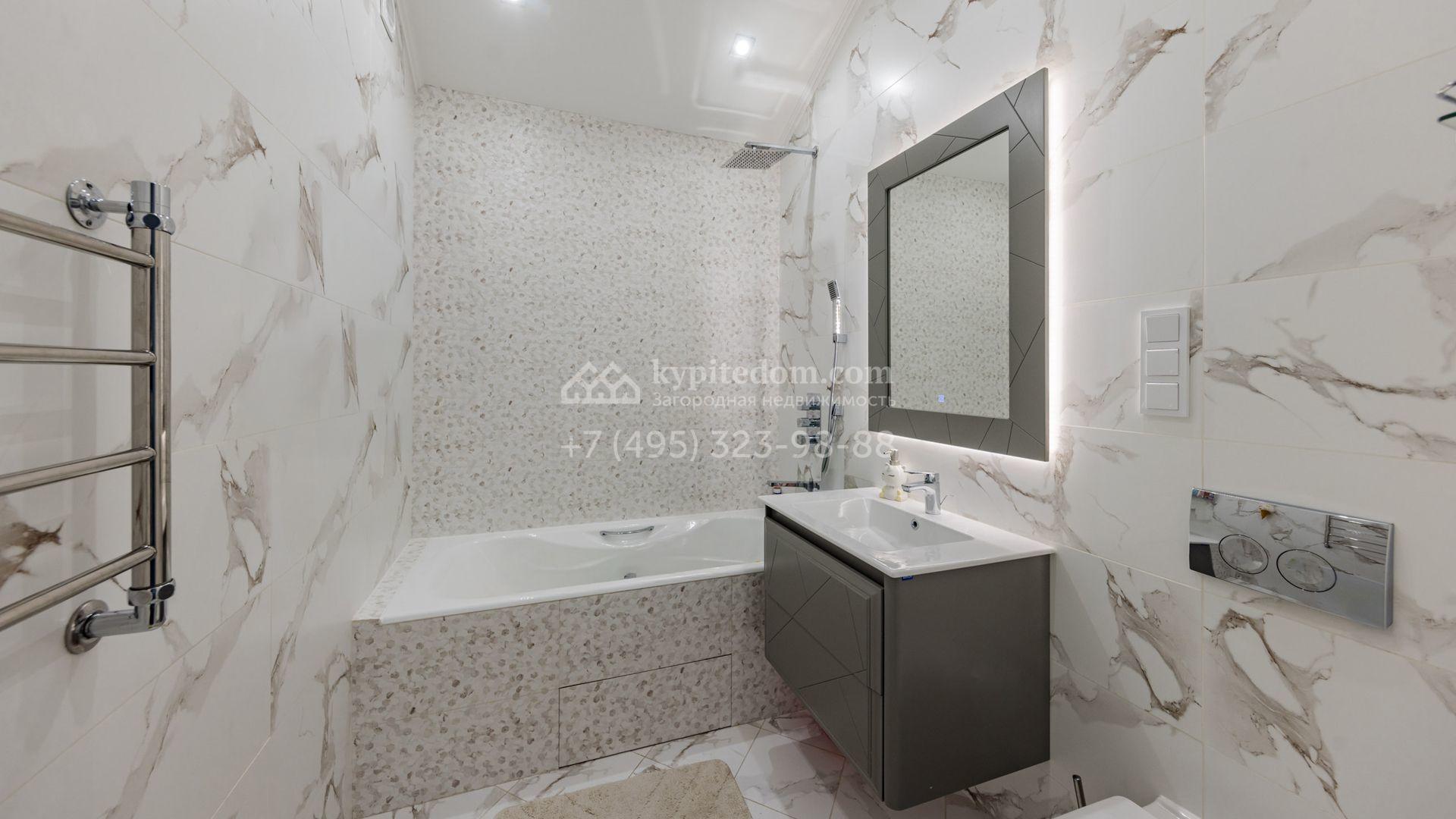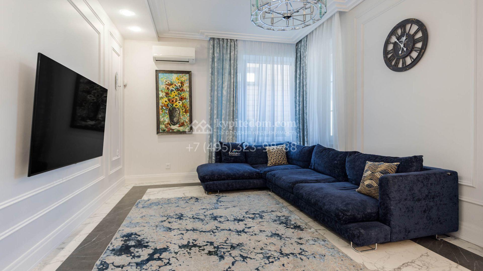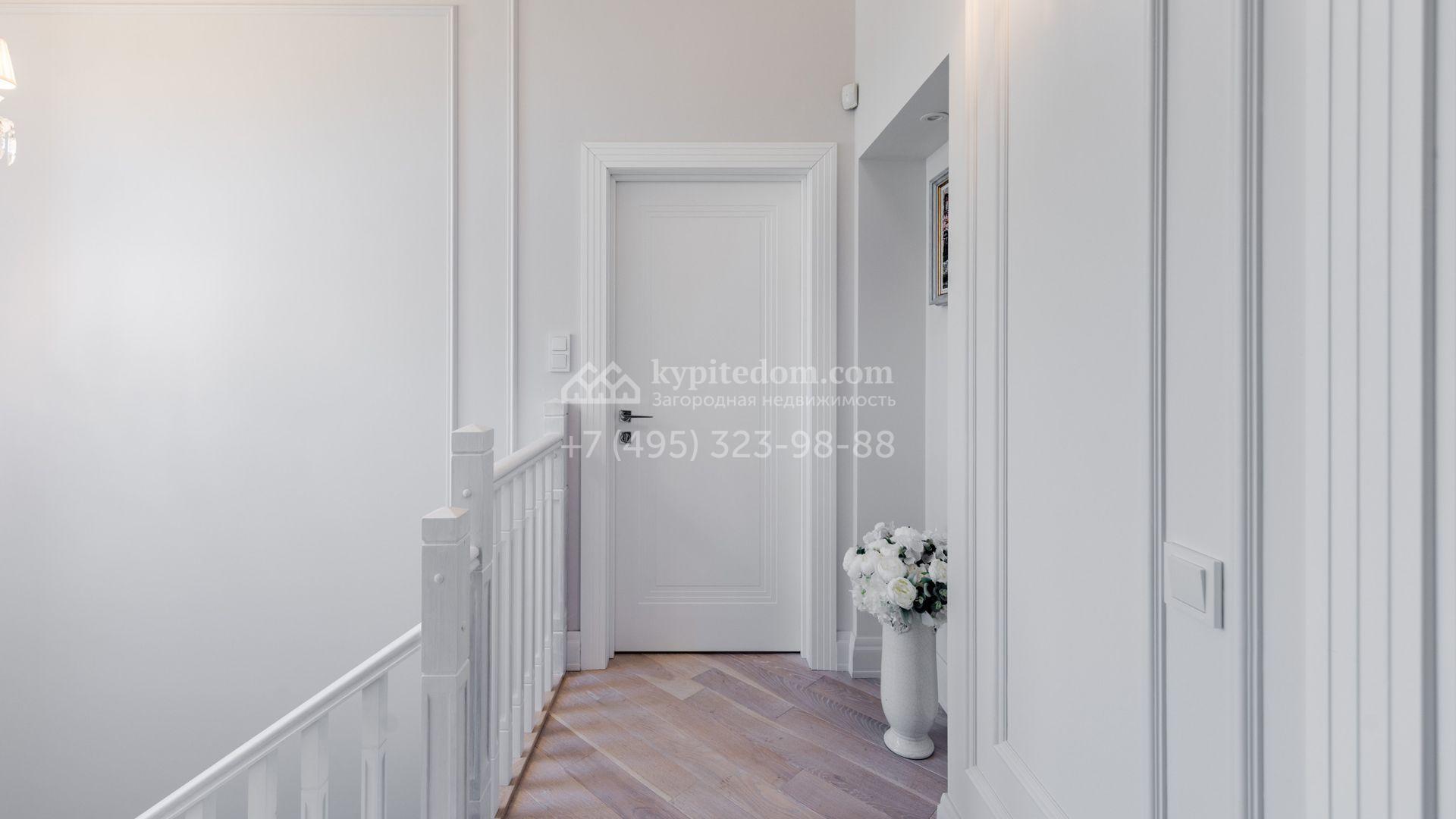 Загородная резиденция площадью 470 м² построена на полевом участке 11 соток в самом центре поселка, на второй линии от реки Беляны. Фасад здания в современном стиле облицован итальянским мрамором и керамогранитом. В отделке интерьера с элементами классики пробладают теплые оттенки, фактура камня и дерева. Планировка коттеджа включает 5 спален, уютную кухню-столовую-гостиную с камином, кабинет с камином и видом на парковую зону, бильярдную, кинотеатр, баню на дровах и SPA с циркулярным душем. В контуре дома предусмотрен гараж на 1 машину. Рядом расположены навес на 2 машины и беседка с огнищем и кухней. На участке выполнены ландшафтный дизайн и трехуровневые дренажные работы, высажены сортовые голубые ели и другие хвойные деревья, а также кустарники и бонсаи.