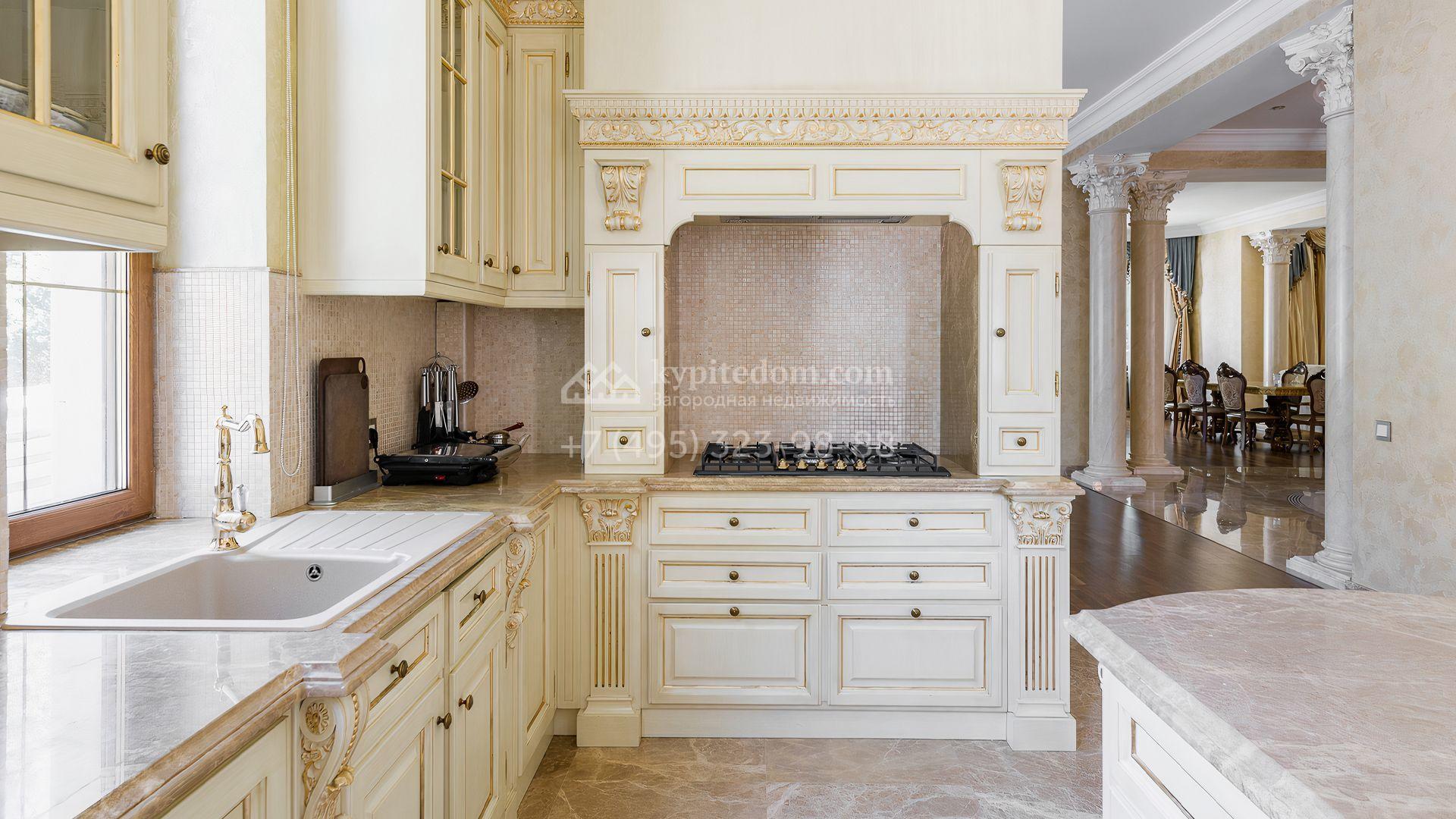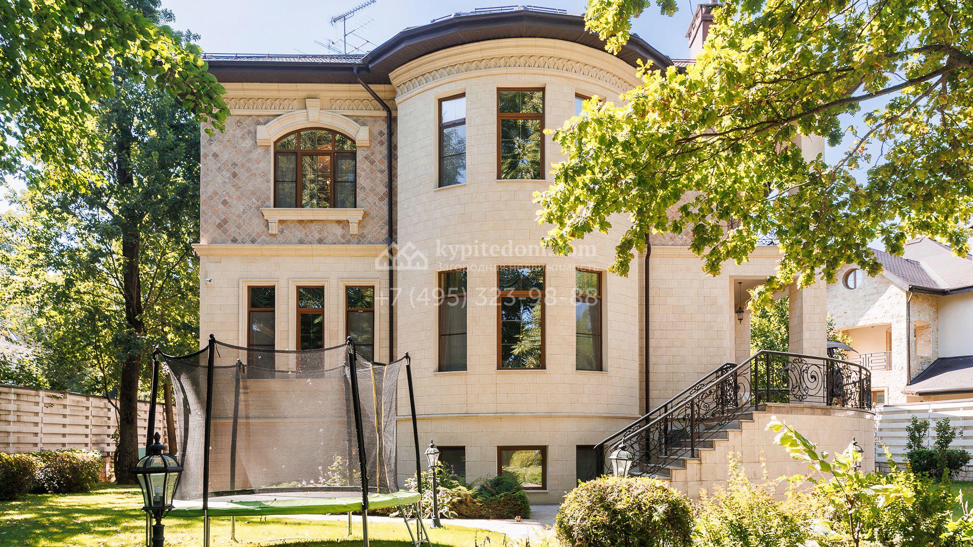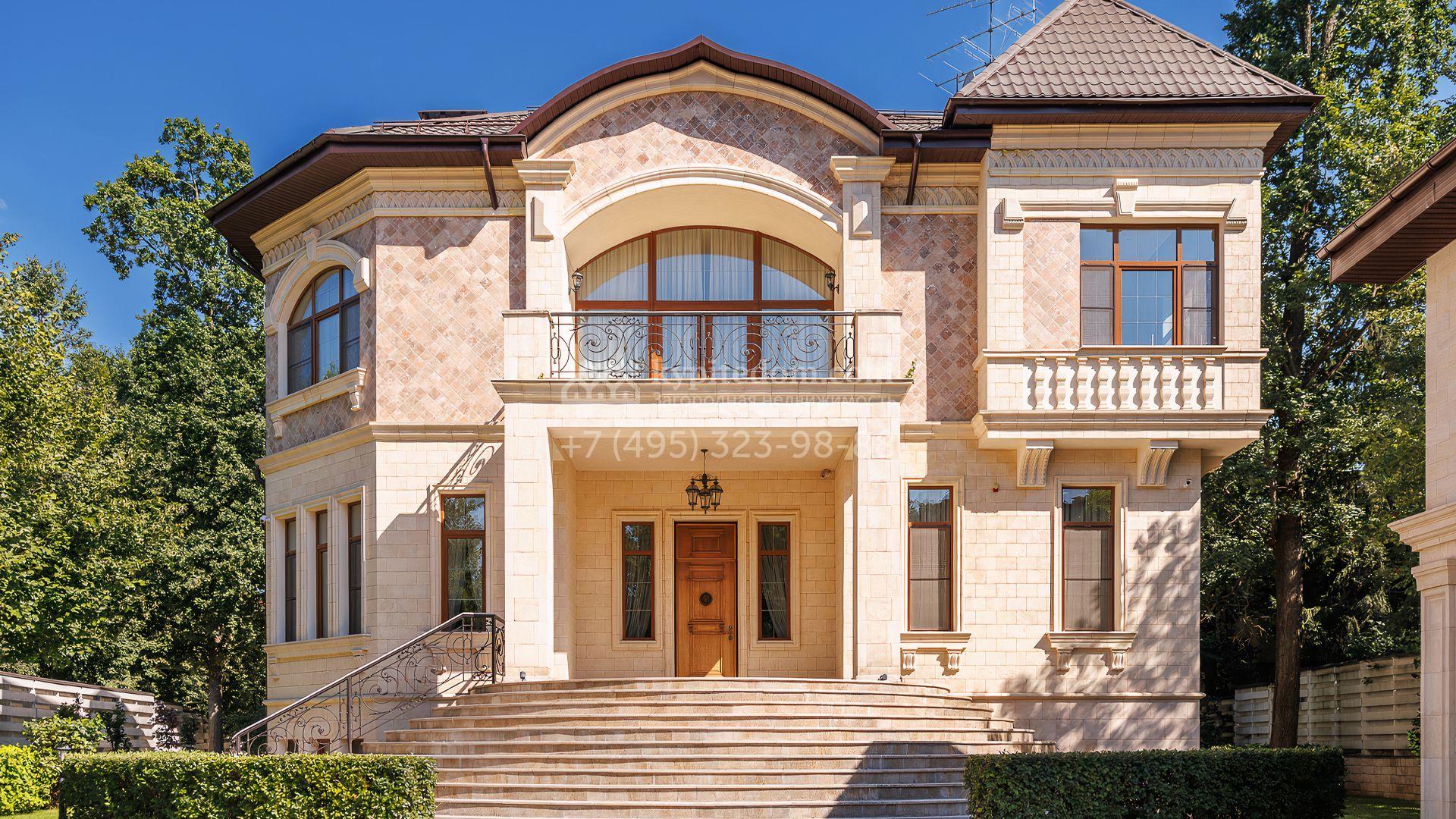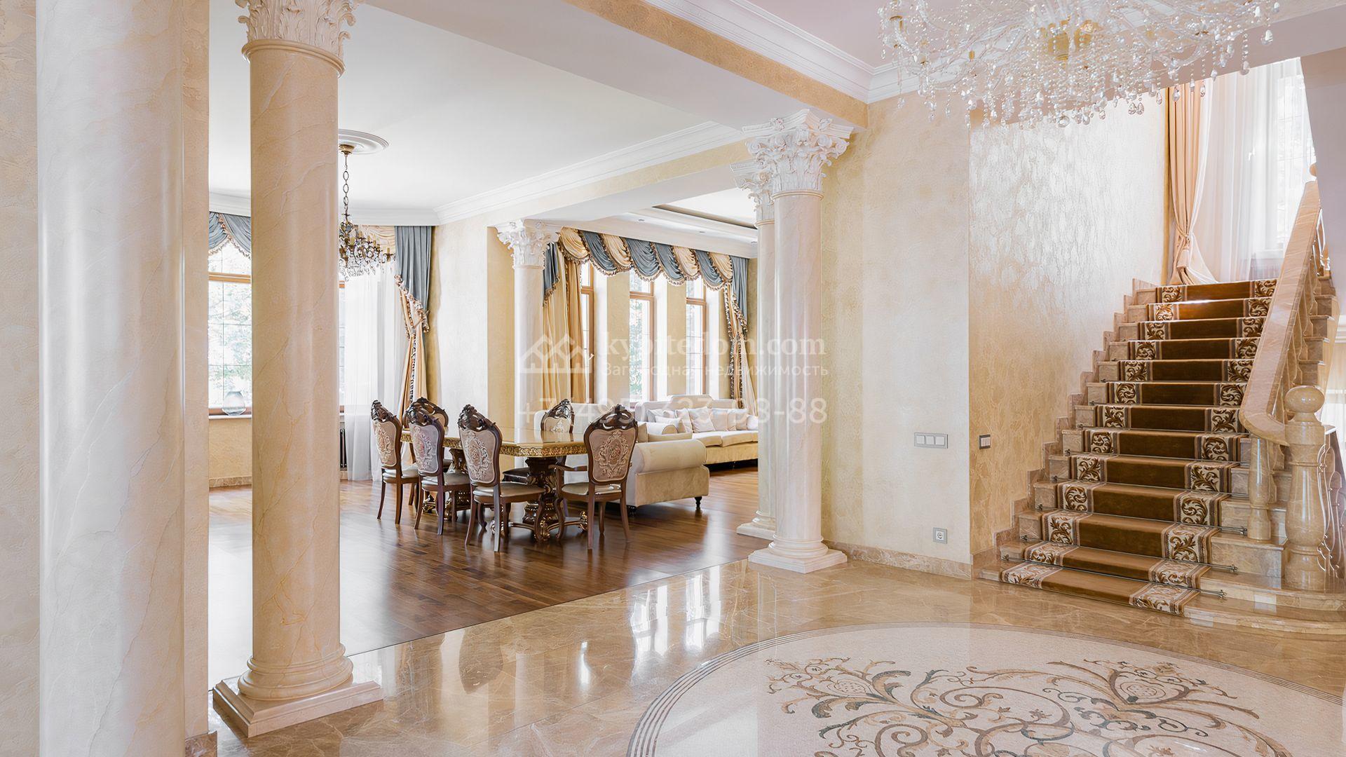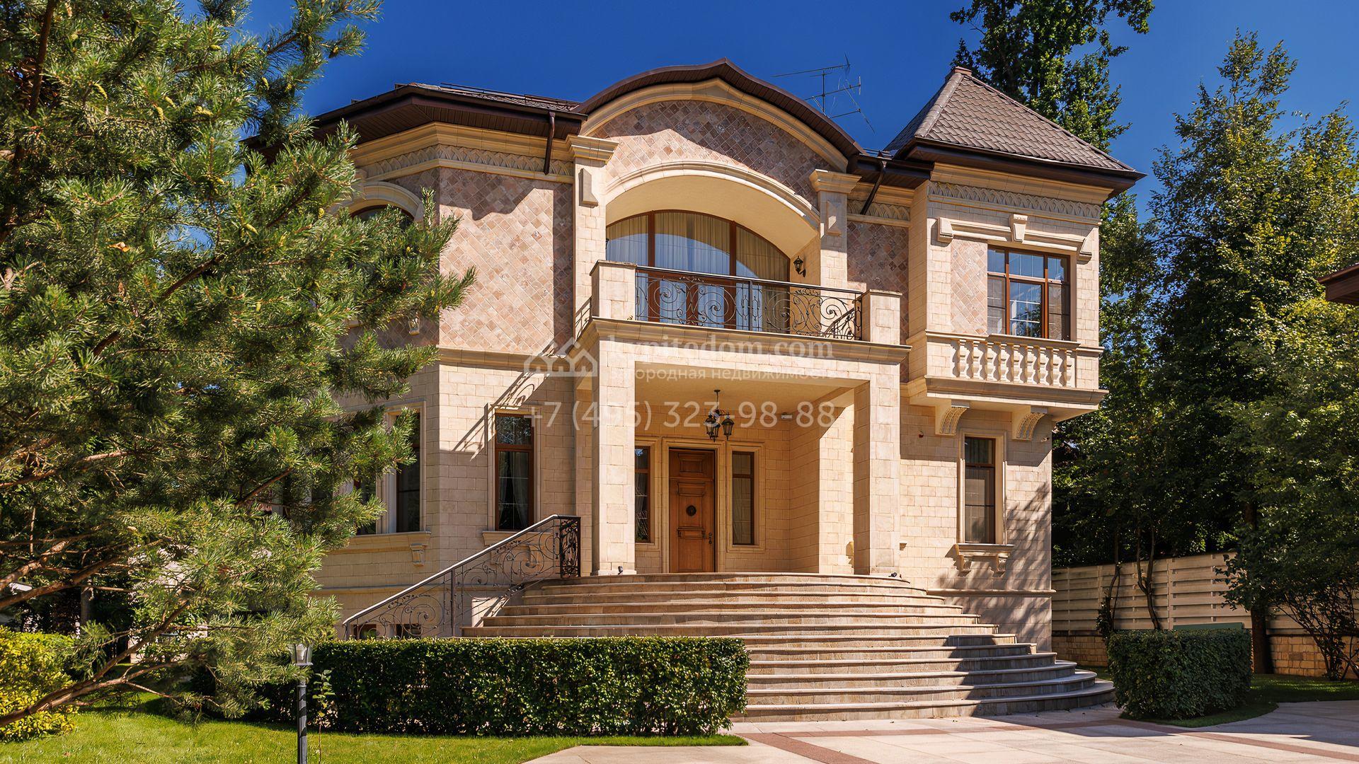 Загородный дом площадью 550 м² построен на просторном участке 20 соток рядом с лесом. Фасад здания облицован бежевым камнем, декорирован резным карнизом и коваными элементами. Интерьер выдержан в классическом стиле, в отделке использованы теплые оттенки, колонны, фактура дерева и камня. В резиденции спланировали 5 спален, гостиную-столовую с камином, кухню, кабинет, хаммам и сауну. Рядом расположены гараж на 2 машины с квартирой для персонала и баня со спортзалом. На участке с ландшафтным дизайном вымощены дорожки, засеян газон, установлено уличное освещение и оборудована закрытая летняя кухня с мангалом, коптильней и тандыром.