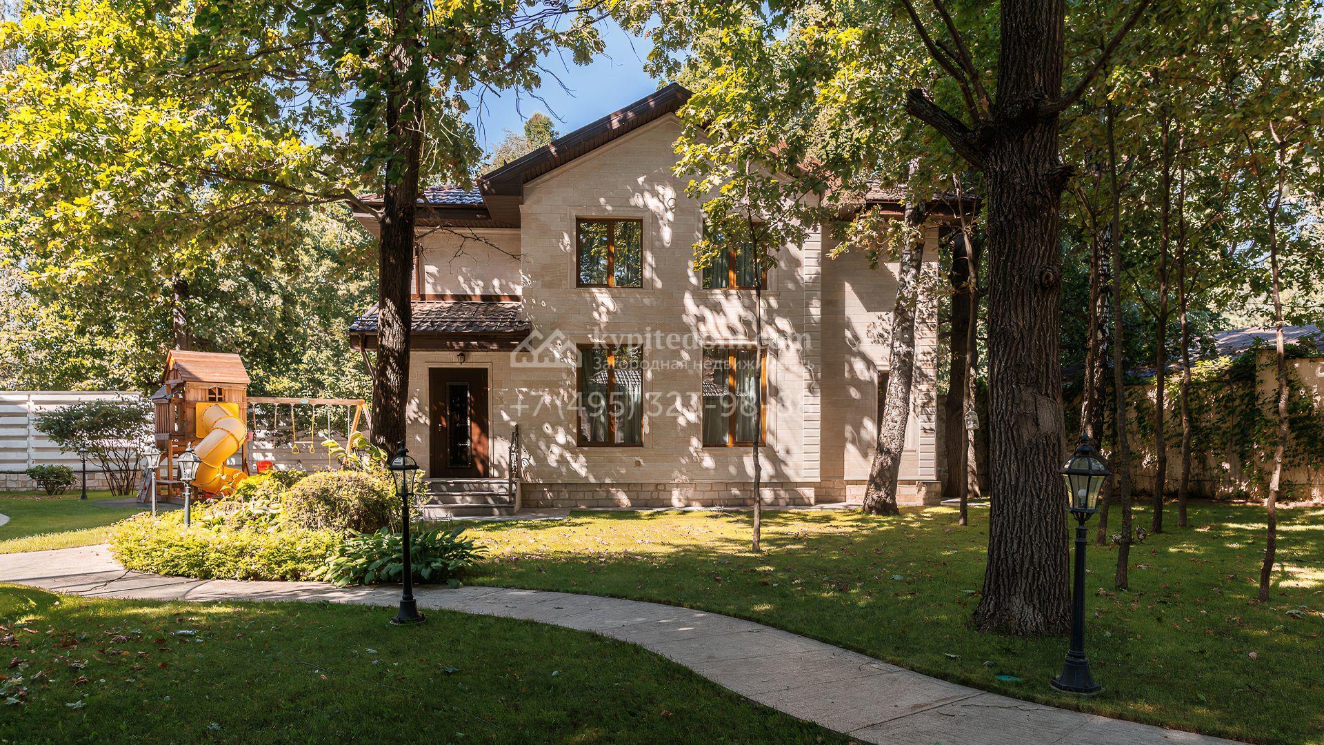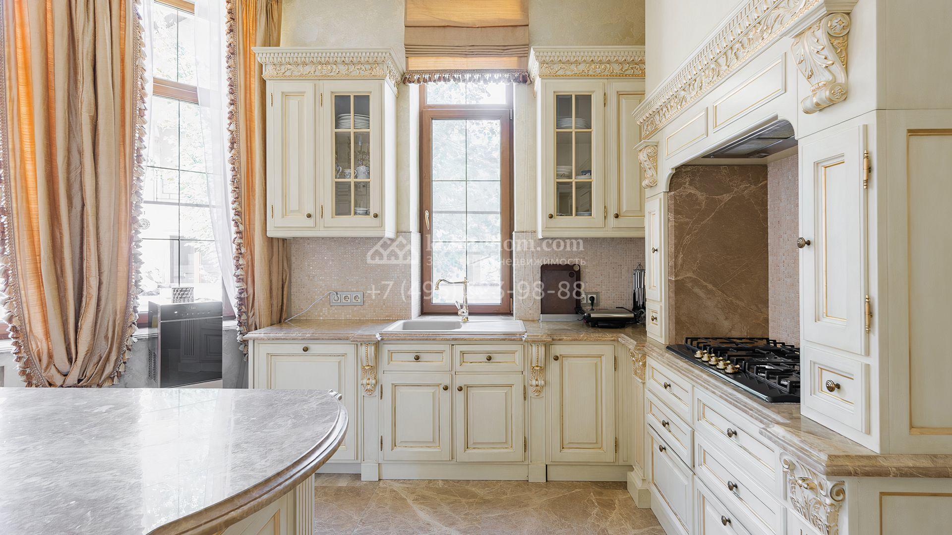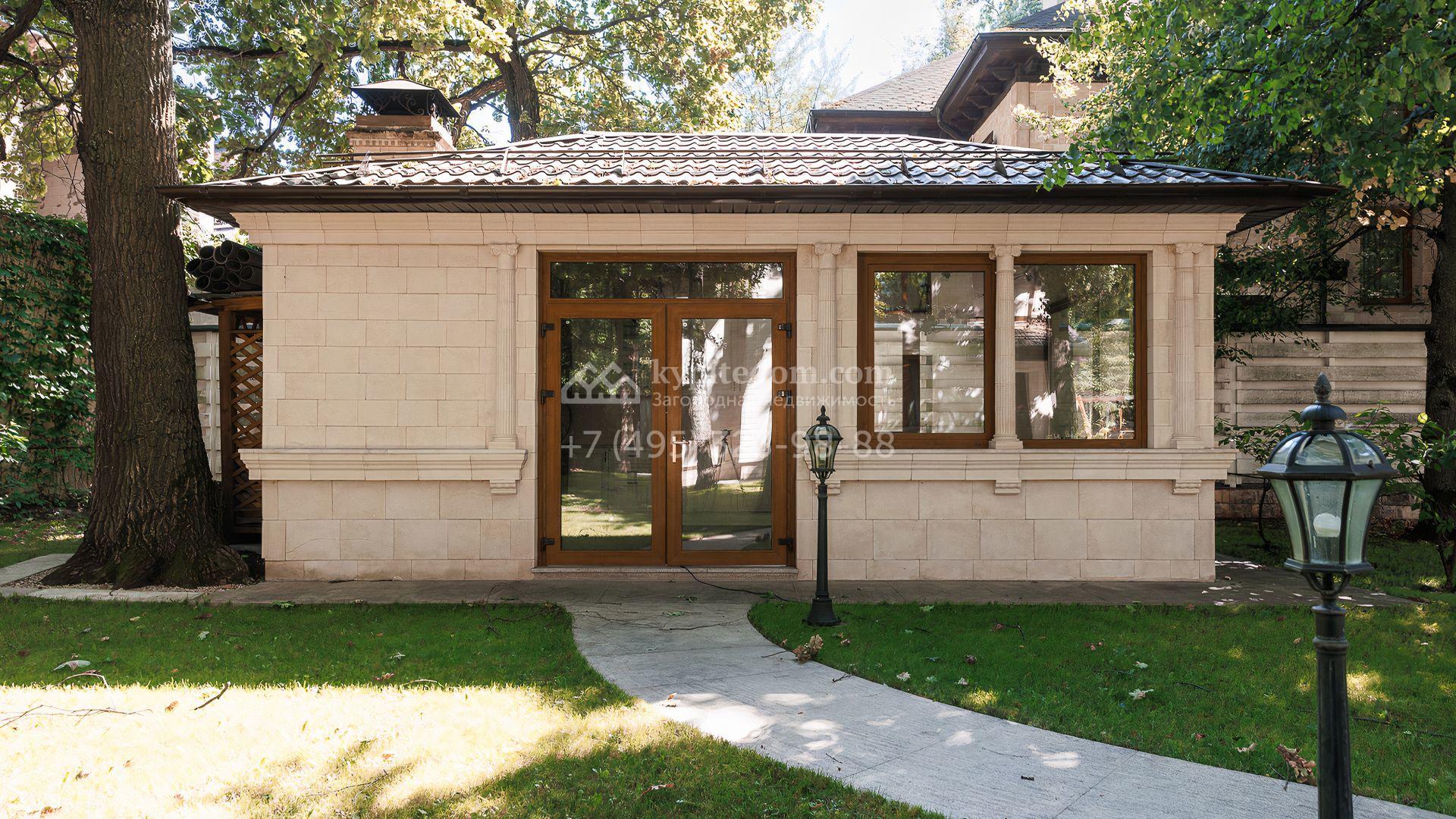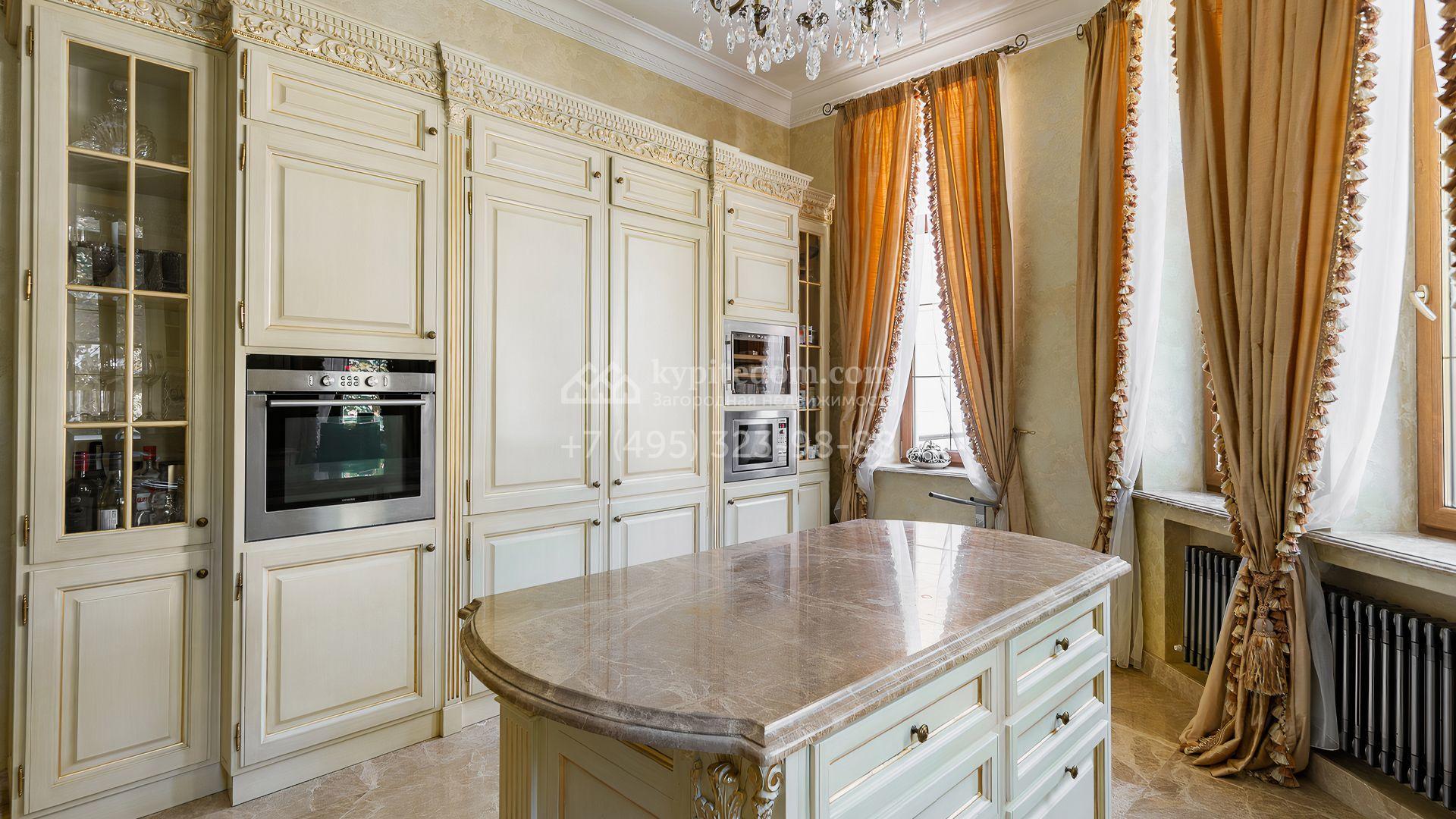 Загородный дом площадью 550 м² построен на просторном участке 20 соток рядом с лесом. Фасад здания облицован бежевым камнем, декорирован резным карнизом и коваными элементами. Интерьер выдержан в классическом стиле, в отделке использованы теплые оттенки, колонны, фактура дерева и камня. В резиденции спланировали 5 спален, гостиную-столовую с камином, кухню, кабинет, хаммам и сауну. Рядом расположены гараж на 2 машины с квартирой для персонала и баня со спортзалом. На участке с ландшафтным дизайном вымощены дорожки, засеян газон, установлено уличное освещение и оборудована закрытая летняя кухня с мангалом, коптильней и тандыром.