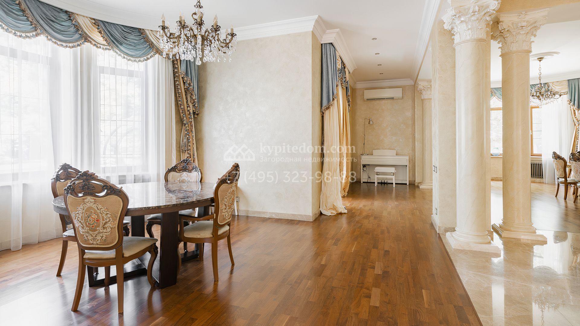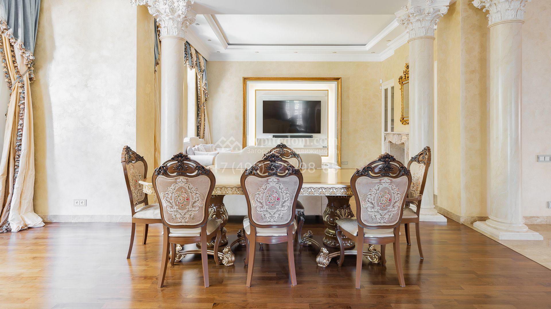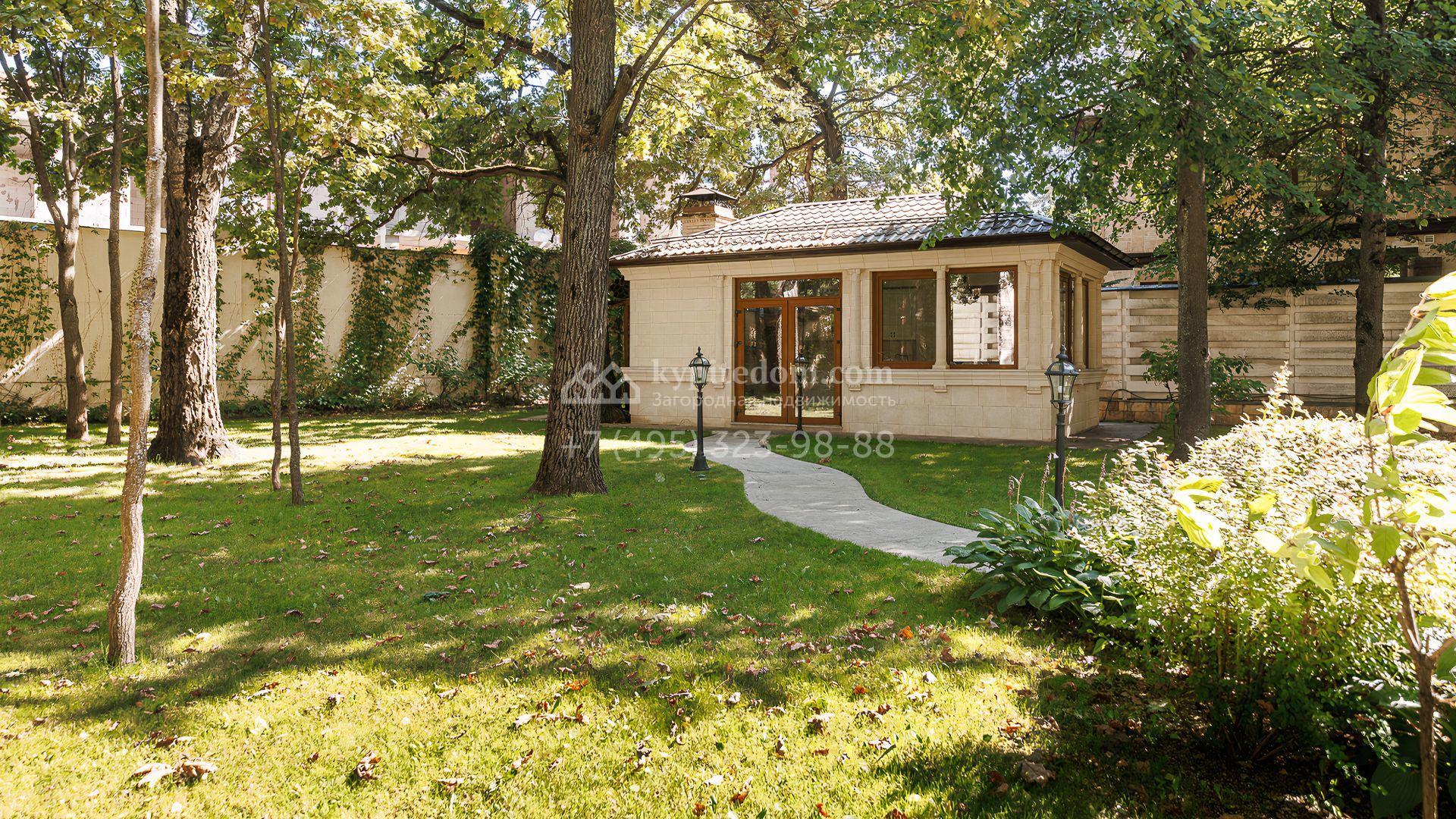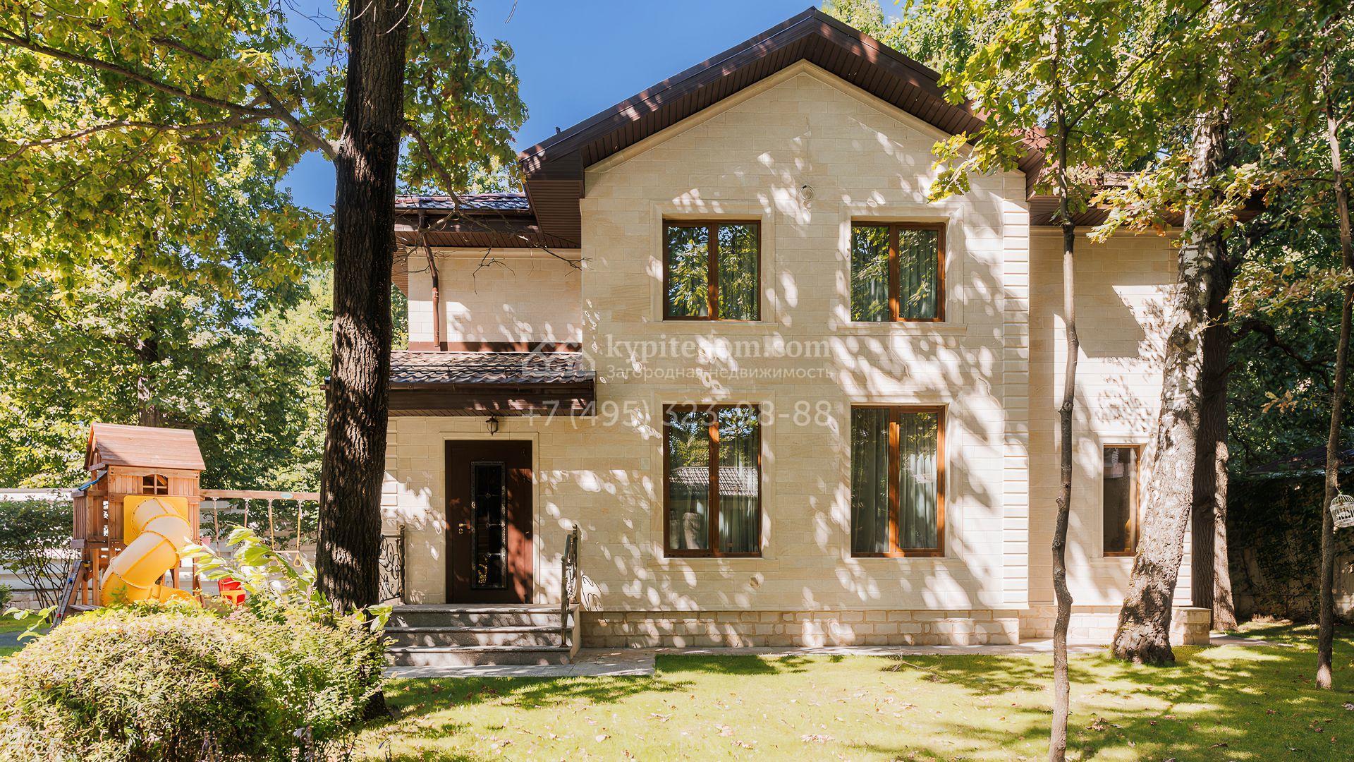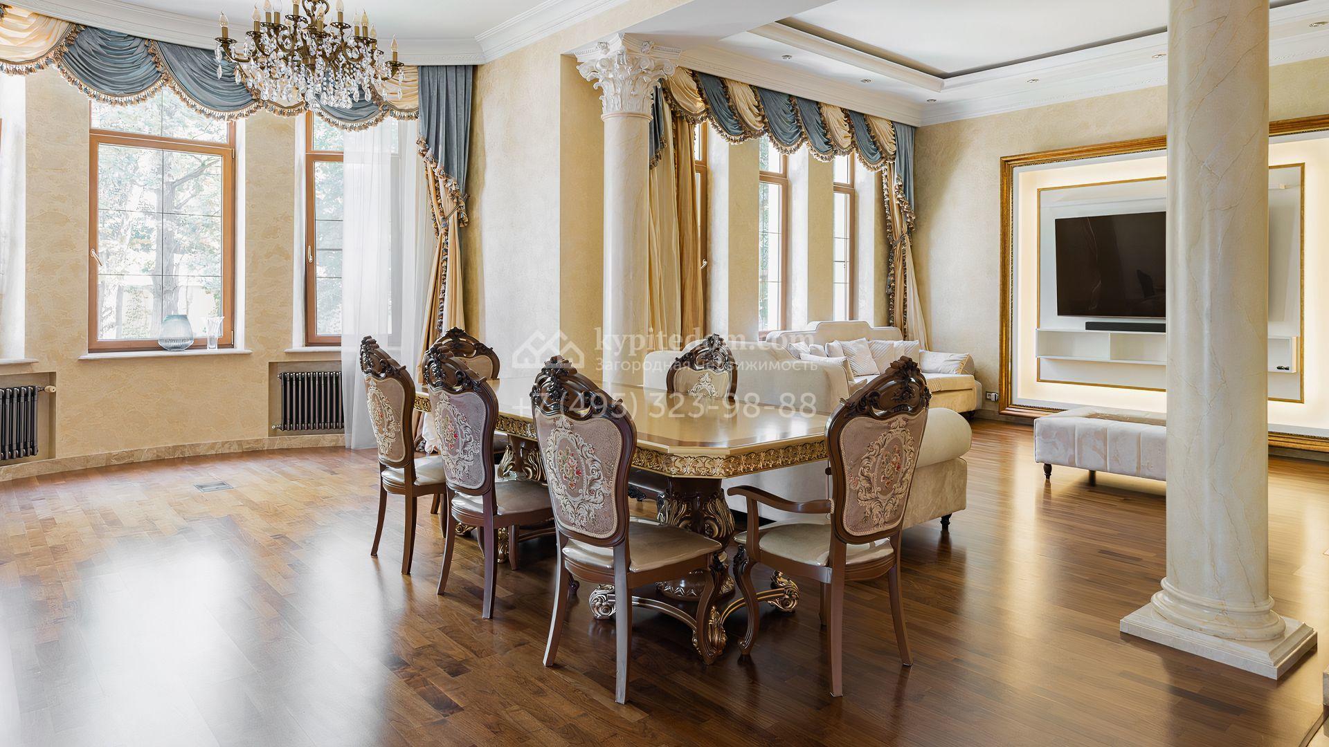 Загородный дом площадью 550 м² построен на просторном участке 20 соток рядом с лесом. Фасад здания облицован бежевым камнем, декорирован резным карнизом и коваными элементами. Интерьер выдержан в классическом стиле, в отделке использованы теплые оттенки, колонны, фактура дерева и камня. В резиденции спланировали 5 спален, гостиную-столовую с камином, кухню, кабинет, хаммам и сауну. Рядом расположены гараж на 2 машины с квартирой для персонала и баня со спортзалом. На участке с ландшафтным дизайном вымощены дорожки, засеян газон, установлено уличное освещение и оборудована закрытая летняя кухня с мангалом, коптильней и тандыром.
