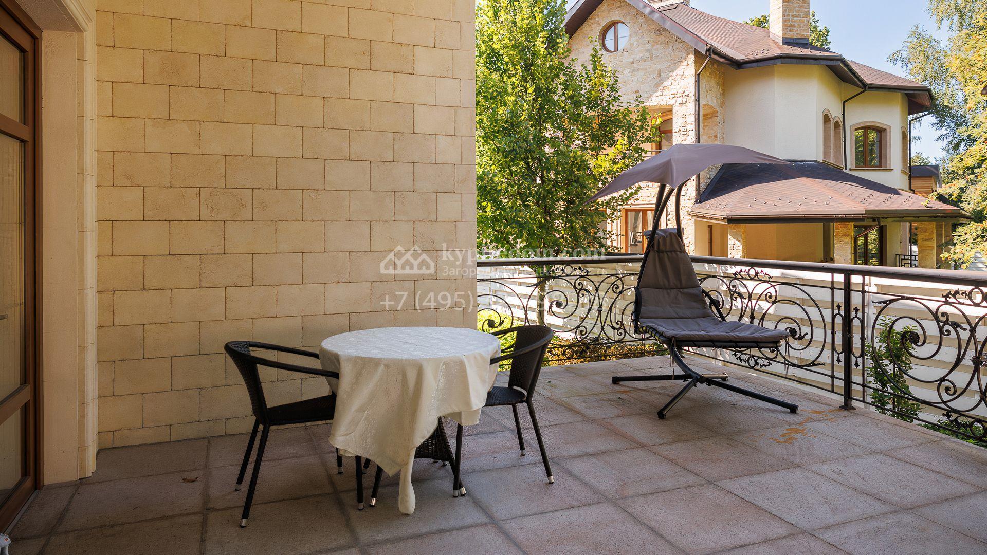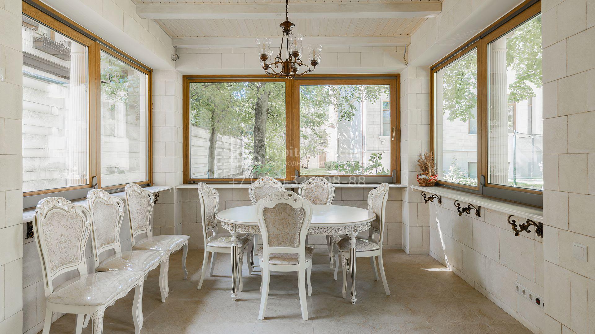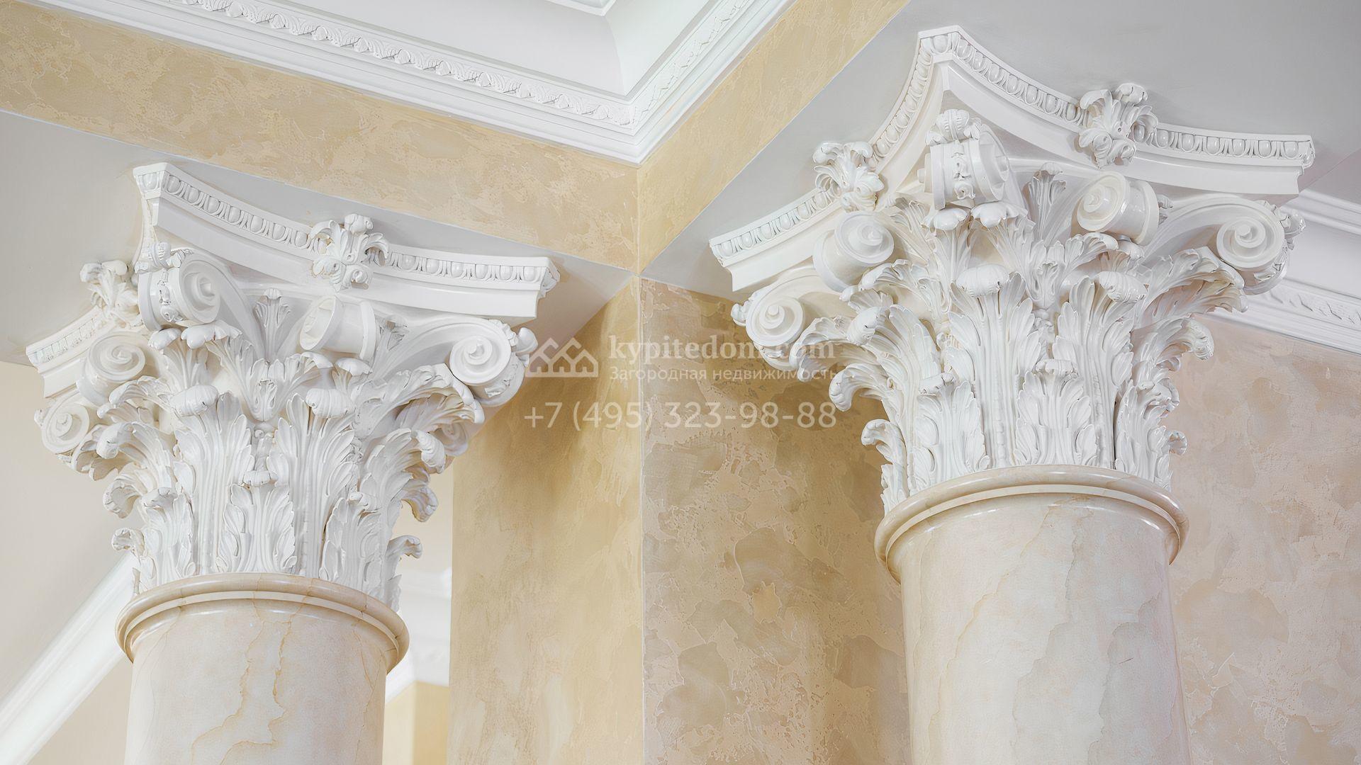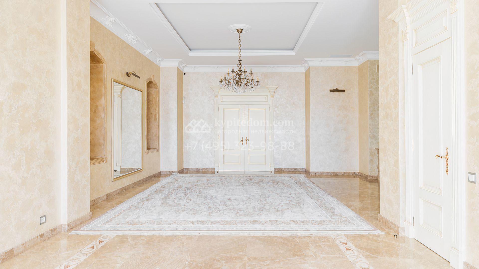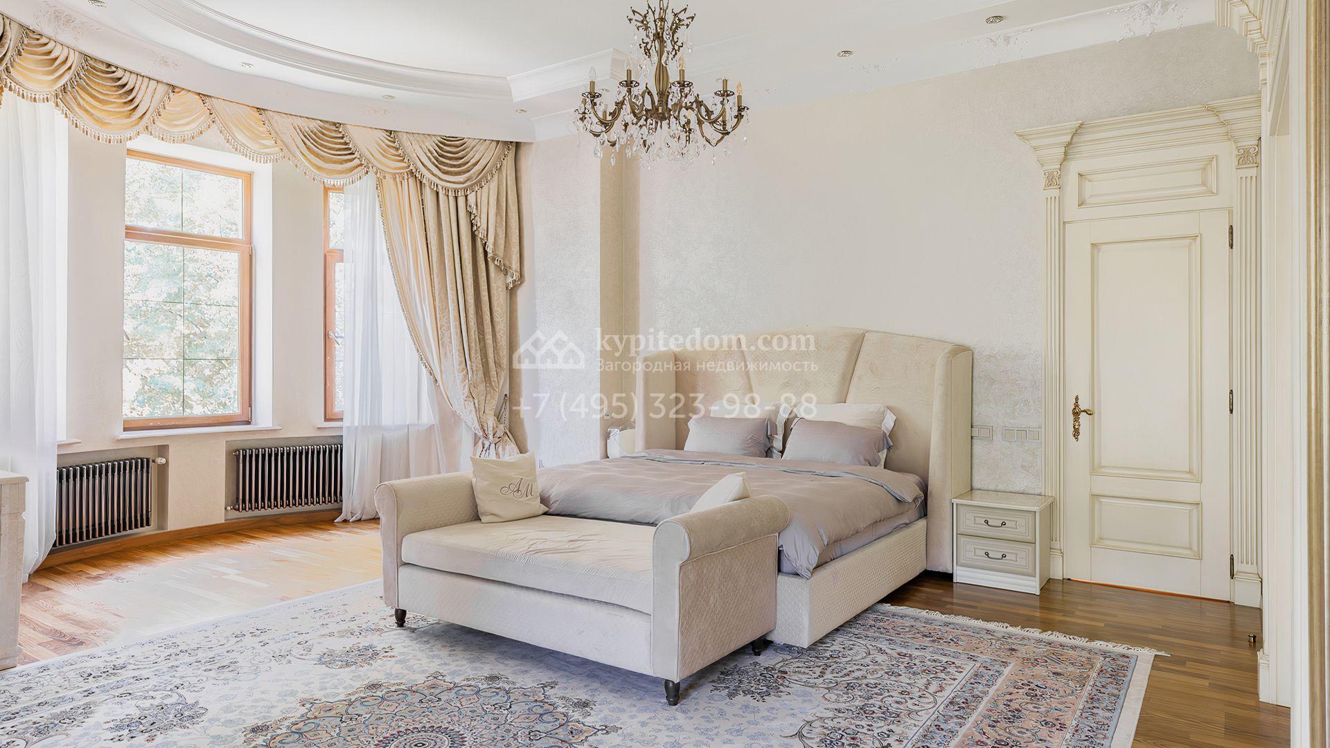 Загородный дом площадью 550 м² построен на просторном участке 20 соток рядом с лесом. Фасад здания облицован бежевым камнем, декорирован резным карнизом и коваными элементами. Интерьер выдержан в классическом стиле, в отделке использованы теплые оттенки, колонны, фактура дерева и камня. В резиденции спланировали 5 спален, гостиную-столовую с камином, кухню, кабинет, хаммам и сауну. Рядом расположены гараж на 2 машины с квартирой для персонала и баня со спортзалом. На участке с ландшафтным дизайном вымощены дорожки, засеян газон, установлено уличное освещение и оборудована закрытая летняя кухня с мангалом, коптильней и тандыром.