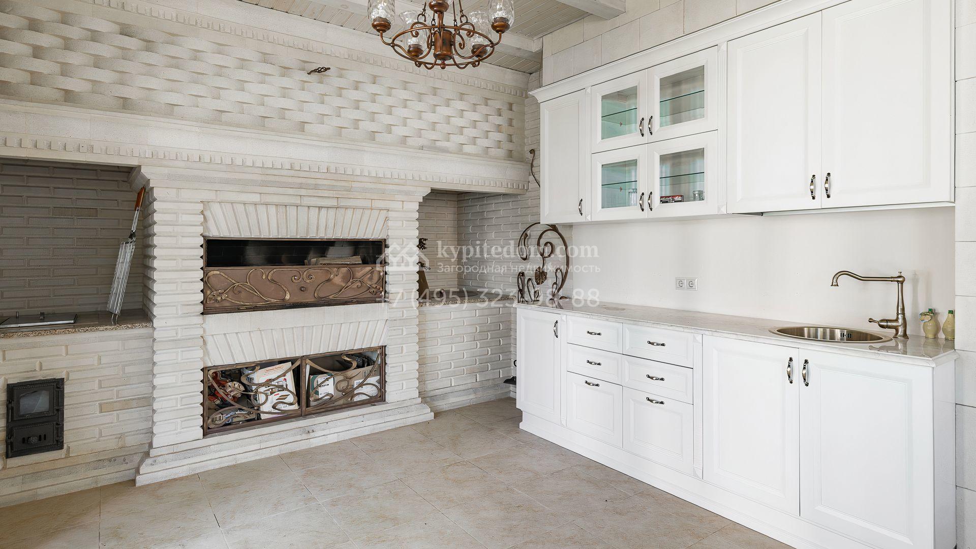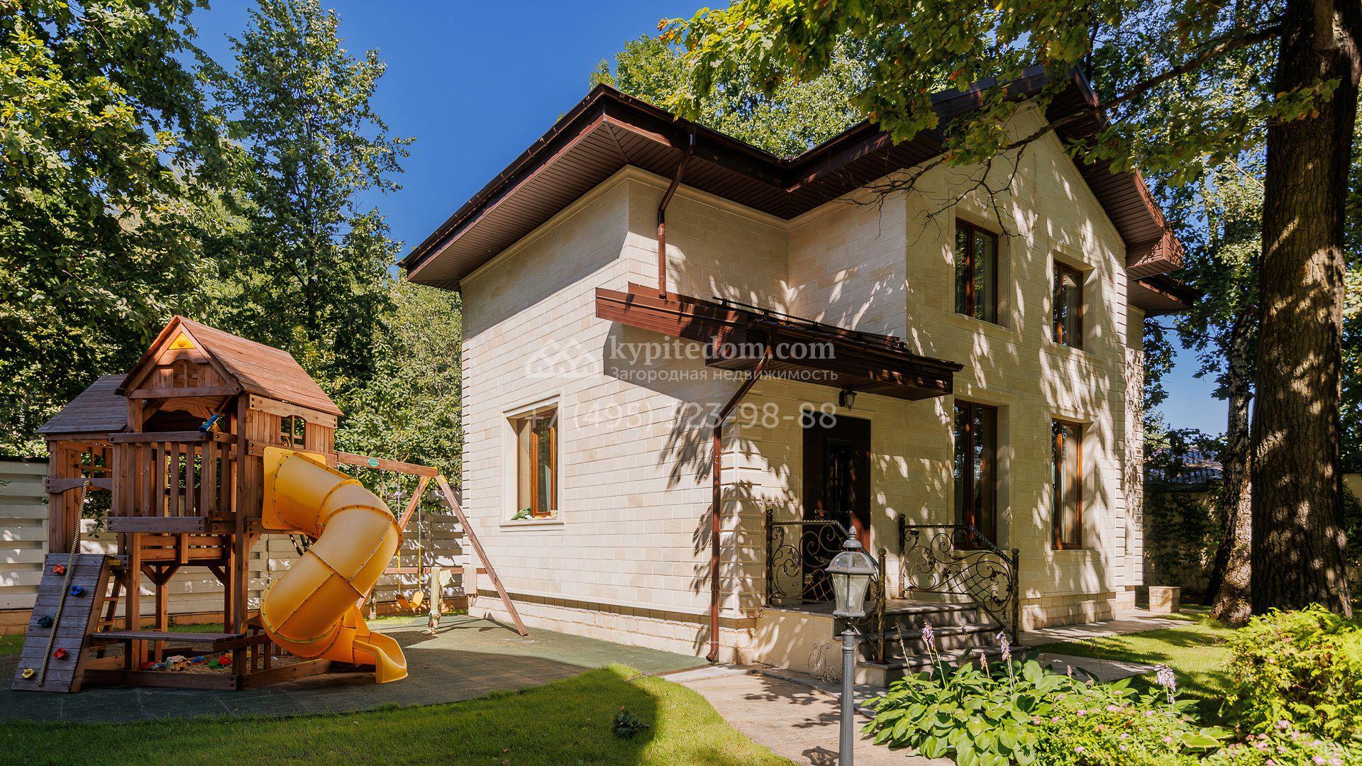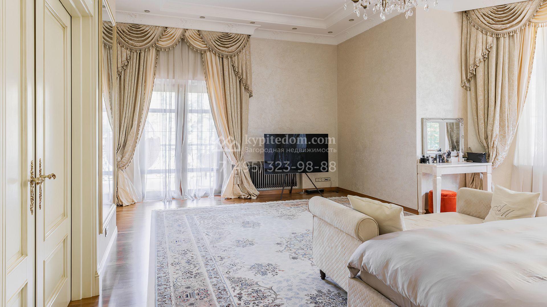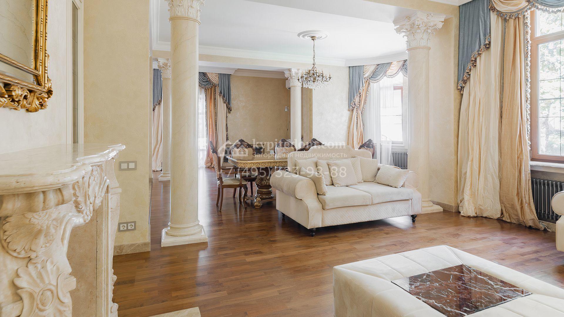 Загородный дом площадью 550 м² построен на просторном участке 20 соток рядом с лесом. Фасад здания облицован бежевым камнем, декорирован резным карнизом и коваными элементами. Интерьер выдержан в классическом стиле, в отделке использованы теплые оттенки, колонны, фактура дерева и камня. В резиденции спланировали 5 спален, гостиную-столовую с камином, кухню, кабинет, хаммам и сауну. Рядом расположены гараж на 2 машины с квартирой для персонала и баня со спортзалом. На участке с ландшафтным дизайном вымощены дорожки, засеян газон, установлено уличное освещение и оборудована закрытая летняя кухня с мангалом, коптильней и тандыром.