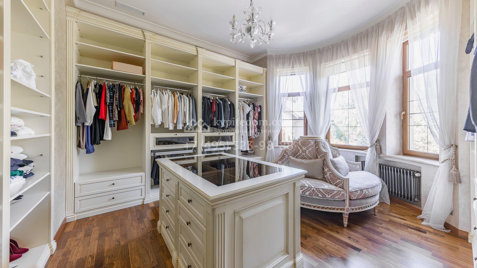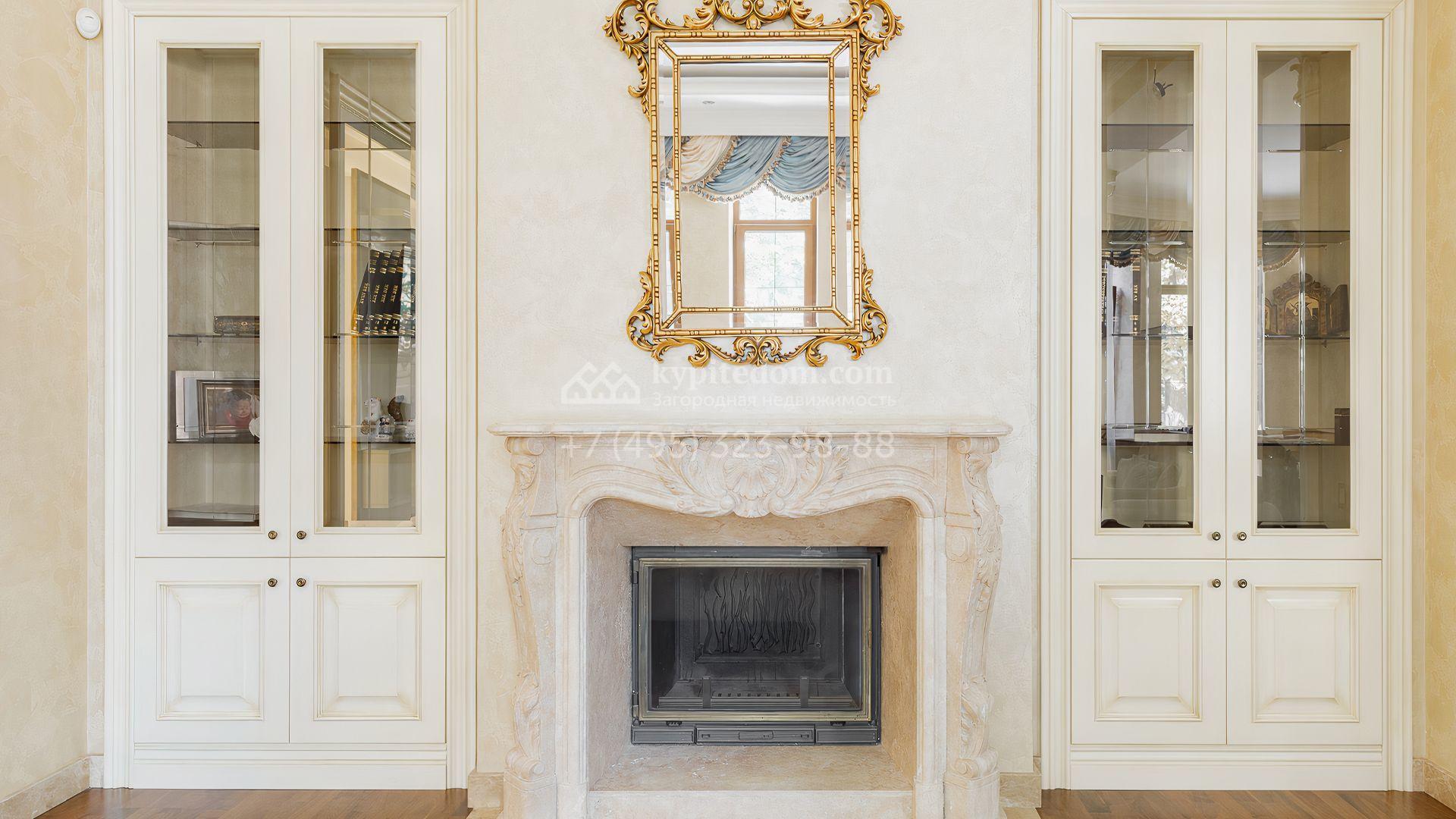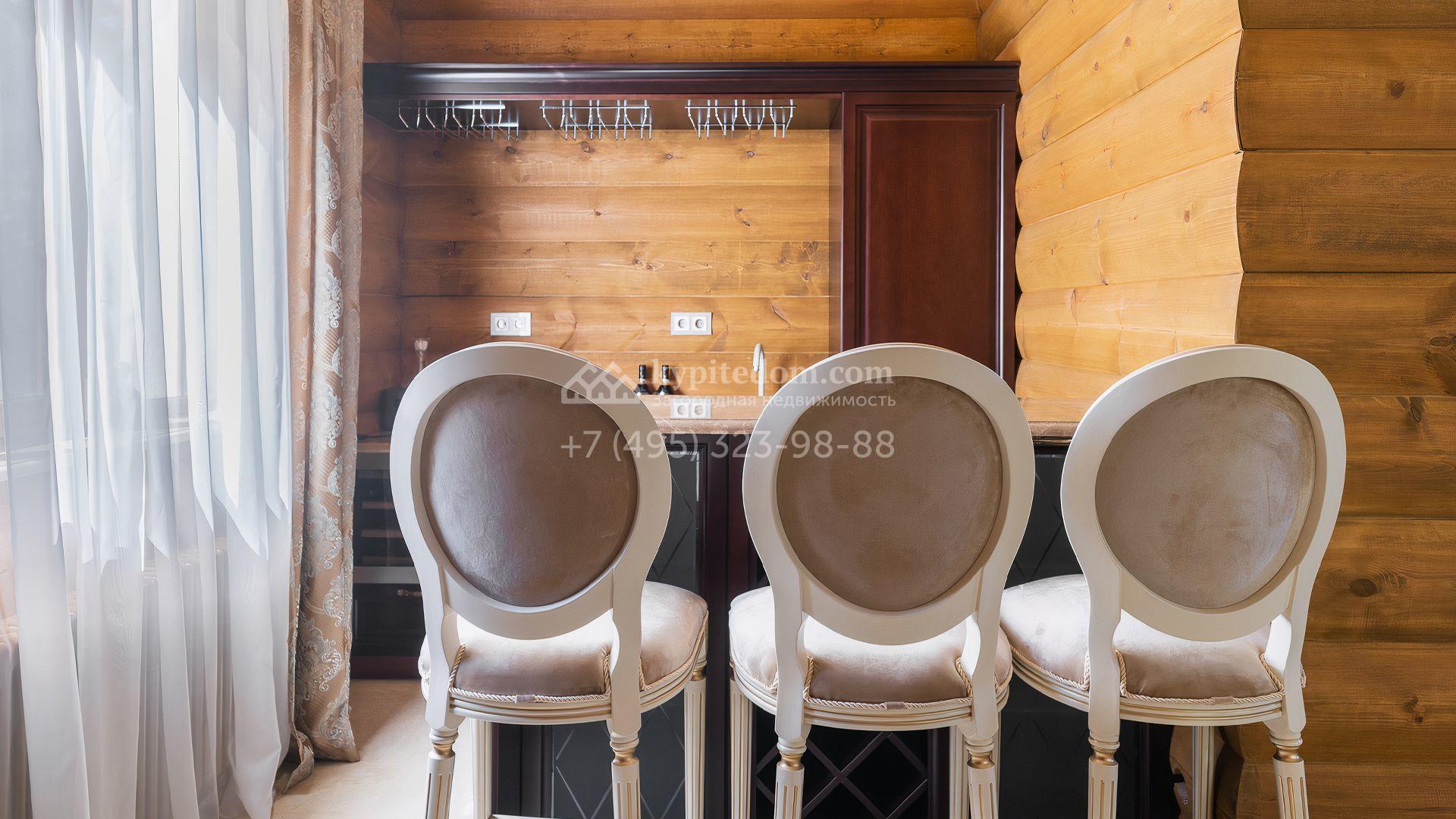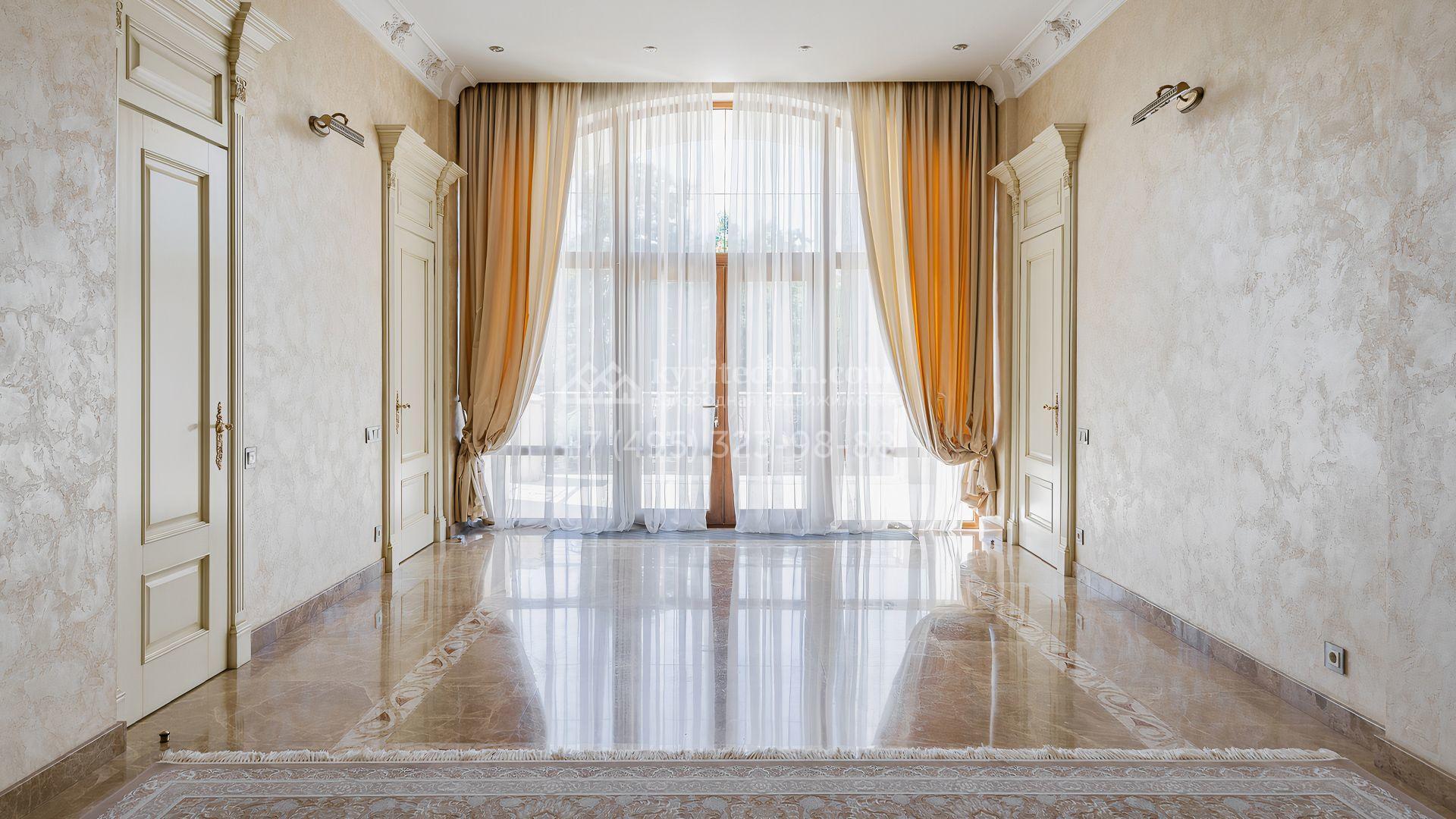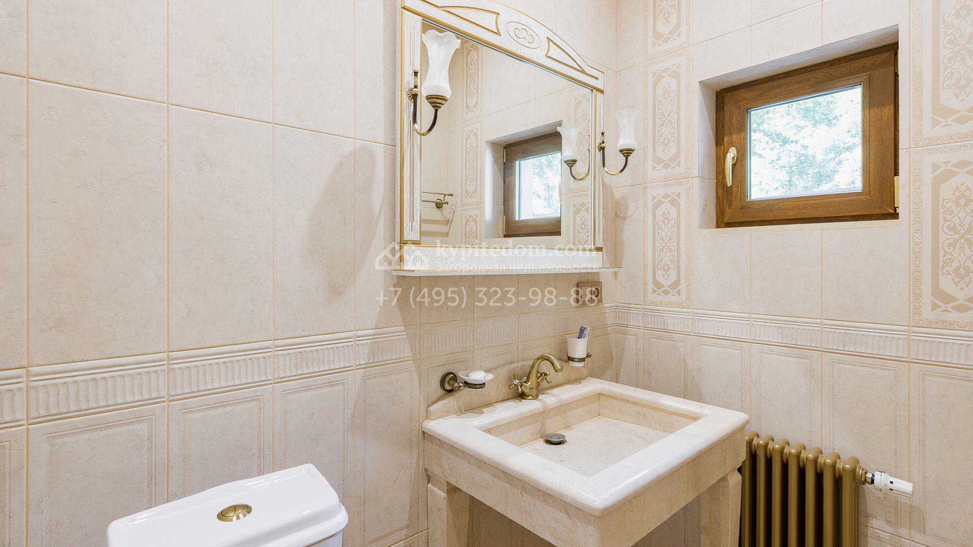 Загородный дом площадью 550 м² построен на просторном участке 20 соток рядом с лесом. Фасад здания облицован бежевым камнем, декорирован резным карнизом и коваными элементами. Интерьер выдержан в классическом стиле, в отделке использованы теплые оттенки, колонны, фактура дерева и камня. В резиденции спланировали 5 спален, гостиную-столовую с камином, кухню, кабинет, хаммам и сауну. Рядом расположены гараж на 2 машины с квартирой для персонала и баня со спортзалом. На участке с ландшафтным дизайном вымощены дорожки, засеян газон, установлено уличное освещение и оборудована закрытая летняя кухня с мангалом, коптильней и тандыром.