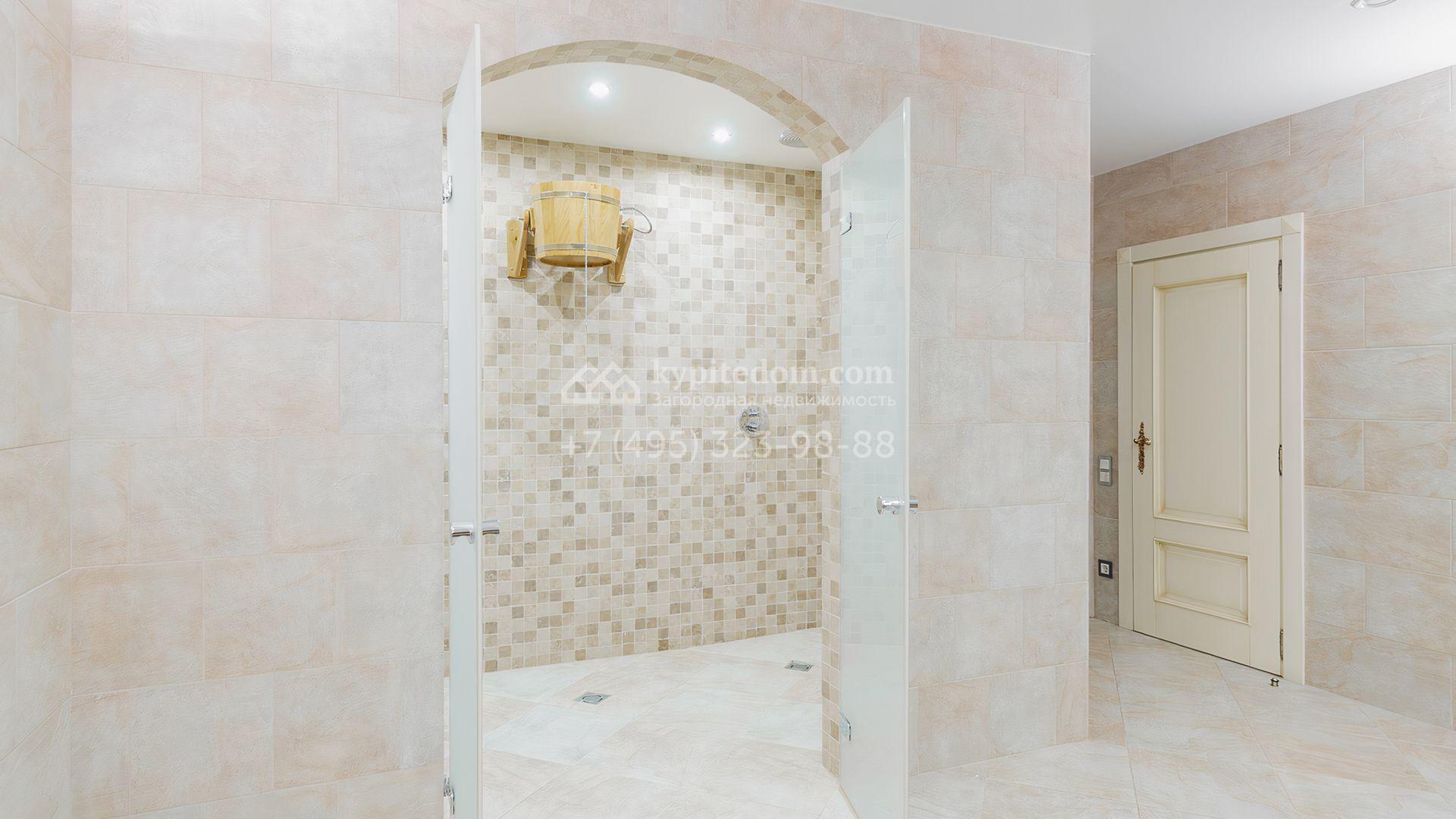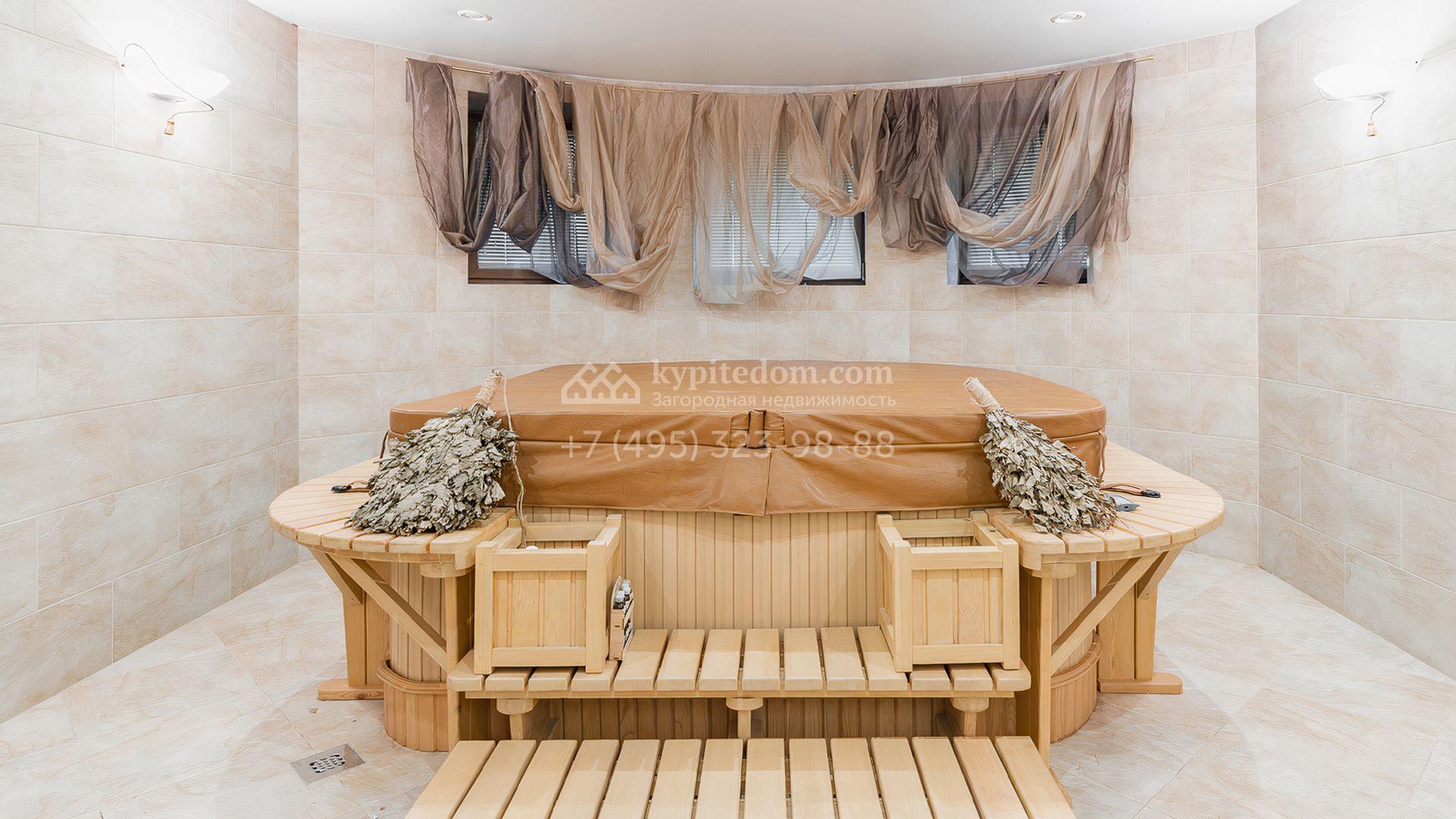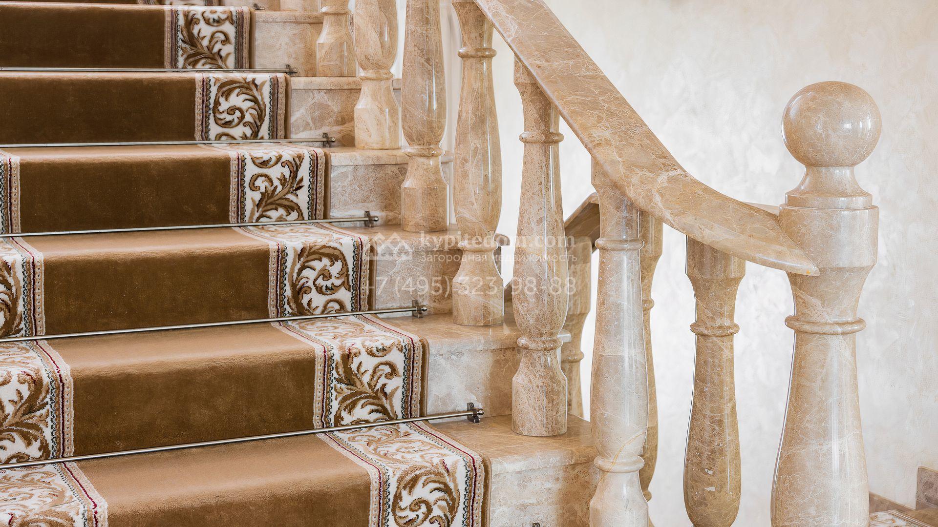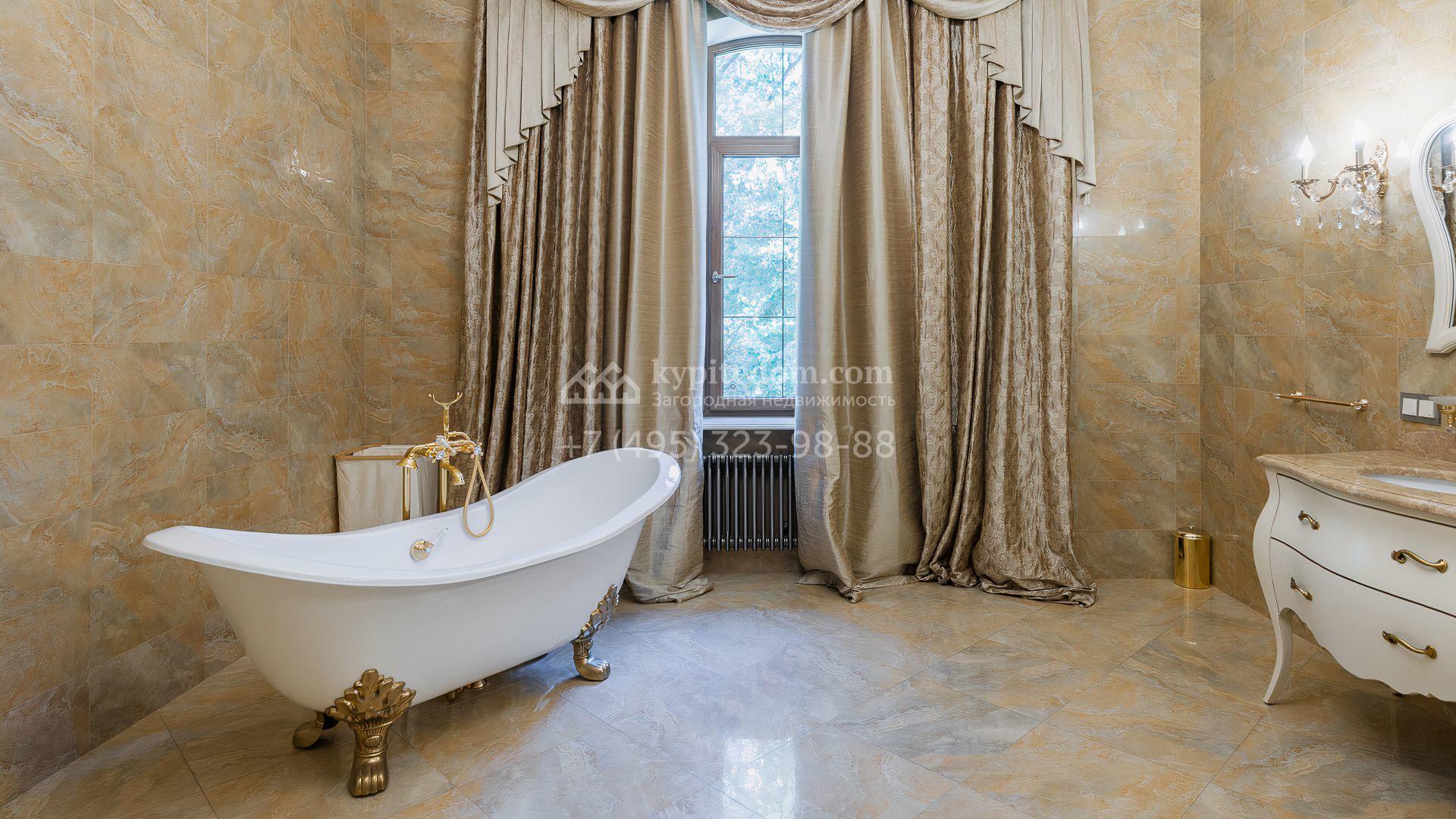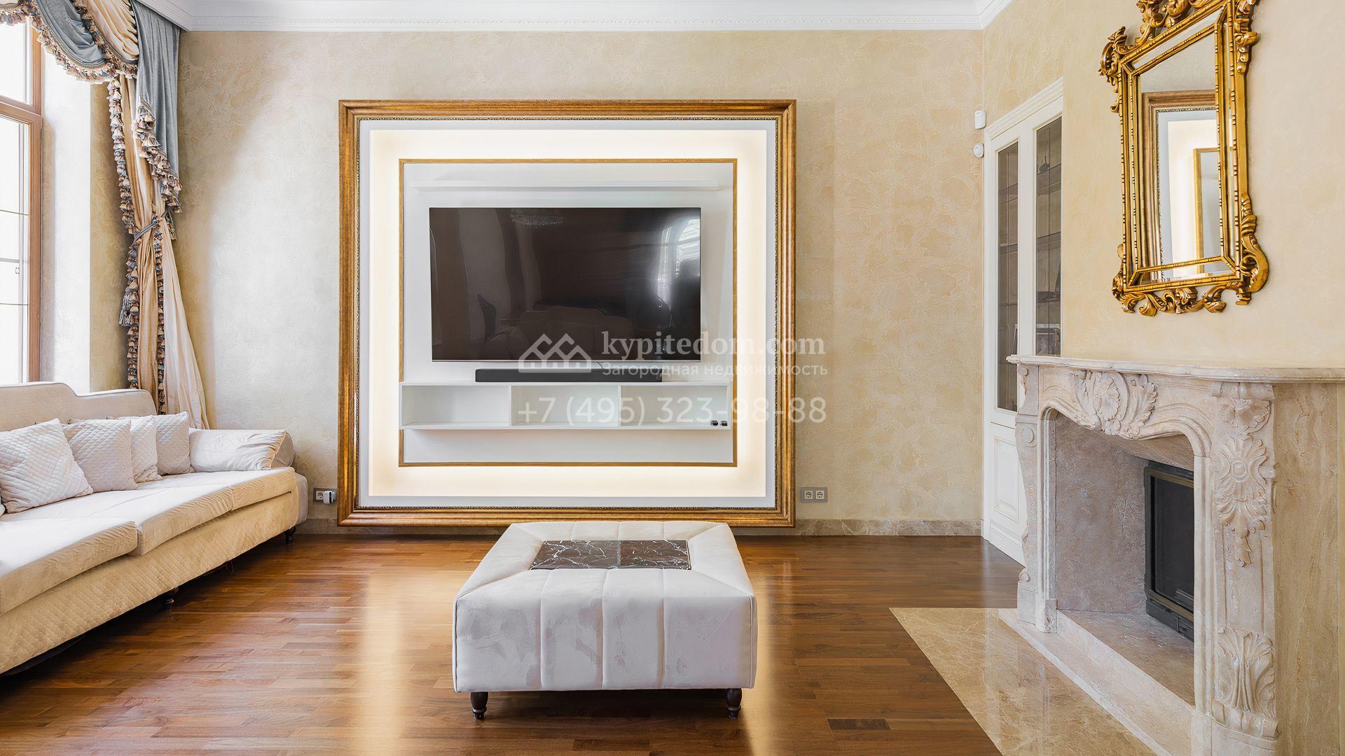 Загородный дом площадью 550 м² построен на просторном участке 20 соток рядом с лесом. Фасад здания облицован бежевым камнем, декорирован резным карнизом и коваными элементами. Интерьер выдержан в классическом стиле, в отделке использованы теплые оттенки, колонны, фактура дерева и камня. В резиденции спланировали 5 спален, гостиную-столовую с камином, кухню, кабинет, хаммам и сауну. Рядом расположены гараж на 2 машины с квартирой для персонала и баня со спортзалом. На участке с ландшафтным дизайном вымощены дорожки, засеян газон, установлено уличное освещение и оборудована закрытая летняя кухня с мангалом, коптильней и тандыром.