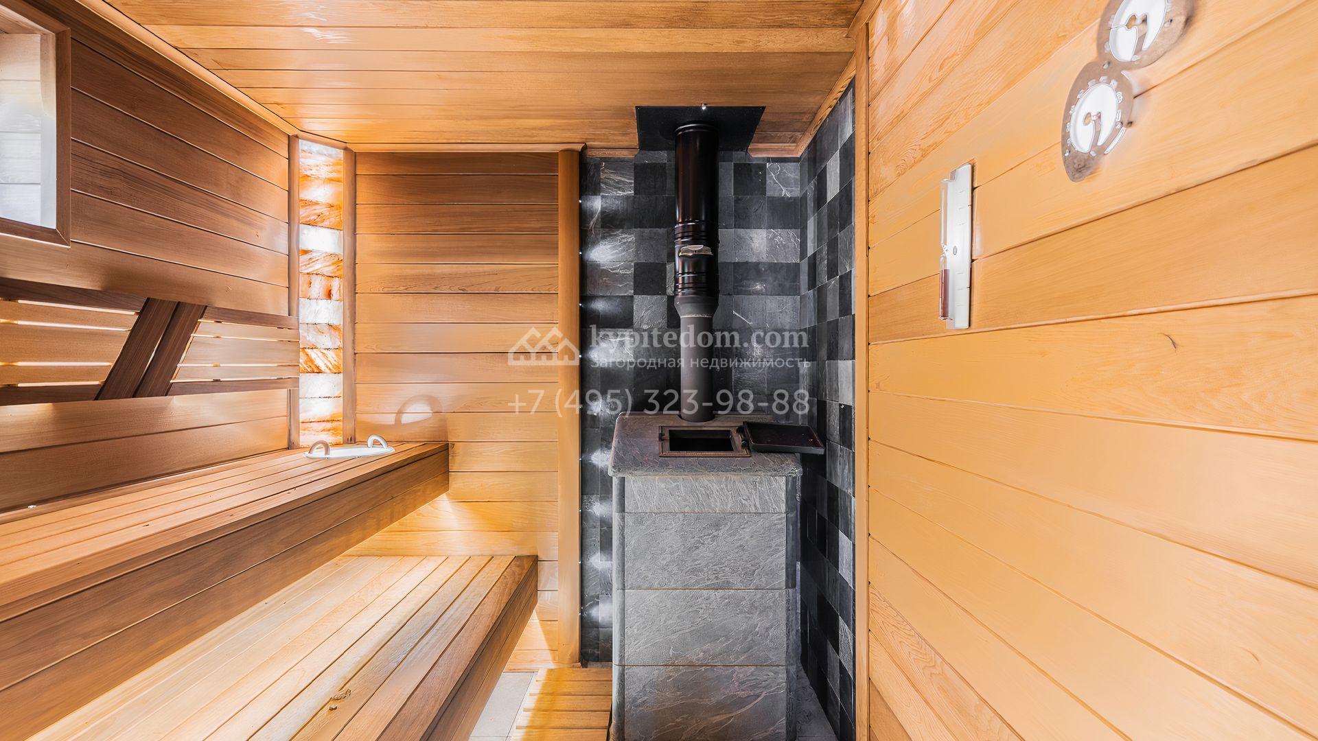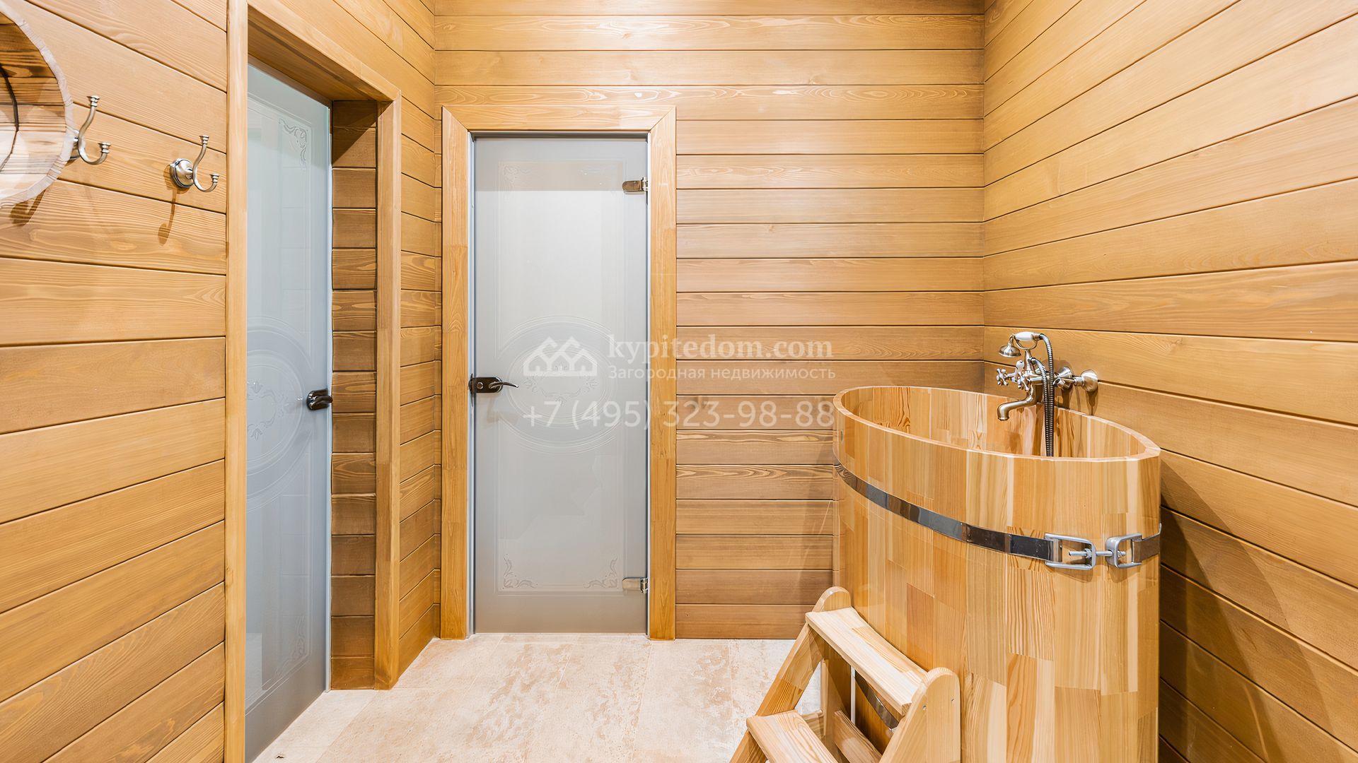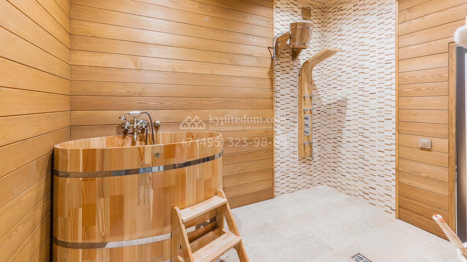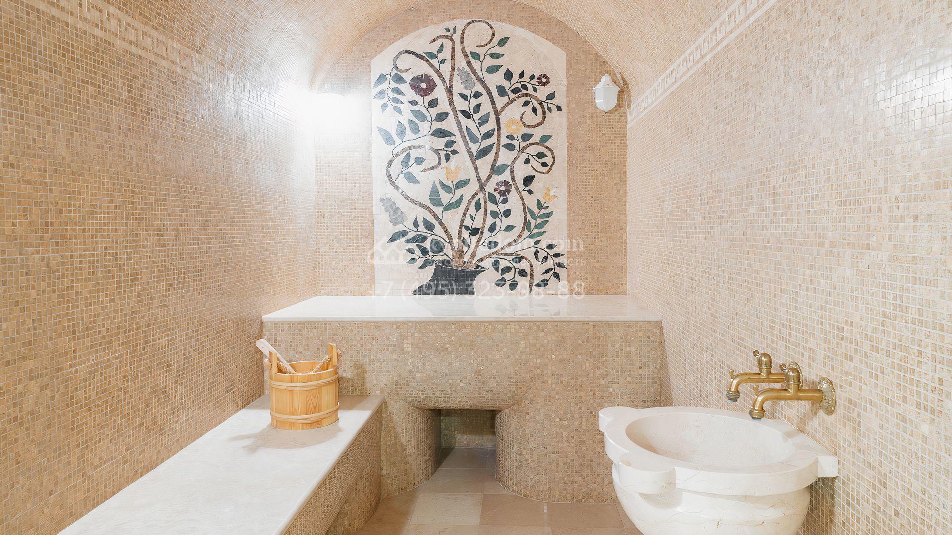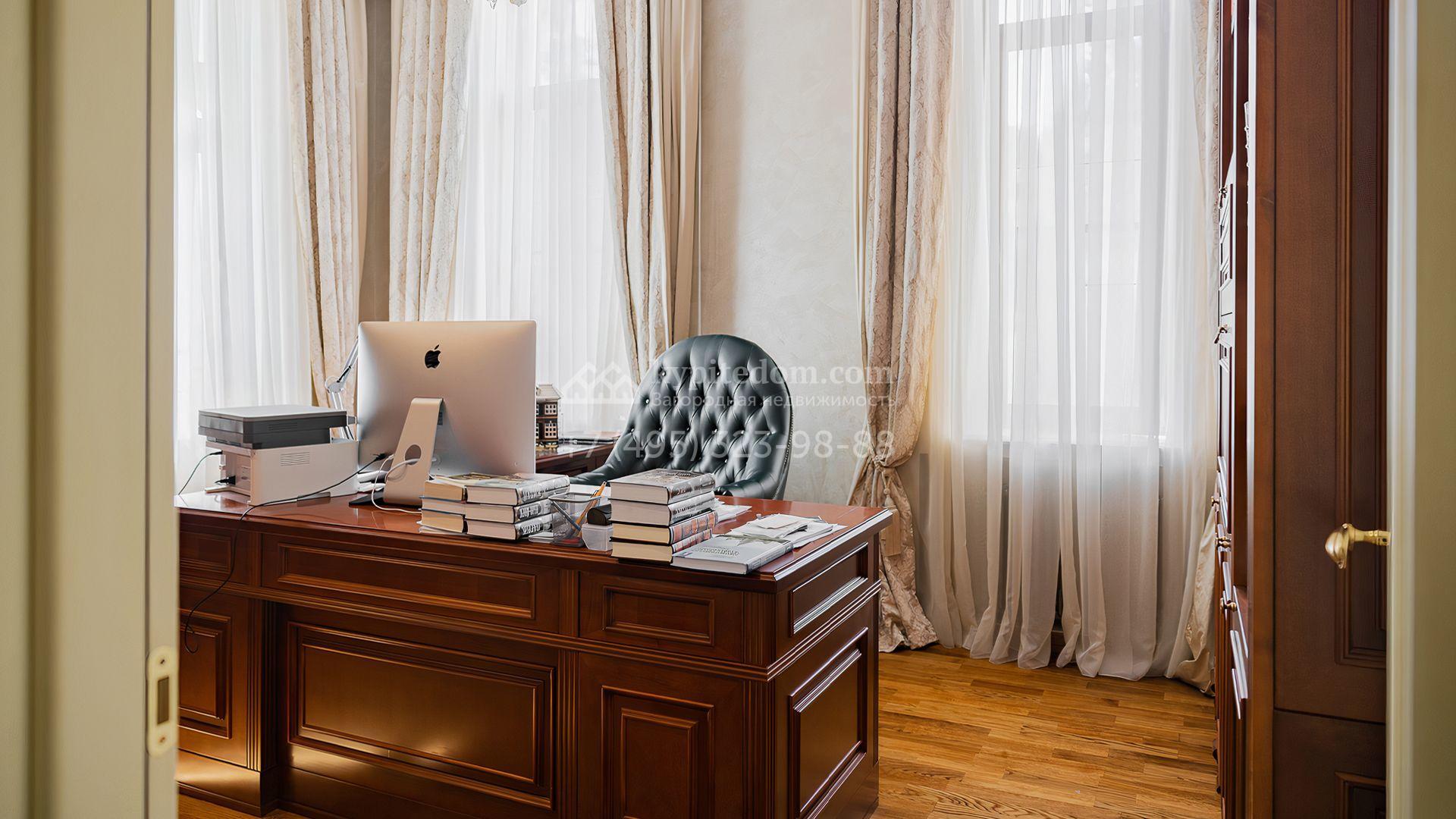 Загородный дом площадью 550 м² построен на просторном участке 20 соток рядом с лесом. Фасад здания облицован бежевым камнем, декорирован резным карнизом и коваными элементами. Интерьер выдержан в классическом стиле, в отделке использованы теплые оттенки, колонны, фактура дерева и камня. В резиденции спланировали 5 спален, гостиную-столовую с камином, кухню, кабинет, хаммам и сауну. Рядом расположены гараж на 2 машины с квартирой для персонала и баня со спортзалом. На участке с ландшафтным дизайном вымощены дорожки, засеян газон, установлено уличное освещение и оборудована закрытая летняя кухня с мангалом, коптильней и тандыром.