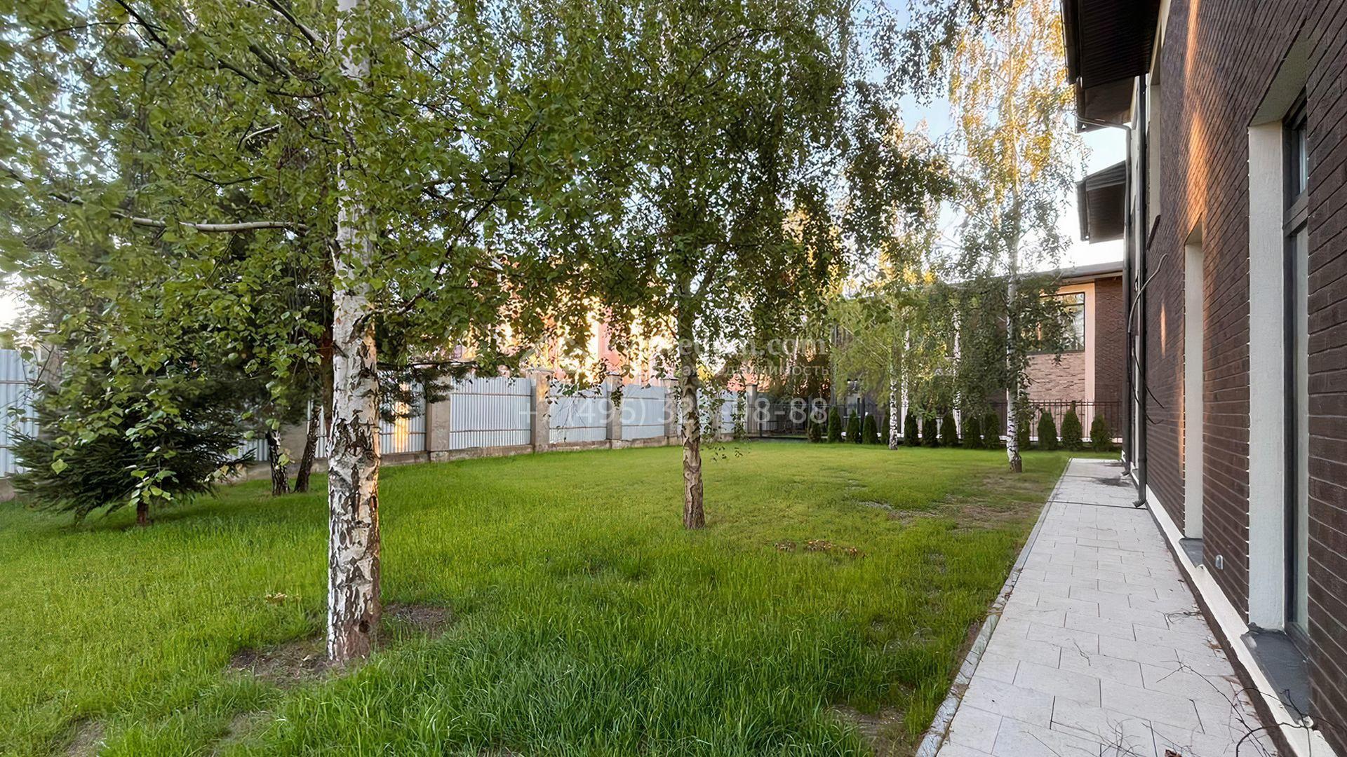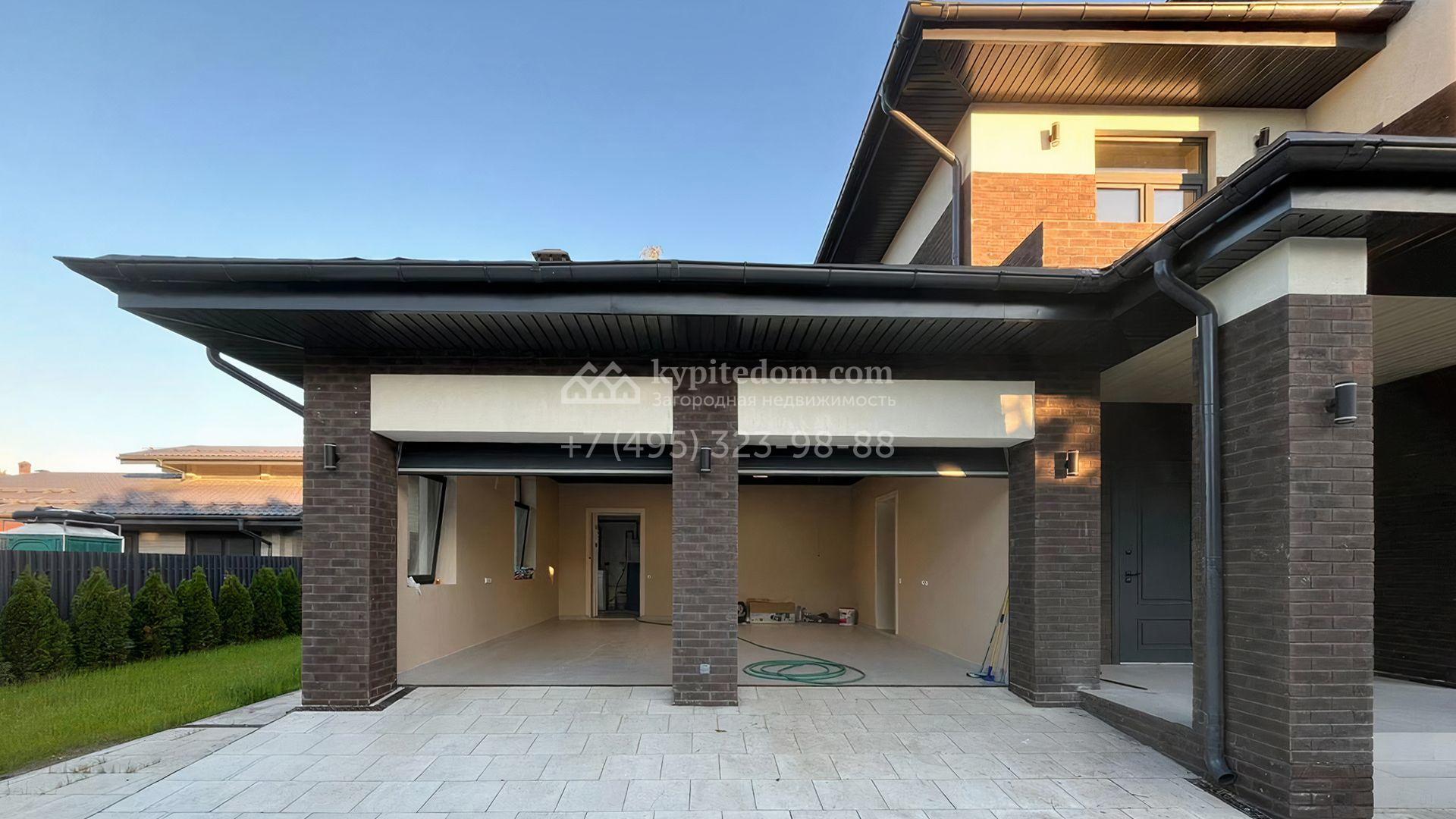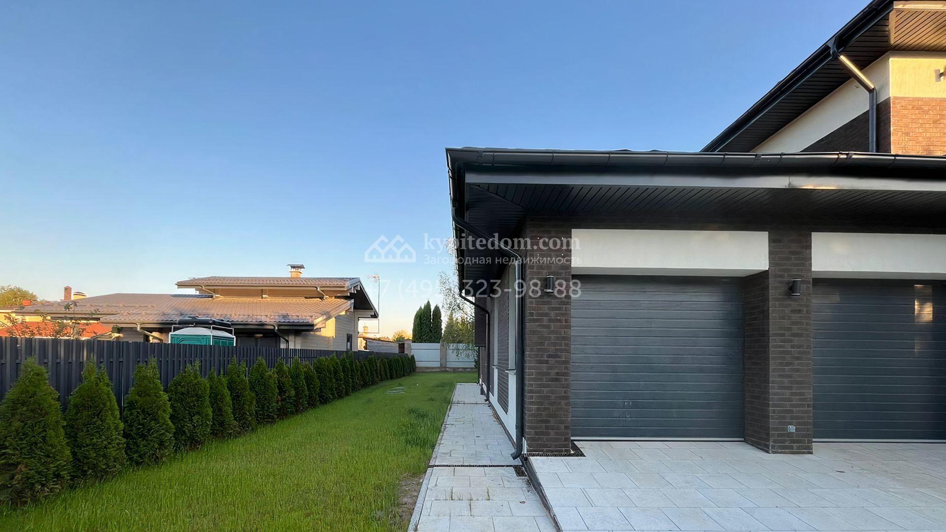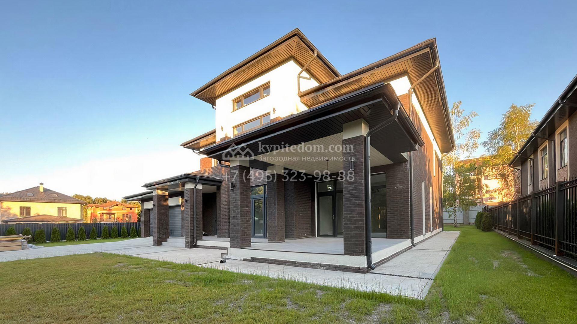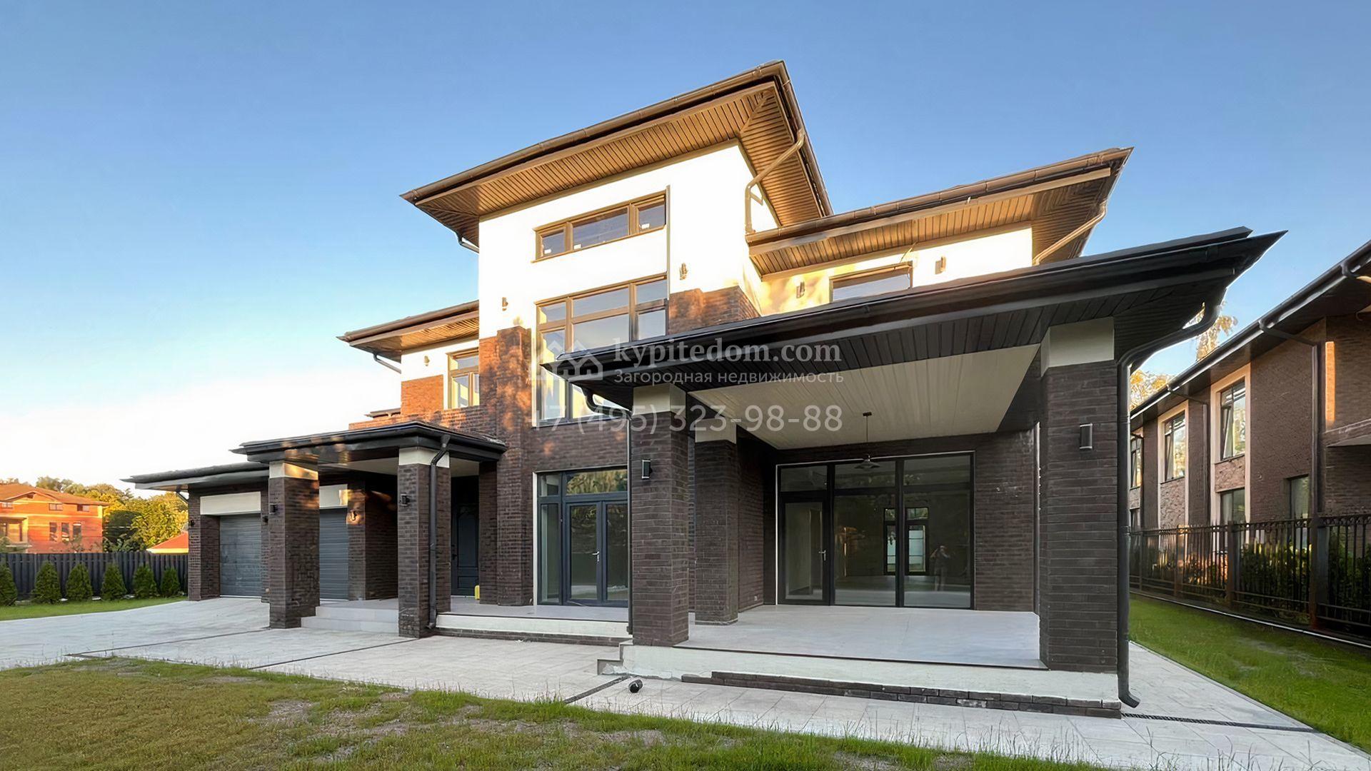 Загородный дом площадью 540 м² построен на уютном полевом участке 12,5 сотки. Фасад здания, вдохновленный архитектурой Фрэнка Ллойда Райта, облицован коричневым клинкером и декорирован подсветкой. В отделке современного интерьера сочетаются теплые оттенки и фактура дерева и камня. Подсветка по периметру комнат создает ощущение парящего потолка. Планировка коттеджа включает 5 спален, гостиную, кухню, кабинет и гараж на 2 машины. На участке с газоном и молодыми березами можно выполнить ландшафтный дизайн и обустроить зону барбекю.