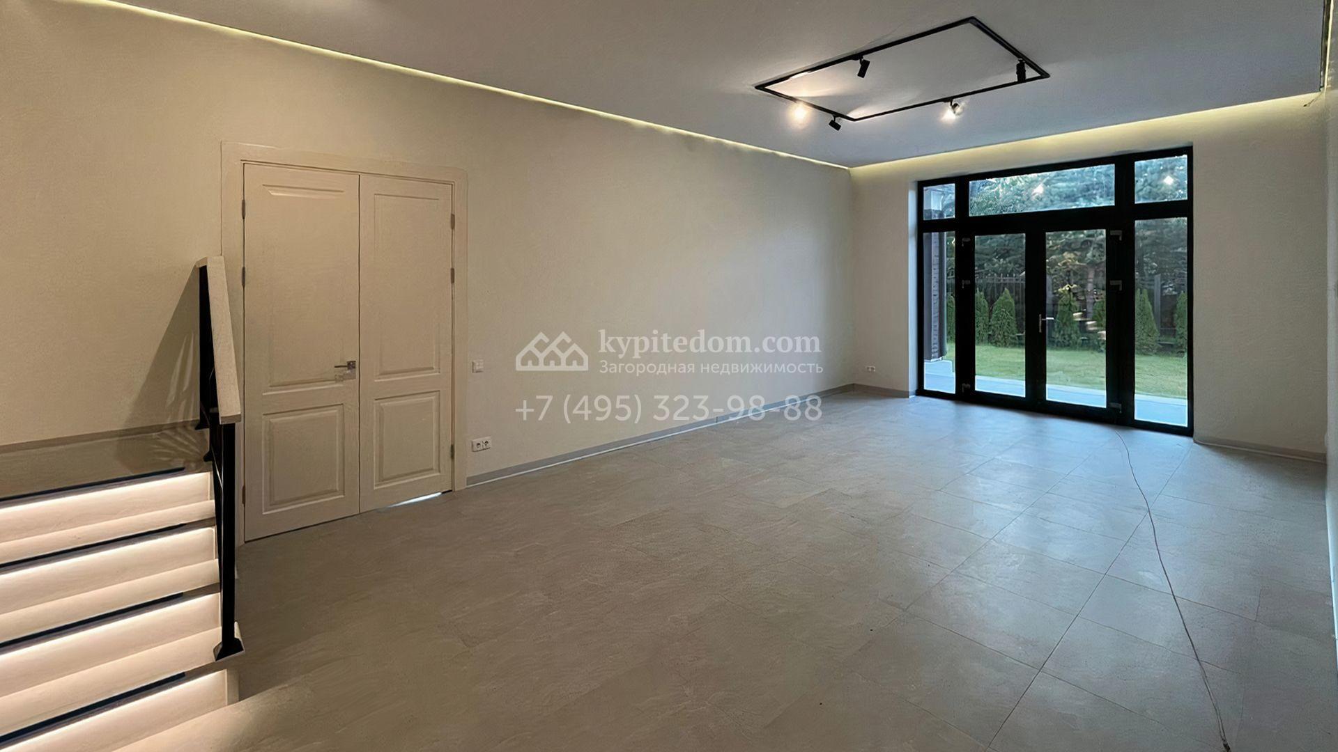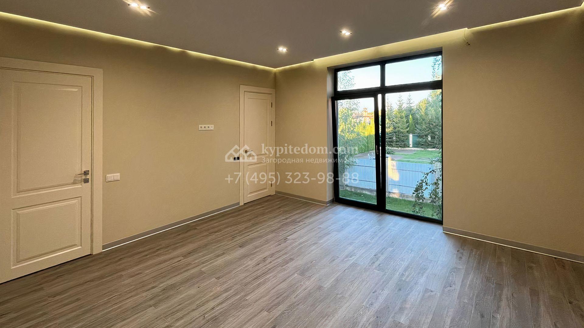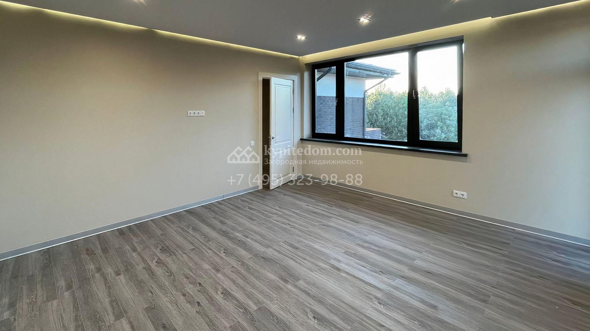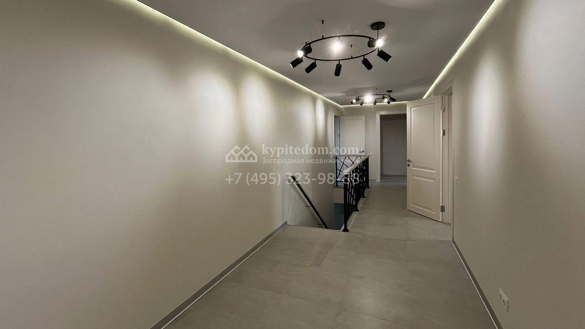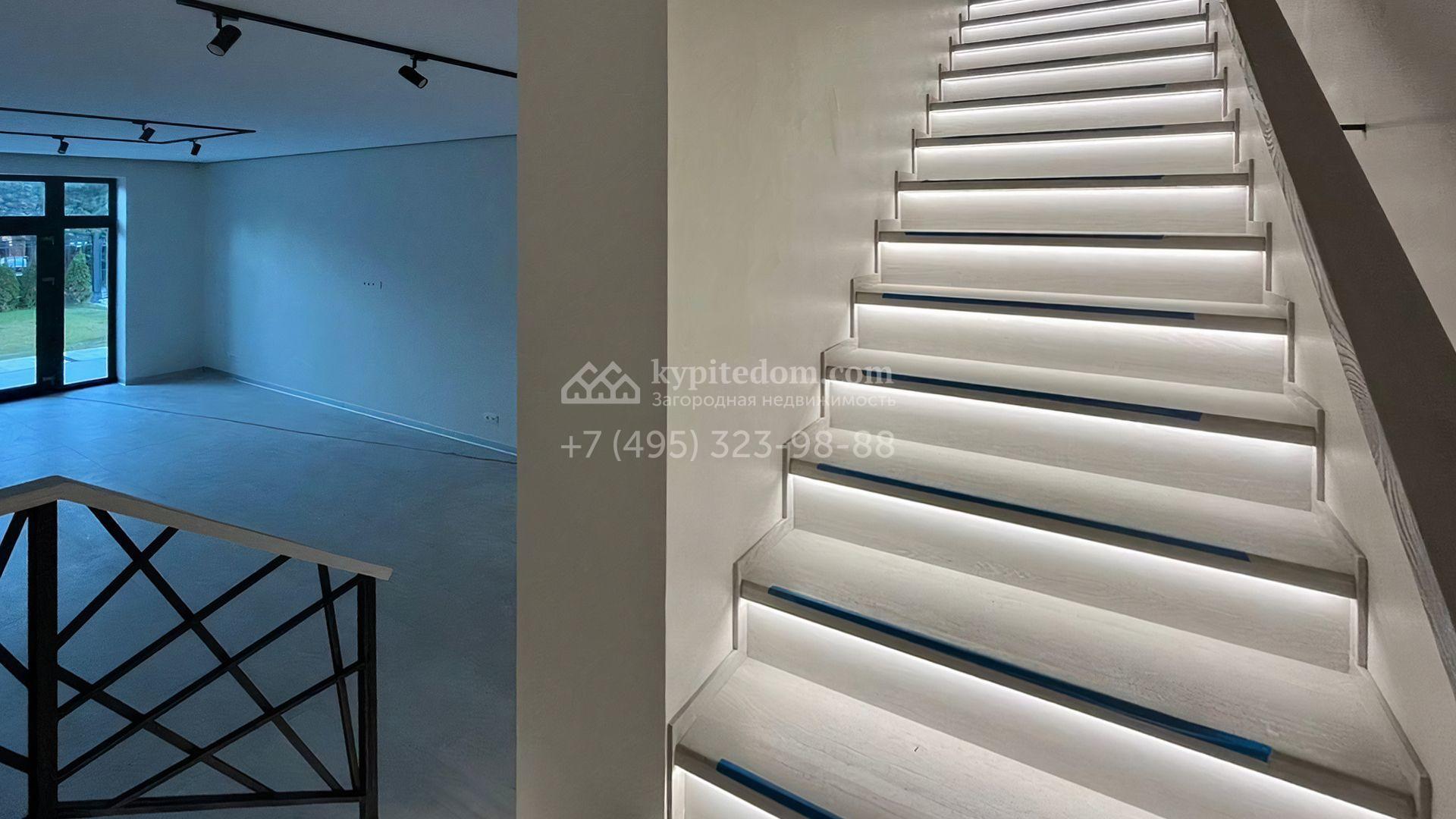 Загородный дом площадью 540 м² построен на уютном полевом участке 12,5 сотки. Фасад здания, вдохновленный архитектурой Фрэнка Ллойда Райта, облицован коричневым клинкером и декорирован подсветкой. В отделке современного интерьера сочетаются теплые оттенки и фактура дерева и камня. Подсветка по периметру комнат создает ощущение парящего потолка. Планировка коттеджа включает 5 спален, гостиную, кухню, кабинет и гараж на 2 машины. На участке с газоном и молодыми березами можно выполнить ландшафтный дизайн и обустроить зону барбекю.