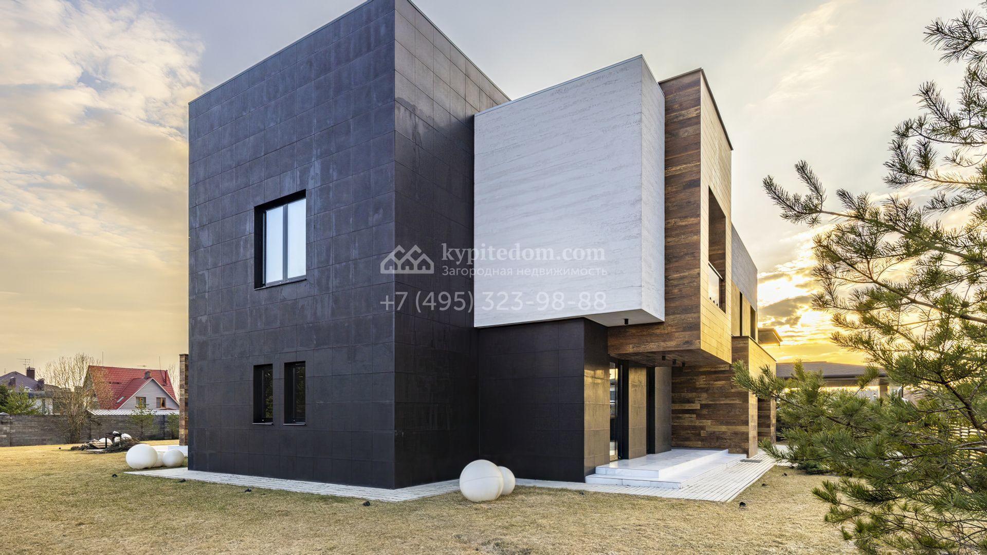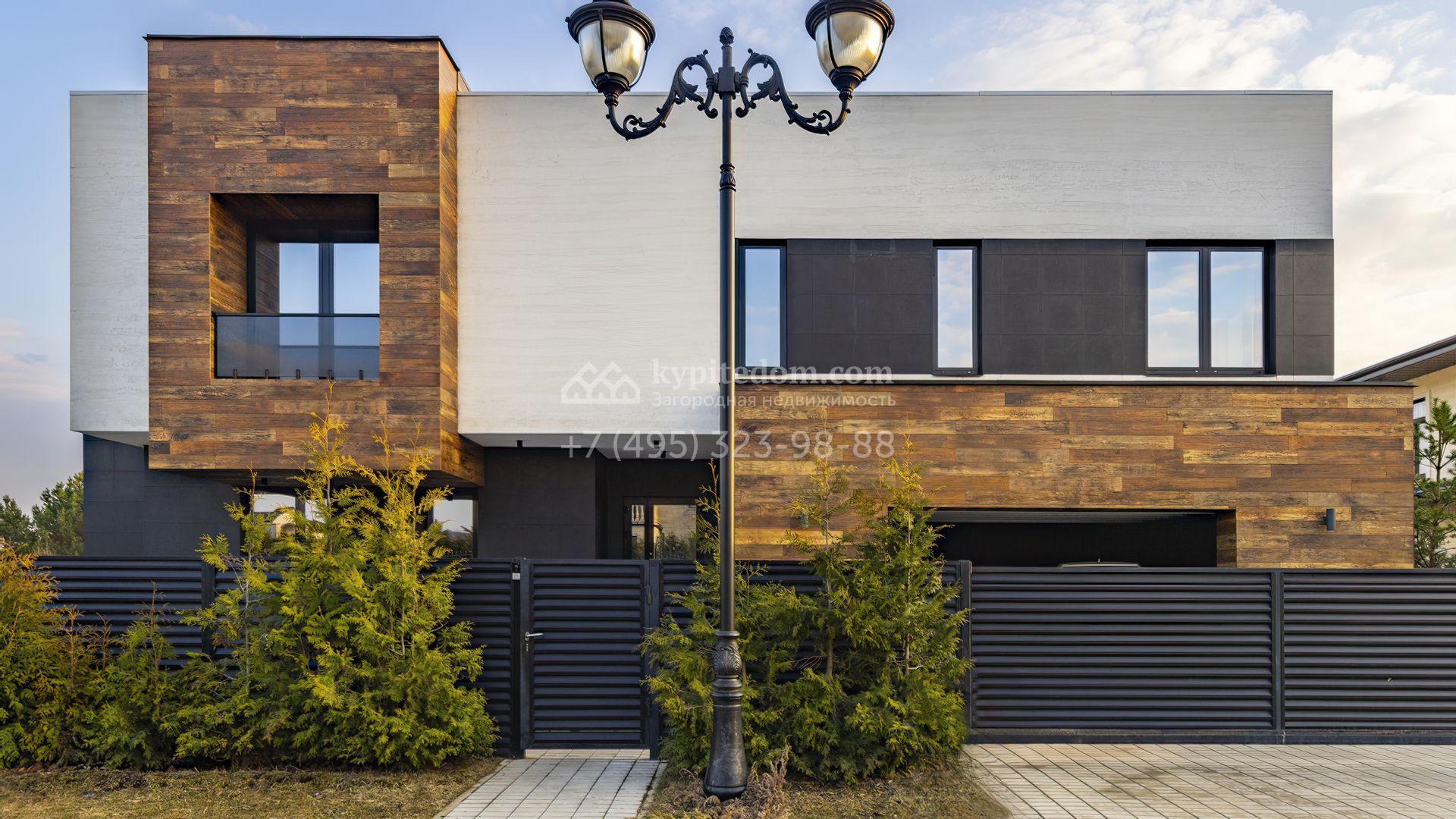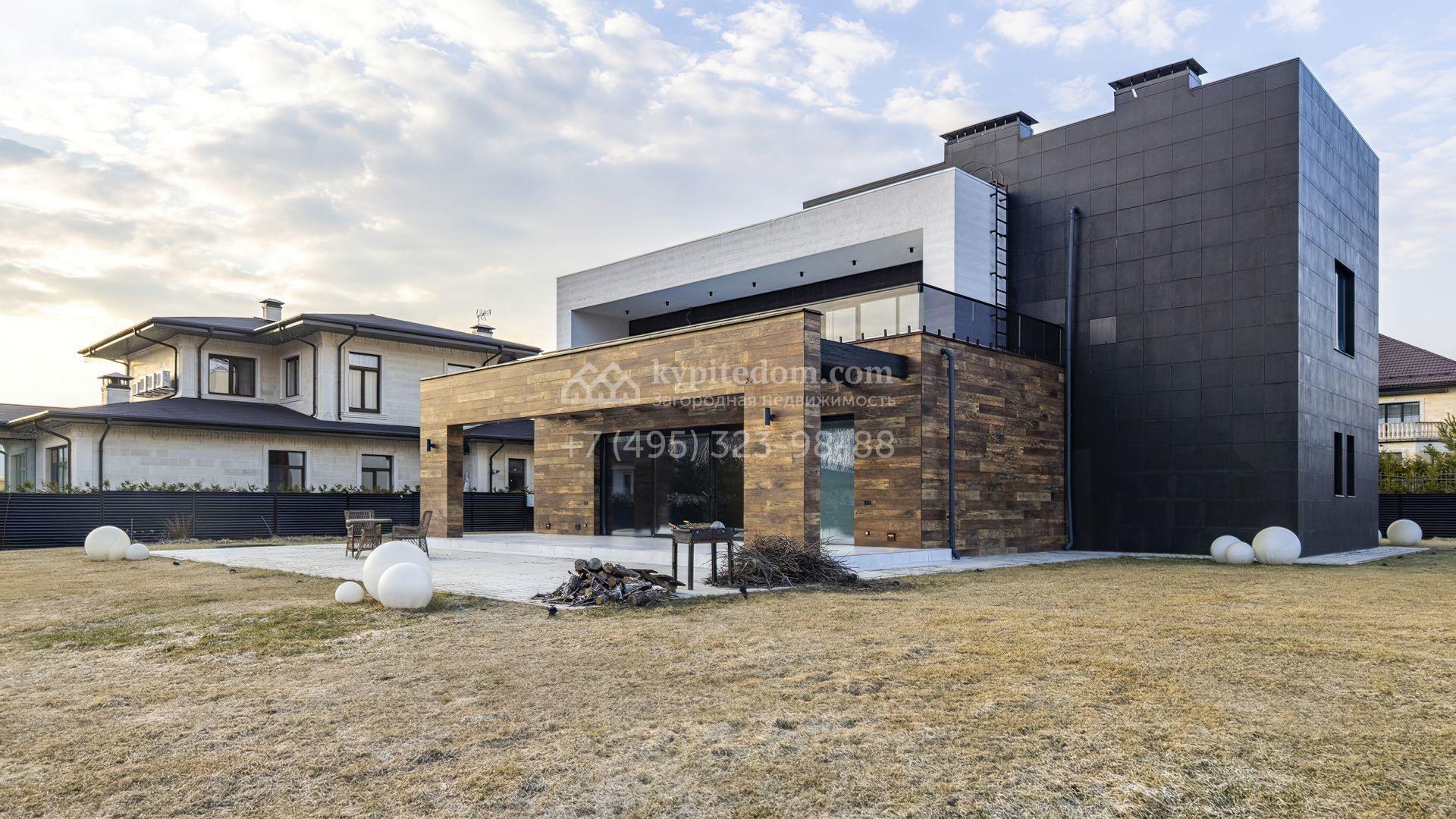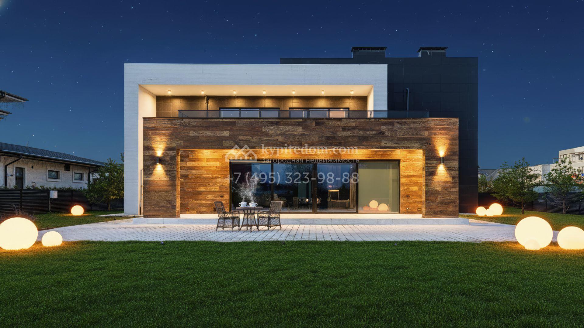 Двухэтажный коттедж площадью 540 м² расположен на полевом участке 25 соток. Здание выполнено в стиле хай-тек, где гармонично сочетаются фасадные плиты глубоких оттенков и отделка из дерева с естественным рисунком. Прямые линии и чёткие формы подчеркивают архитектурные особенности, а вечерняя подсветка усиливает выразительность экстерьера.
