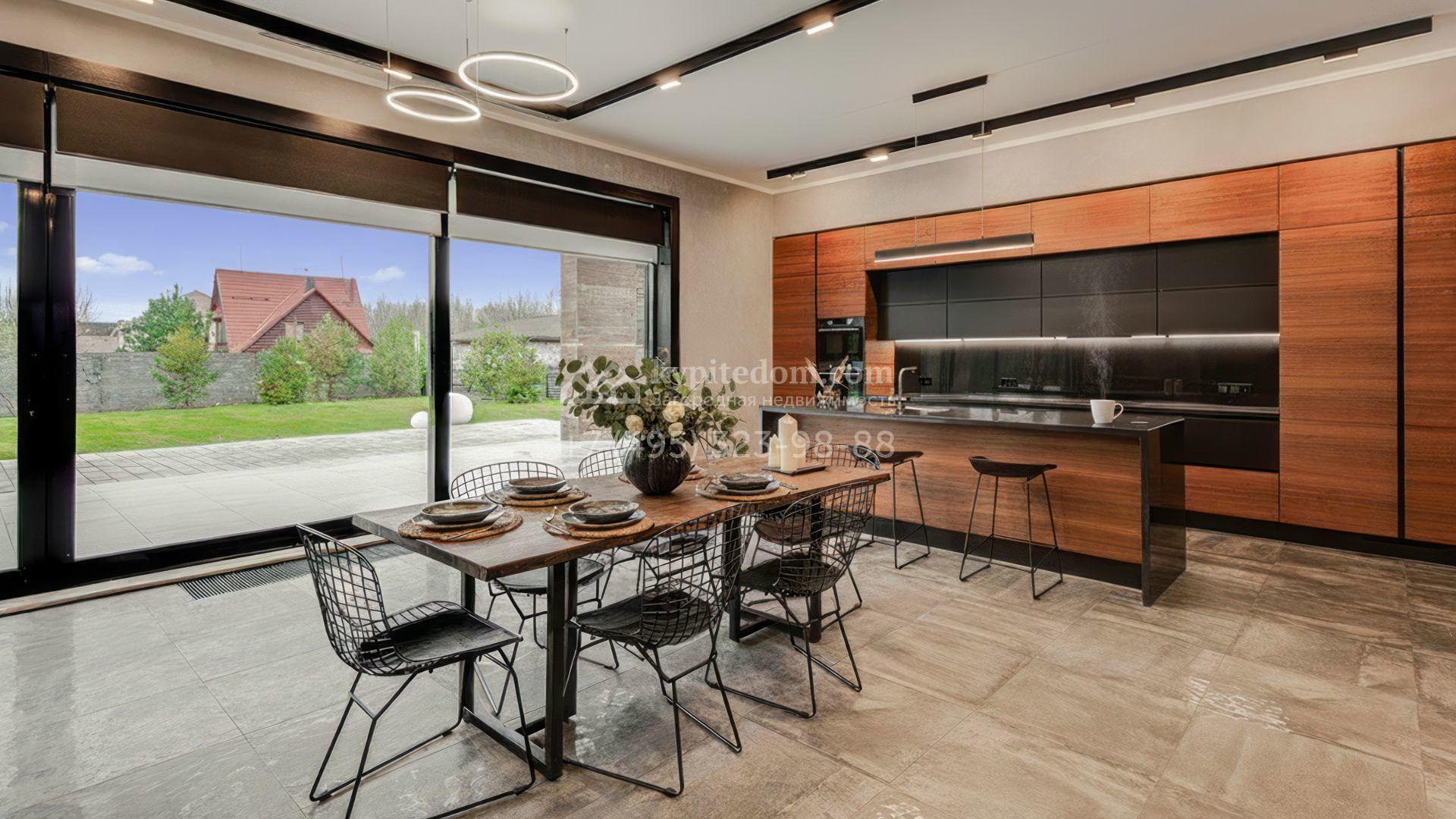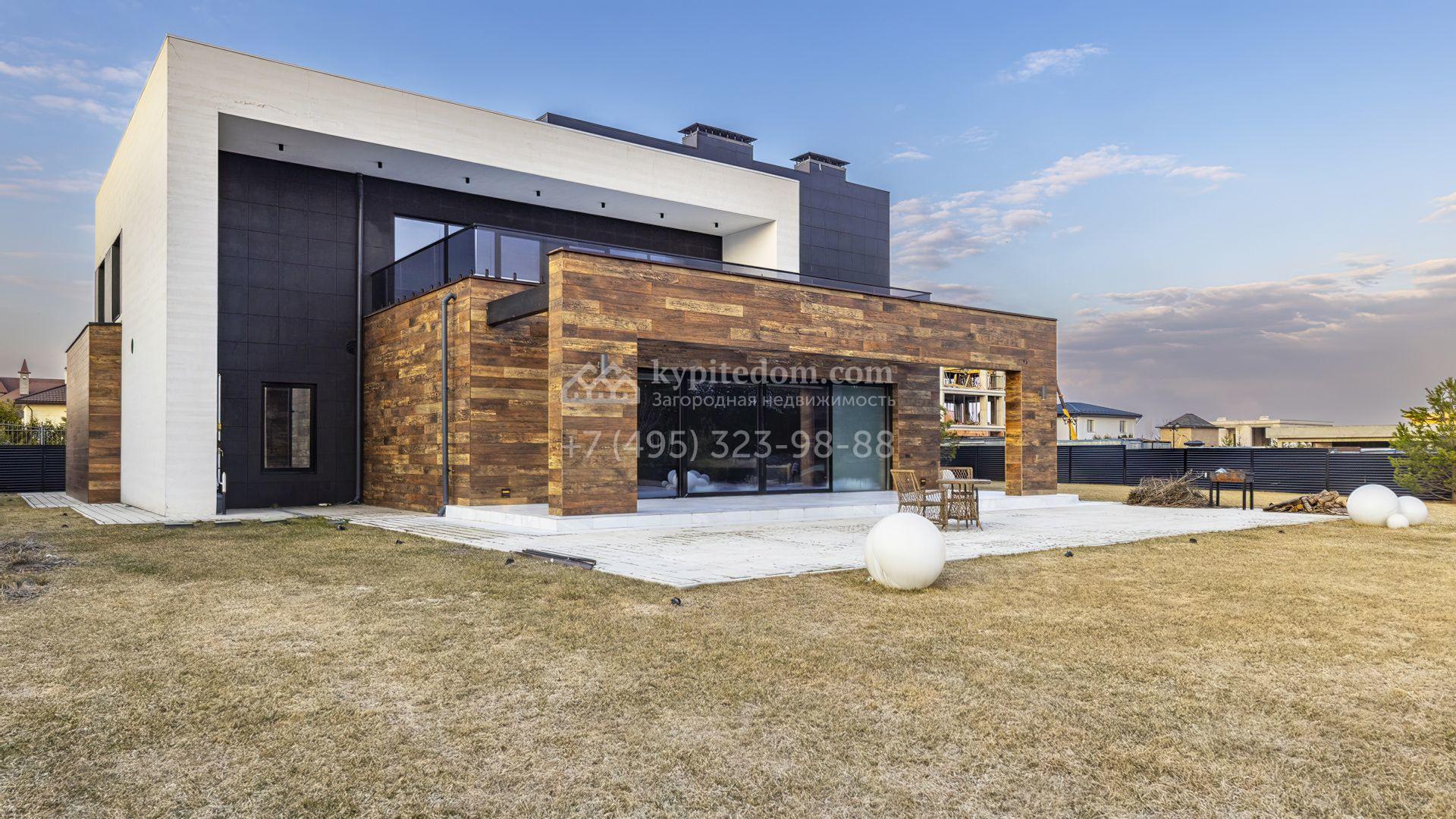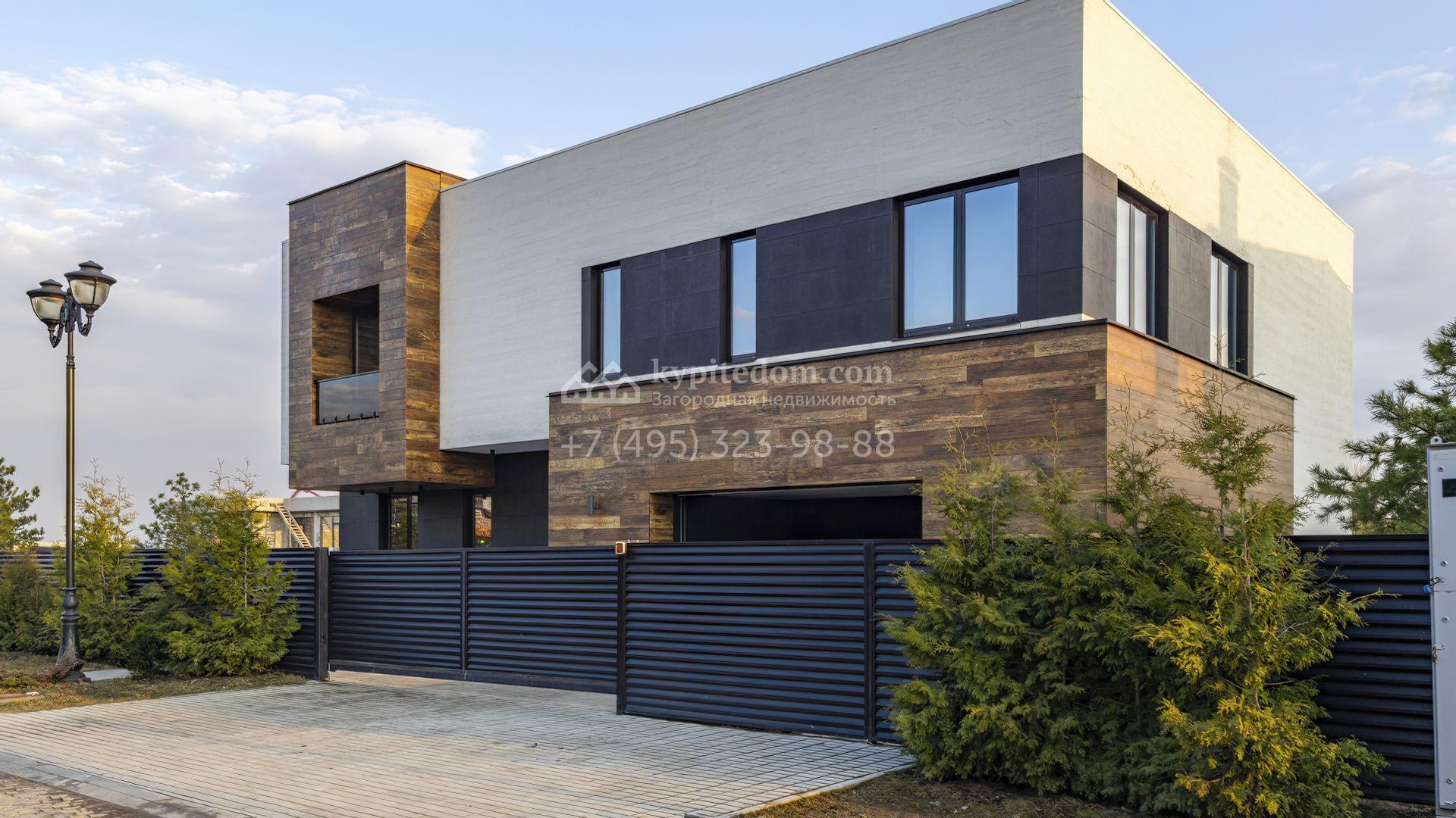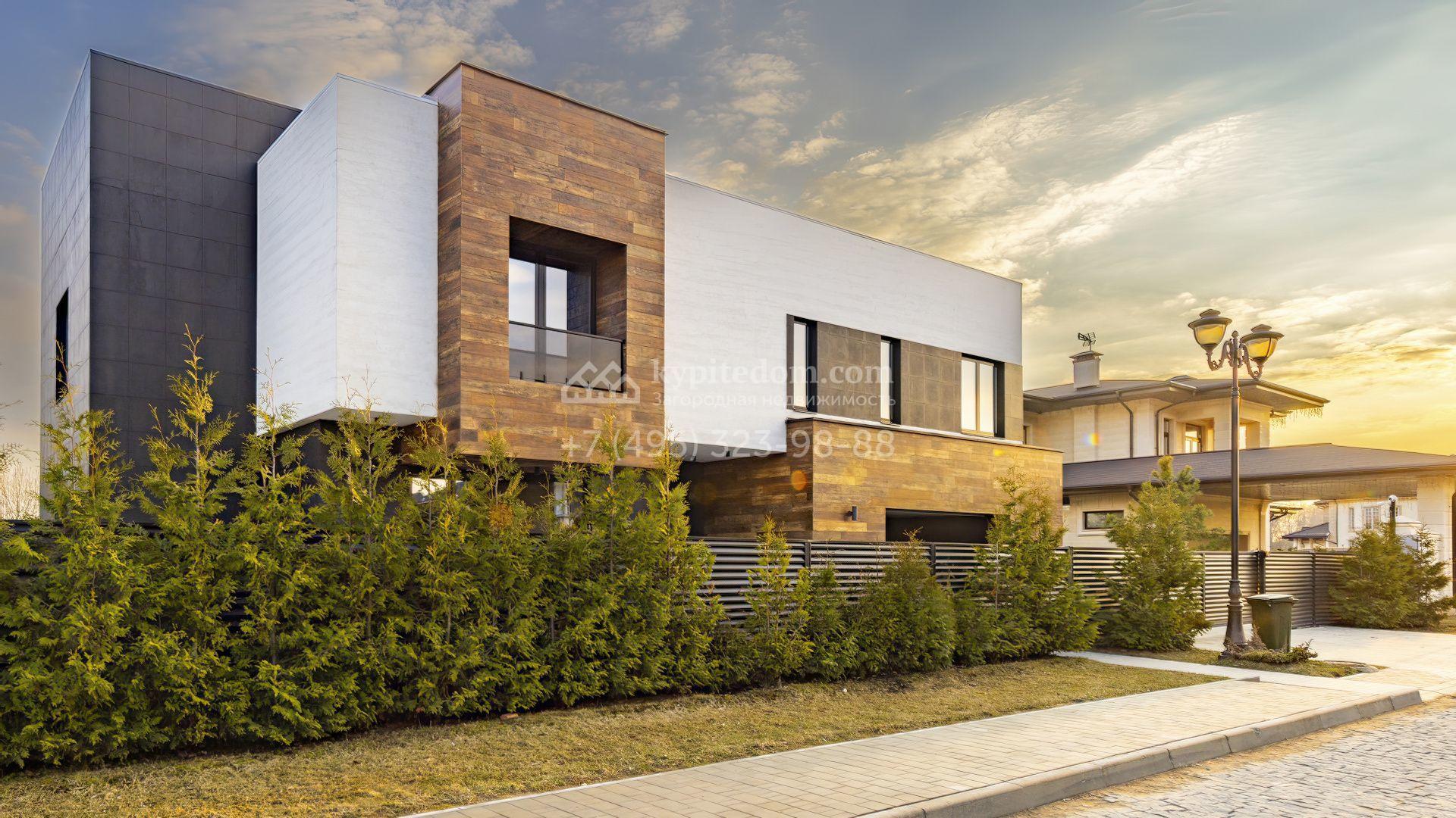 Двухэтажный коттедж площадью 540 м² расположен на полевом участке 25 соток. Здание выполнено в стиле хай-тек, где гармонично сочетаются фасадные плиты глубоких оттенков и отделка из дерева с естественным рисунком. Прямые линии и чёткие формы подчеркивают архитектурные особенности, а вечерняя подсветка усиливает выразительность экстерьера.