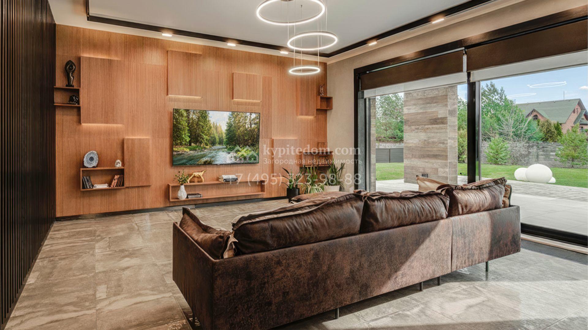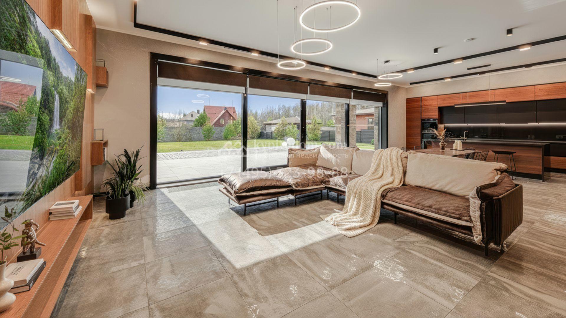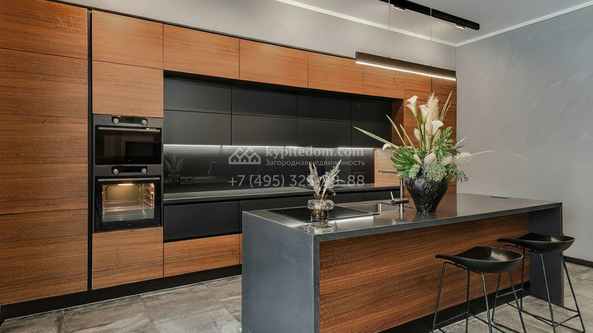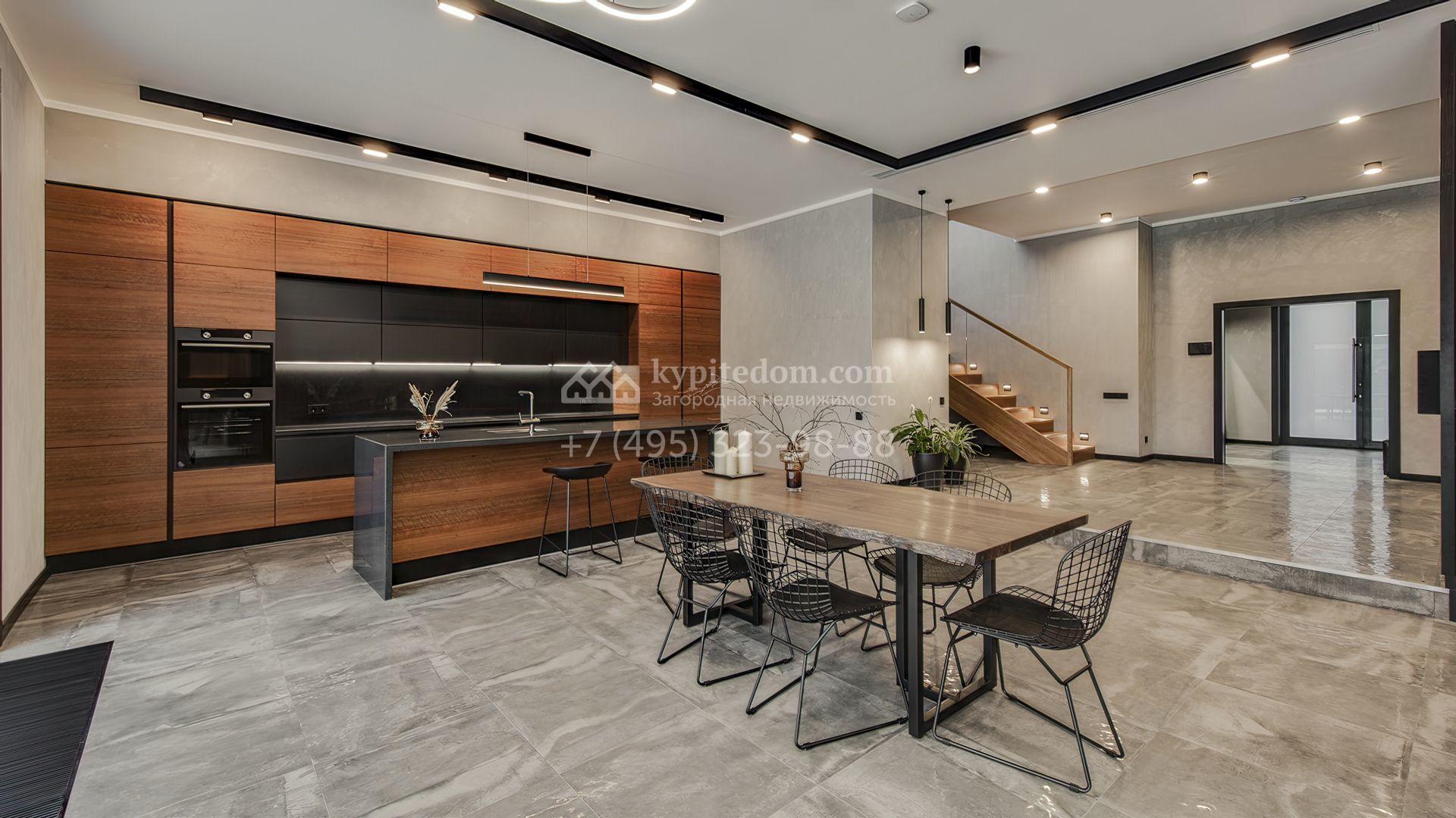 Двухэтажный коттедж площадью 540 м² расположен на полевом участке 25 соток. Здание выполнено в стиле хай-тек, где гармонично сочетаются фасадные плиты глубоких оттенков и отделка из дерева с естественным рисунком. Прямые линии и чёткие формы подчеркивают архитектурные особенности, а вечерняя подсветка усиливает выразительность экстерьера.