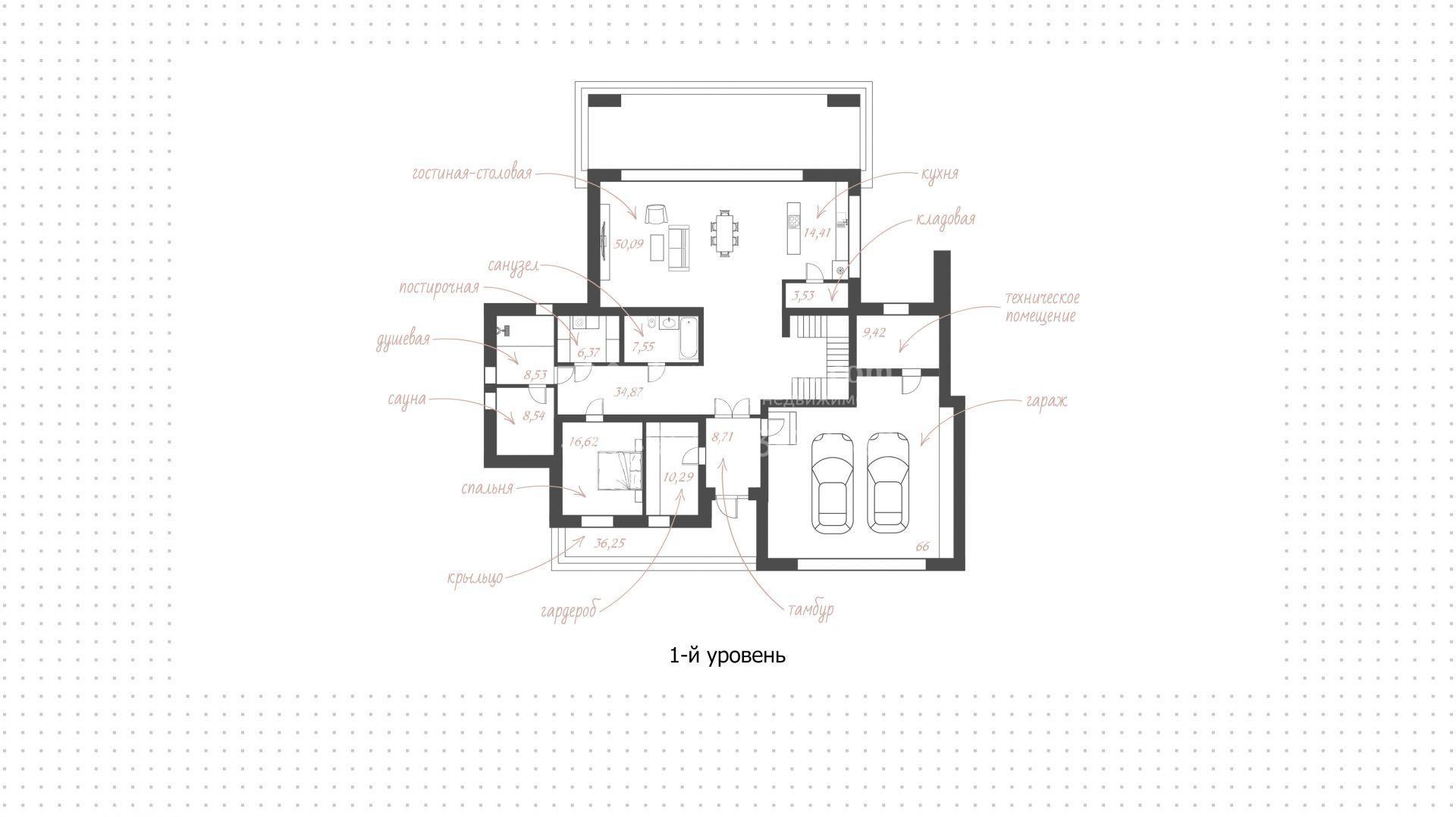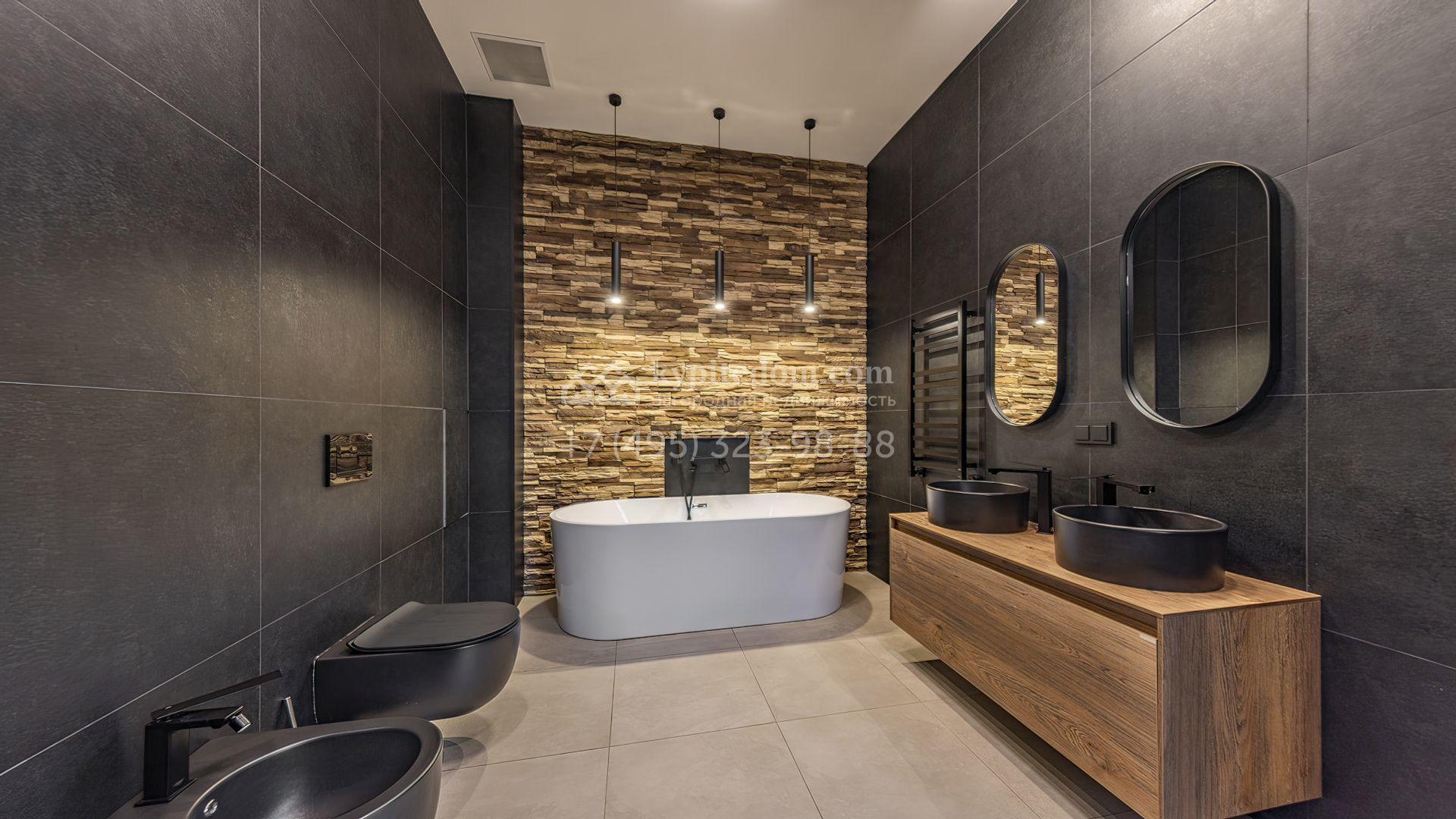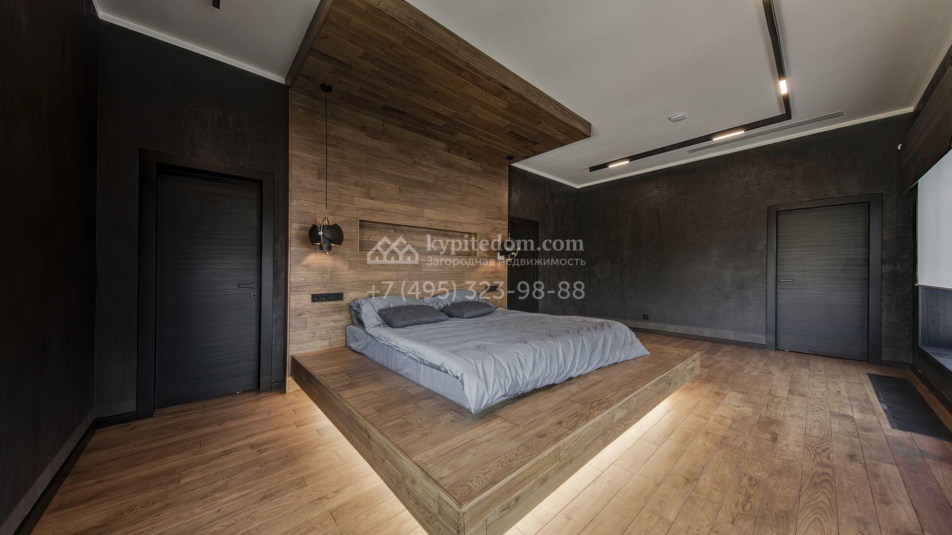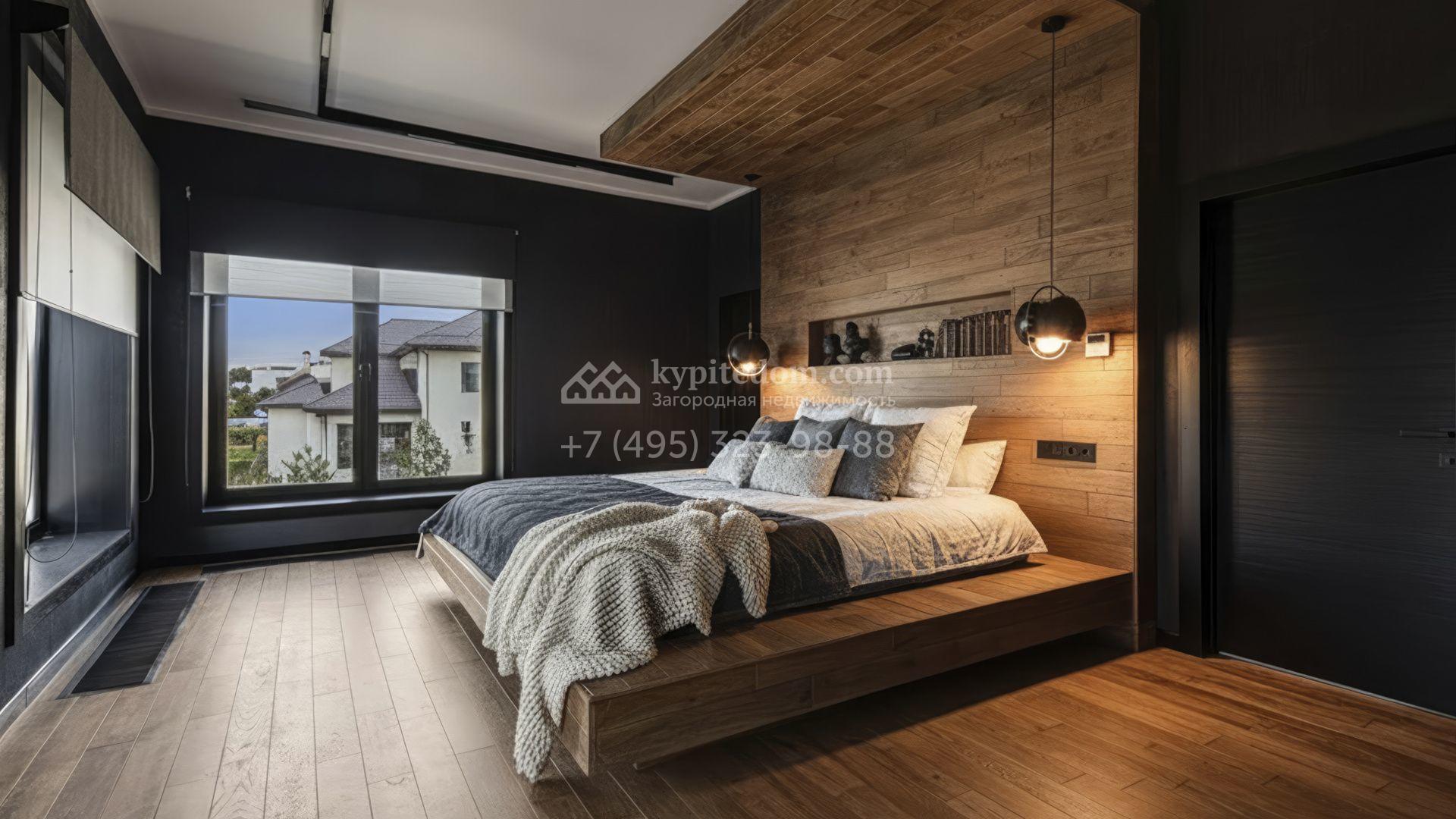 Двухэтажный коттедж площадью 540 м² расположен на полевом участке 25 соток. Здание выполнено в стиле хай-тек, где гармонично сочетаются фасадные плиты глубоких оттенков и отделка из дерева с естественным рисунком. Прямые линии и чёткие формы подчеркивают архитектурные особенности, а вечерняя подсветка усиливает выразительность экстерьера.