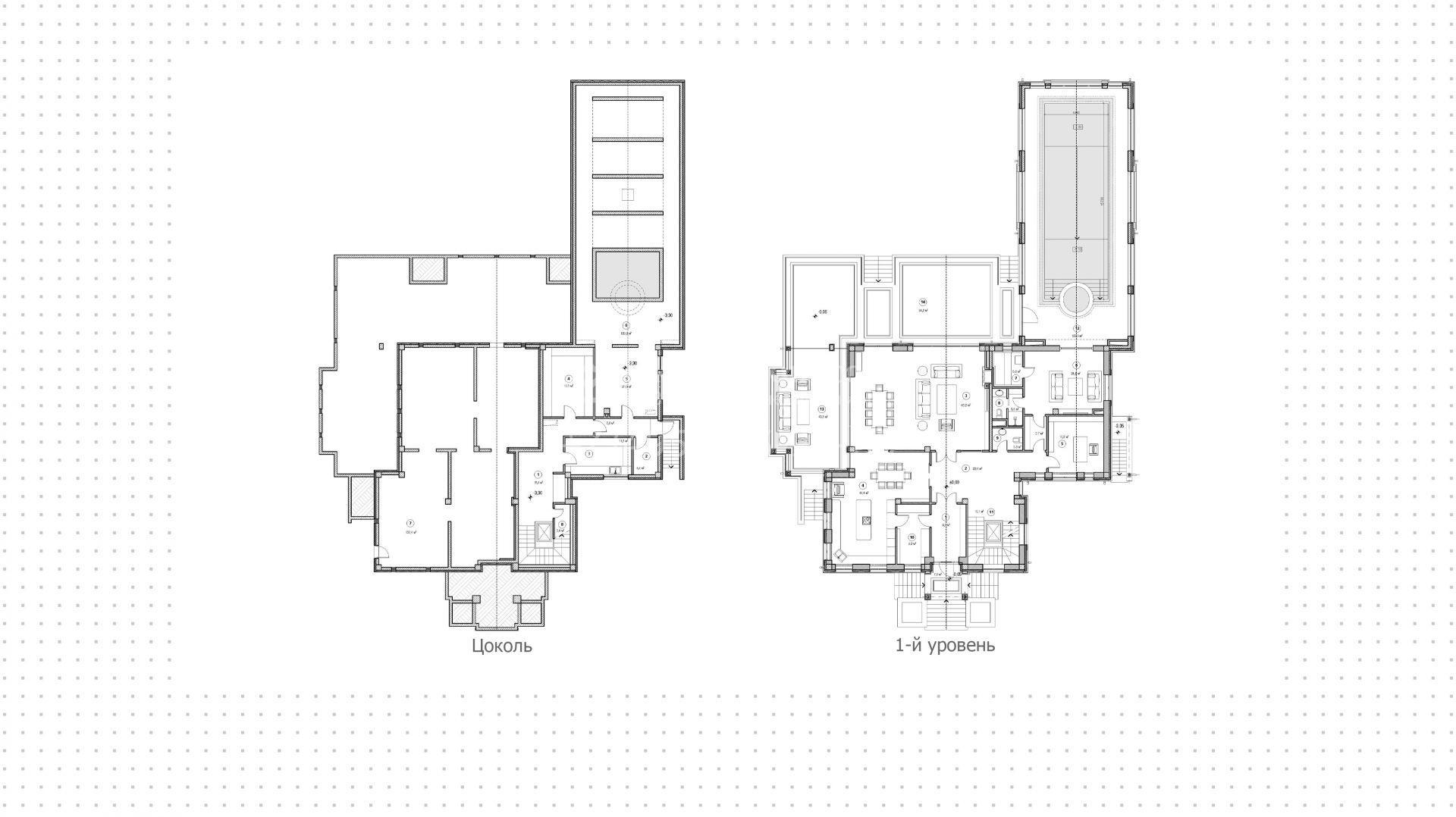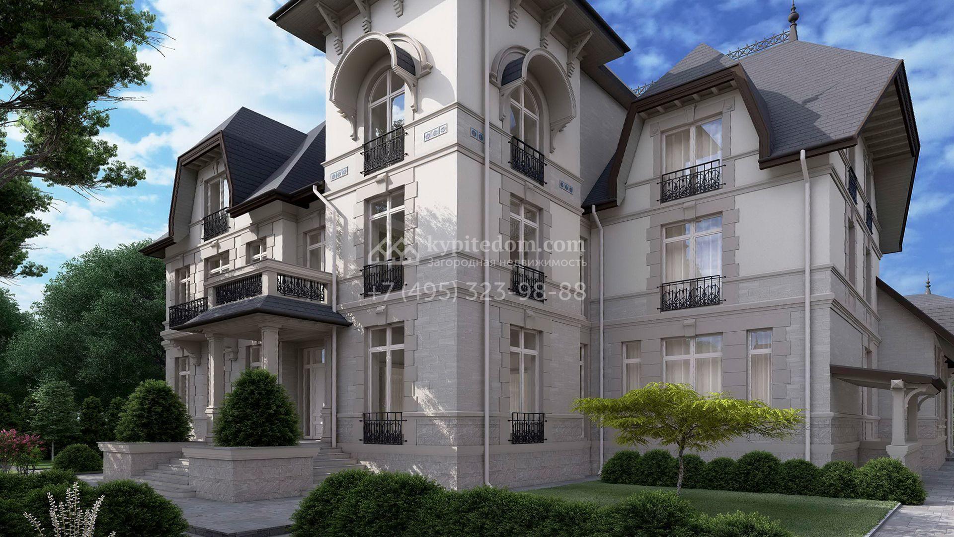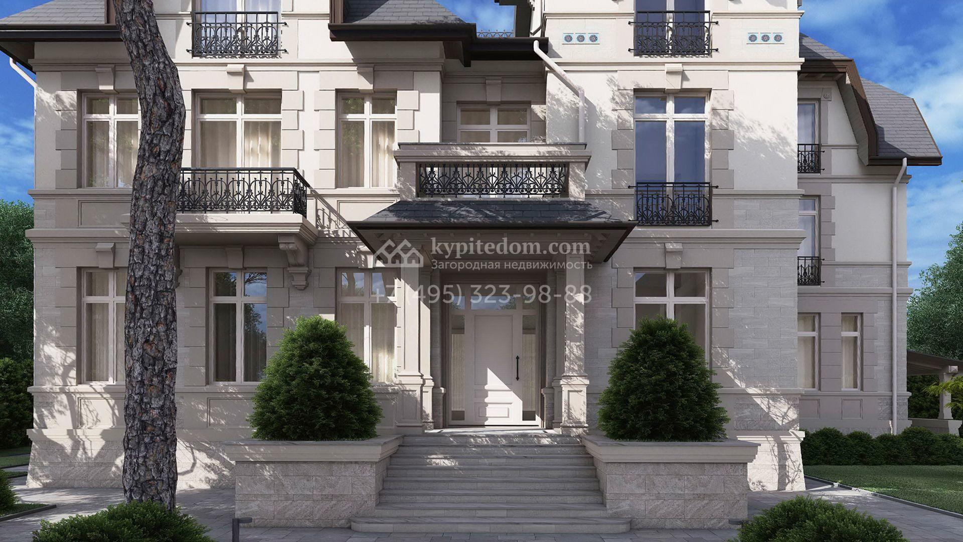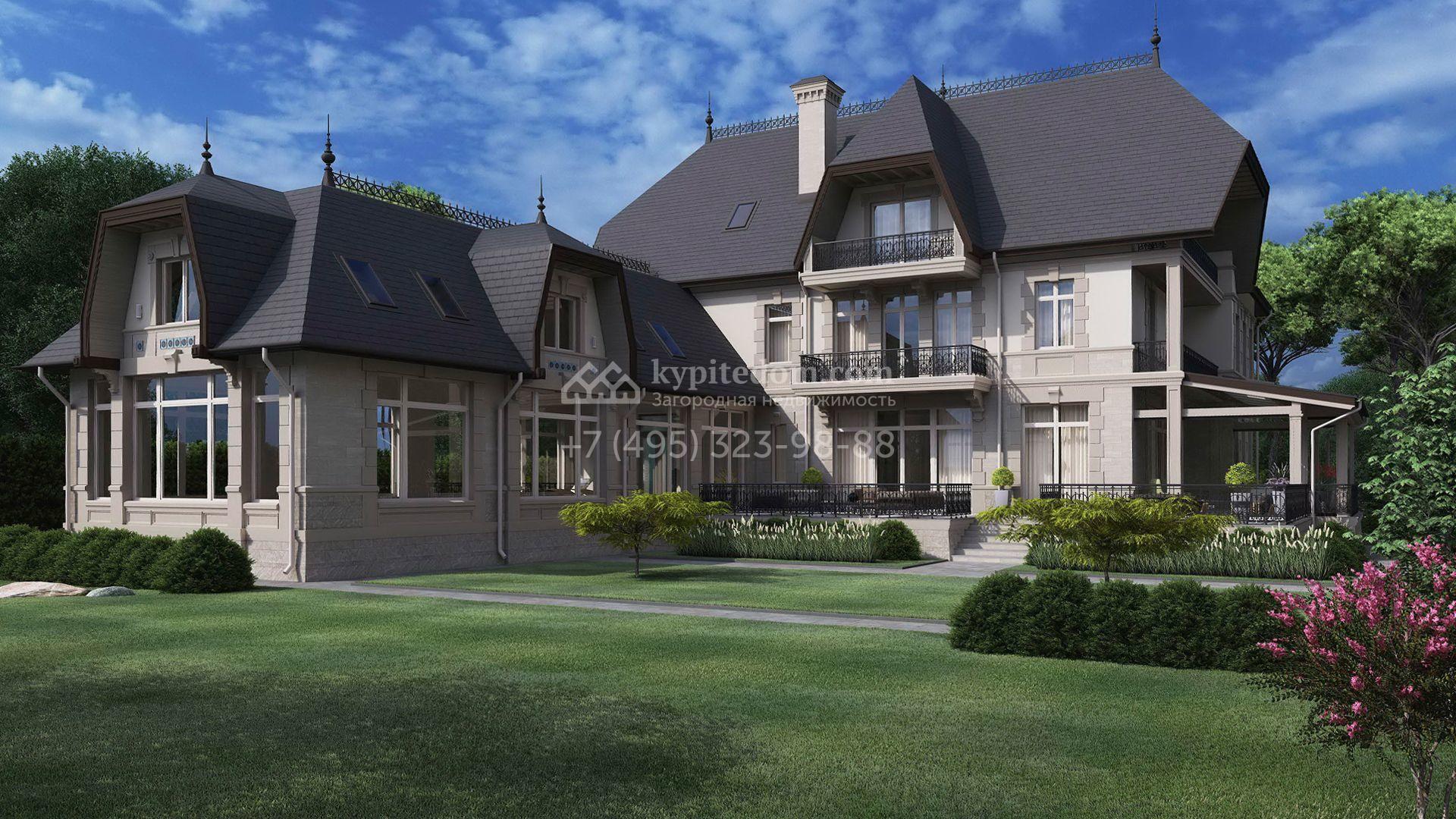 Загородная резиденция площадью 915 м² построена на просторном полевом участке 31,2 сотки. Фасад здания по проекту «Аваллон» облицован молочной штукатуркой и серым камнем. В доме без отделки спланировали 6 спален, гостиную, столовую, кухню, кабинет, комнату отдыха и SPA-зону с бассейном и сауной. Рядом расположен гараж на 2 машины с квартирой для персонала на втором этаже. На участке выполнен ландшафтный дизайн, вымощены дорожки и высажены растения, на террасе можно обустроить зону барбекю.