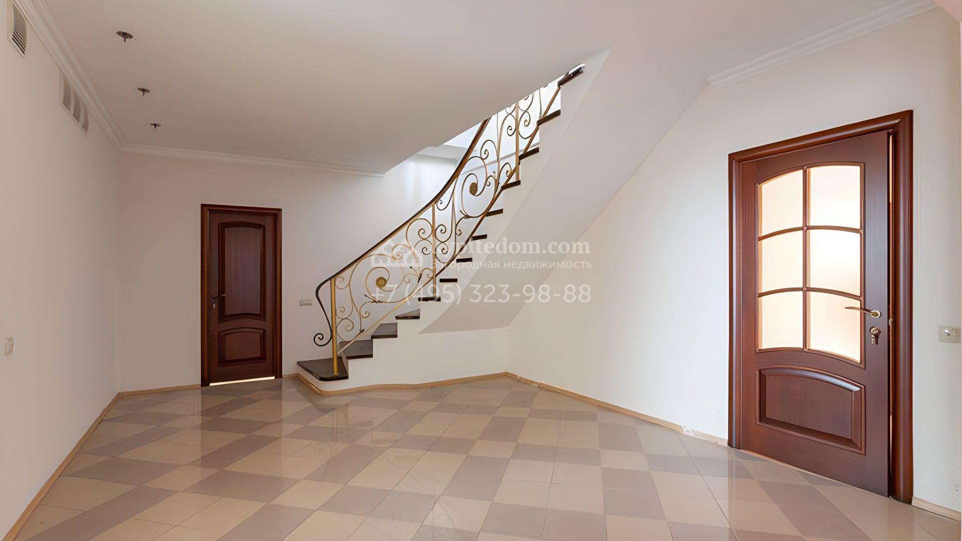 Четырехэтажный коттедж площадью 600 м² возведен на полевом участке в 21 сотку. Фасад выдержан в классическом стиле с элементами модерна, благодаря которым каждая деталь выглядит выразительно и утончённо. Красный кирпич в сочетании с белыми рустами подчеркивает вертикальные линии конструкции, добавляя ей динамику. Центральная часть акцентируется крыльцом, украшенным строгостью колонн и изысканным кованым ограждением. Темный цоколь придаёт строению ощущение монументальности и устойчивости.