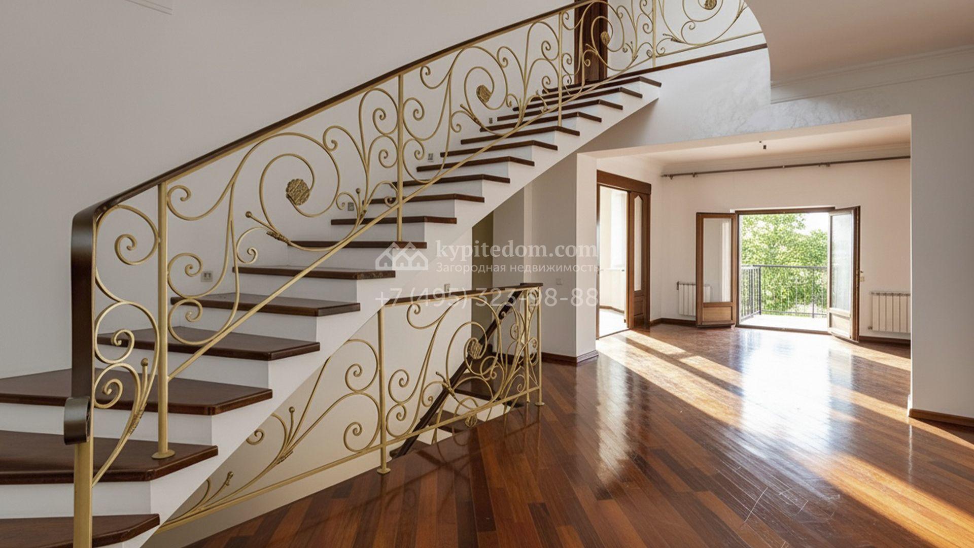 Интерьеры продолжают идею дома и оформлены с использованием светлых стен и теплых тонов. Полы с насыщенным оттенком дерева добавляют глубины и уюта, а большое количество окон обеспечивают естественное освещение. Лестница с изогнутыми металлическими перилами и деревянными ступенями привносит утонченность, а благородные цвета и качественные материалы усиливают гармоничную и цельную атмосферу.
