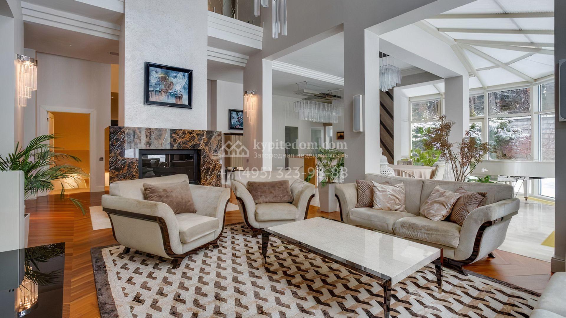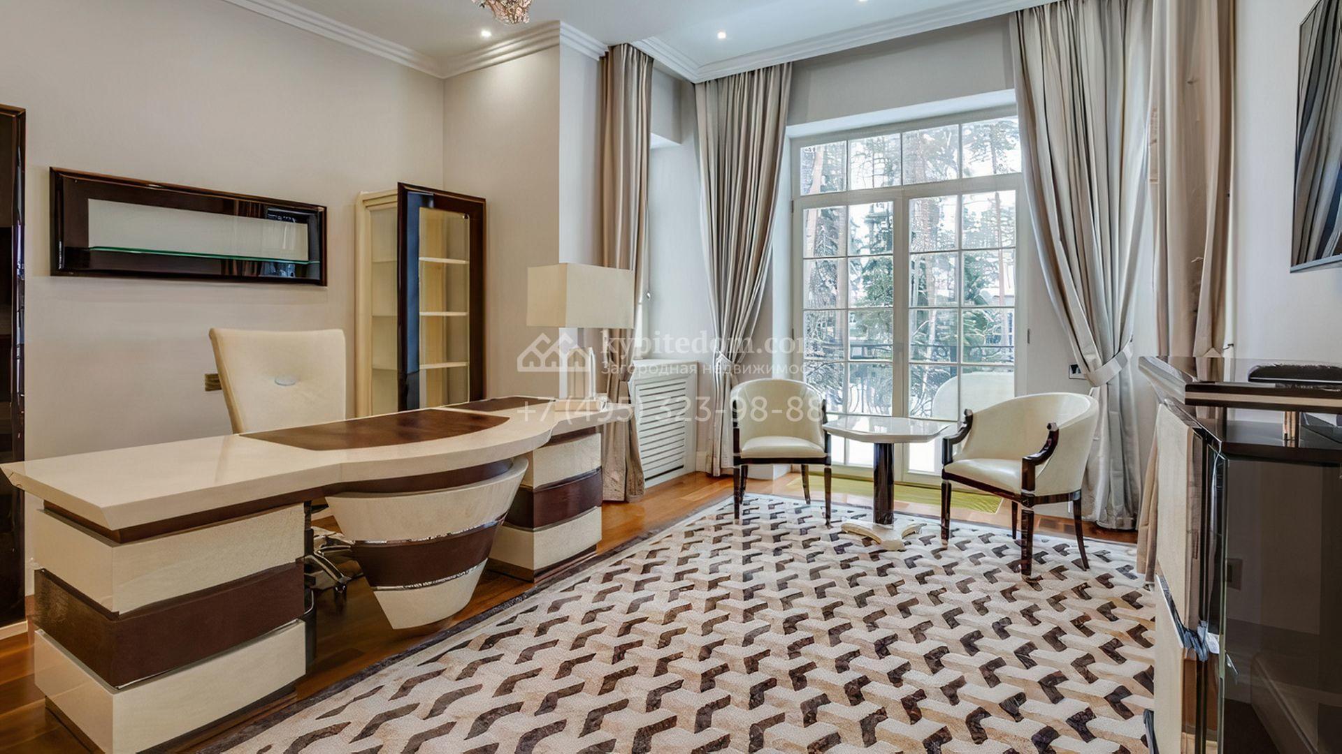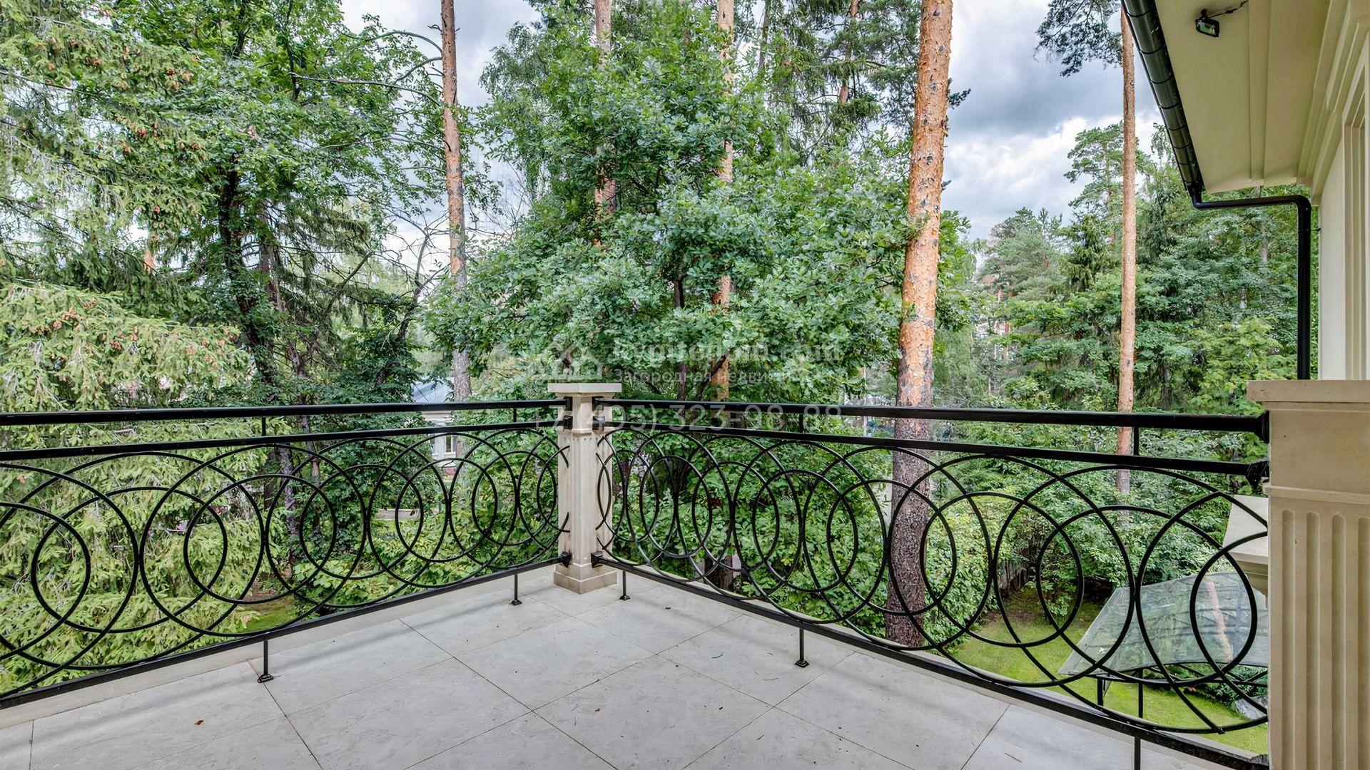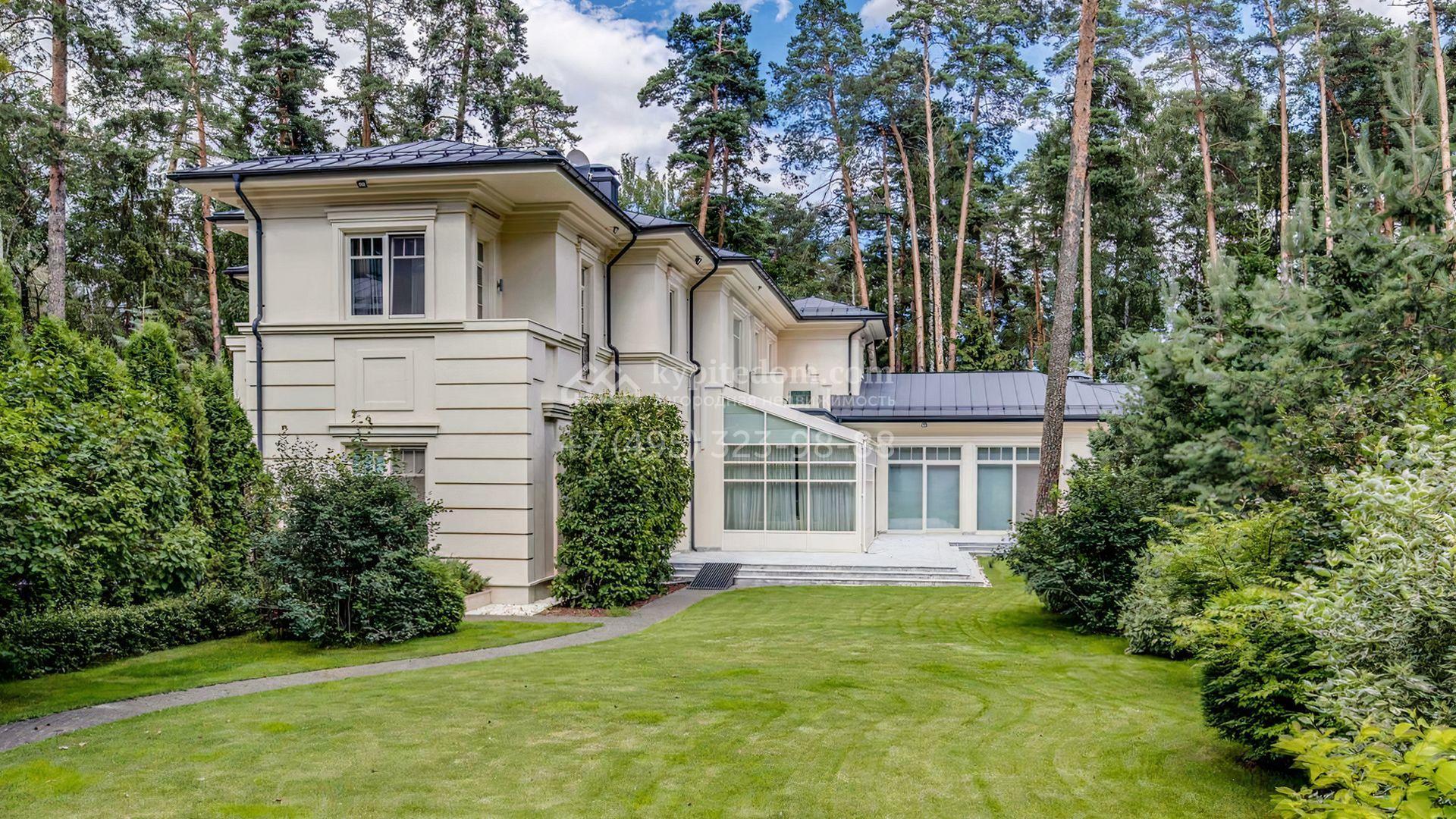 Загородная резиденция площадью 860 м² расположена на лесном участке 25 соток. Светлый фасад выполнен в неоклассическом стиле, облицован штукатуркой и декорирован колоннами, рустовкой и коваными элементами. Современный интерьер оформлен в молочно-кремовых оттенках. Планировка дома включает 6 спален, большую гостиную с камином, роялем и вторым светом, кухню, столовую, тренажерный зал, бильярдную и домашний кинотеатр. Расслабиться в конце дня можно в SPA-зоне с бассейном, сауной и хаммамом в доме или в отдельной русской бане на участке с купелью, душевой, кухней и террасой, где рядом расположен подогреваемый открытый бассейн. На территории с ландшафтным дизайном построен гараж на 2 машины с квартирой для персонала.