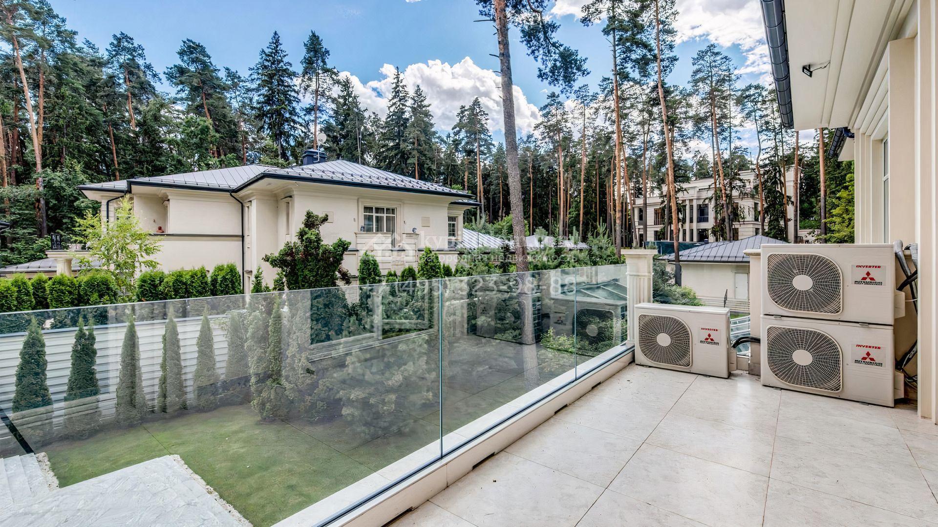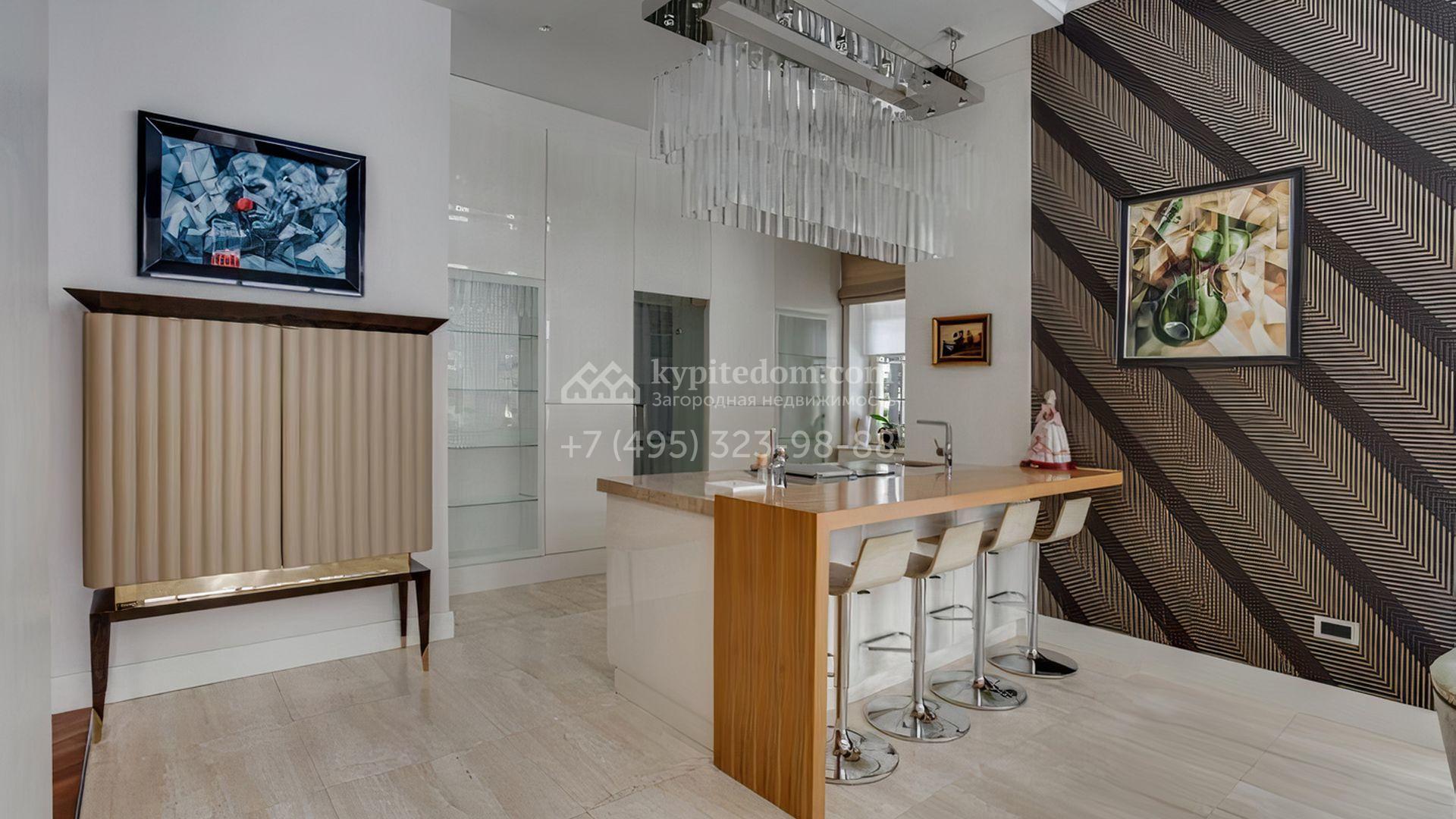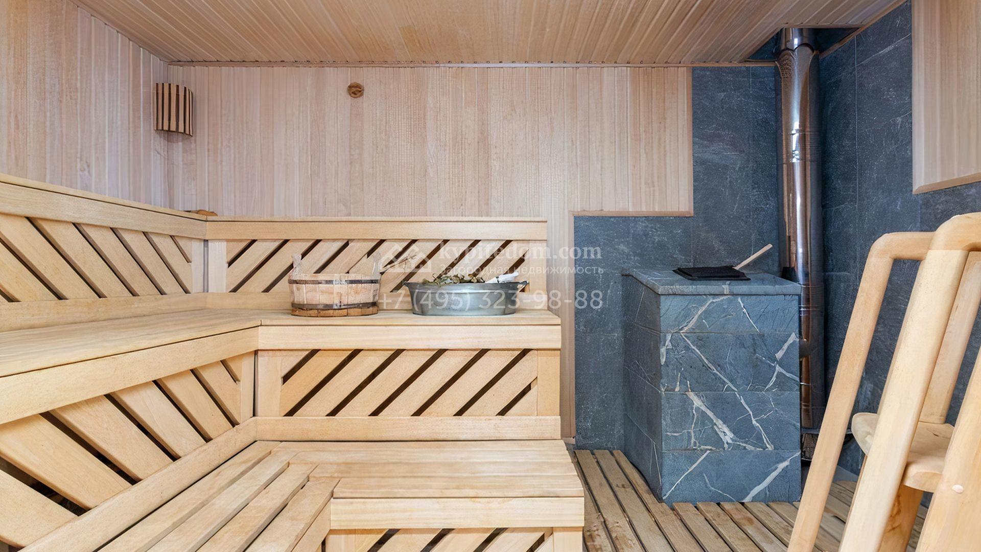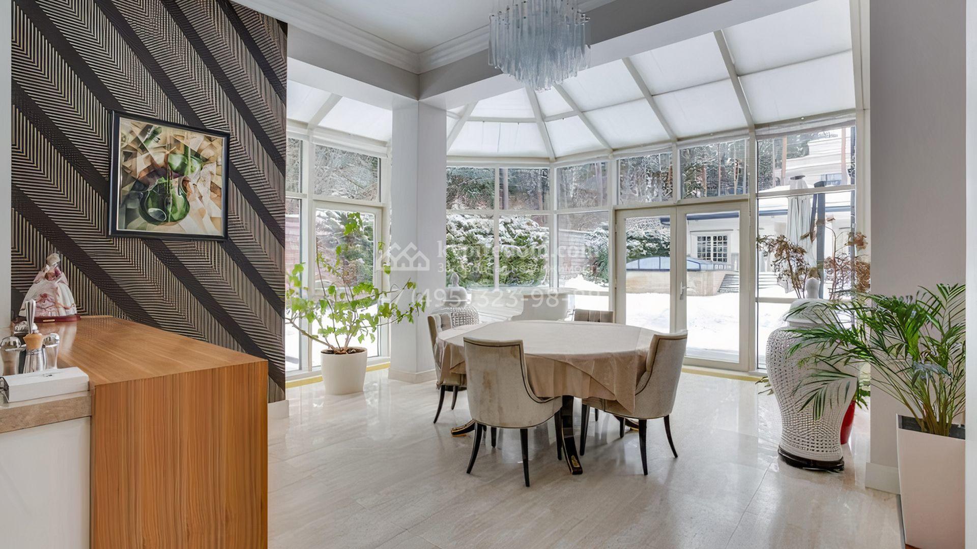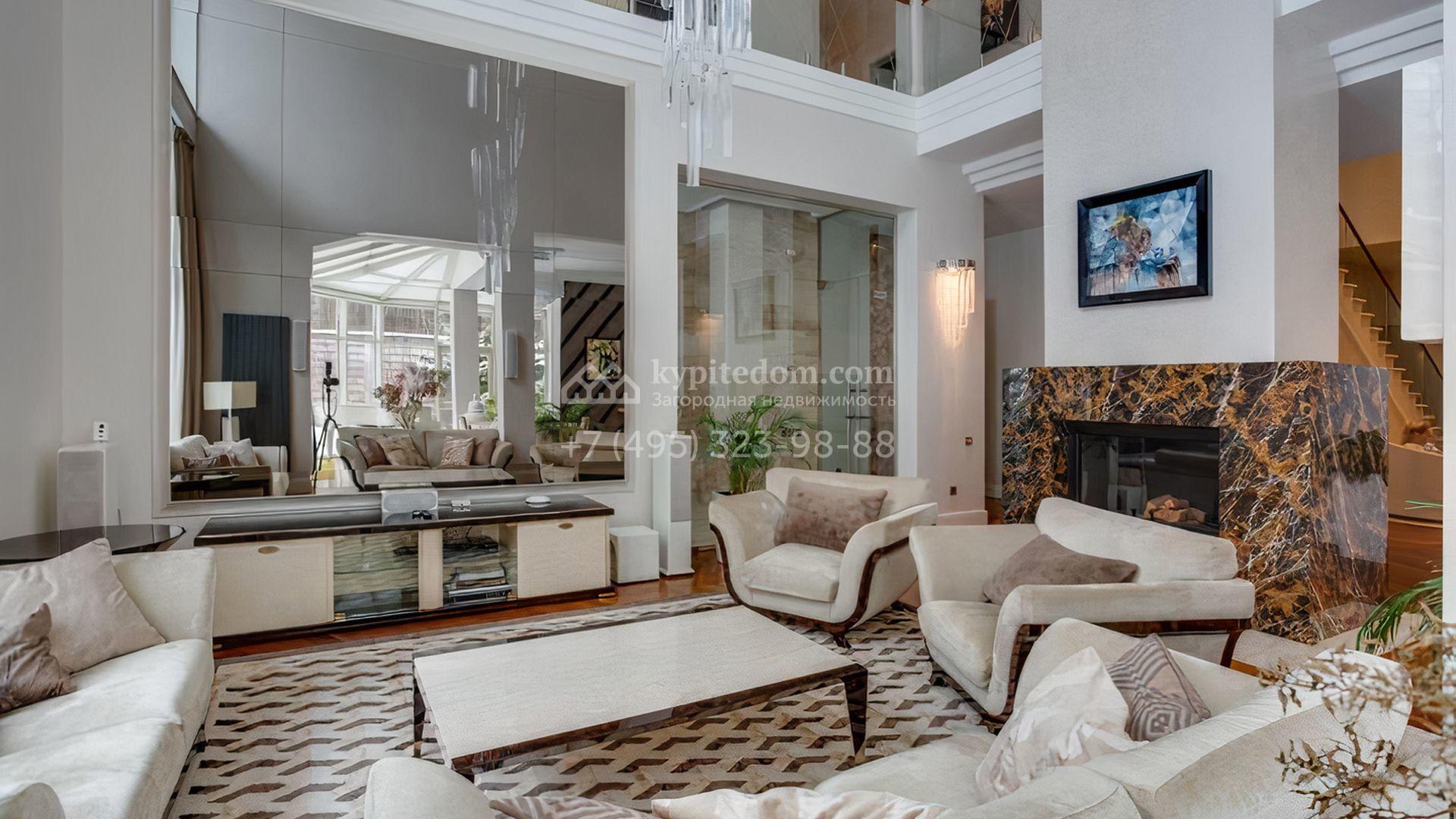Загородная резиденция площадью 860 м² расположена на лесном участке 25 соток. Светлый фасад выполнен в неоклассическом стиле, облицован штукатуркой и декорирован колоннами, рустовкой и коваными элементами. Современный интерьер оформлен в молочно-кремовых оттенках. Планировка дома включает 6 спален, большую гостиную с камином, роялем и вторым светом, кухню, столовую, тренажерный зал, бильярдную и домашний кинотеатр. Расслабиться в конце дня можно в SPA-зоне с бассейном, сауной и хаммамом в доме или в отдельной русской бане на участке с купелью, душевой, кухней и террасой, где рядом расположен подогреваемый открытый бассейн. На территории с ландшафтным дизайном построен гараж на 2 машины с квартирой для персонала.