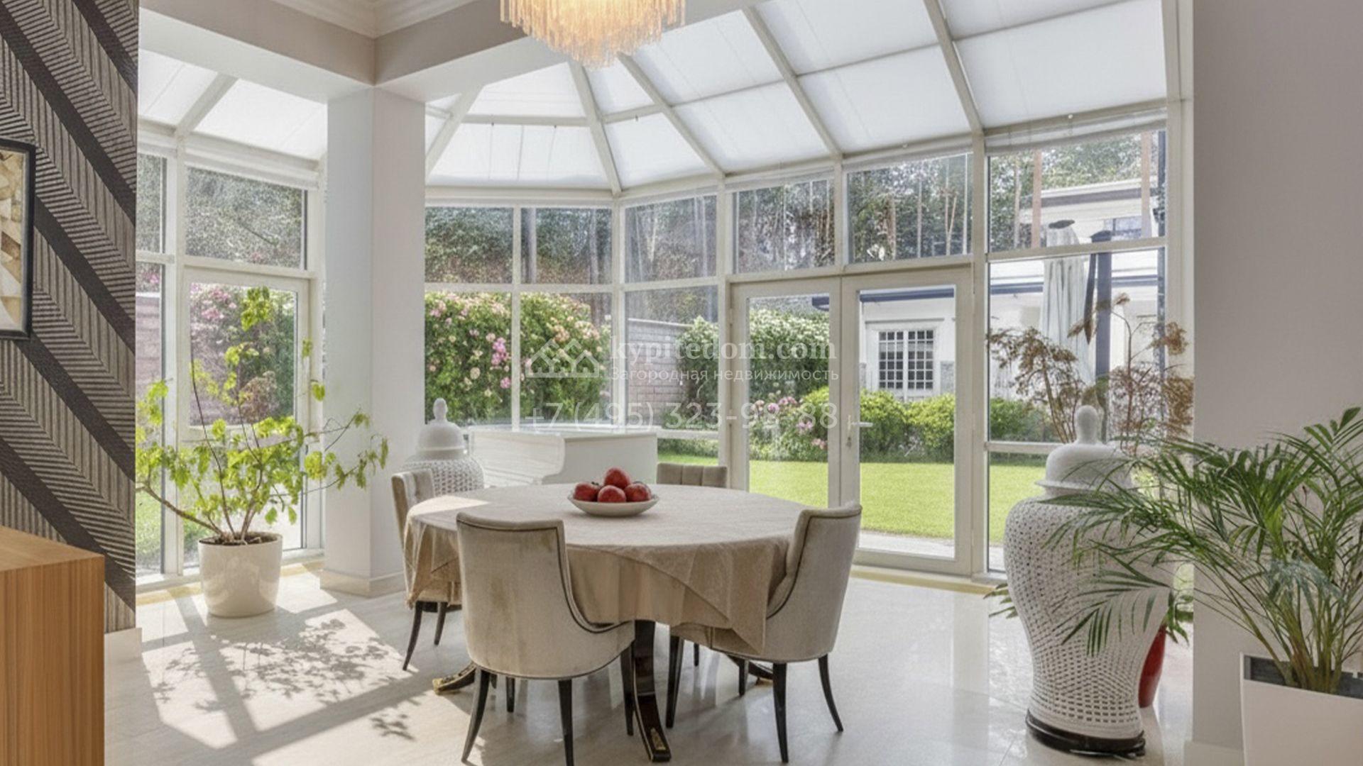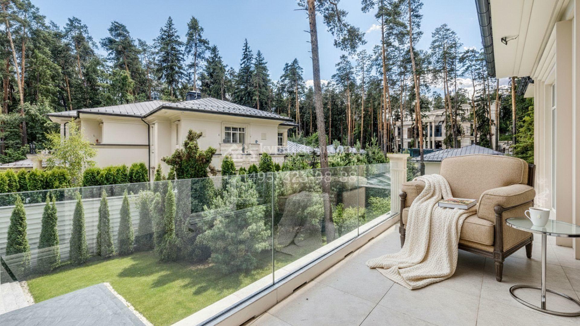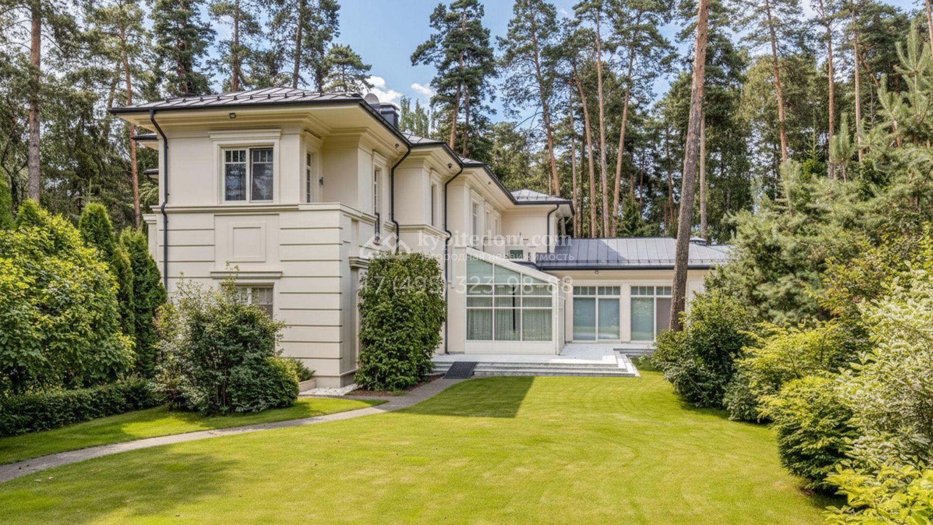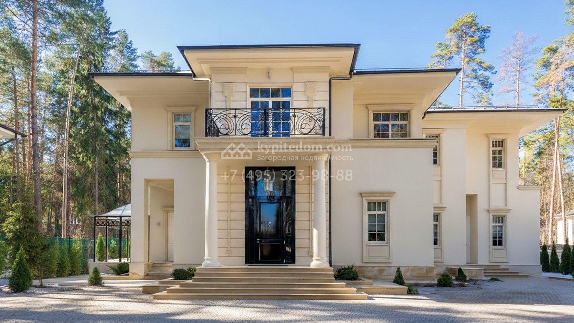 Загородная резиденция площадью 860 м² расположена на лесном участке 25 соток. Светлый фасад выполнен в неоклассическом стиле, облицован штукатуркой и декорирован колоннами, рустовкой и коваными элементами. Современный интерьер оформлен в молочно-кремовых оттенках. Планировка дома включает 6 спален, большую гостиную с камином, роялем и вторым светом, кухню, столовую, тренажерный зал, бильярдную и домашний кинотеатр. Расслабиться в конце дня можно в спа-зоне с бассейном, сауной и хаммамом в доме или в отдельной русской бане на участке с купелью, душевой, кухней и террасой, где рядом расположен подогреваемый открытый бассейн. На территории с ландшафтным дизайном построен гараж на две машины с квартирой для персонала.