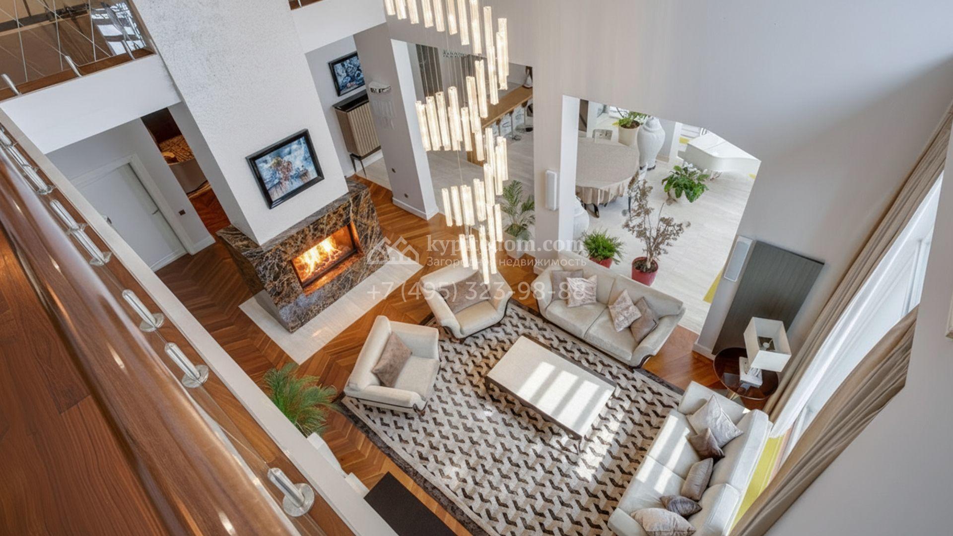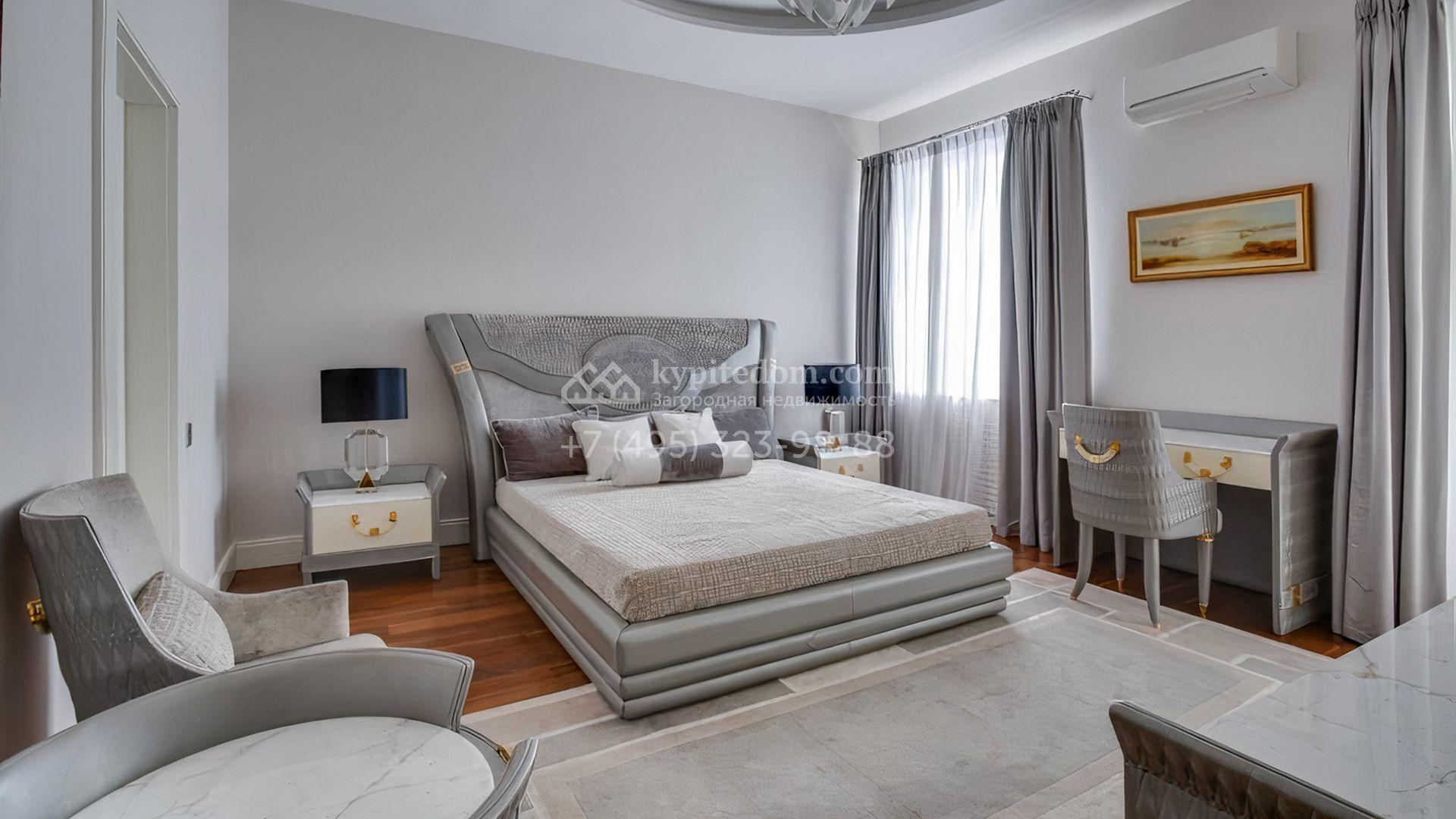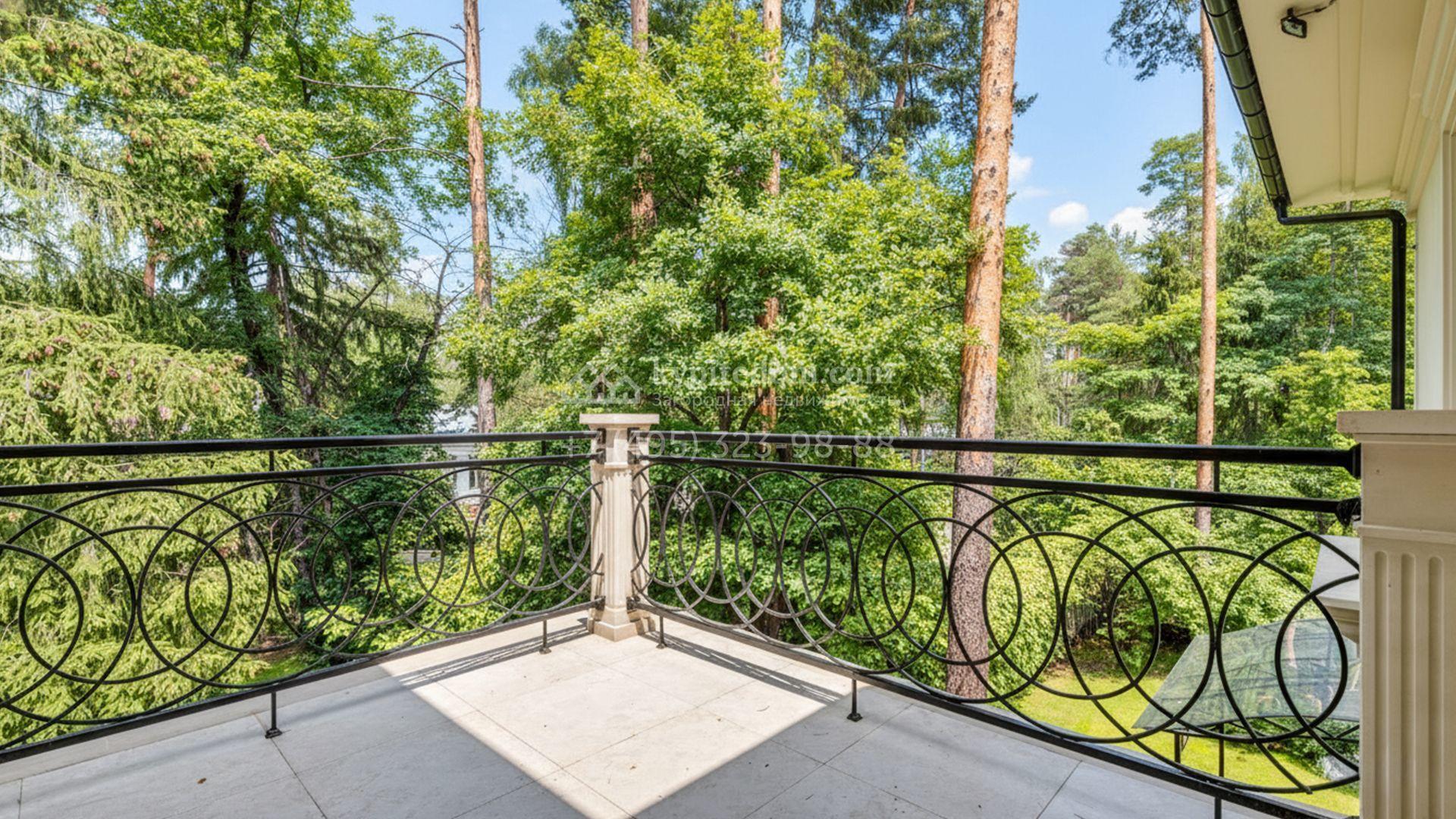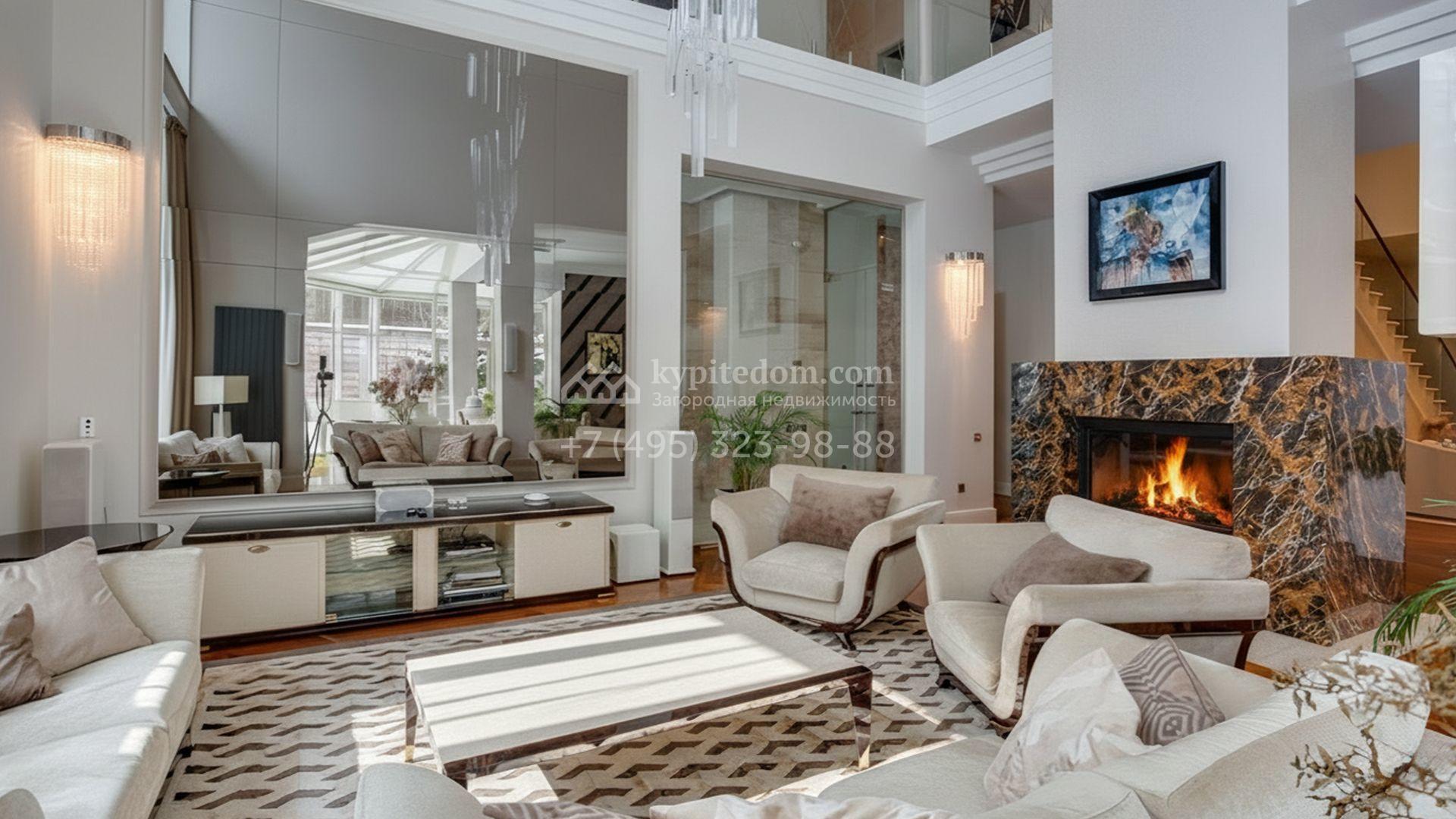 Загородная резиденция площадью 860 м² расположена на лесном участке 25 соток. Светлый фасад выполнен в неоклассическом стиле, облицован штукатуркой и декорирован колоннами, рустовкой и коваными элементами. Современный интерьер оформлен в молочно-кремовых оттенках. Планировка дома включает 6 спален, большую гостиную с камином, роялем и вторым светом, кухню, столовую, тренажерный зал, бильярдную и домашний кинотеатр. Расслабиться в конце дня можно в спа-зоне с бассейном, сауной и хаммамом в доме или в отдельной русской бане на участке с купелью, душевой, кухней и террасой, где рядом расположен подогреваемый открытый бассейн. На территории с ландшафтным дизайном построен гараж на две машины с квартирой для персонала.