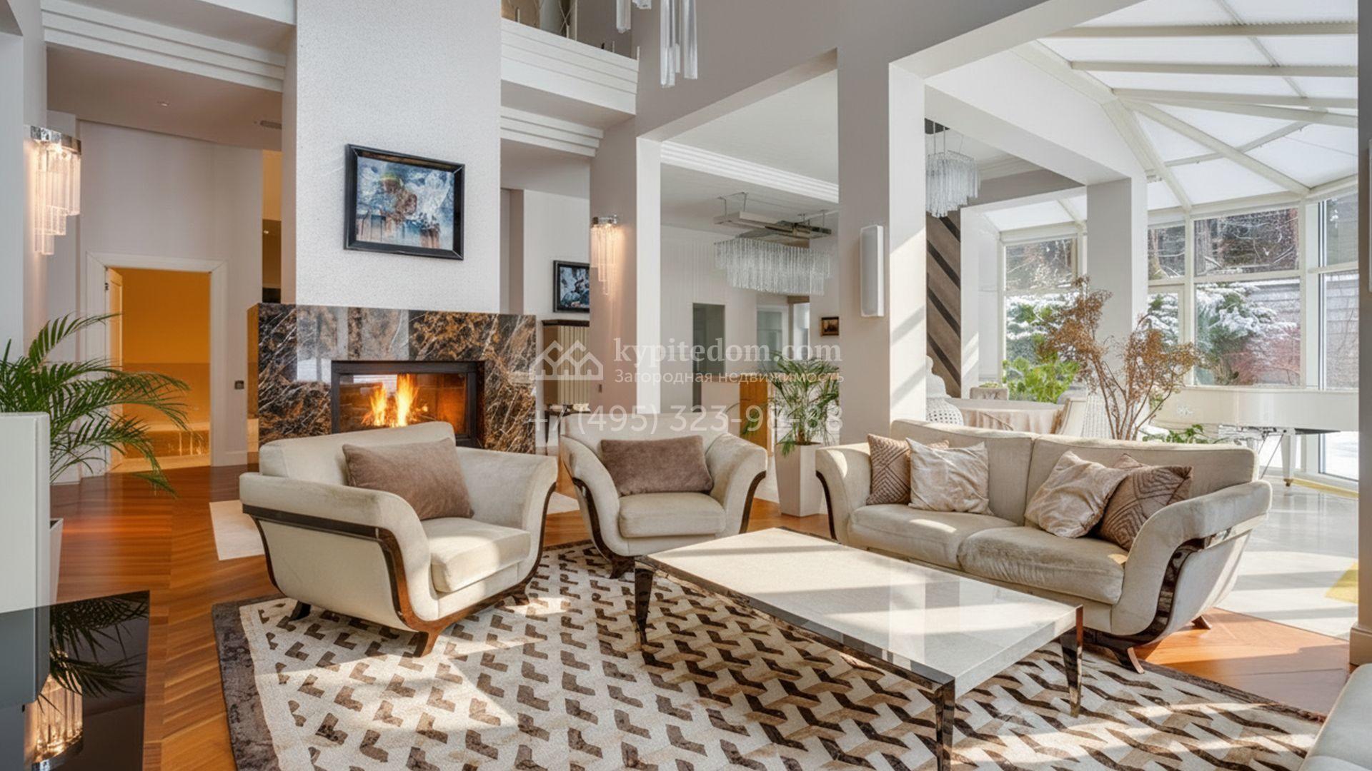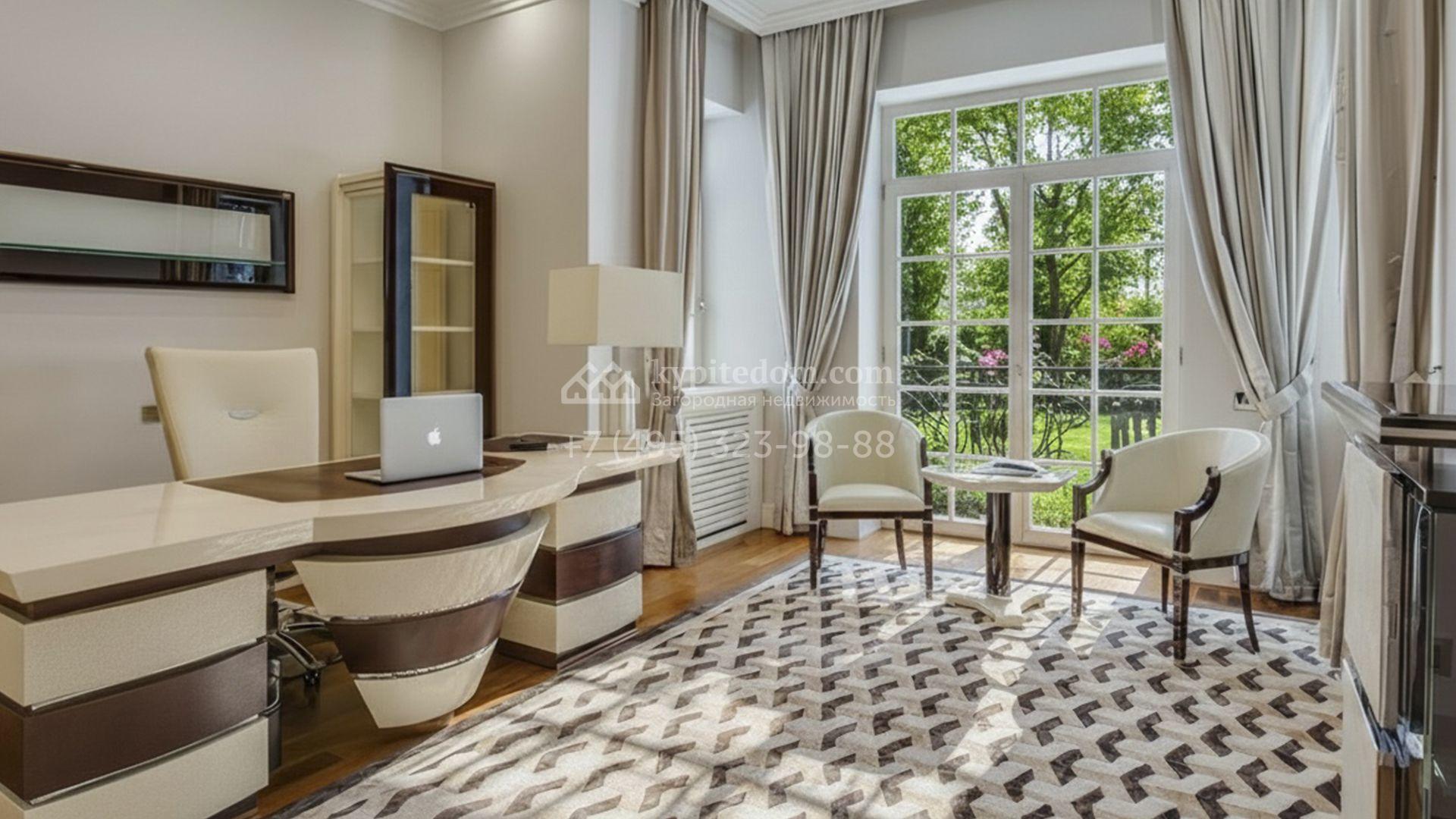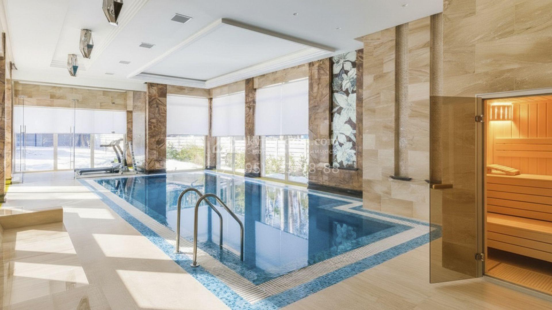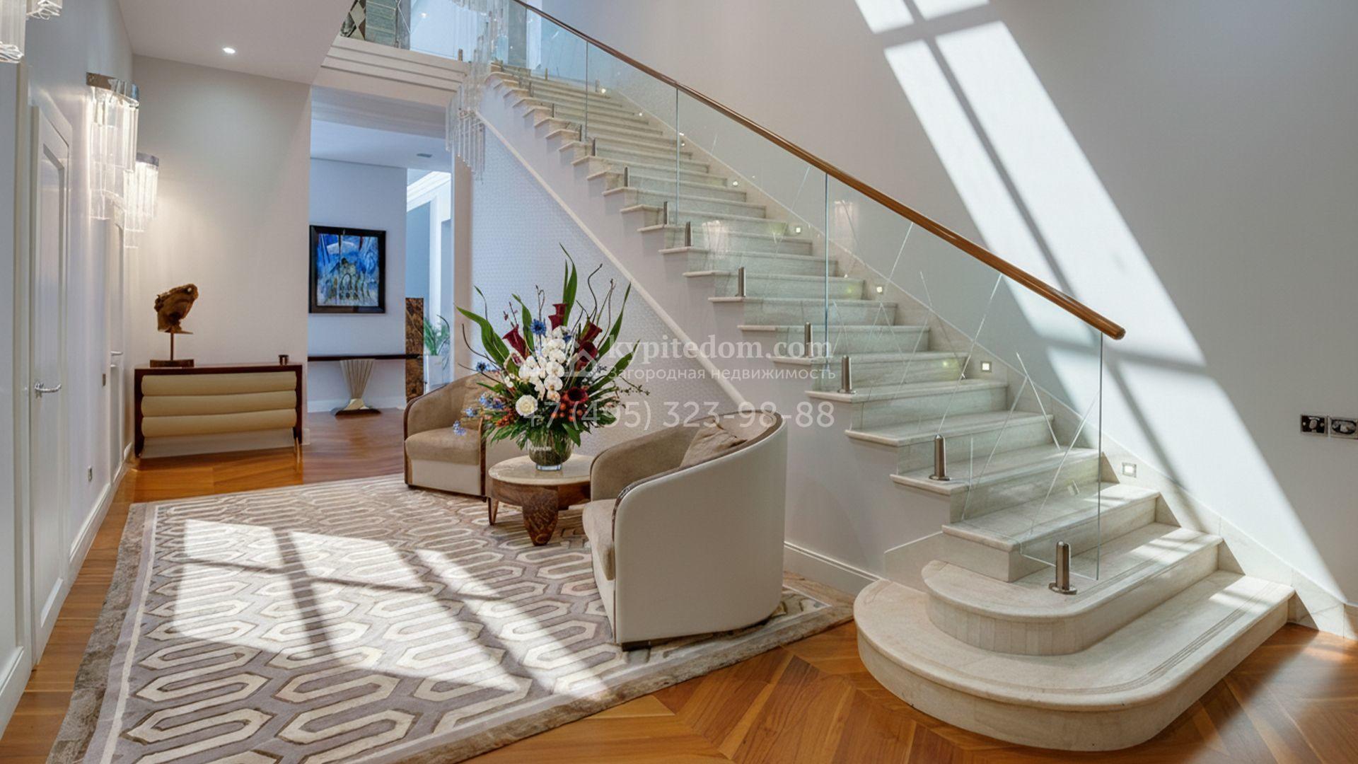 Загородная резиденция площадью 860 м² расположена на лесном участке 25 соток. Светлый фасад выполнен в неоклассическом стиле, облицован штукатуркой и декорирован колоннами, рустовкой и коваными элементами. Современный интерьер оформлен в молочно-кремовых оттенках. Планировка дома включает 6 спален, большую гостиную с камином, роялем и вторым светом, кухню, столовую, тренажерный зал, бильярдную и домашний кинотеатр. Расслабиться в конце дня можно в спа-зоне с бассейном, сауной и хаммамом в доме или в отдельной русской бане на участке с купелью, душевой, кухней и террасой, где рядом расположен подогреваемый открытый бассейн. На территории с ландшафтным дизайном построен гараж на две машины с квартирой для персонала.