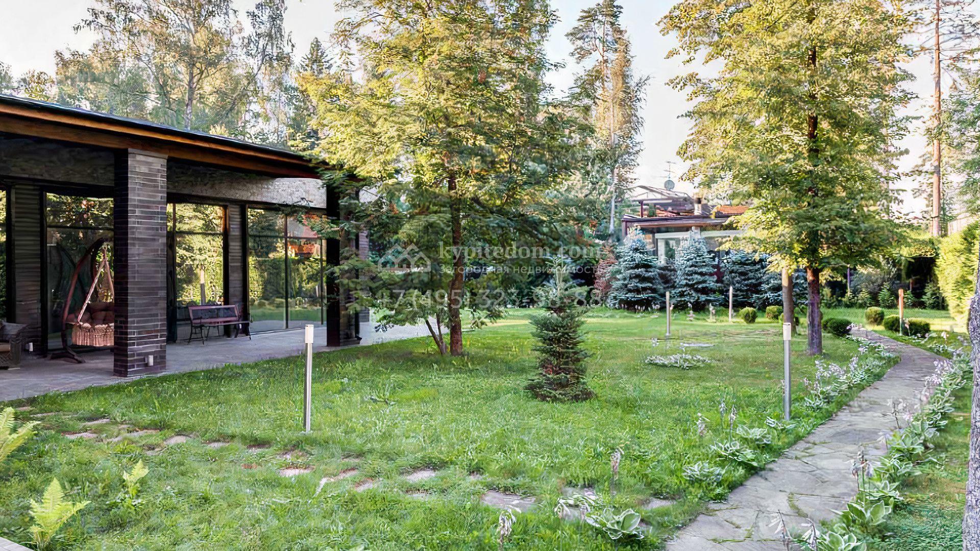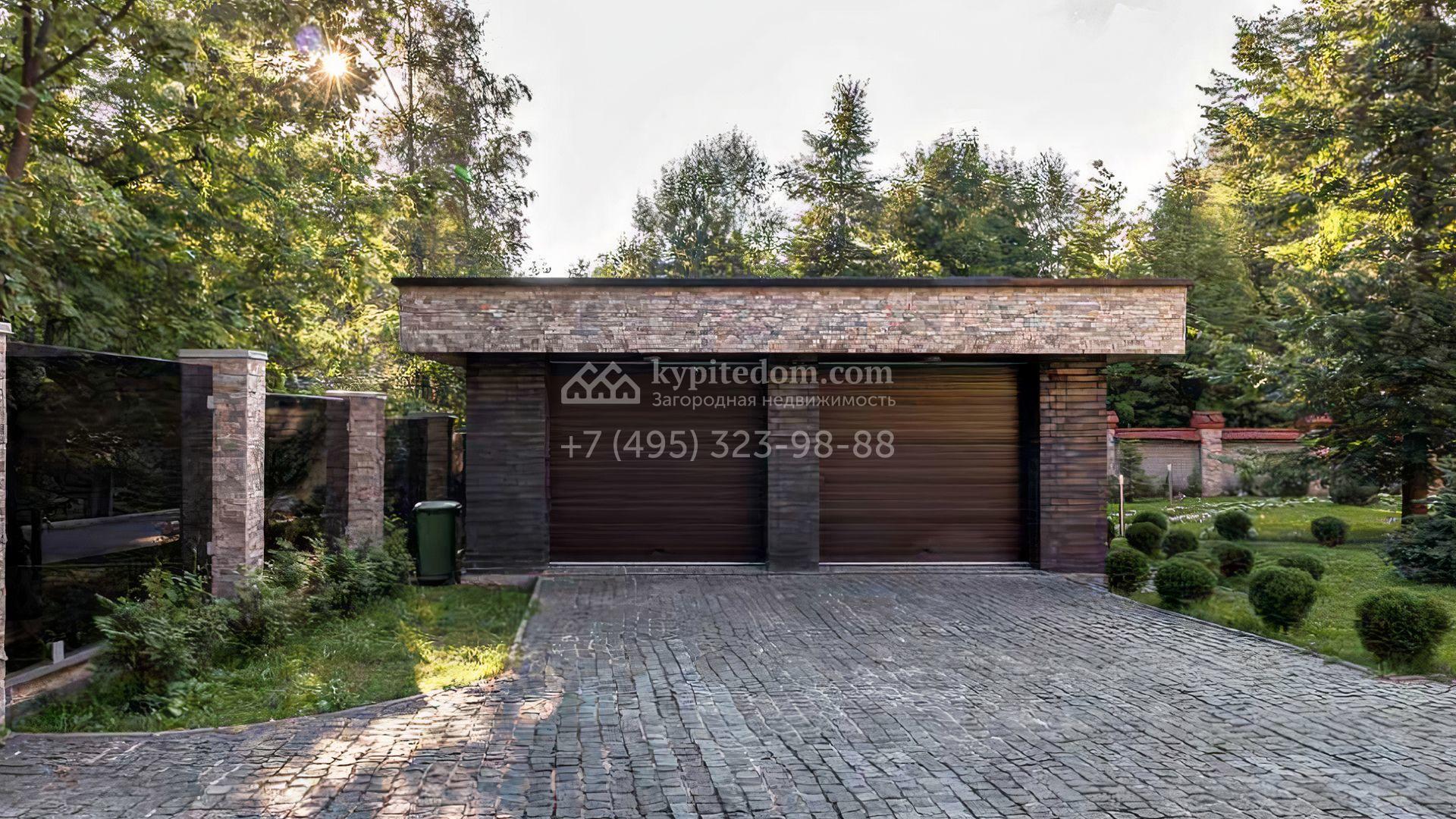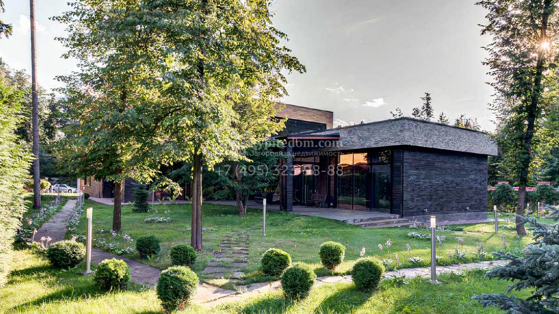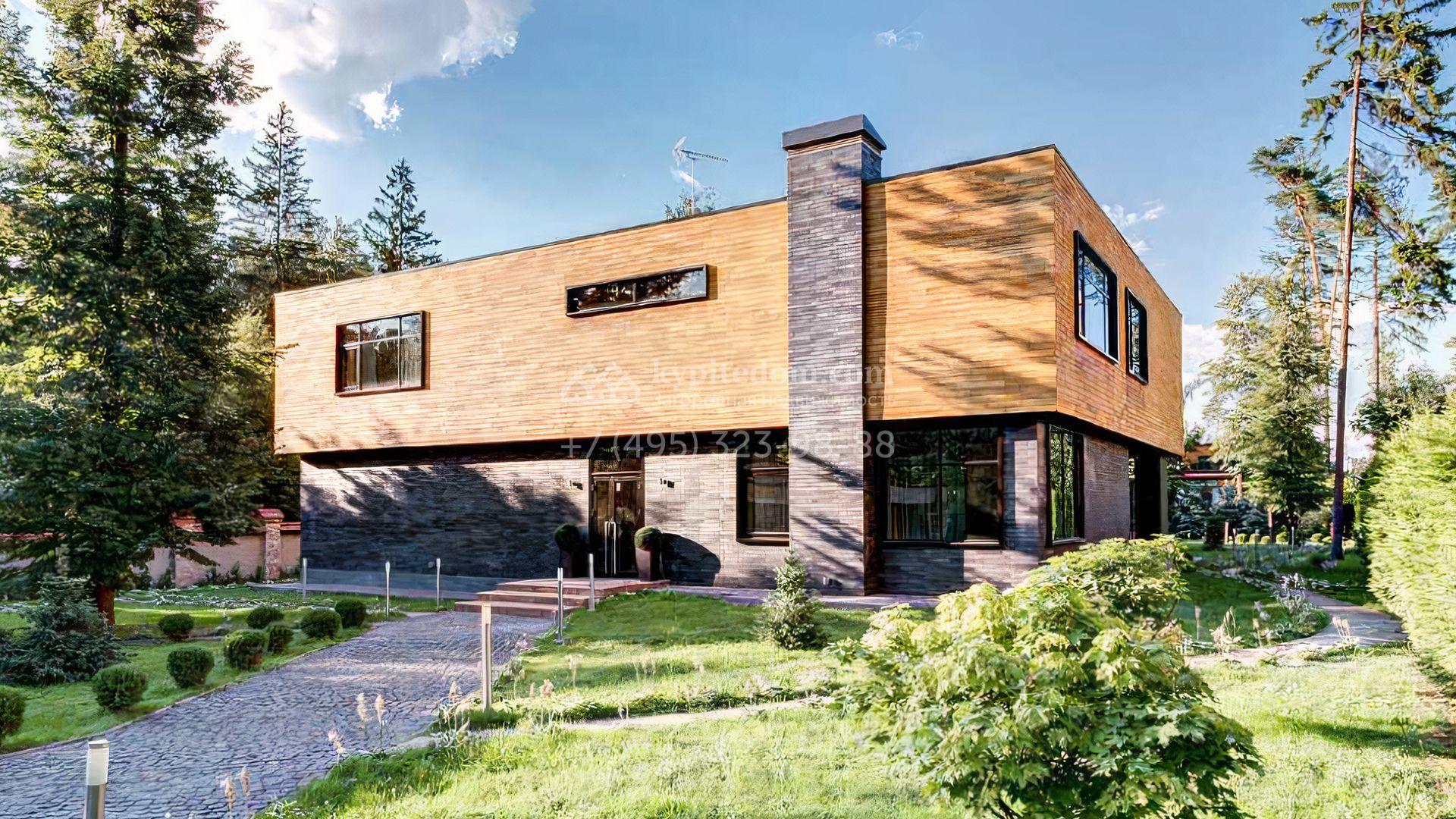 Загородный дом площадью 640 м² расположен на просторном лесном участке 25 соток. Фасад в современном стиле облицован темно-серой плиткой и деревом. Интерьер выдержан в теплых оттенках, создающих атмосферу уюта и тепла, установлена мебель. В коттедже разместили 3 спальни, гостиную, кухню-столовую, кабинет, бассейн и сауну. На участке выполнен ландшафтный дизайн, построен гараж на 2 машины, вымощены дорожки и установлено уличное освещение.