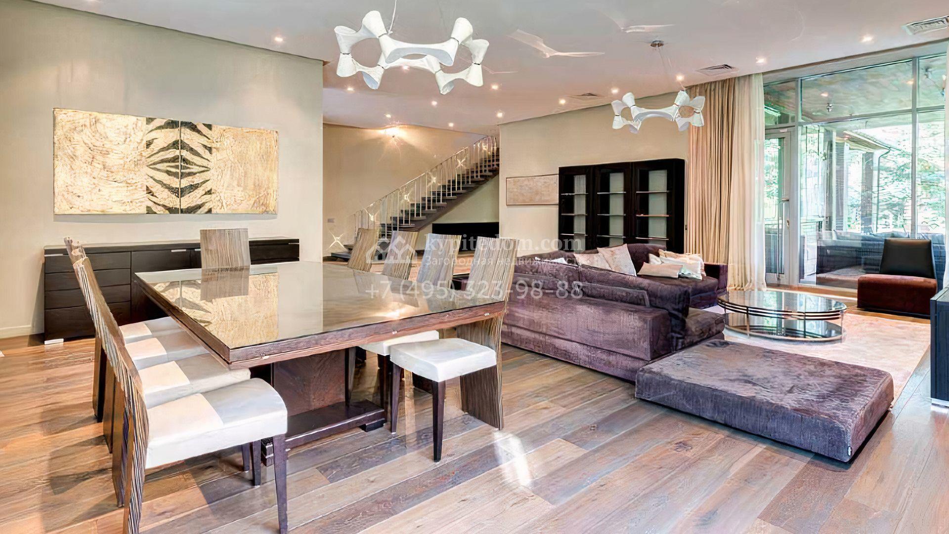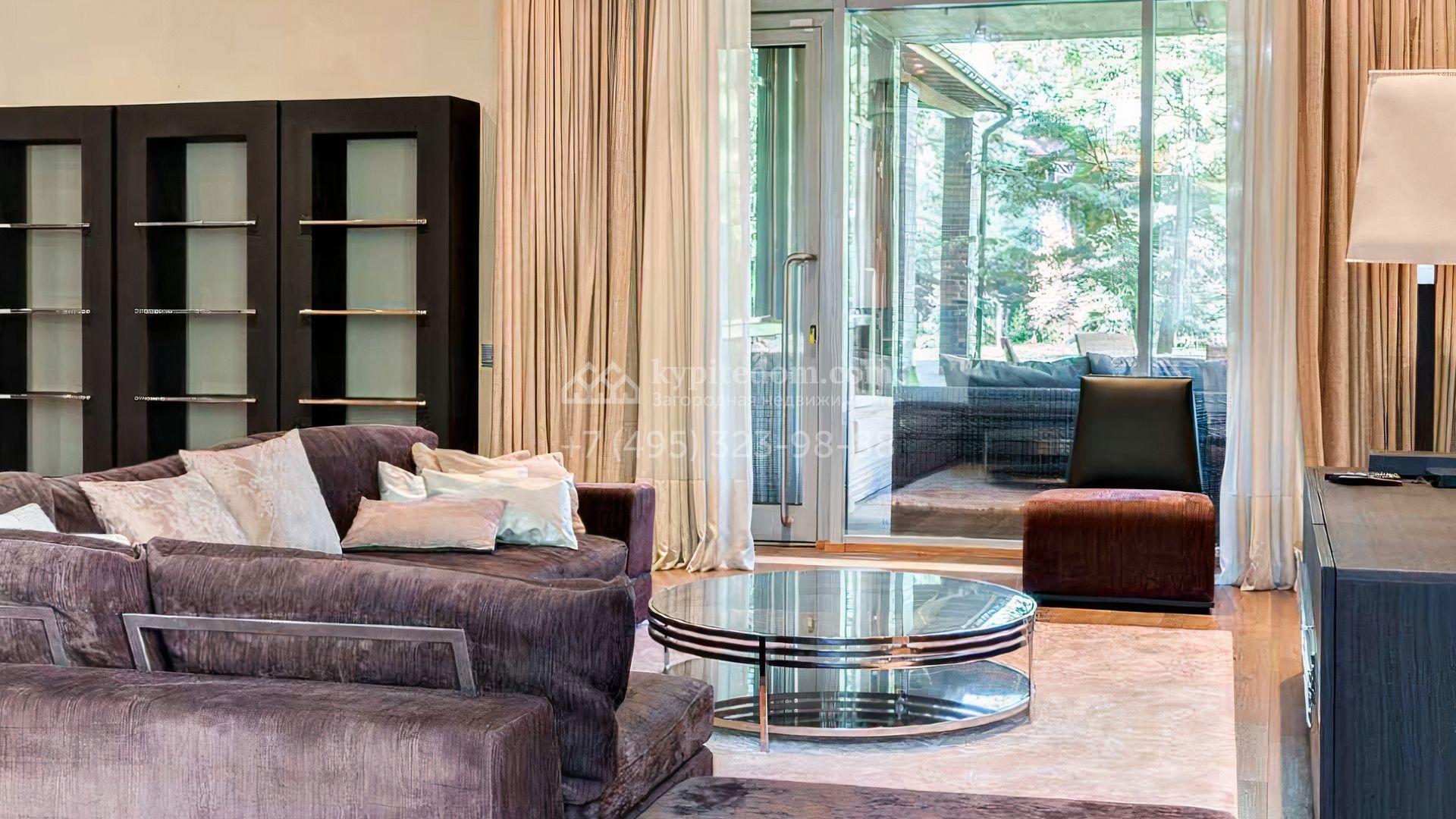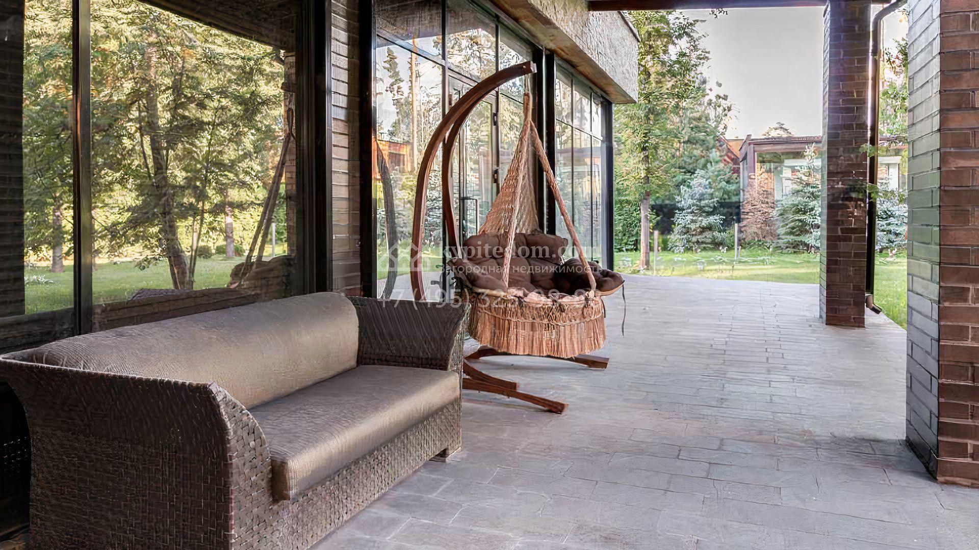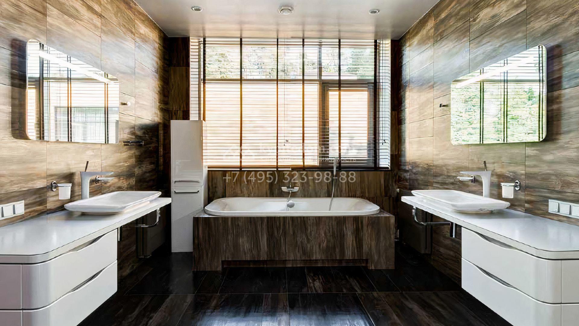 Загородный дом площадью 640 м² расположен на просторном лесном участке 25 соток. Фасад в современном стиле облицован темно-серой плиткой и деревом. Интерьер выдержан в теплых оттенках, создающих атмосферу уюта и тепла, установлена мебель. В коттедже разместили 3 спальни, гостиную, кухню-столовую, кабинет, бассейн и сауну. На участке выполнен ландшафтный дизайн, построен гараж на 2 машины, вымощены дорожки и установлено уличное освещение.