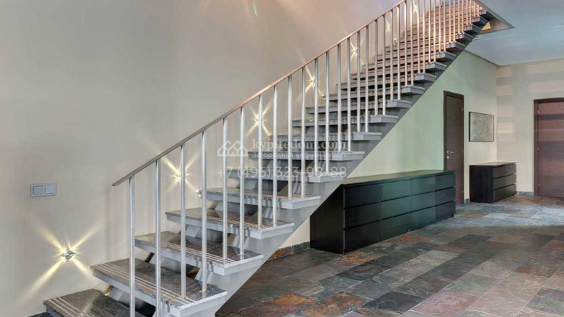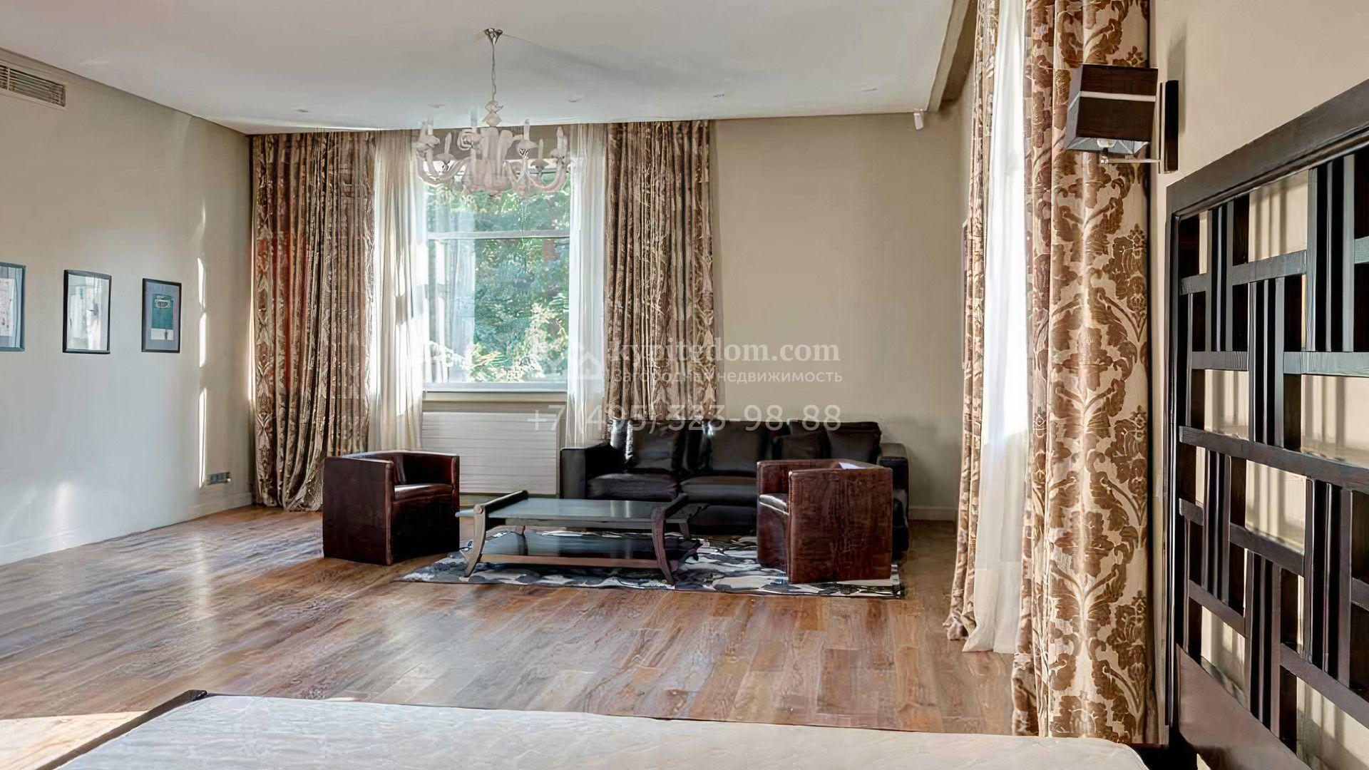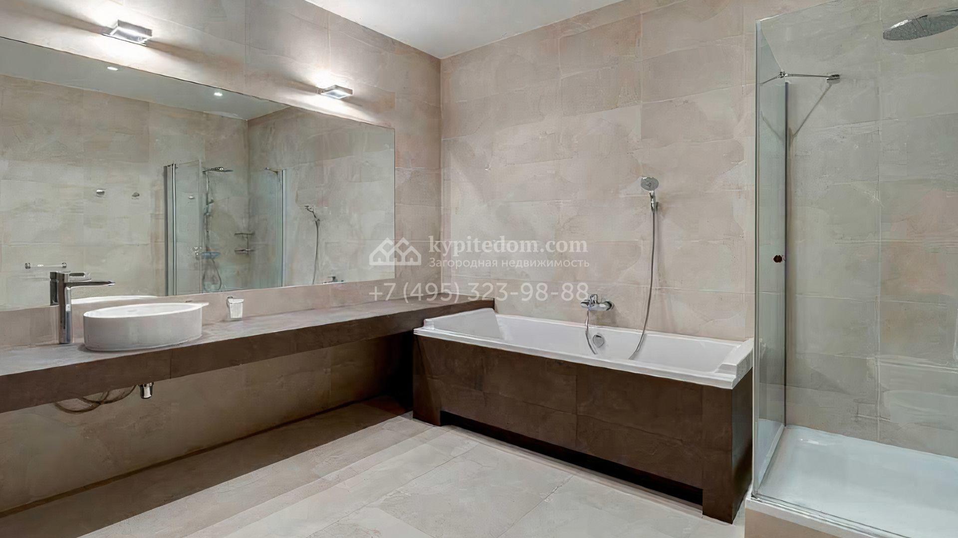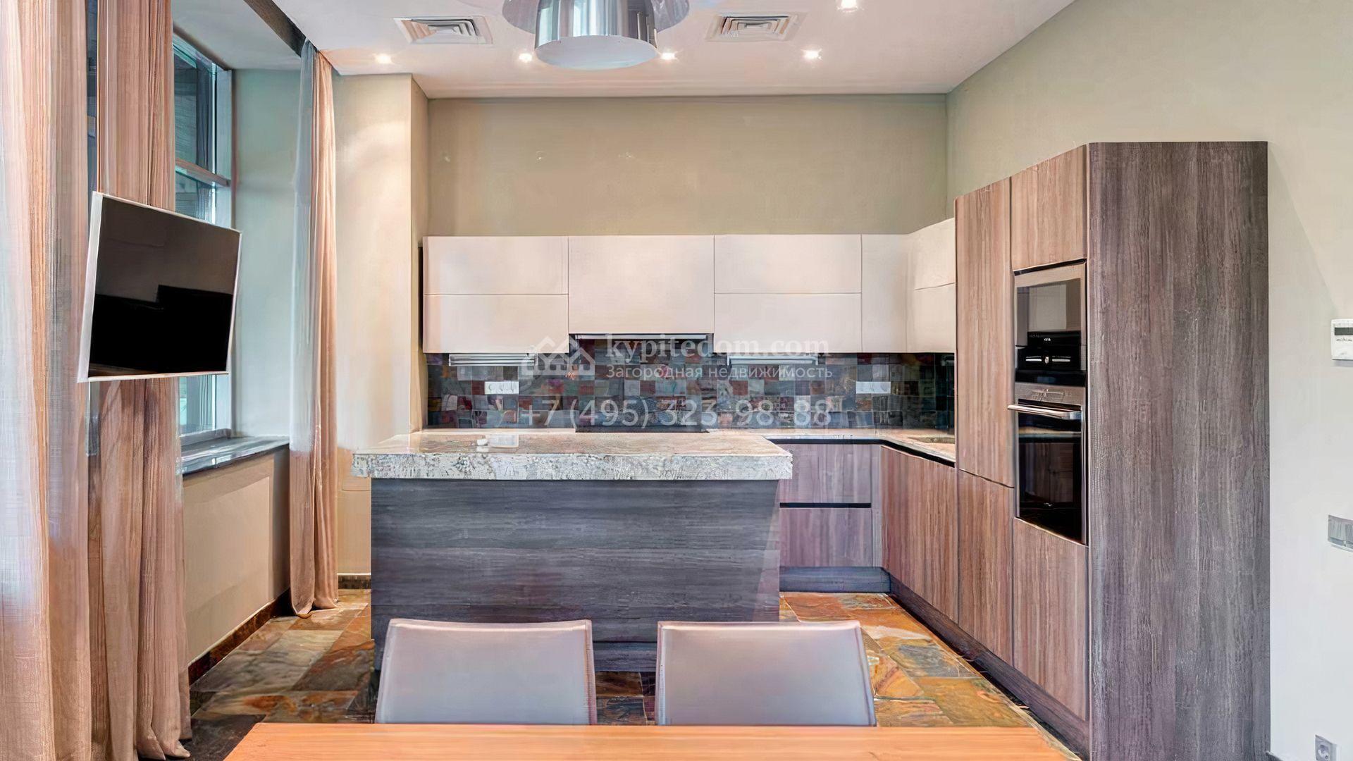 Загородный дом площадью 640 м² расположен на просторном лесном участке 25 соток. Фасад в современном стиле облицован темно-серой плиткой и деревом. Интерьер выдержан в теплых оттенках, создающих атмосферу уюта и тепла, установлена мебель. В коттедже разместили 3 спальни, гостиную, кухню-столовую, кабинет, бассейн и сауну. На участке выполнен ландшафтный дизайн, построен гараж на 2 машины, вымощены дорожки и установлено уличное освещение.