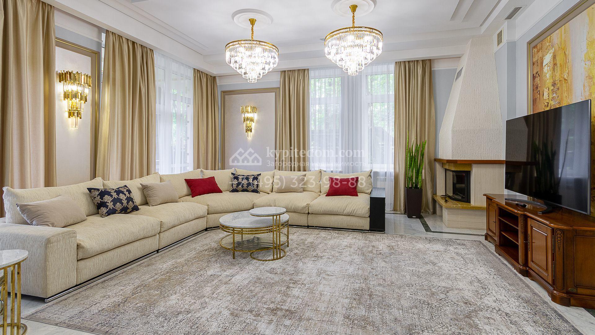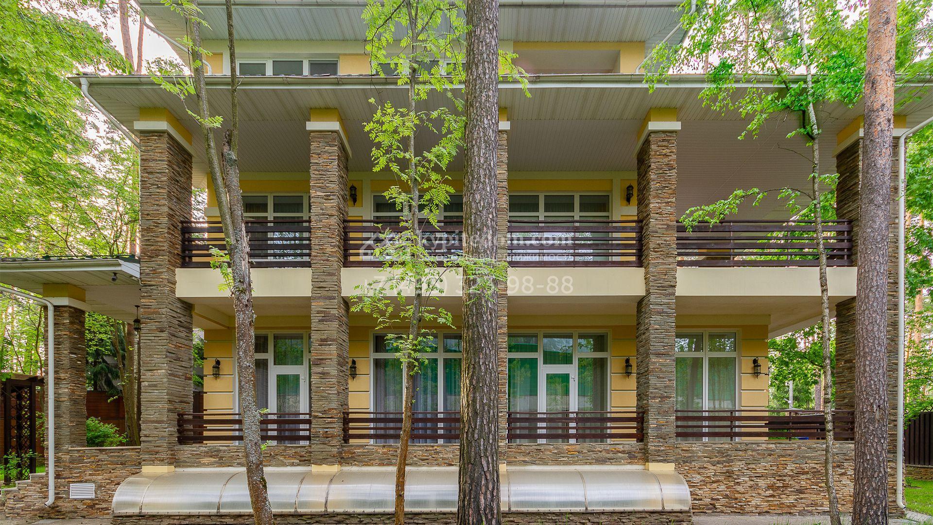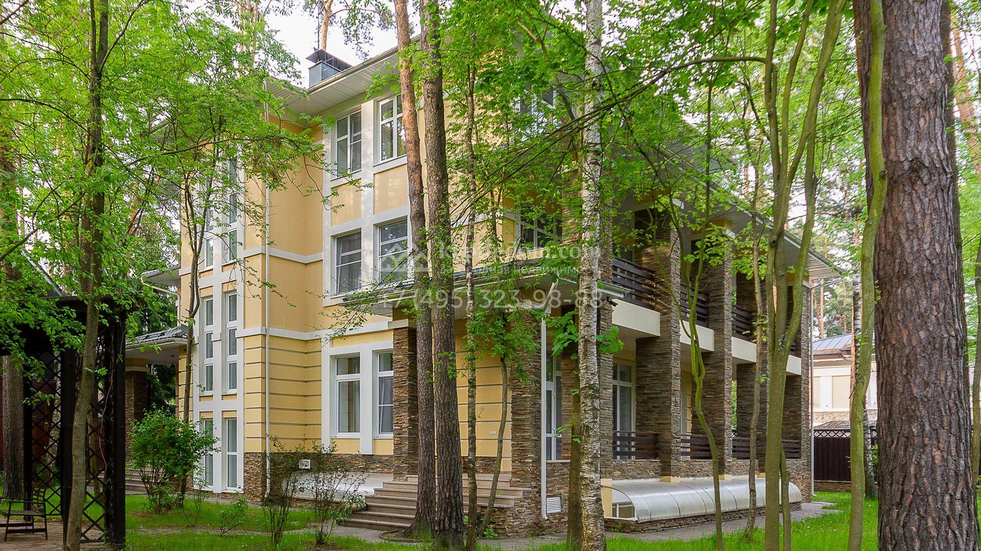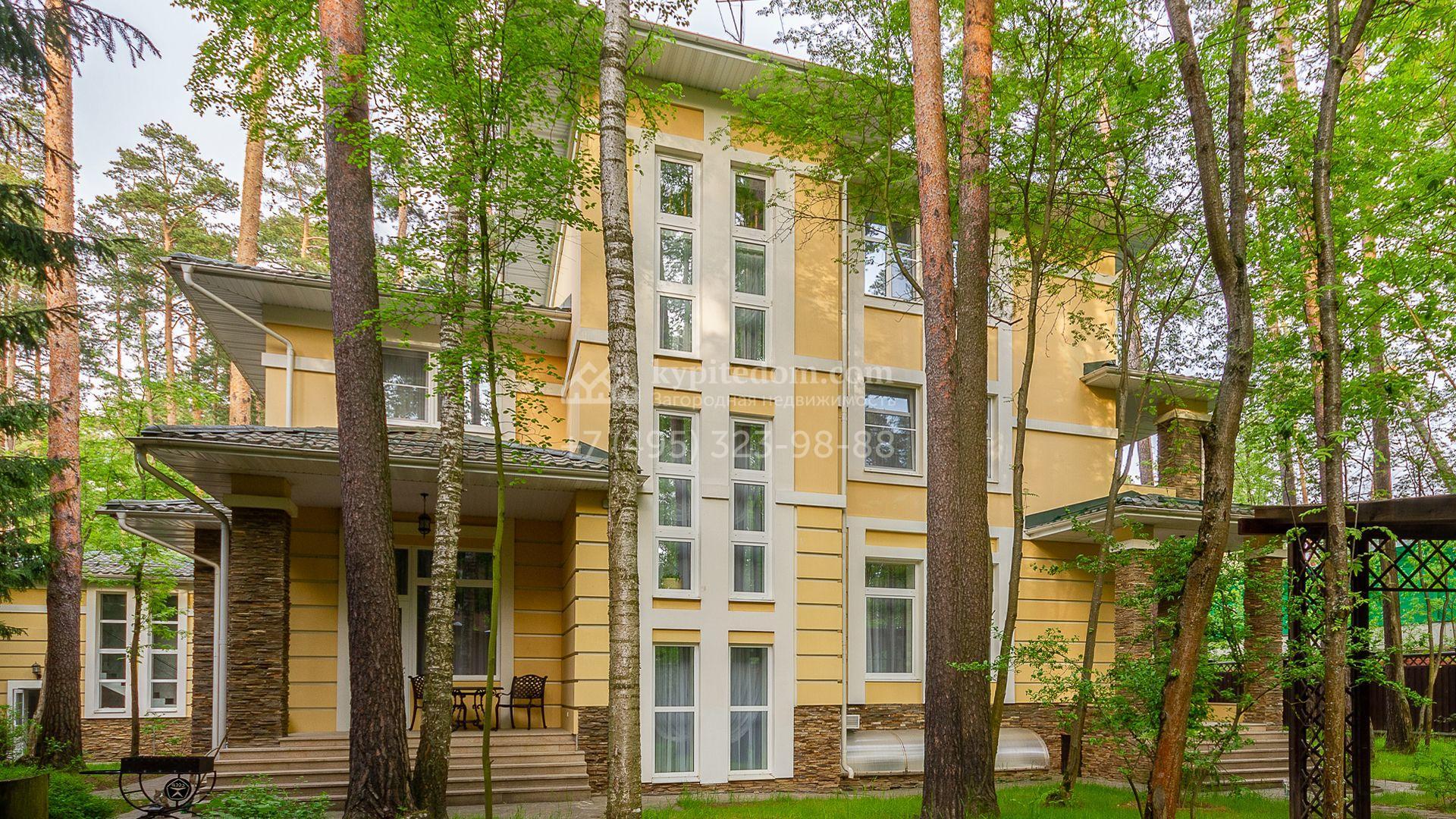 Загородная резиденция площадью 680 м² построена на участке 15 соток с вековыми соснами. Фасад здания облицован желтой штукатуркой и декорирован белыми наличниками, рустовкой и плиткой под камень. В отделке дизайнерского интерьера использованы натуральное дерево, белый мрамор, малахит и керамическая плитка. Коттедж укомплектован мебелью из Финляндии, Италии и Англии, кухня с каменной столешницей оборудована бытовой техникой.