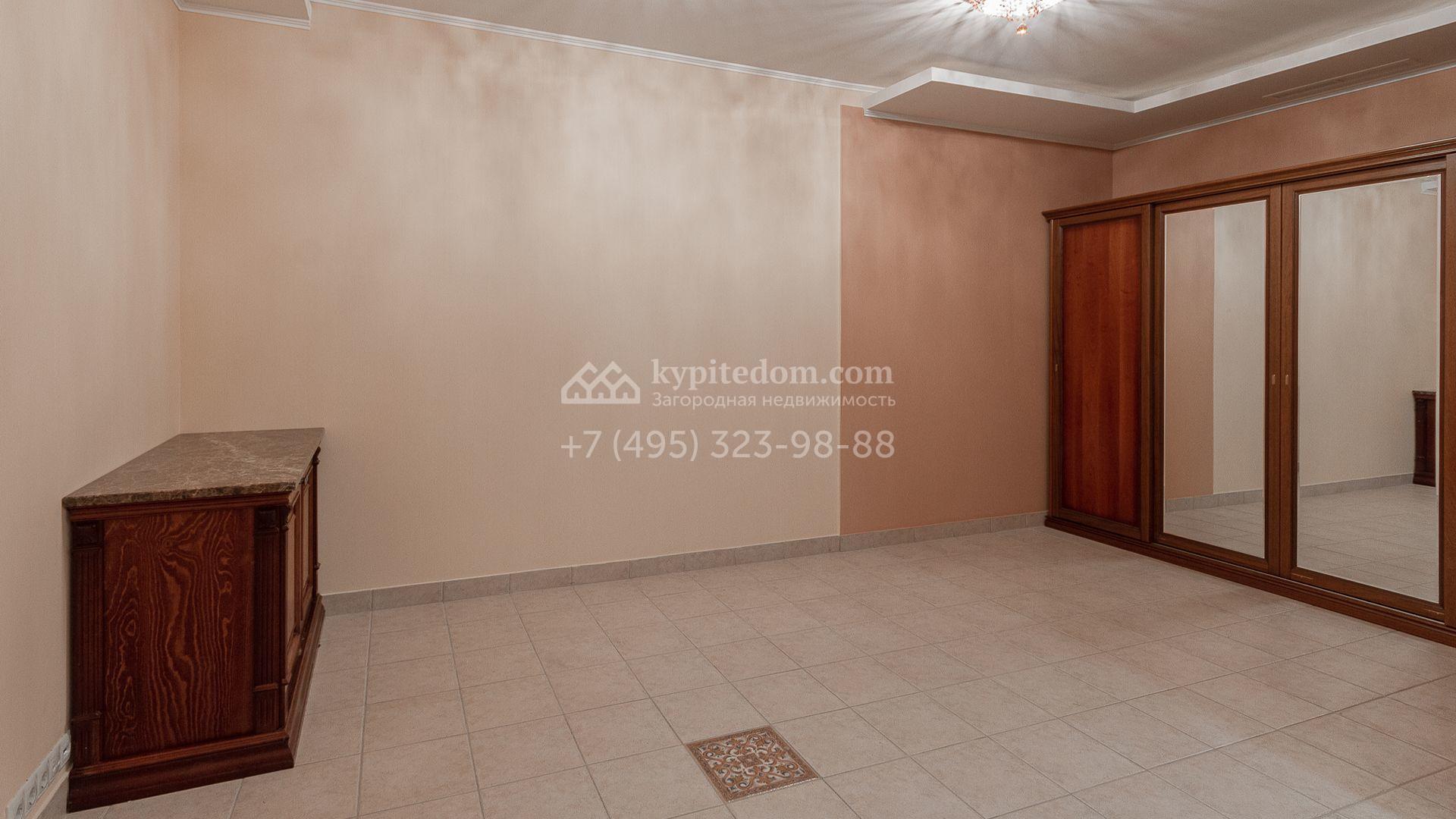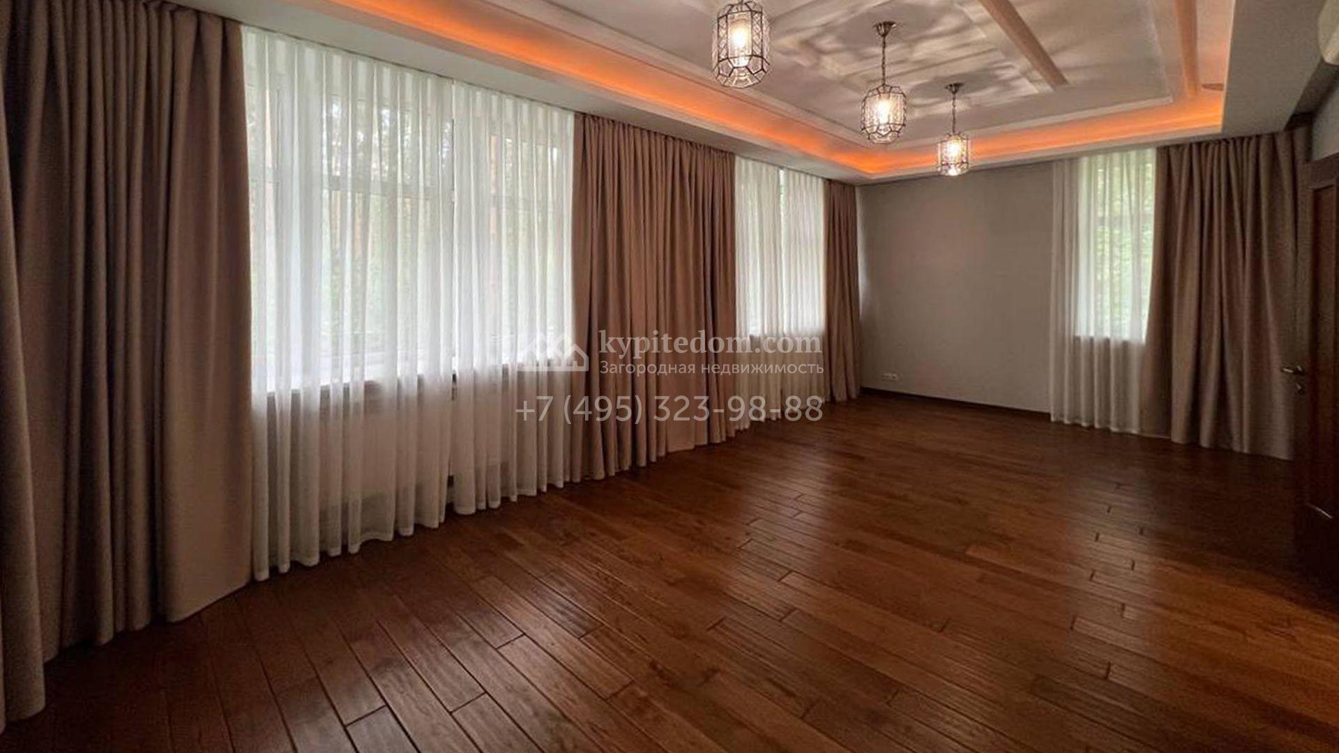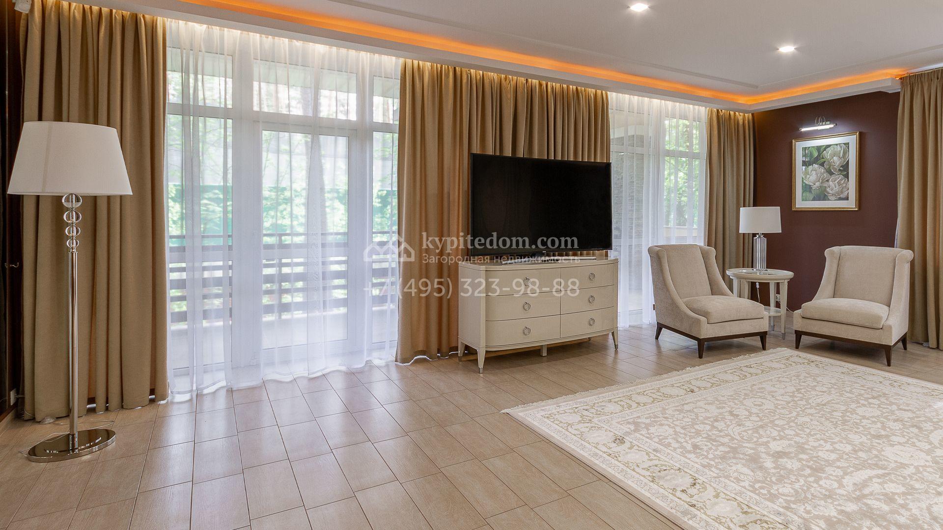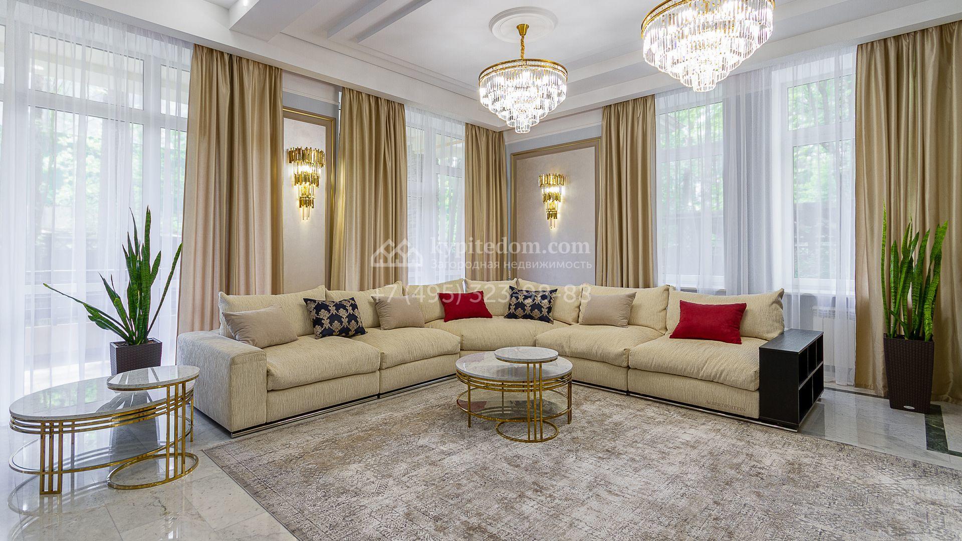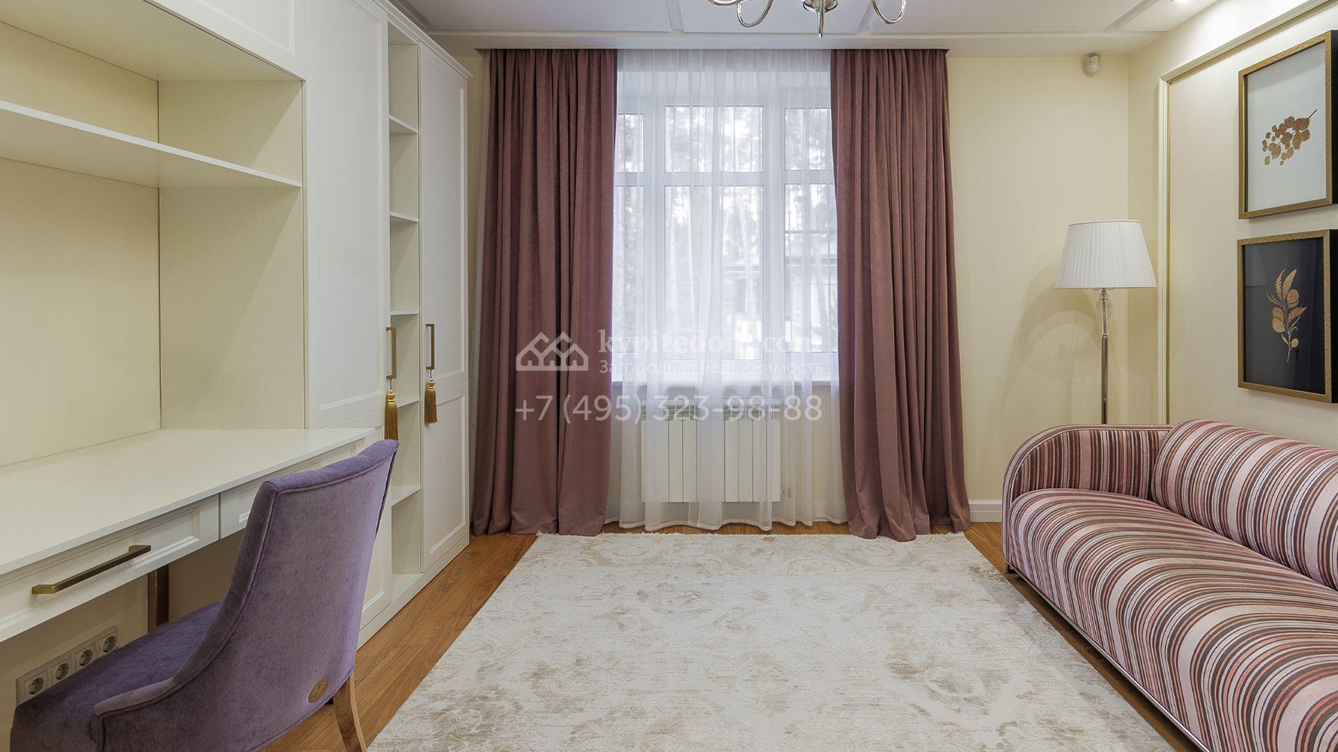 Загородная резиденция площадью 680 м² построена на участке 15 соток с вековыми соснами. Фасад здания облицован желтой штукатуркой и декорирован белыми наличниками, рустовкой и плиткой под камень. В отделке дизайнерского интерьера использованы натуральное дерево, белый мрамор, малахит и керамическая плитка. Коттедж укомплектован мебелью из Финляндии, Италии и Англии, кухня с каменной столешницей оборудована бытовой техникой.