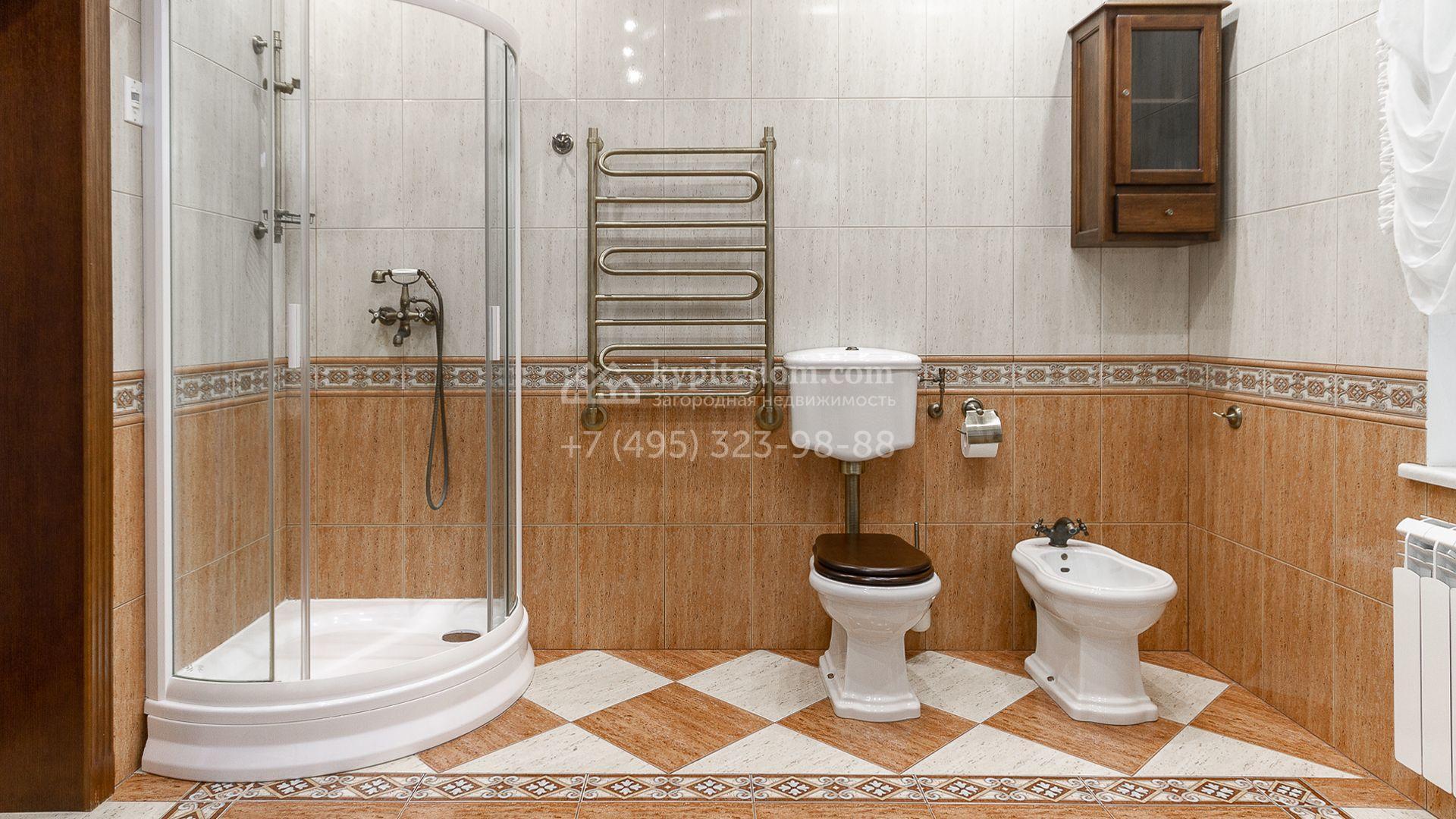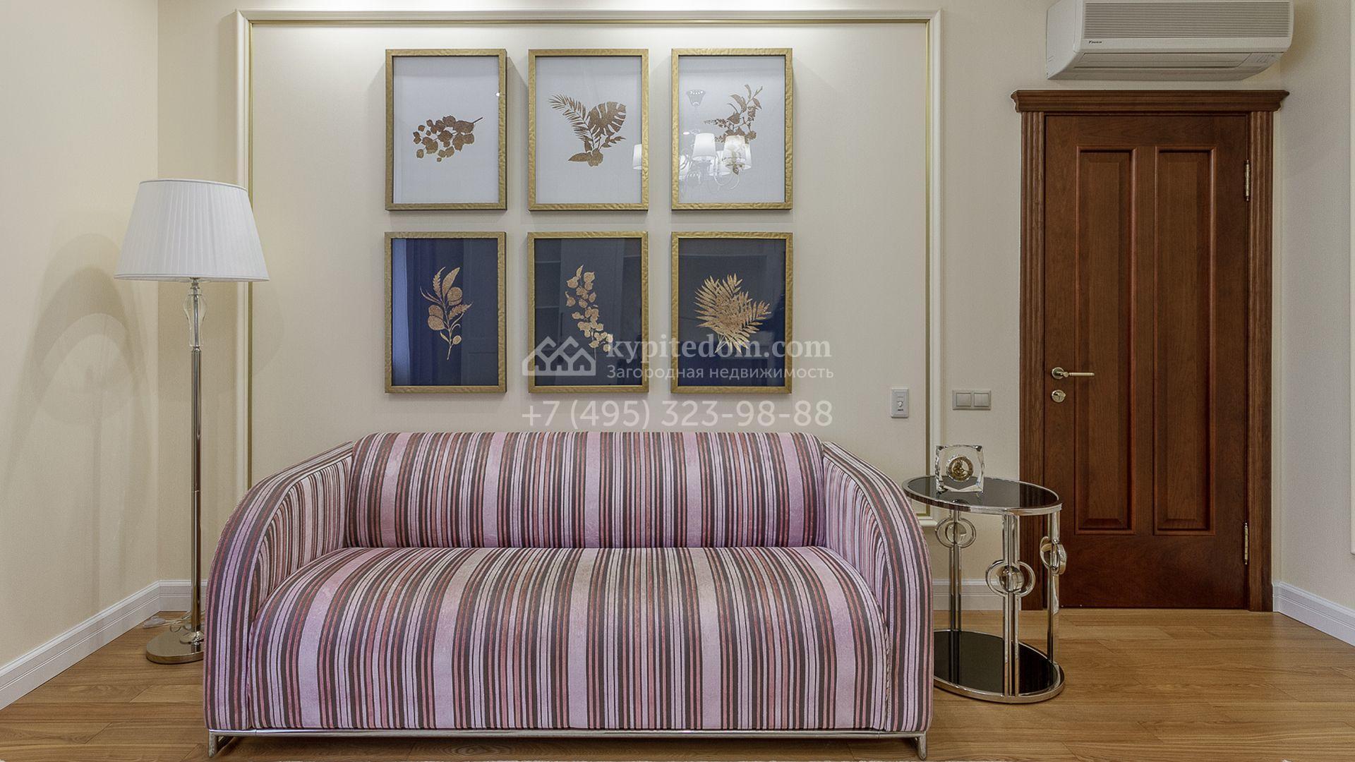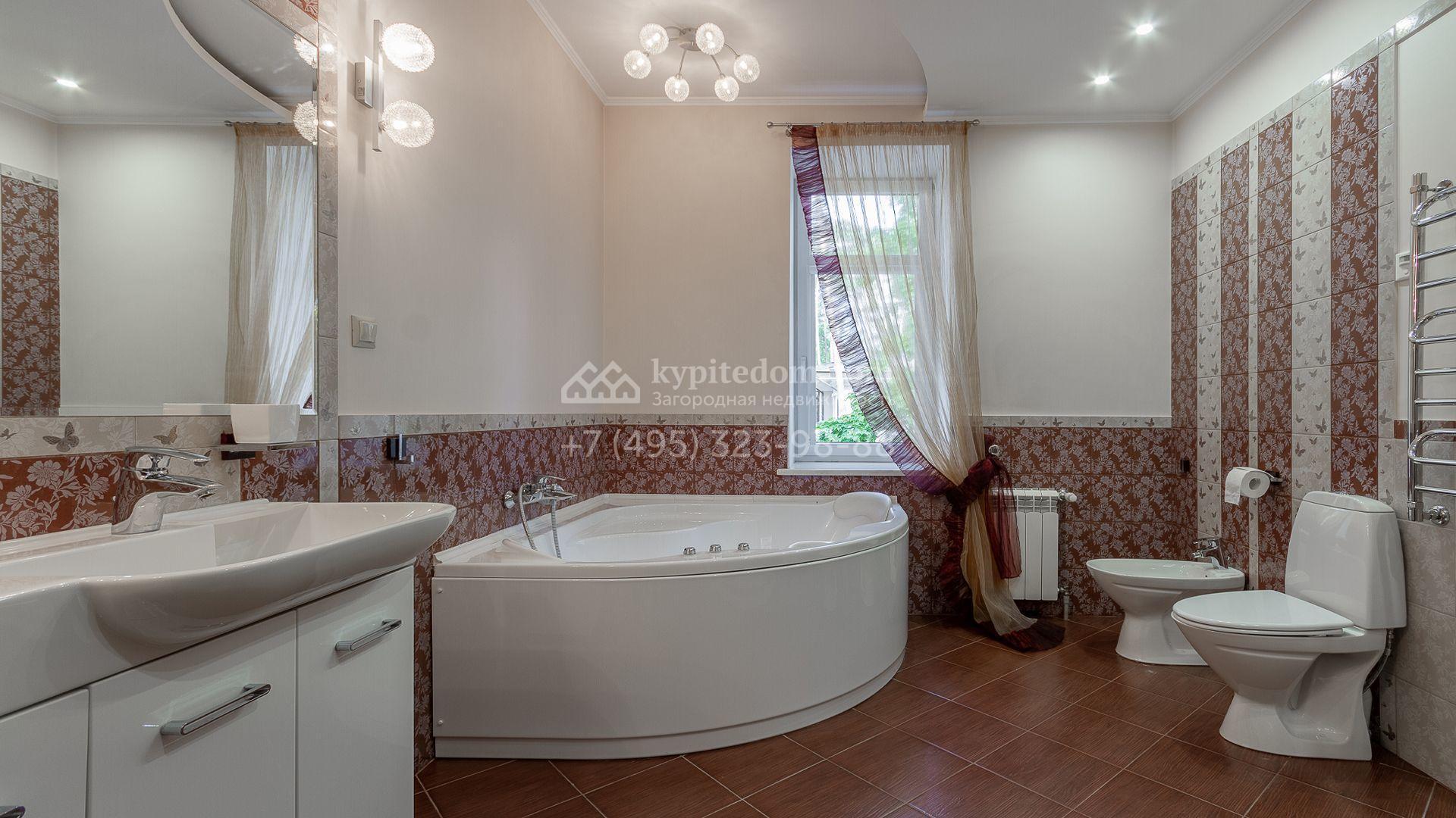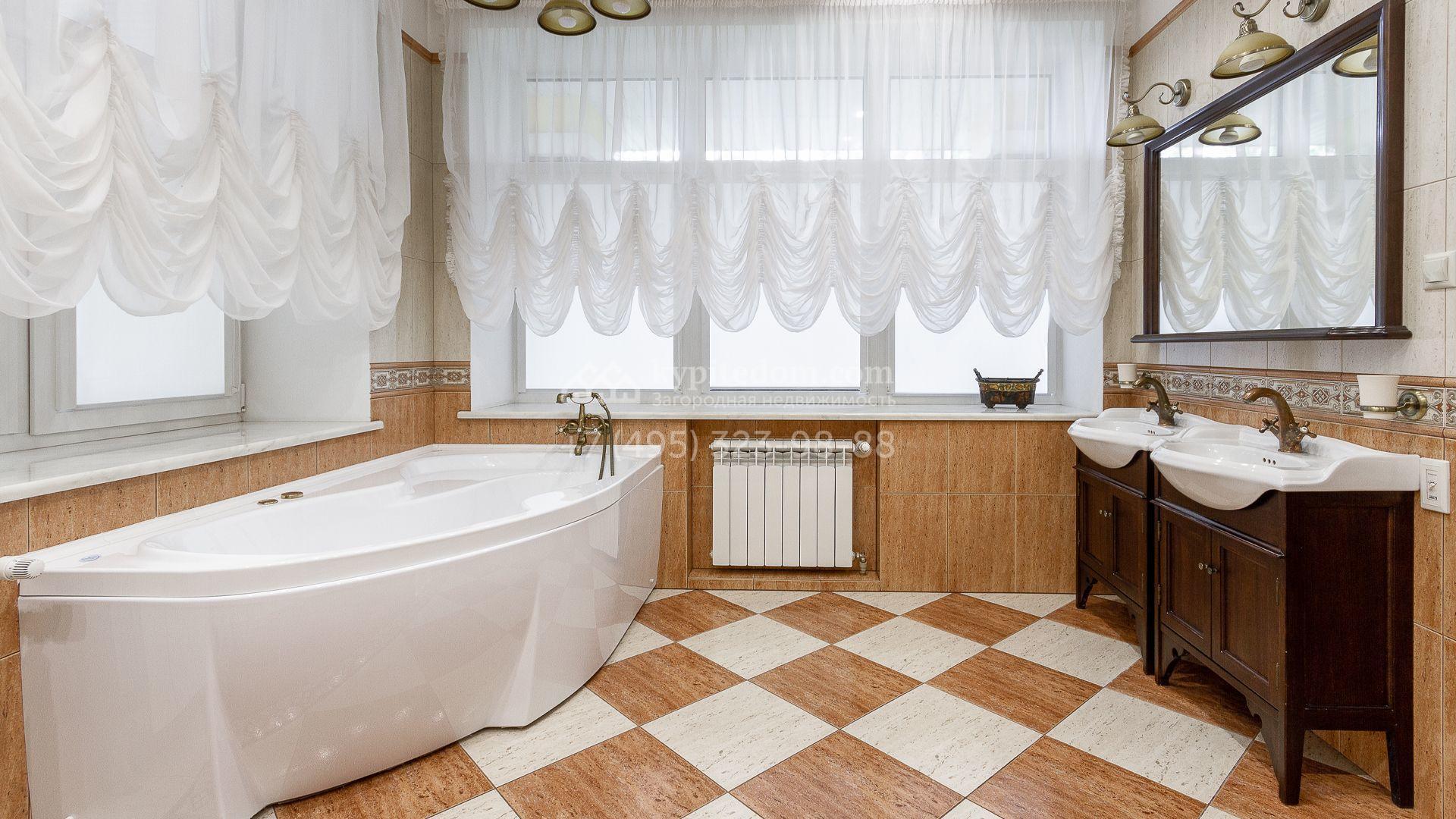 Загородная резиденция площадью 680 м² построена на участке 15 соток с вековыми соснами. Фасад здания облицован желтой штукатуркой и декорирован белыми наличниками, рустовкой и плиткой под камень. В отделке дизайнерского интерьера использованы натуральное дерево, белый мрамор, малахит и керамическая плитка. Коттедж укомплектован мебелью из Финляндии, Италии и Англии, кухня с каменной столешницей оборудована бытовой техникой.